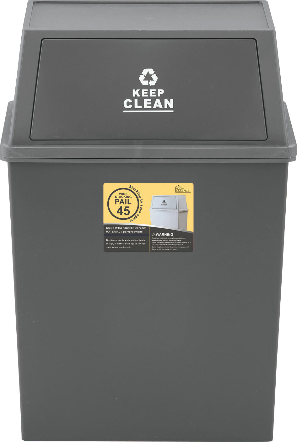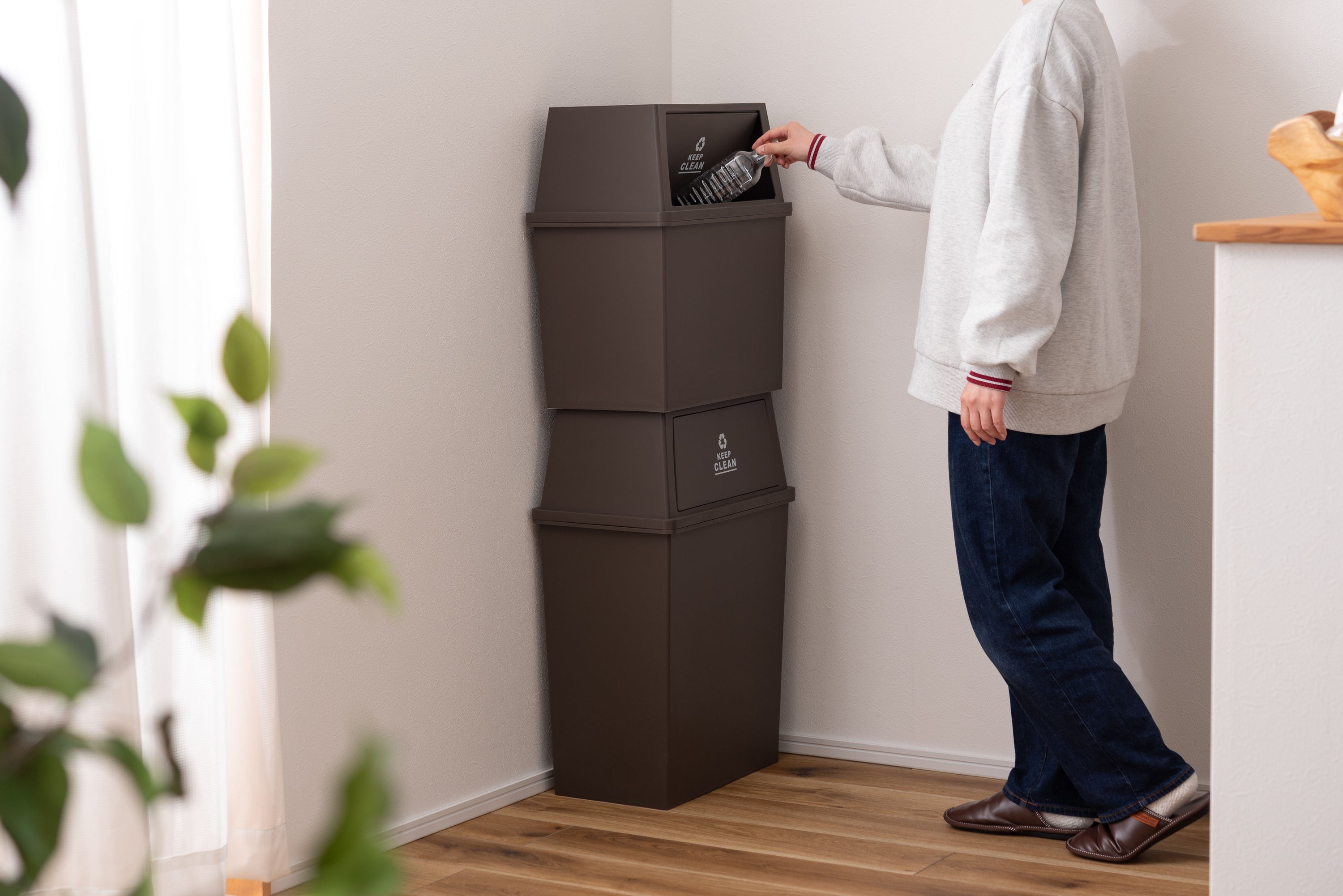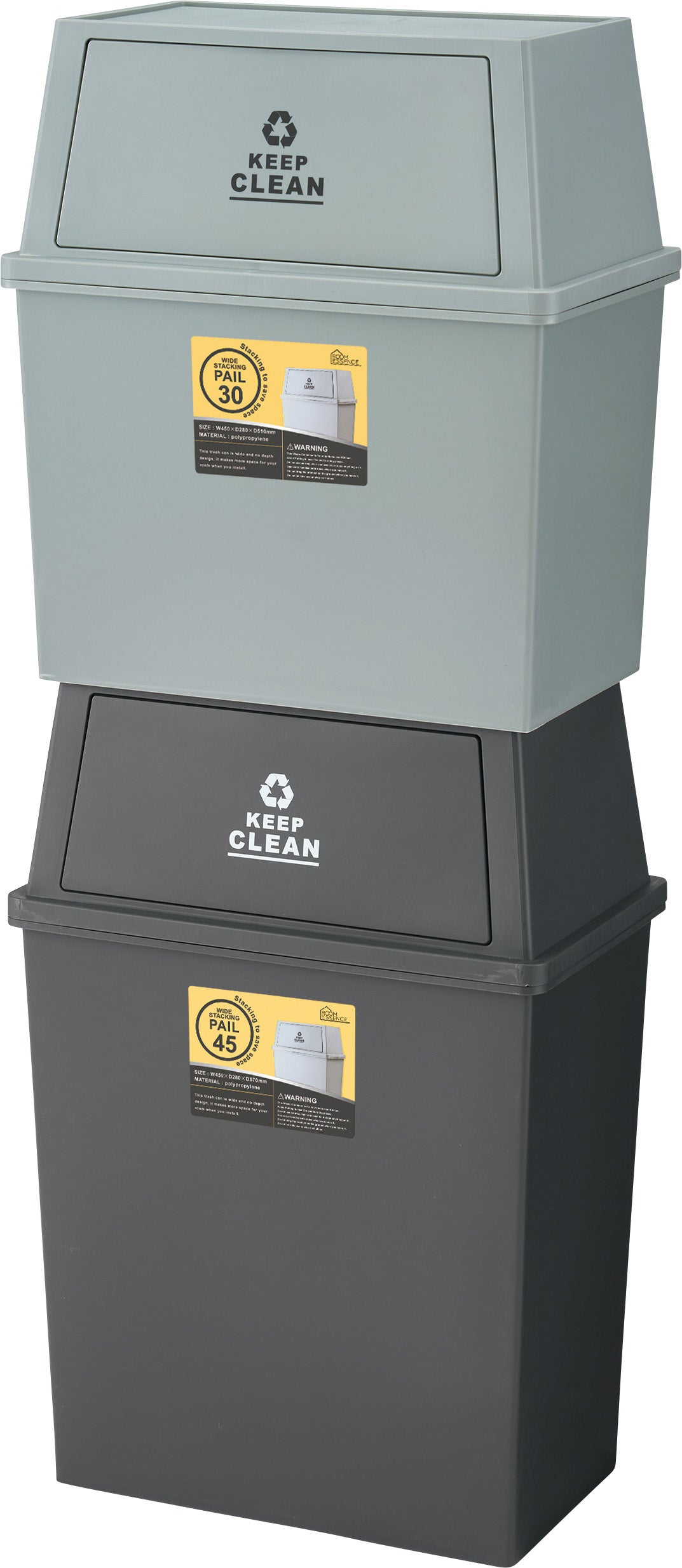 横幅ワイドで奥行スリム、大容量でもスペースを取らないスタッキングペール。キッチン回り以外にリビングやデスク回りなど壁面に沿って設置できるので、無駄なくきれいにスペースを使う事ができます。積み重ね(スタッキング)ができるのでゴミの分別にも便利。蓋の内側にはバネが付いているので、ゴミを捨てた後は自然に蓋が閉まる仕様。また蓋の裏側にストッパーが付いているので、蓋を上に押し上げて固定させておく事もできます。底面にはミニキャスター付きで移動もらくらく。キャスターは縦方向用・横方向用どちらにも取り付け可能。本体内側には可動式の袋止め付き。ゴミ袋の脱着をする際、綺麗に簡単に脱着できます。ポリプロピレン製なのでお手入れが簡単でいつでも清潔。安心の日本製。