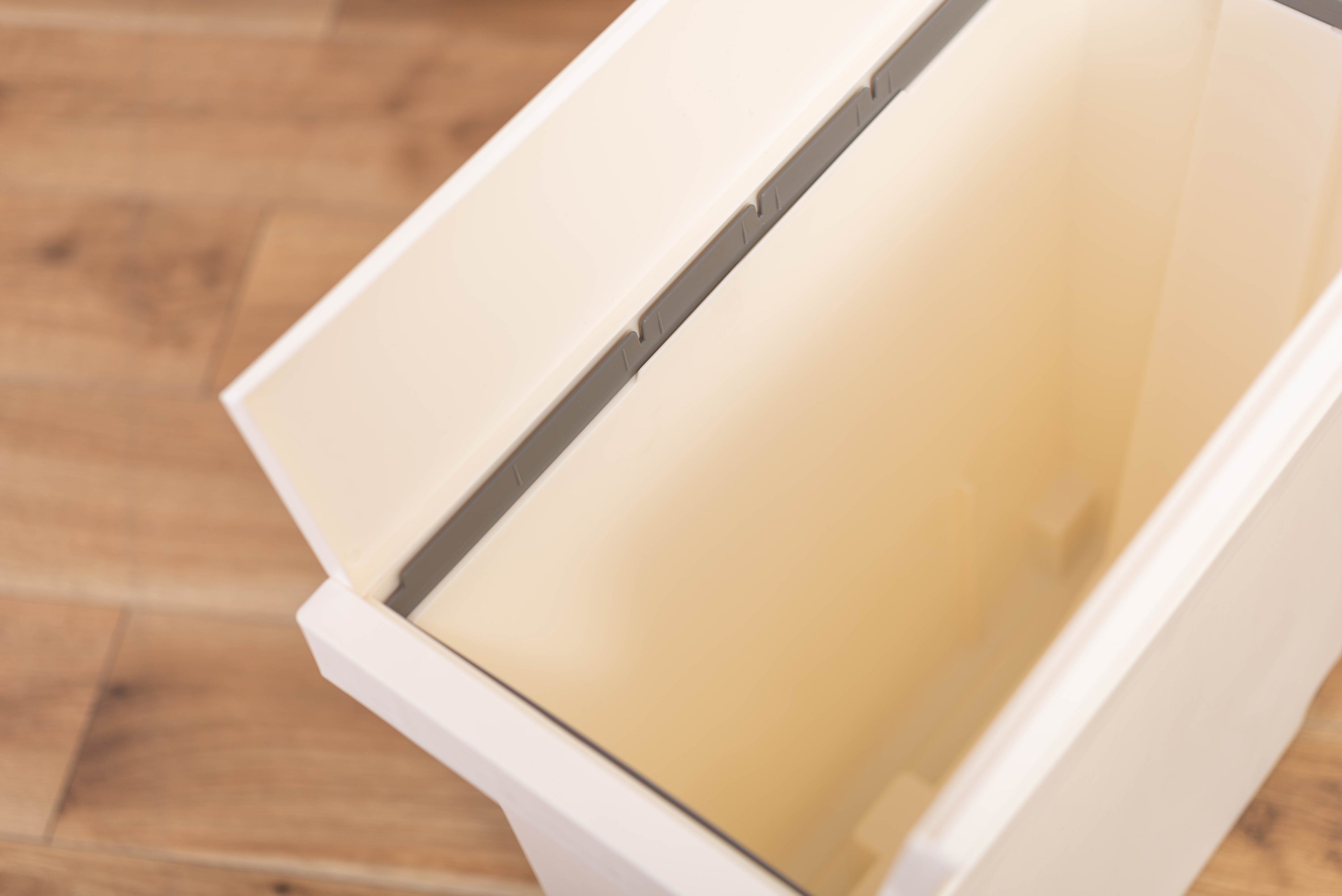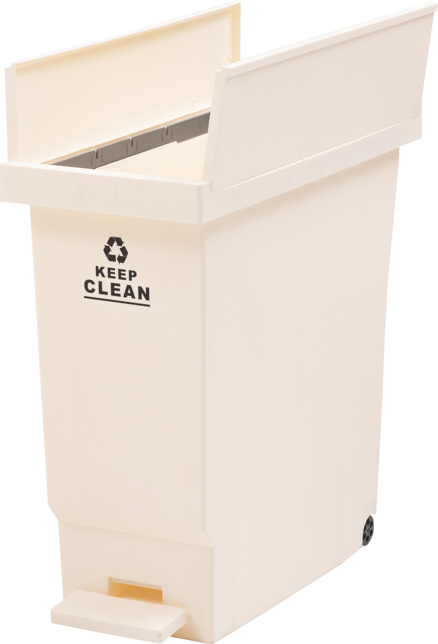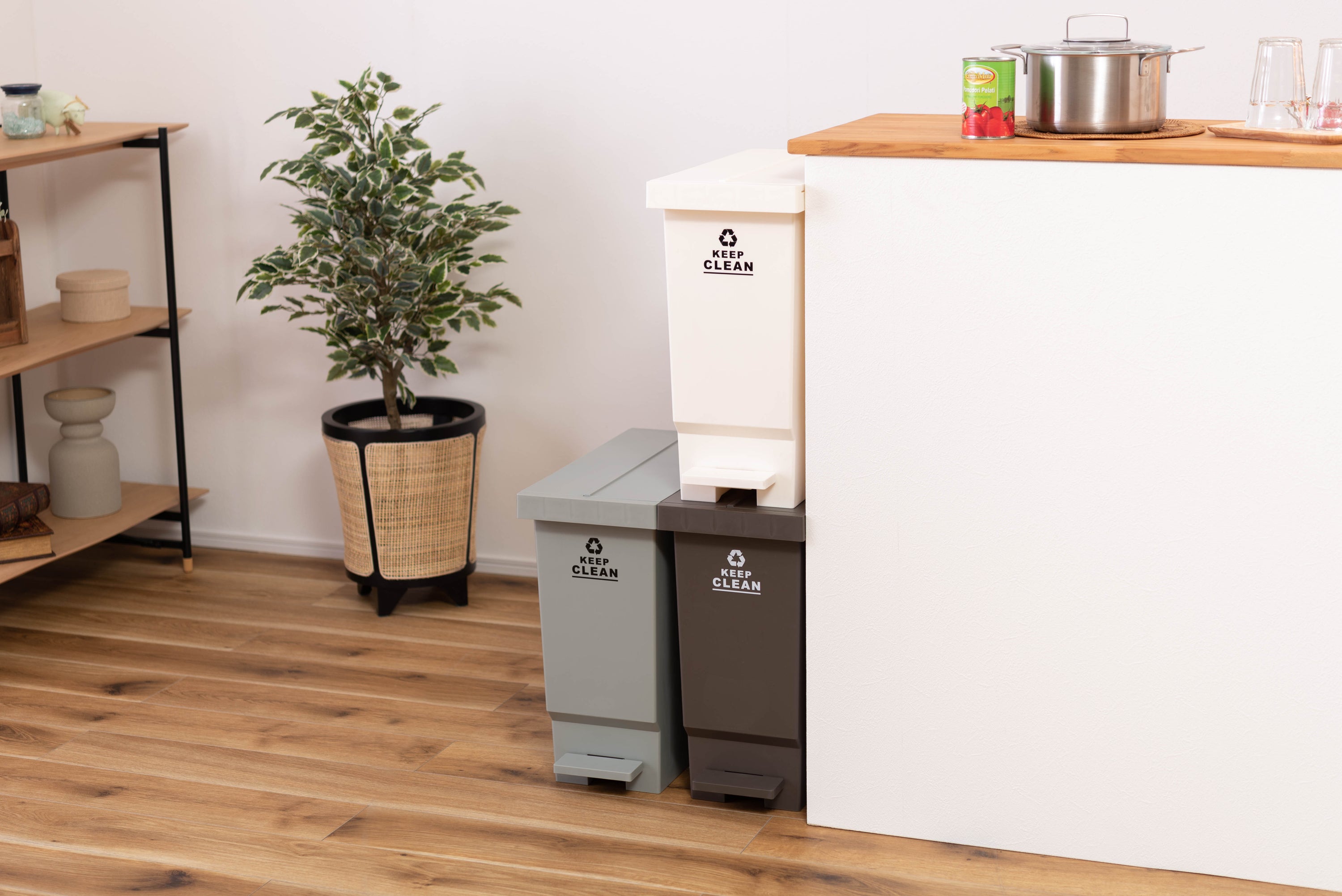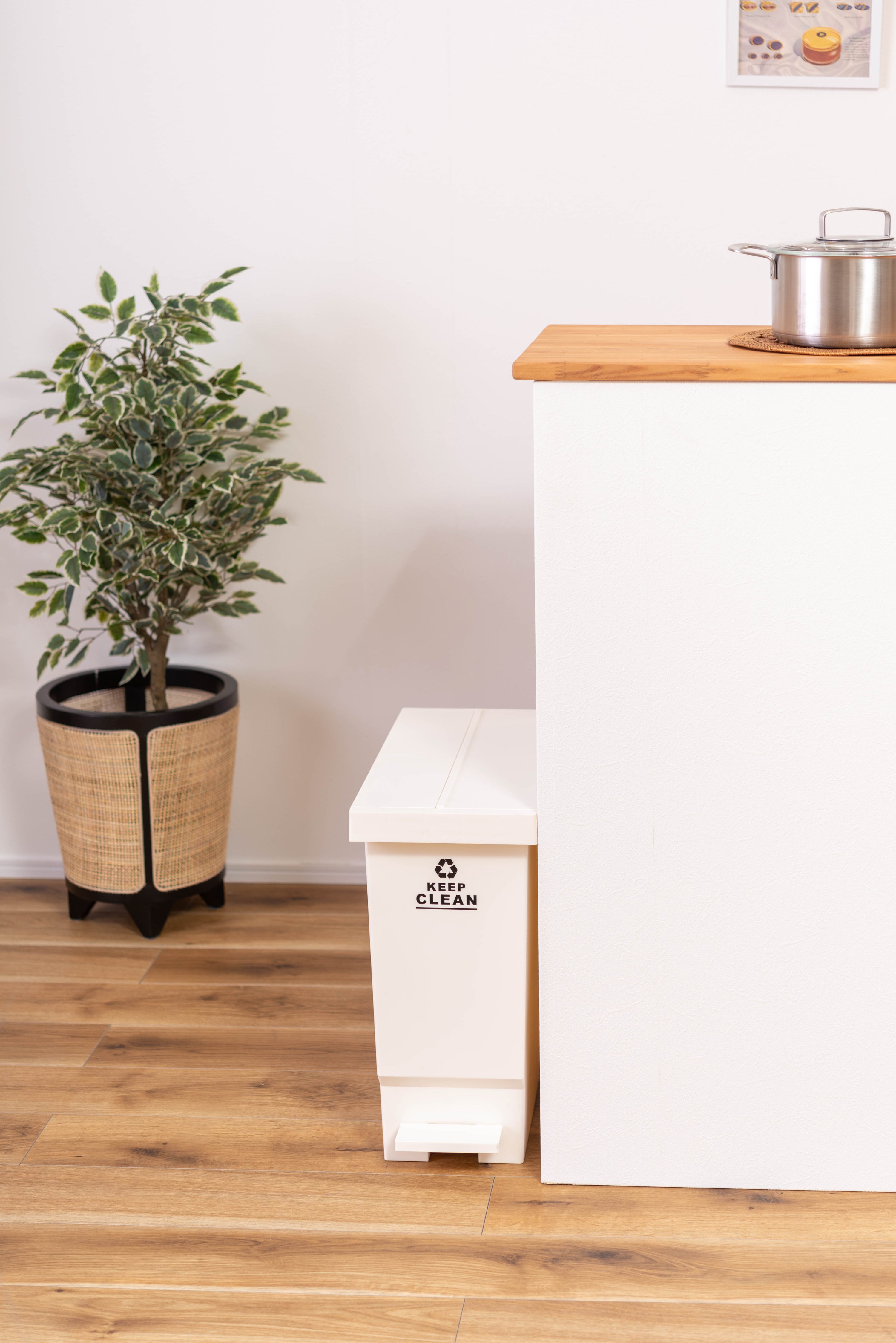 コンパクトな設計で使いやすいシンプルデザインのペダルペール。バタフライタイプなので省スペースで開閉ができ、置き場所の選択肢が広がります。軽量で持ち運びやすいうえにキャスター付きなので移動も簡単に行えます。蓋フレームの手前側が取っ手にもなっているので移動もラクラク。ペダル式なので手を使わず蓋を開閉させる事が可能。とっても衛生的です。落ち着いた色味のアースカラーが主張しすぎず、インテリアに馴染みます。容量は中型サイズで使いやすい32L。ゴミ袋は45Lサイズを使う事ができます。ゴミ袋を留める袋止め付き。ポリプロピレン製なので汚れてもサッと拭き取れてお手入れも簡単。