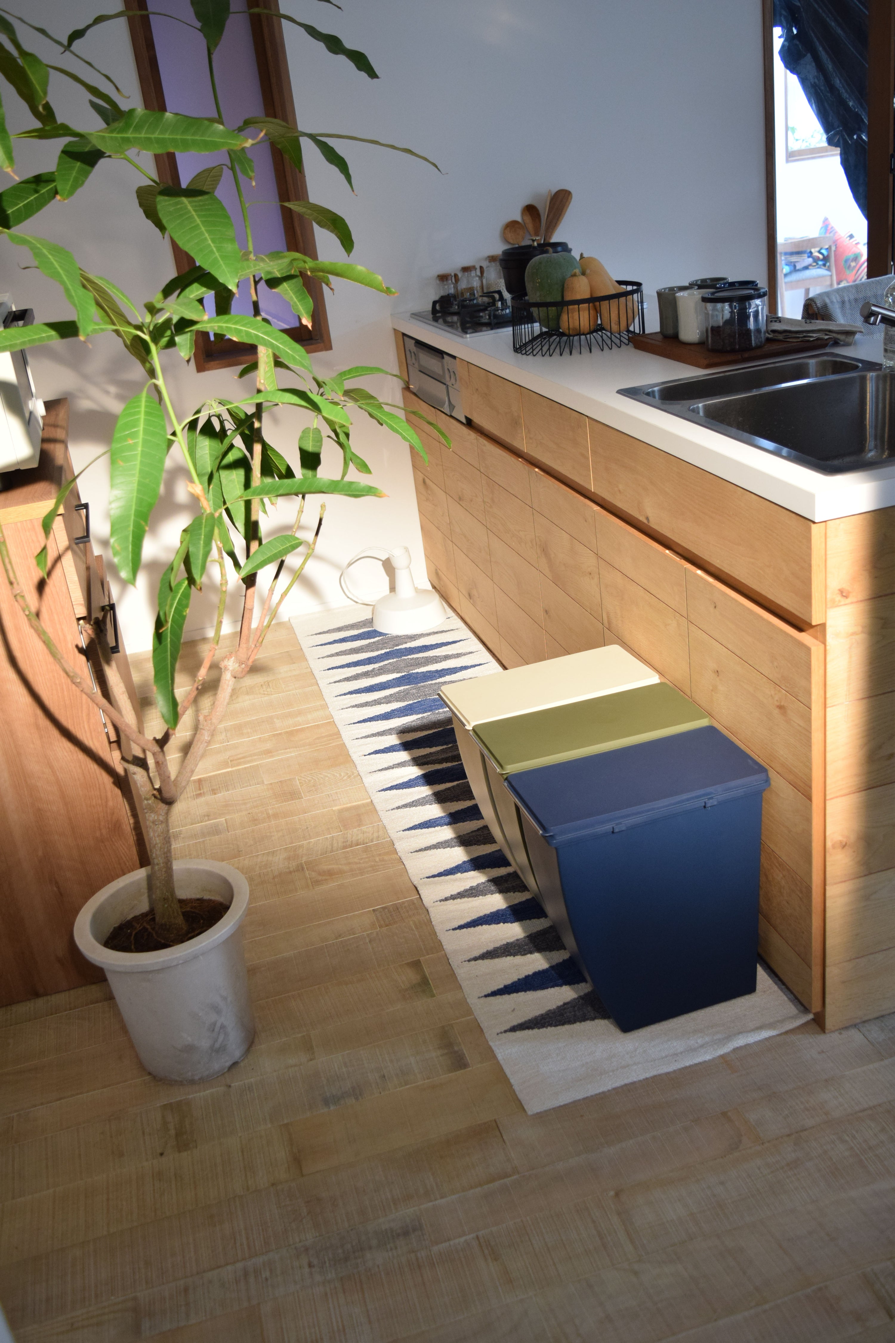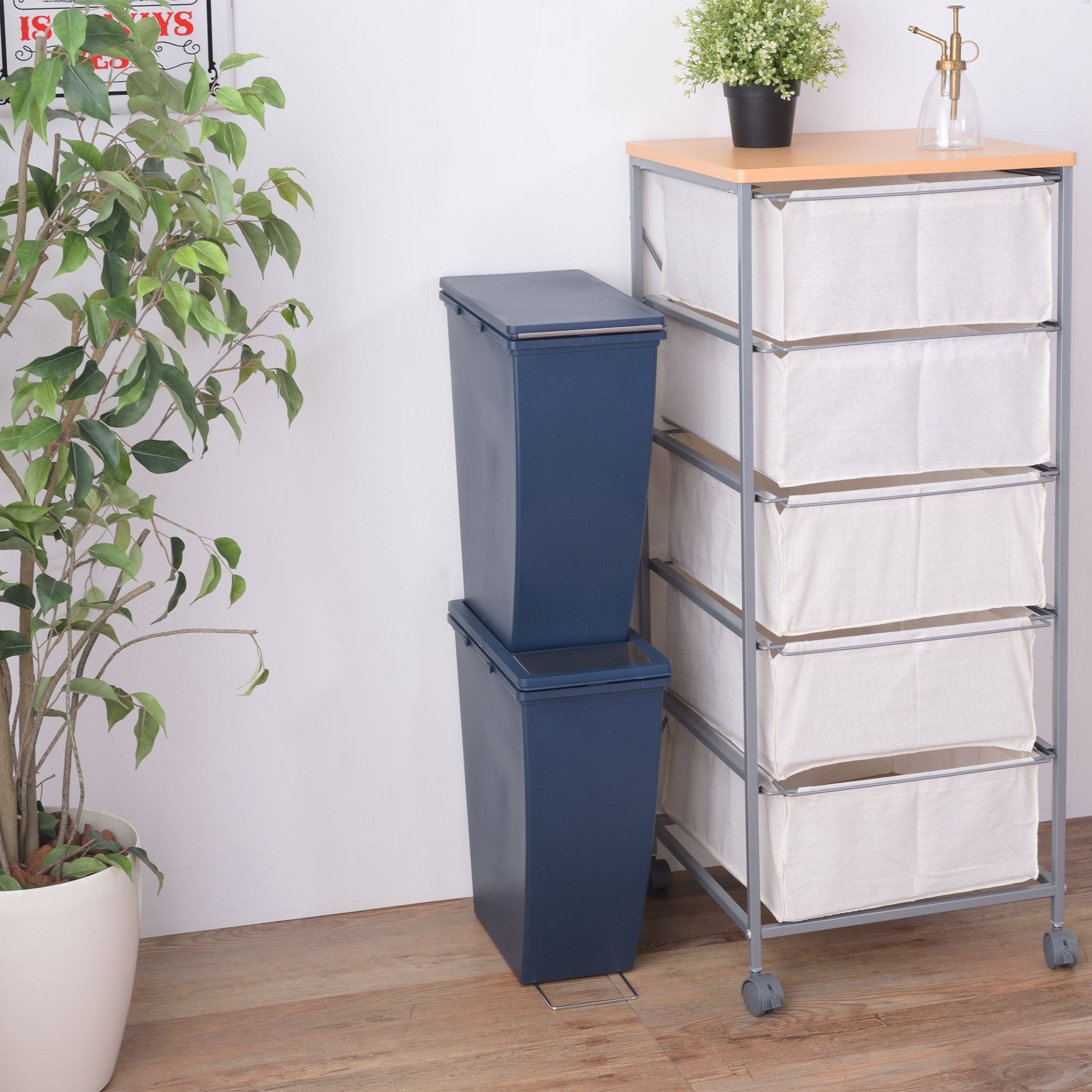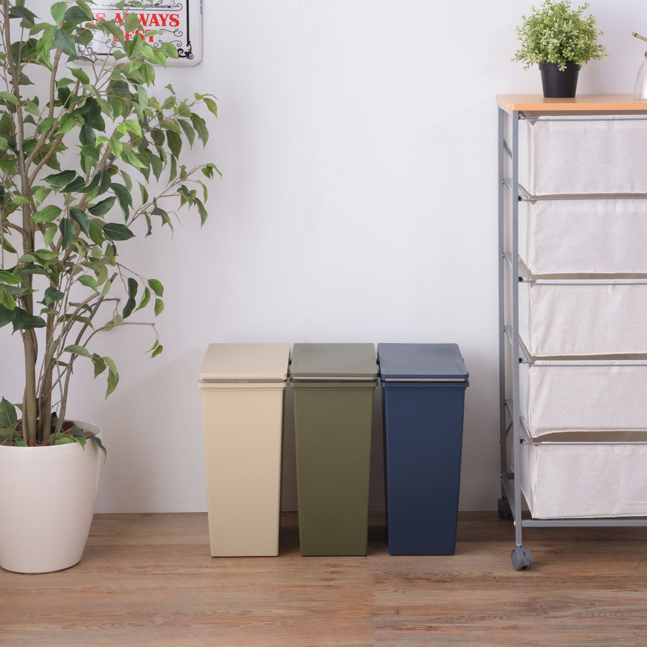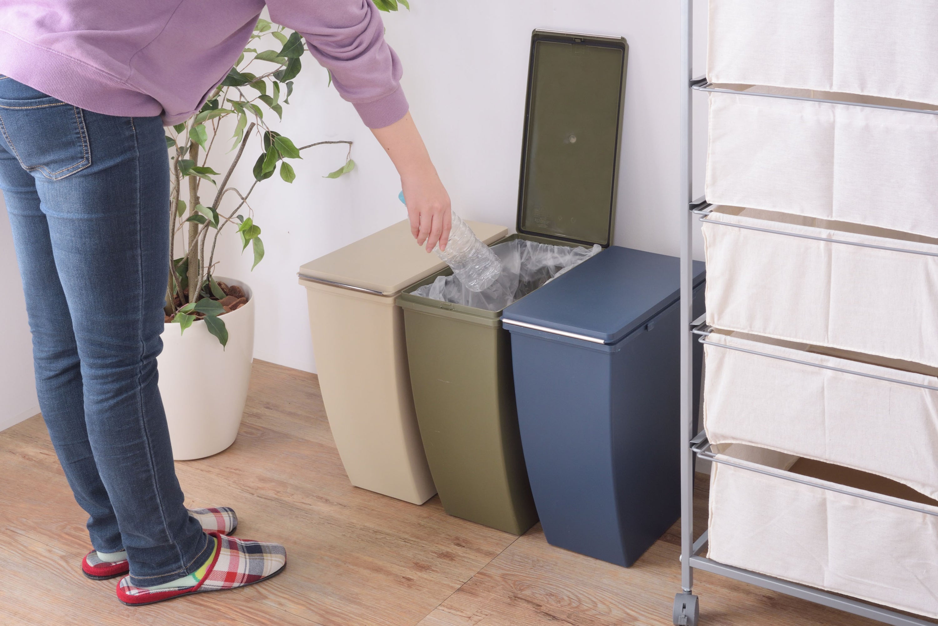 スリムサイズが使いやすい、横連結が可能なコンテナ(ダストボックス)。キッチン周りやデスク横などのちょっとしたスペースに最適。横連結が可能。ゴミの分別がしやすいよう、色違いでの連結もおすすめ。袋止めの内側にはT字フックが付いているので、小さいゴミ袋を複数セットしてゴミ箱内での分別も可能。底面の4箇所にはミニキャスターを標準装備。ゴミ出しなどのちょっとした移動に便利。水に強いポリプロピレン製なのでお手入れもラクラク。いつでも清潔。別売りのコンテナを使えばスタッキングが可能。凹凸の固定できる仕様なので、安定感もあり安心。フタの内側には臭い漏れ防止に役立つパッキン付き。空間に馴染みやすいマットで落ち着いたカラーのラインナップ。