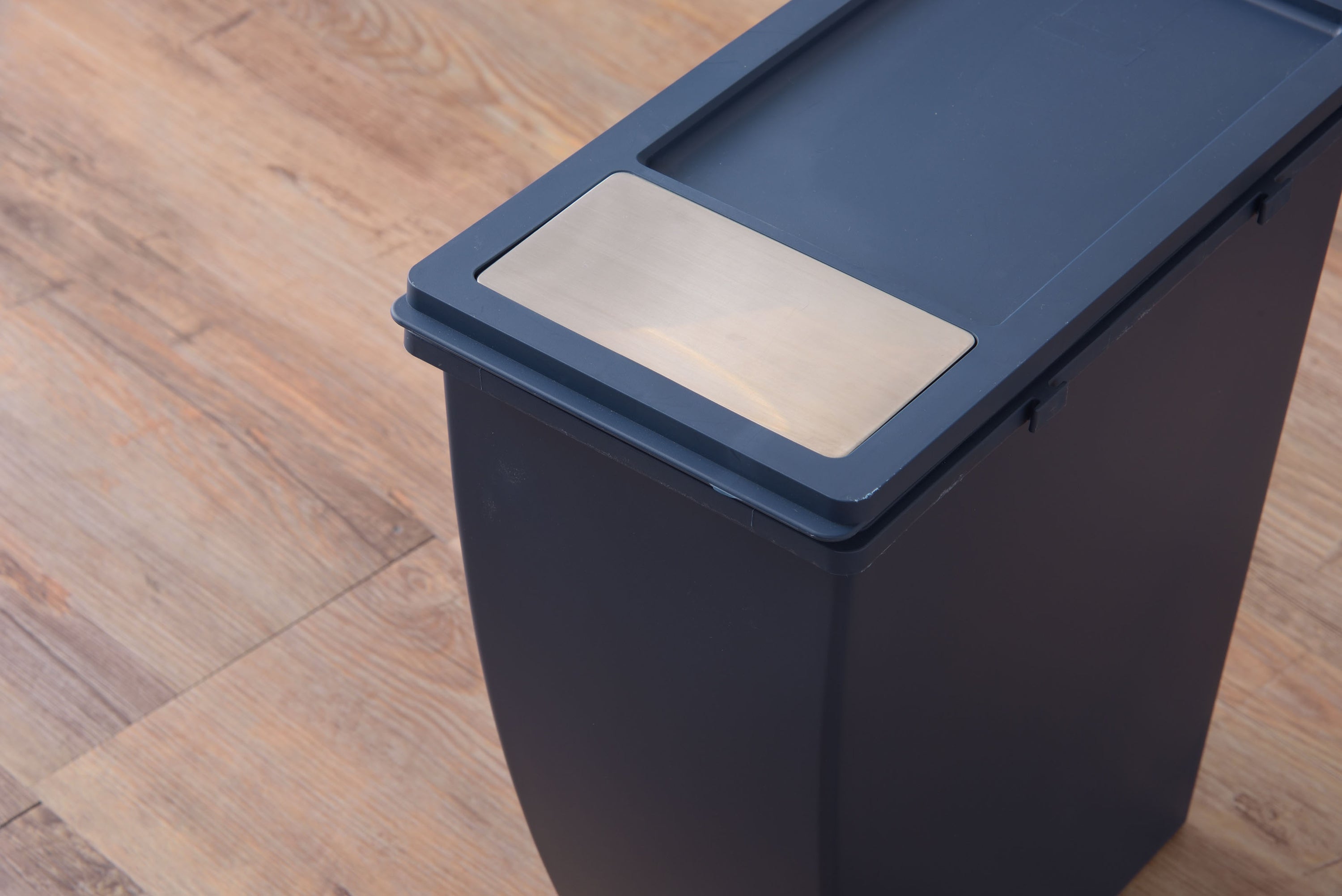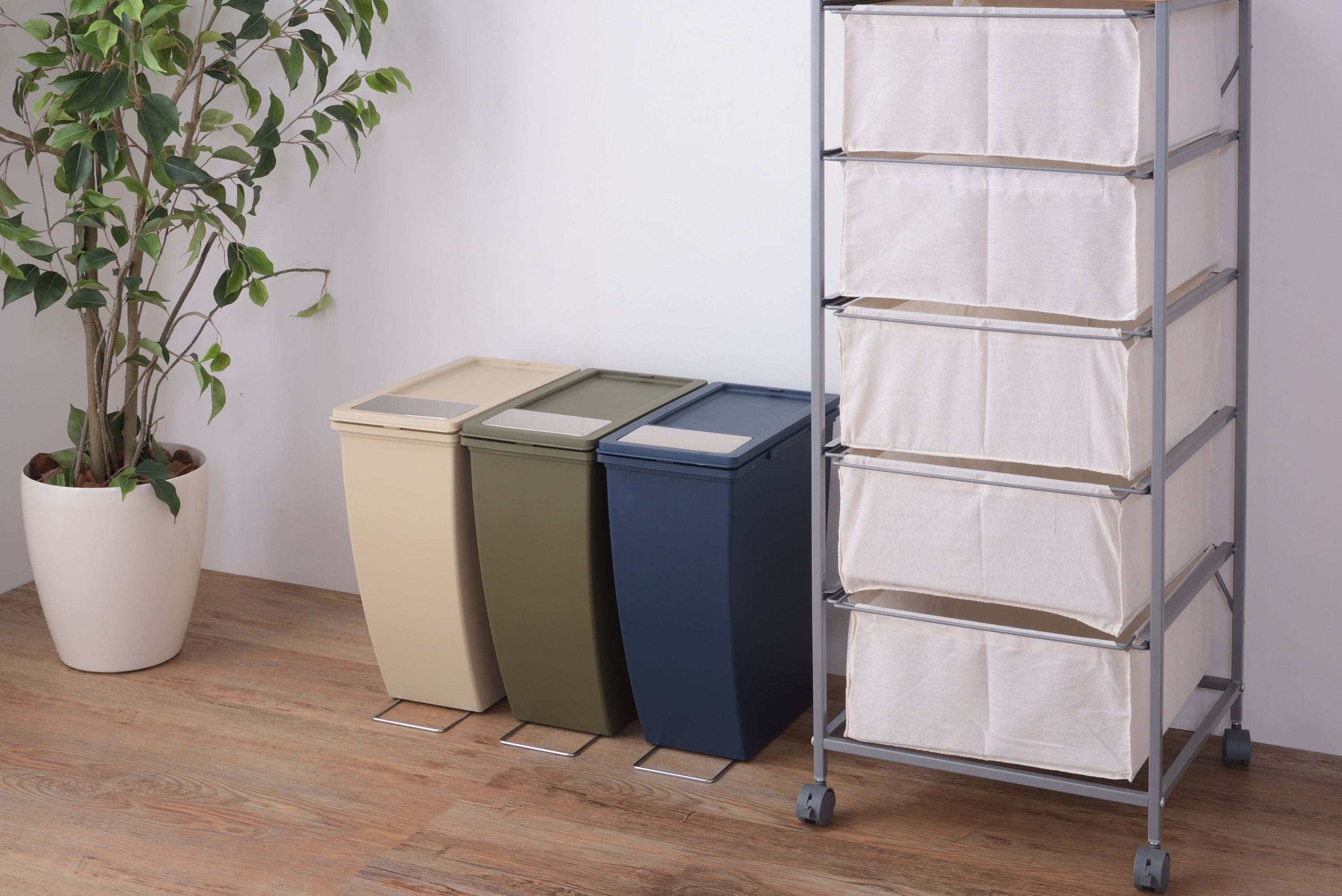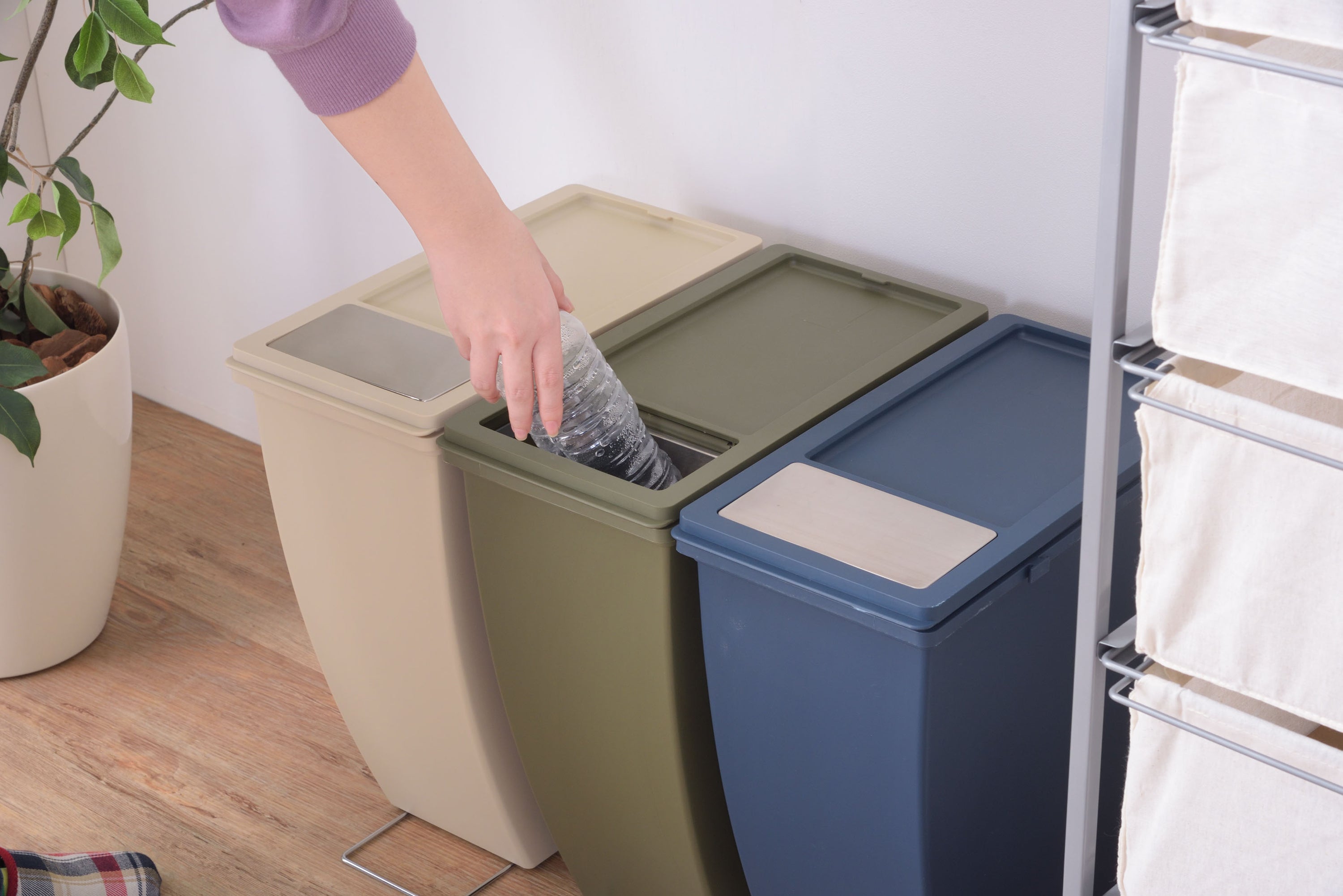 スリムサイズが使いやすい、横連結が可能なコンテナ(ダストボックス)。キッチン周りやデスク横などのちょっとしたスペースに最適。横連結が可能。ゴミの分別がしやすいよう、色違いでの連結もおすすめ。袋止めの内側にはT字フックが付いているので、小さいゴミ袋を複数セットしてゴミ箱内での分別も可能。底面の4箇所にはミニキャスターを標準装備。ゴミ出しなどのちょっとした移動に便利。水に強いポリプロピレン製なのでお手入れもラクラク。いつでも清潔。別売りのコンテナを使えばスタッキングが可能。凹凸の固定できる仕様なので、安定感もあり安心。フタの手前部分にはステンレス製のコンパクトな開閉フタ付き。バネ付きなので、ゴミを捨てた後はピタッとフタが閉まります。足元部分にはコの字型の金具脚付きなのでしっかりと安定。空間に馴染みやすいマットで落ち着いたカラーのラインナップ。