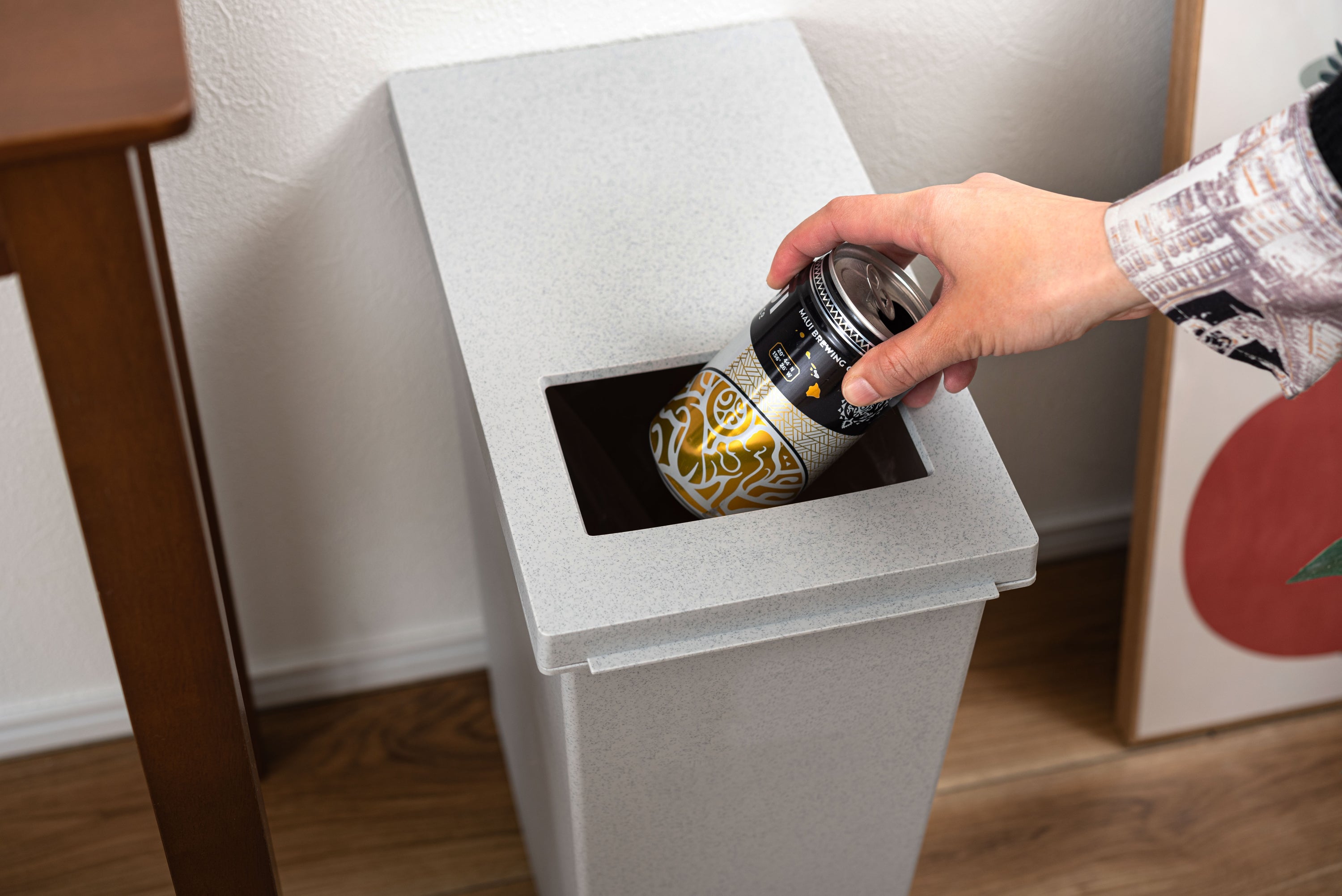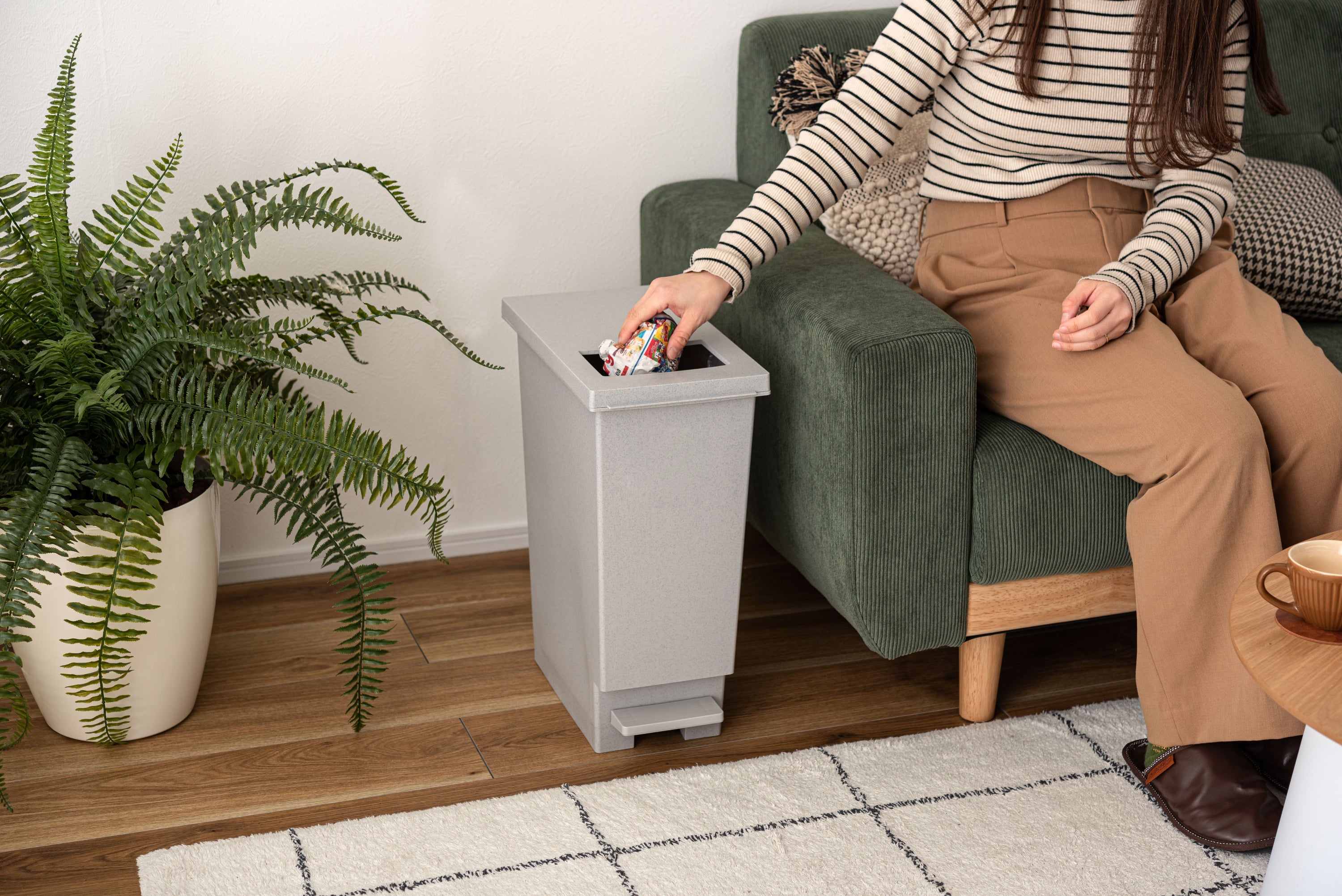 2種類の開け方でマルチに使えるダストボックス。上からプッシュオープンと足元のペダルオープンの2種類の開け方ができる便利なダストボックス。ゴミの大きさや状況に応じてマルチに活躍。石目調の模様を施したデザインもポイント。上部のプッシュフタは小さいゴミをサッと捨てるのに便利。足元のペダルを踏めばフタが大きく開閉。手を使わずにゴミを捨てられるので衛生的。ゴミ袋を固定できる袋止め付き。ゴミ袋がズレ落ちる事もなくストレスフリー。石目調の模様を施したおしゃれなデザイン。