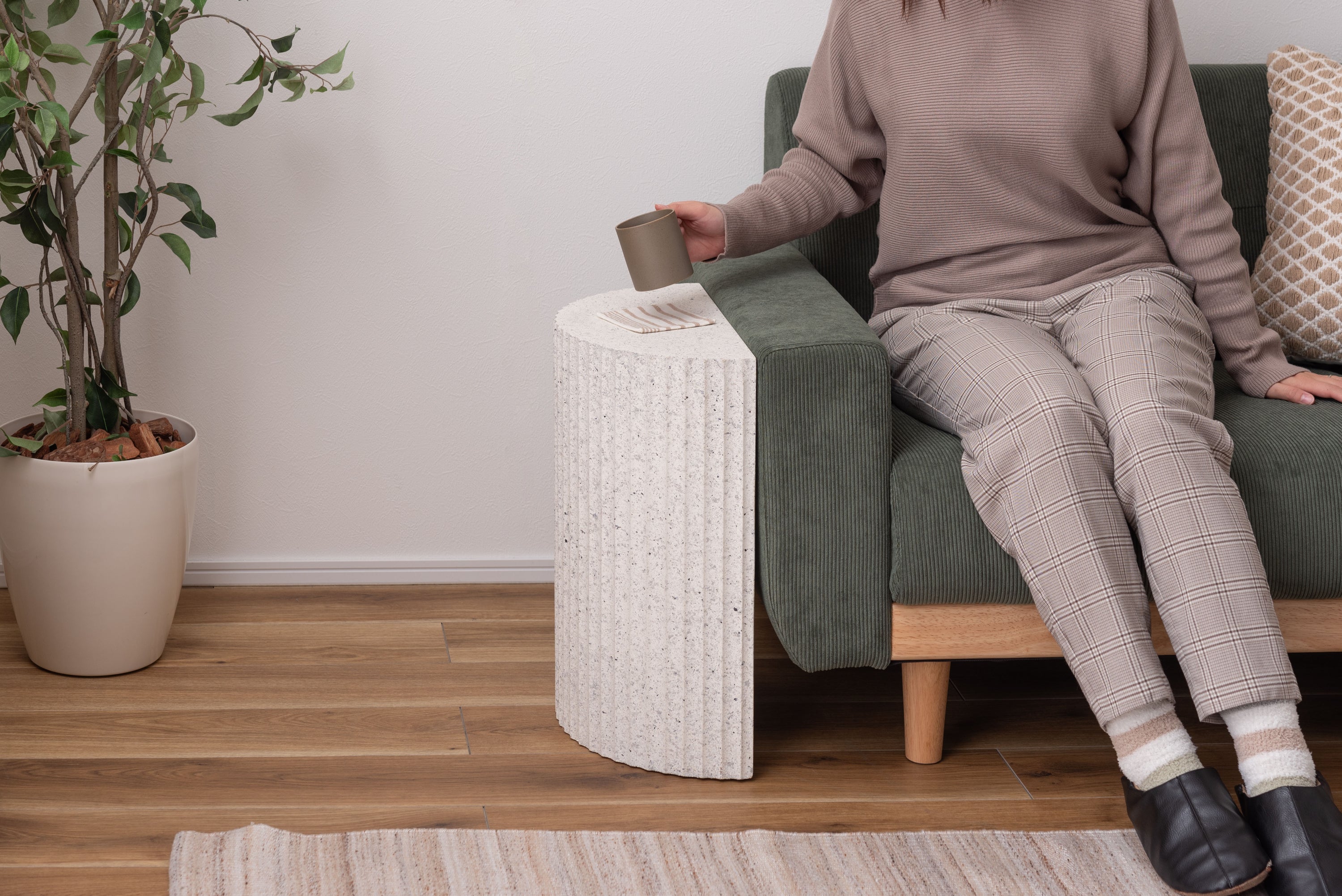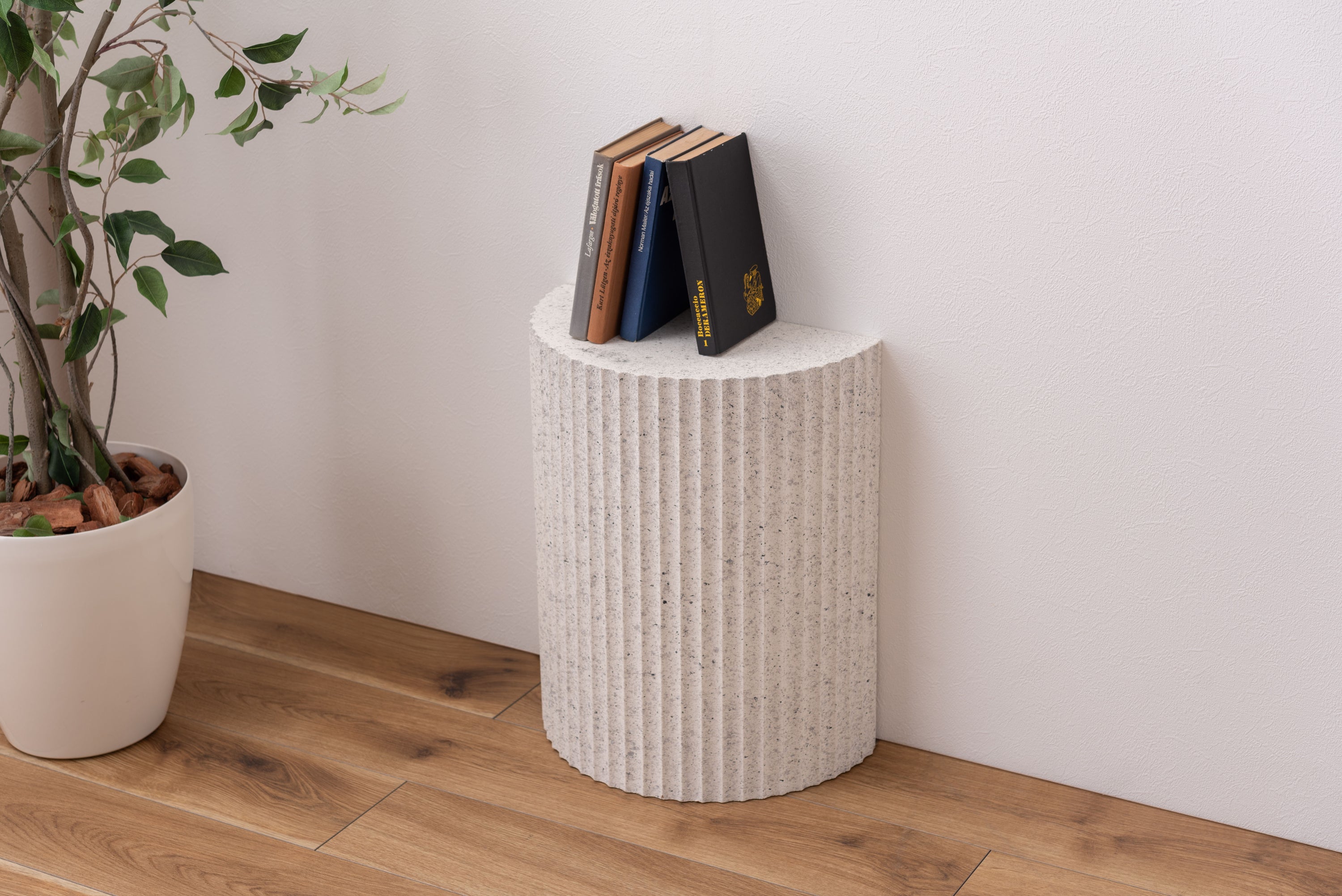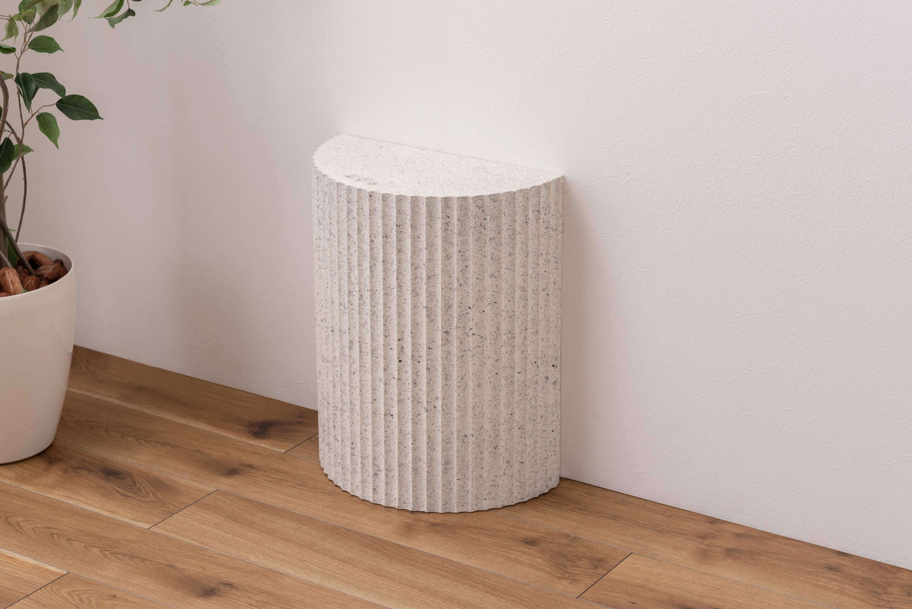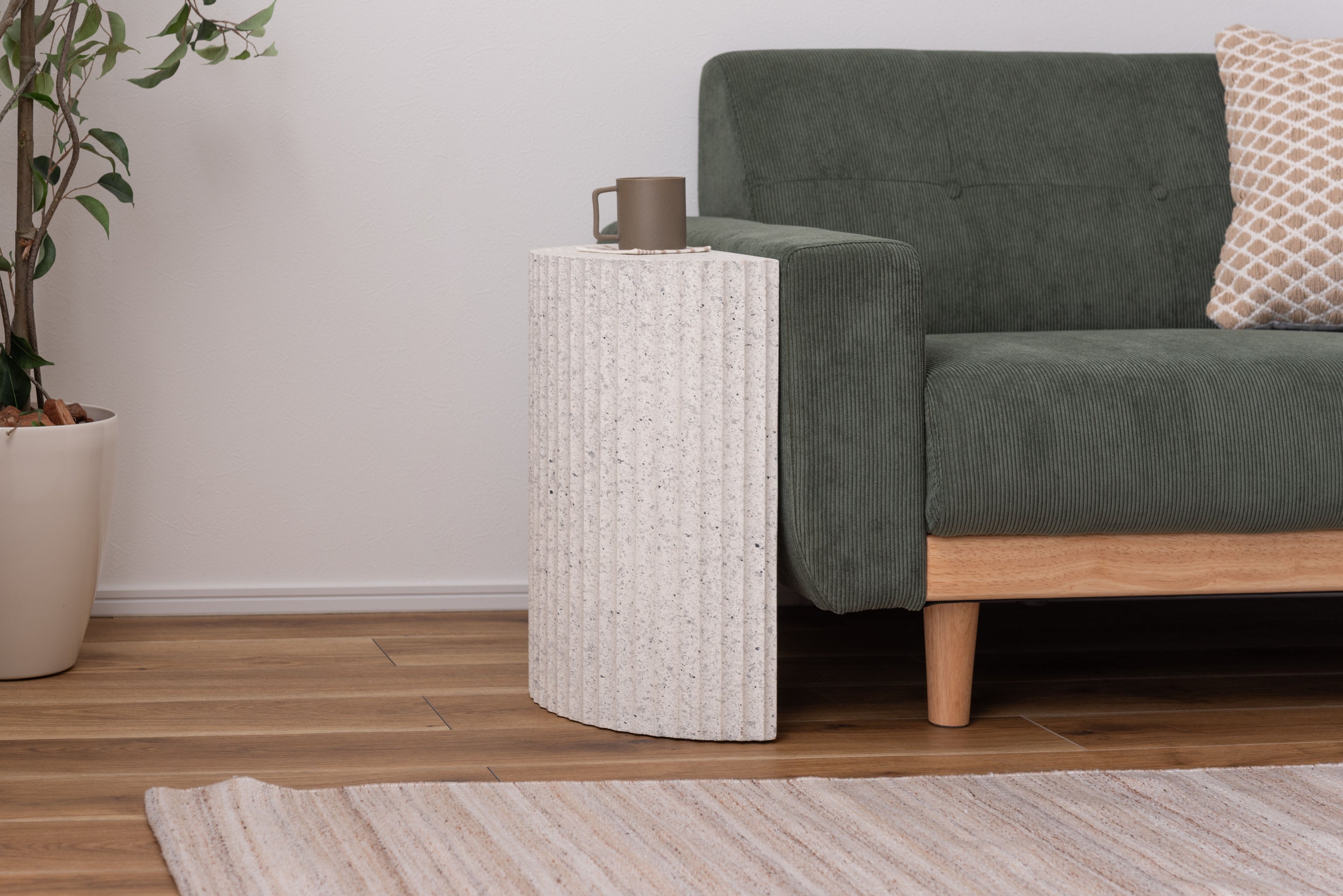 テラゾー柄と呼ばれる石の様な模様を施したトレンド感のあるシリーズ。表面は凹凸のある仕様。壁付けでも、ソファやベッドなどの家具の横付けでも。直線の面を付けて使えるサイドテーブル。裏面フェルトシール付き。