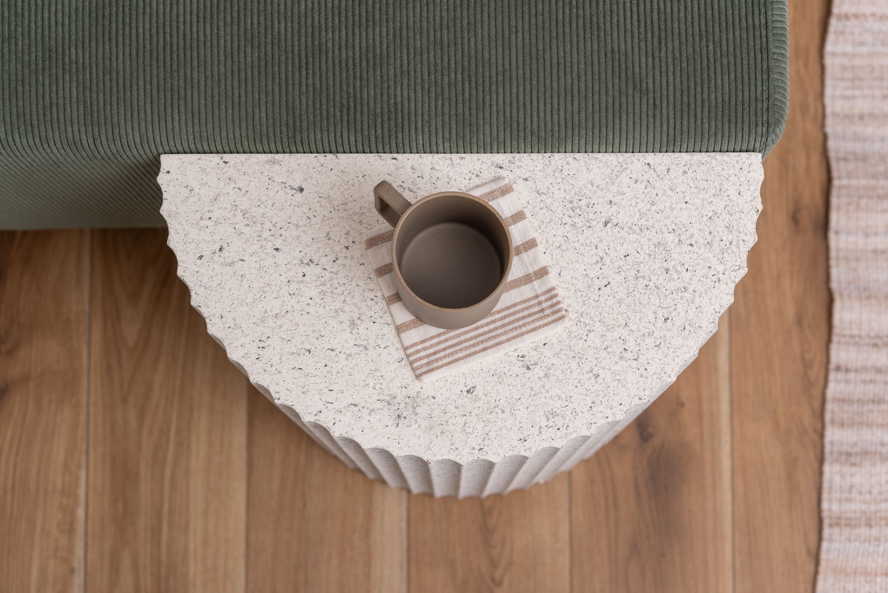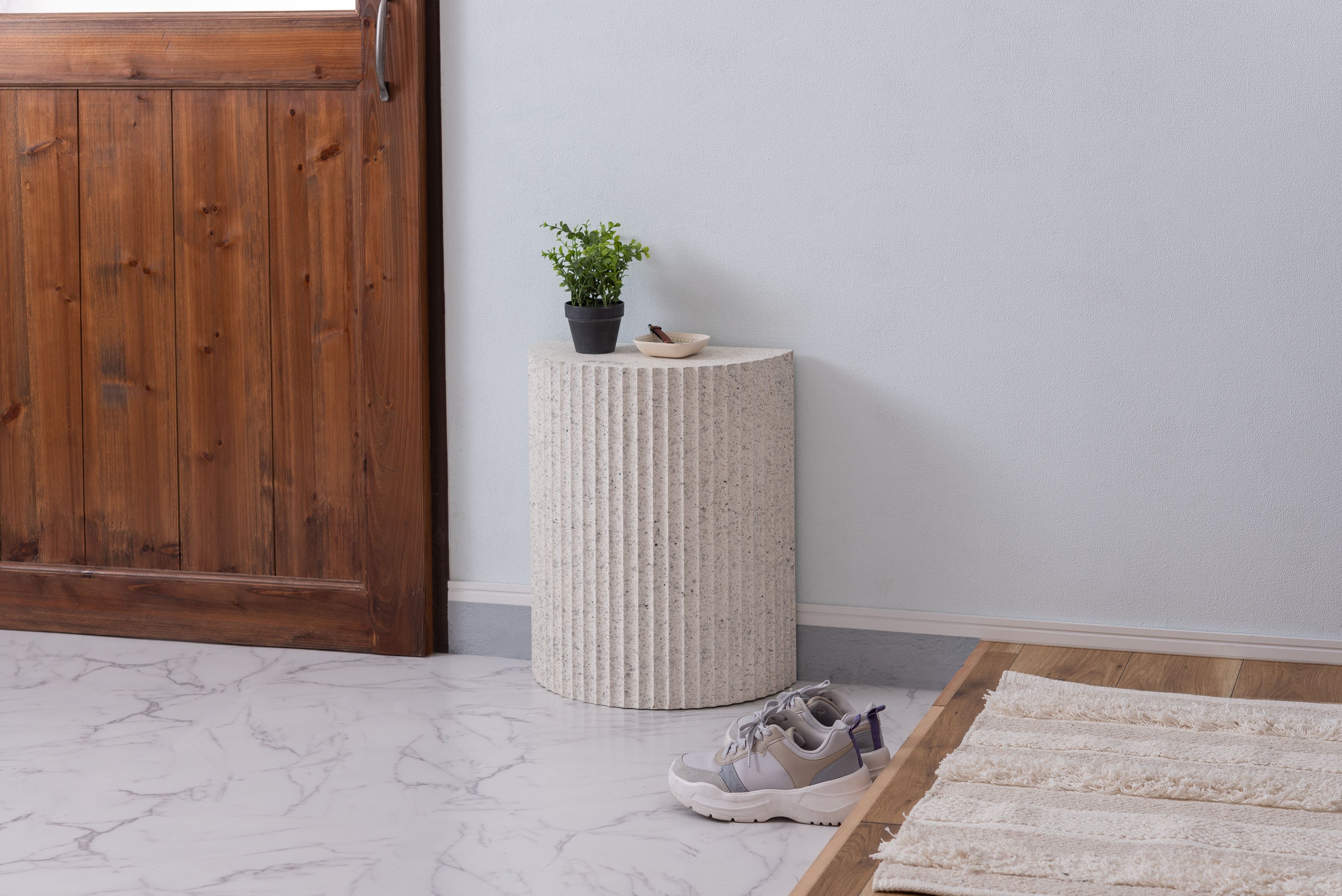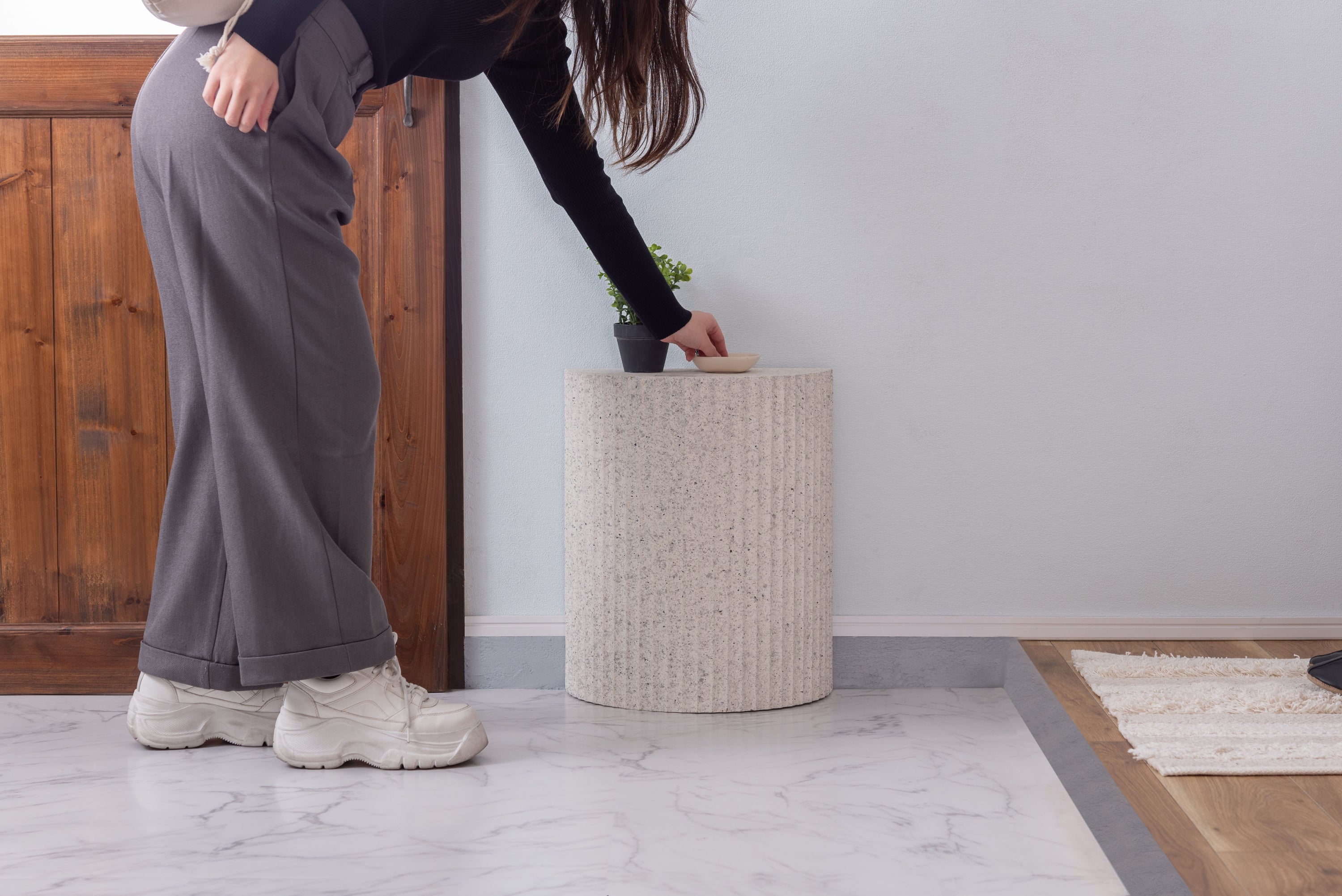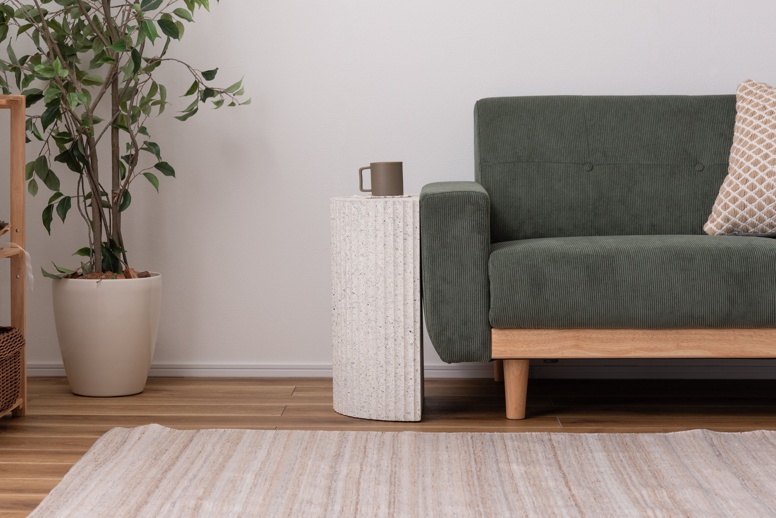 テラゾー柄と呼ばれる石の様な模様を施したトレンド感のあるシリーズ。表面は凹凸のある仕様。壁付けでも、ソファやベッドなどの家具の横付けでも。直線の面を付けて使えるサイドテーブル。裏面フェルトシール付き。