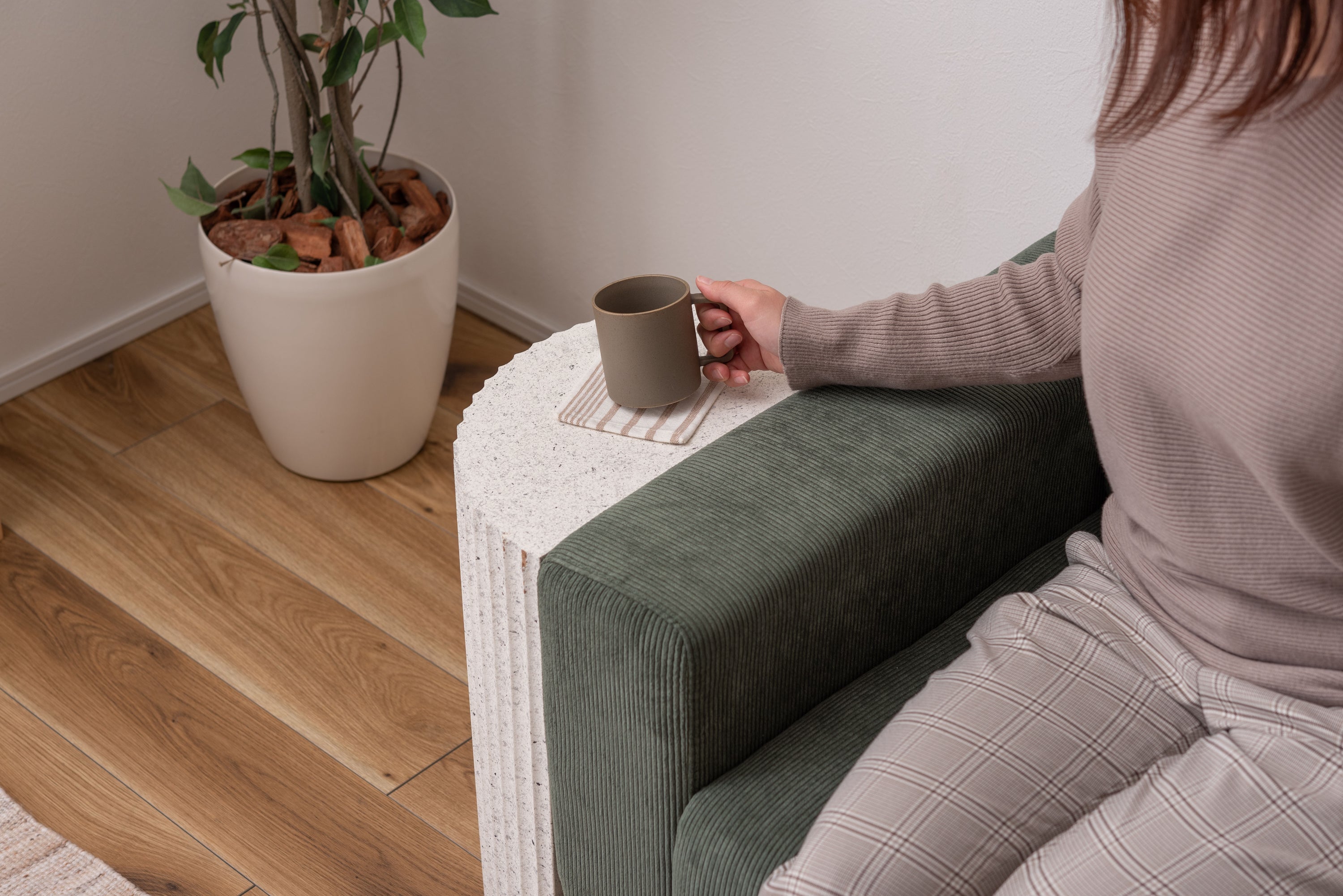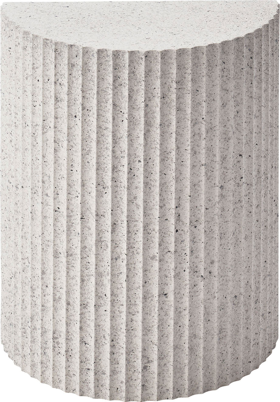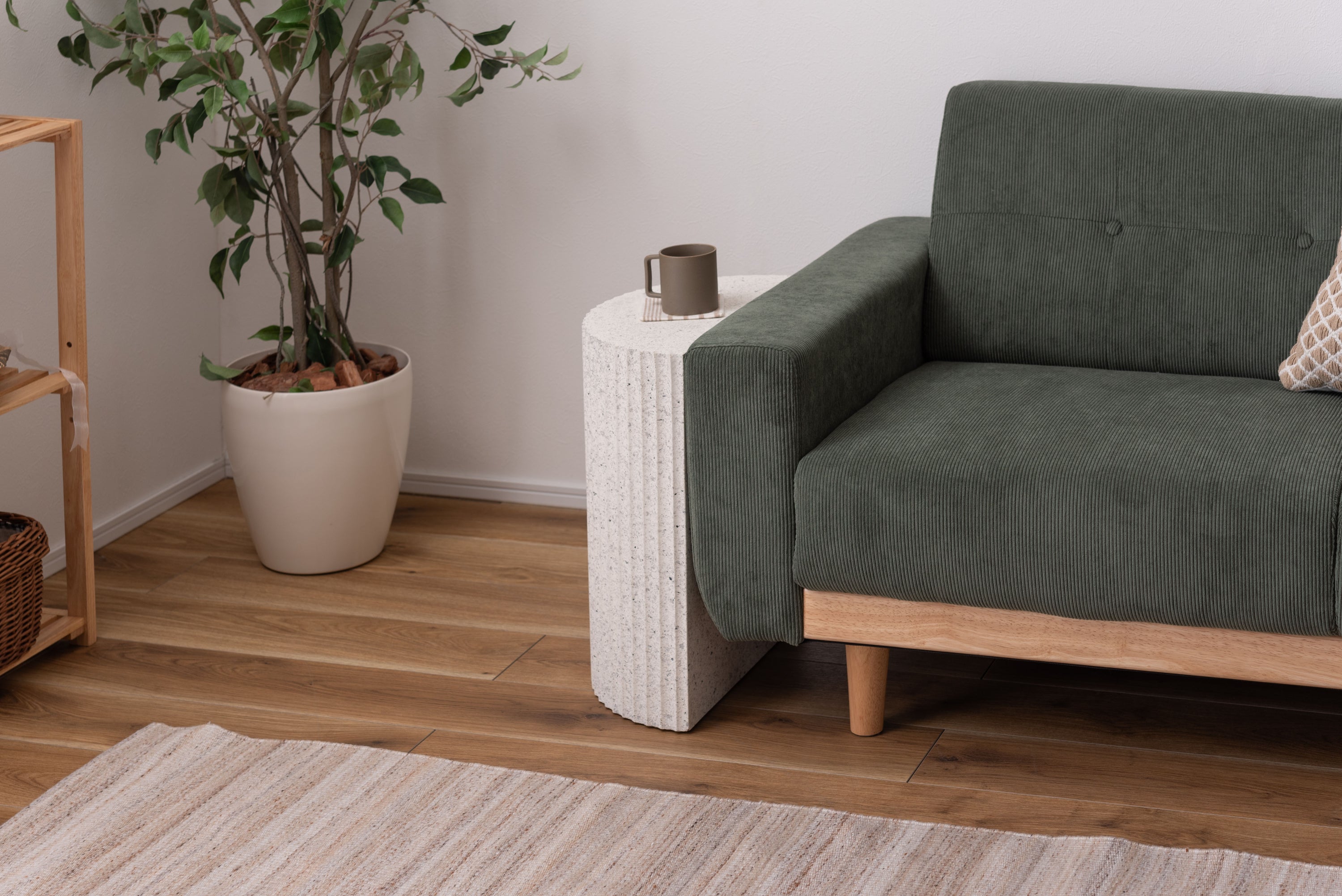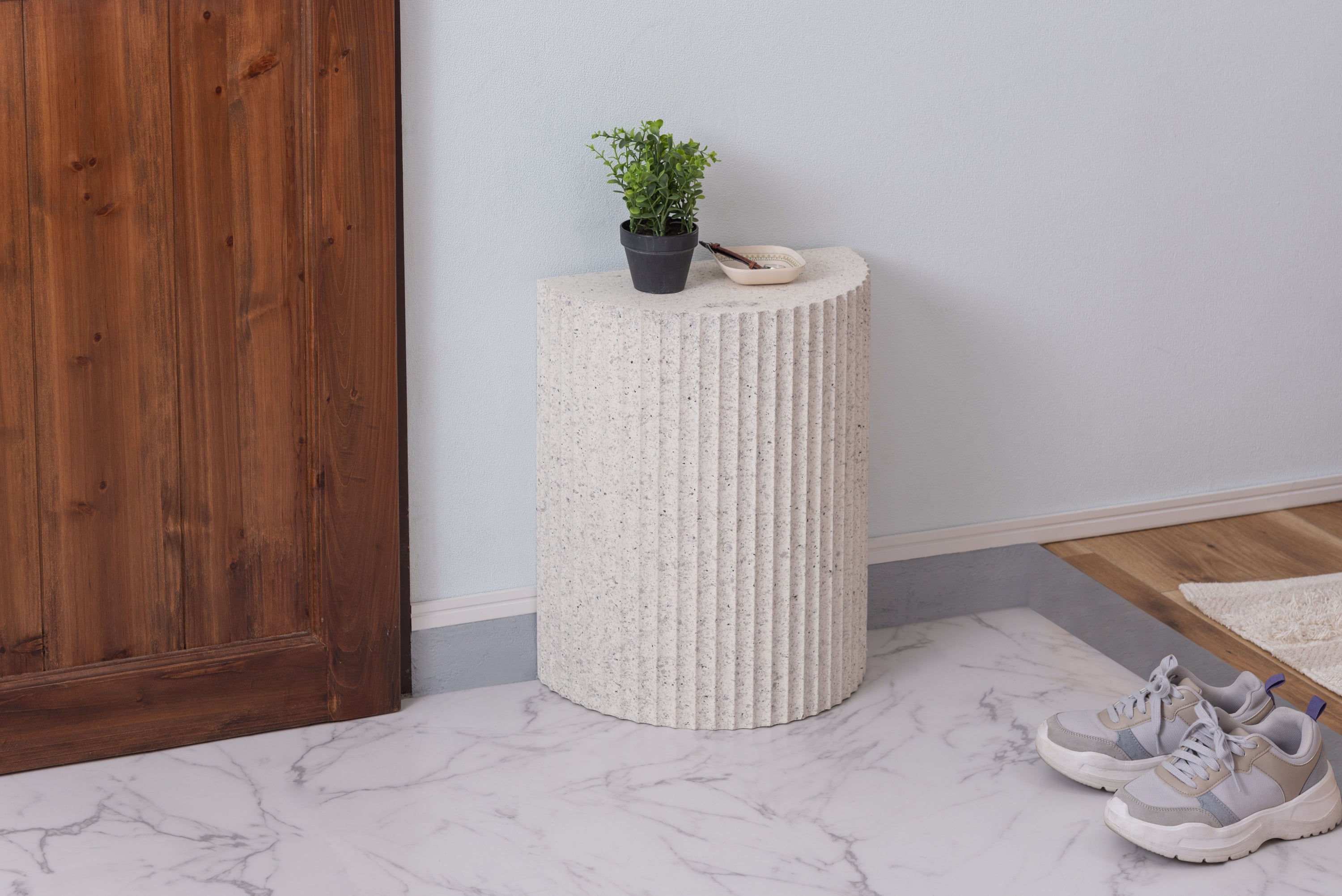 テラゾー柄と呼ばれる石の様な模様を施したトレンド感のあるシリーズ。表面は凹凸のある仕様。壁付けでも、ソファやベッドなどの家具の横付けでも。直線の面を付けて使えるサイドテーブル。裏面フェルトシール付き。