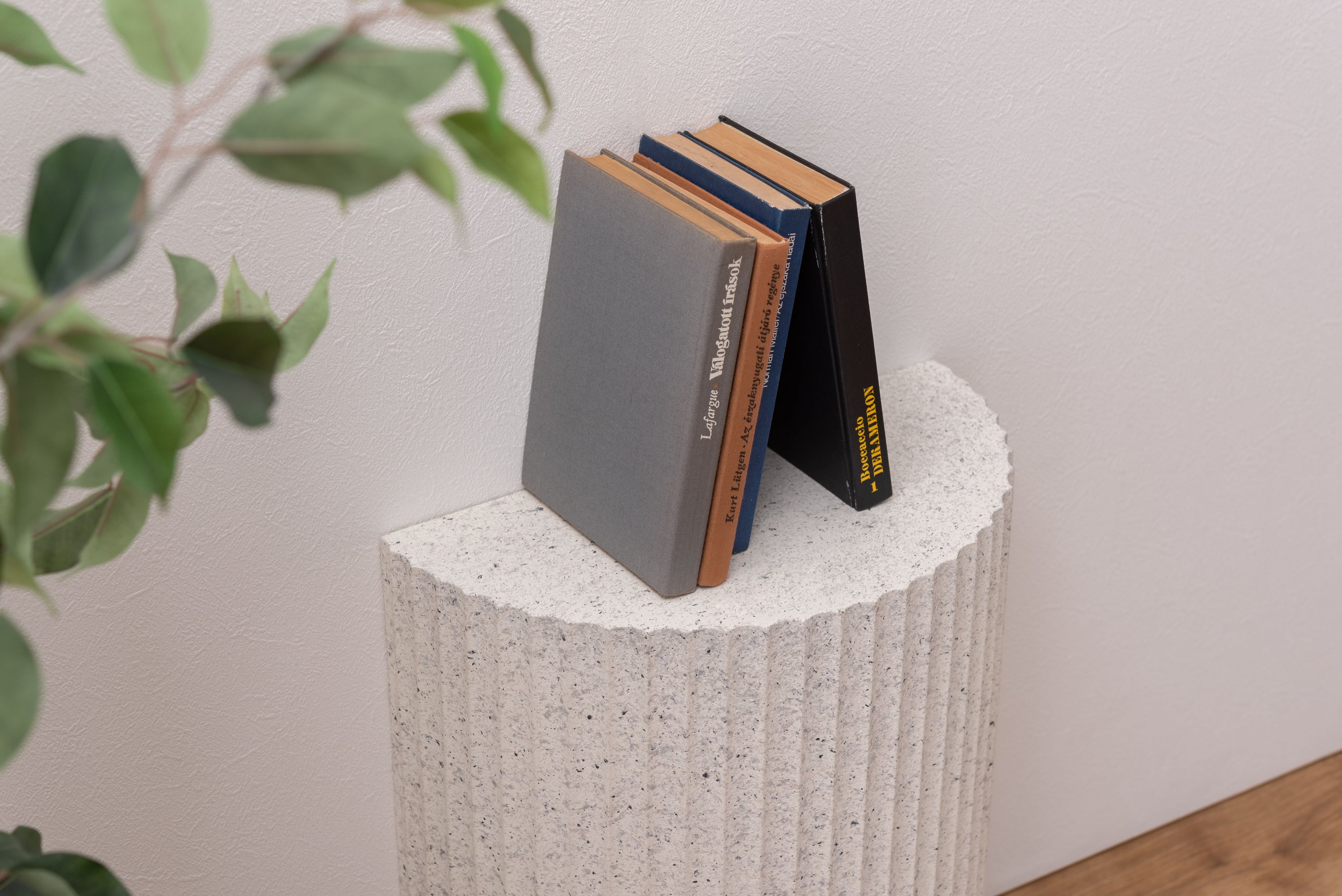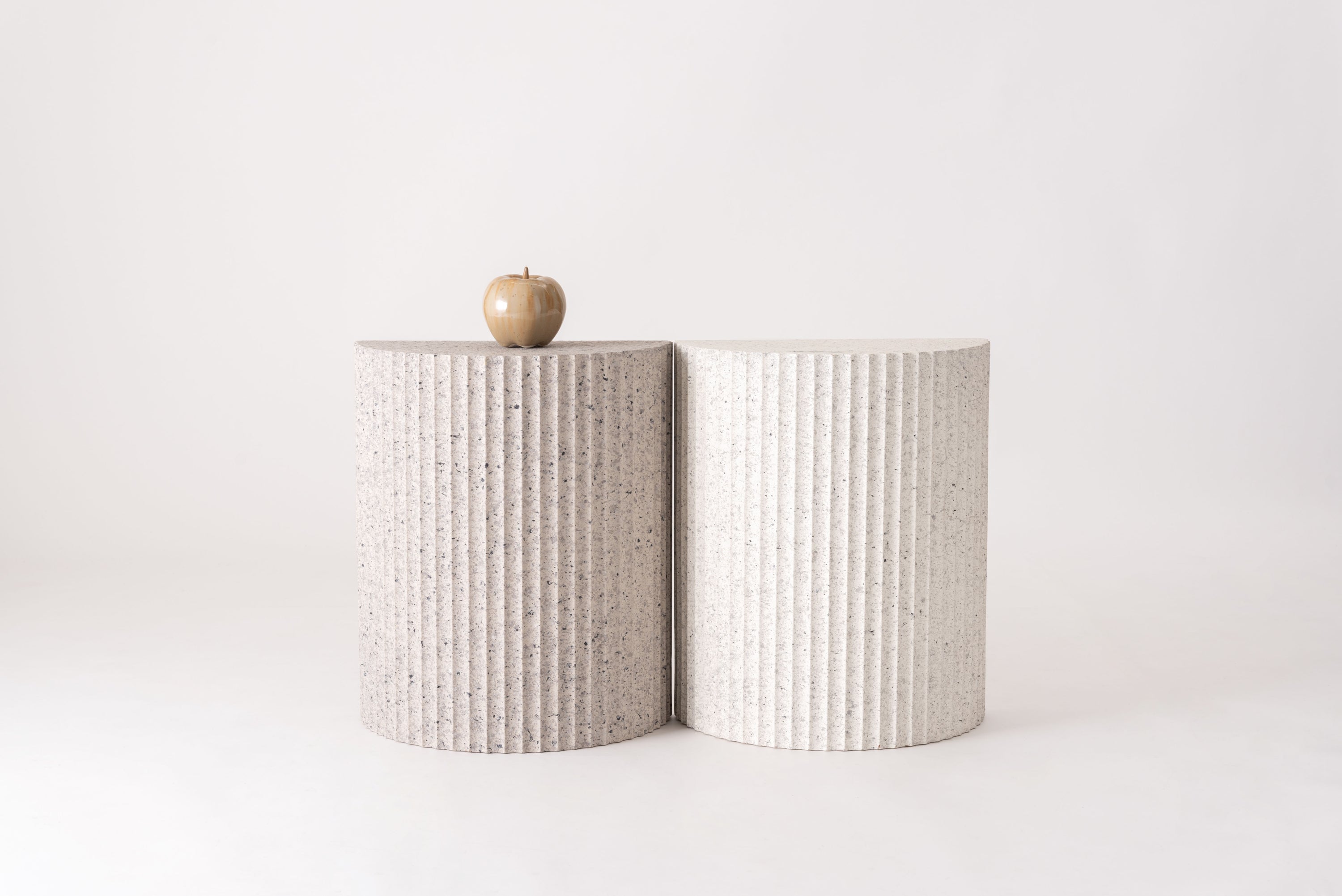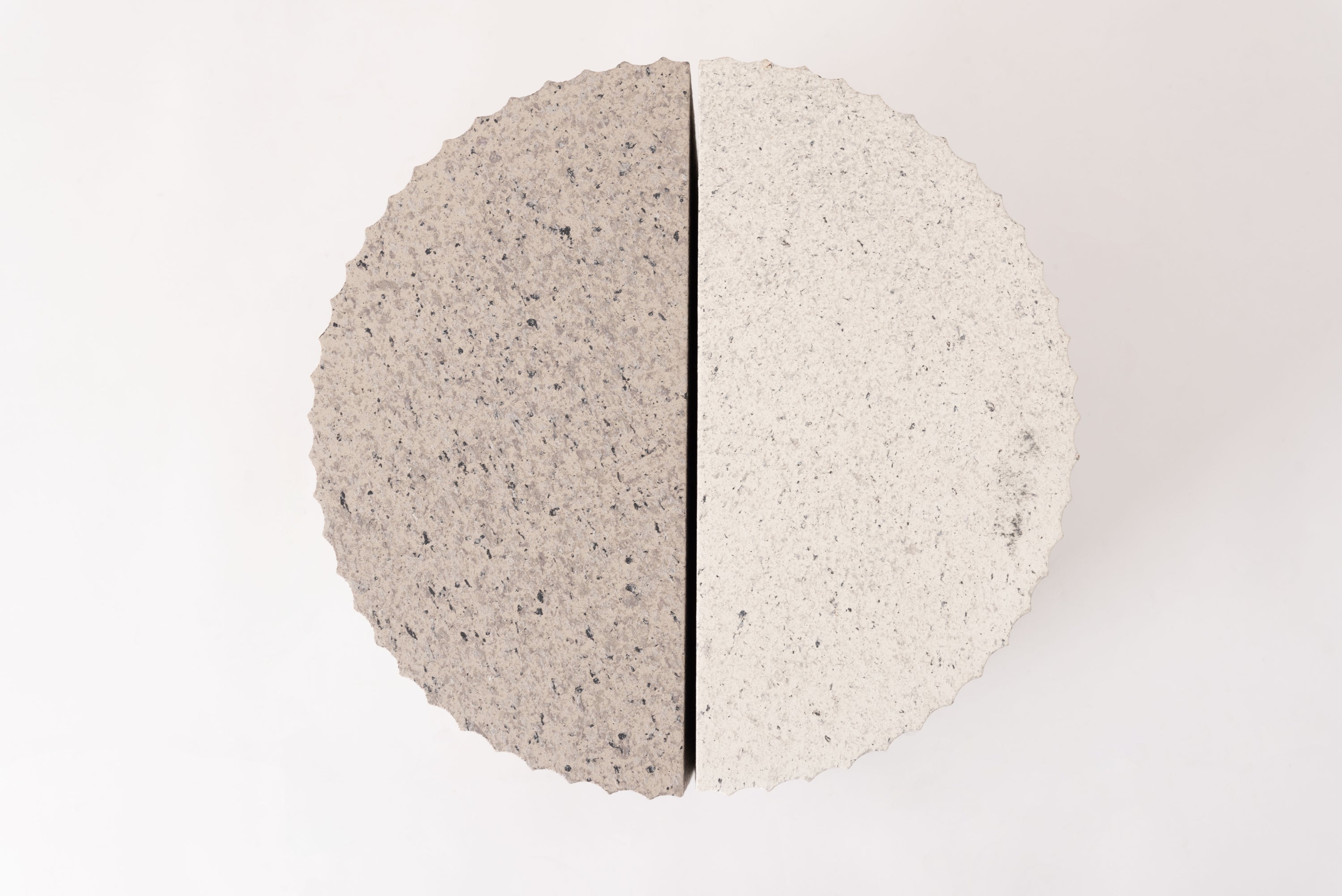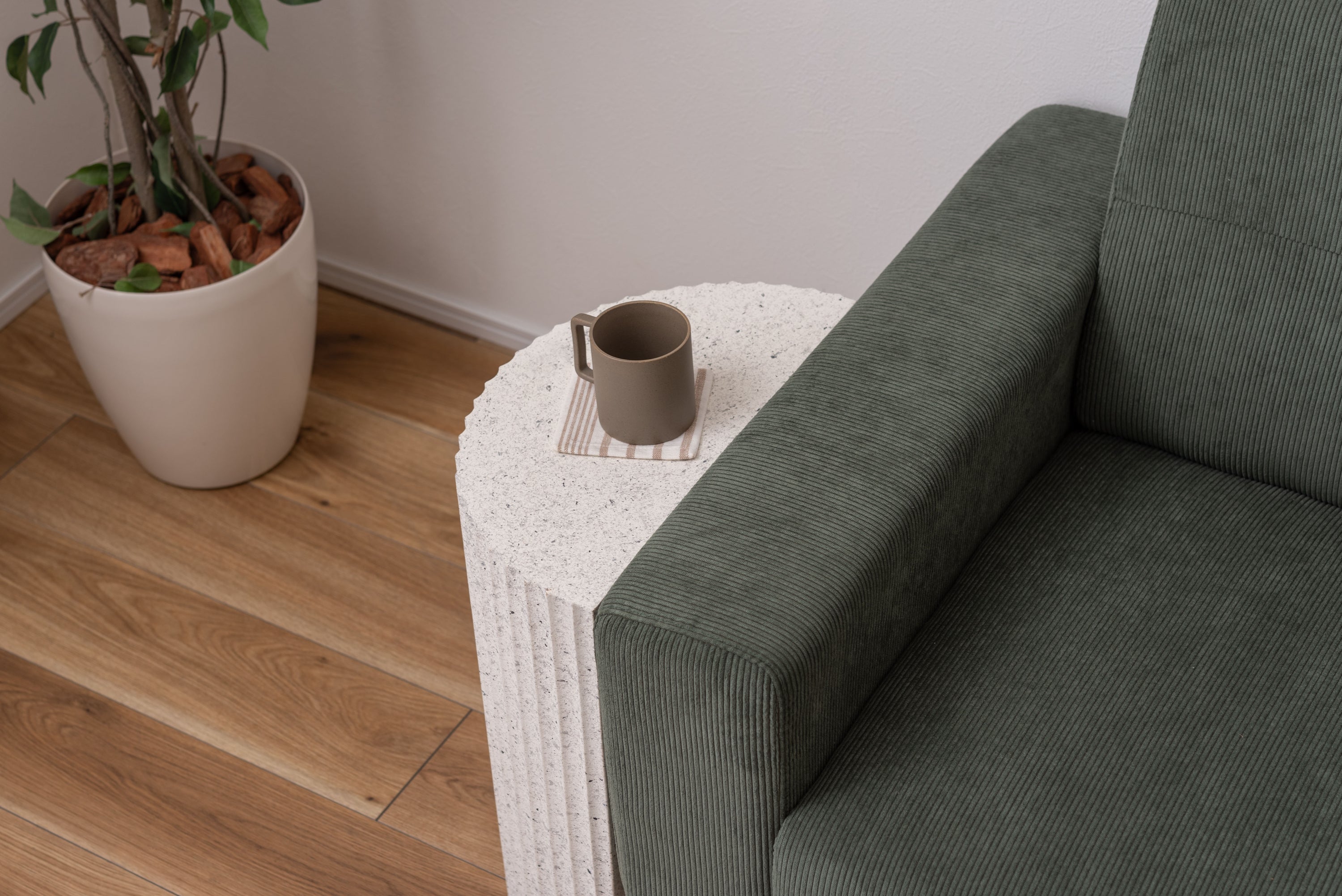 テラゾー柄と呼ばれる石の様な模様を施したトレンド感のあるシリーズ。表面は凹凸のある仕様。壁付けでも、ソファやベッドなどの家具の横付けでも。直線の面を付けて使えるサイドテーブル。裏面フェルトシール付き。
