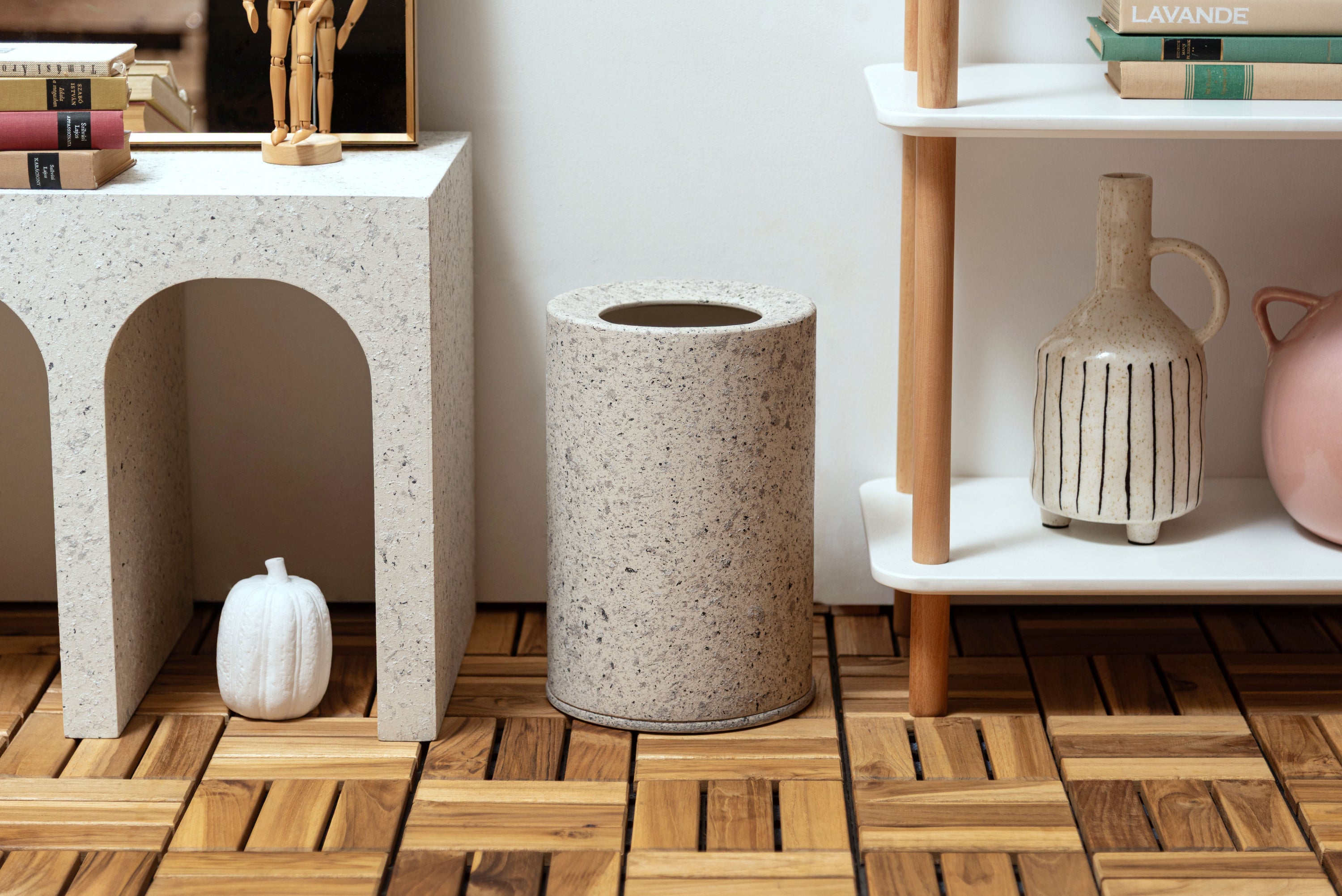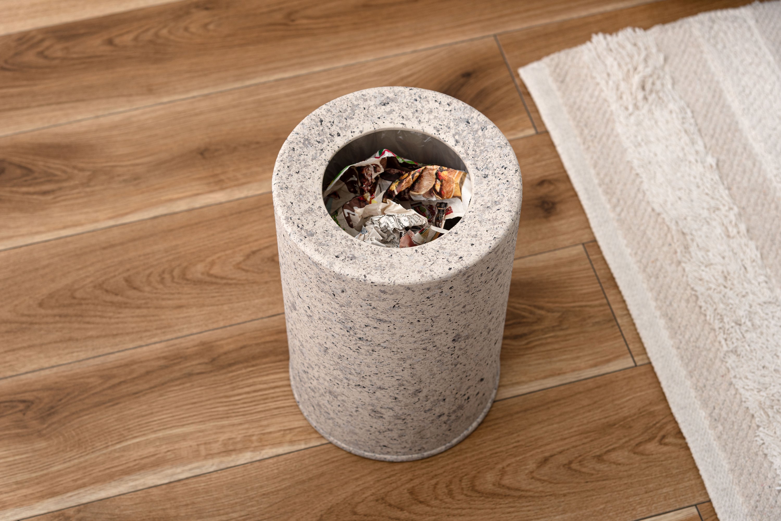 生活感を抑えたインテリアになじむトラッシュカン。ざらりとした凹凸が特徴的な、美しいテラゾー柄のトラッシュカン。二重構造のため、中のゴミ袋をしっかりと隠し生活感を抑えます。軽量でコンパクトなサイズ感のため、デスクまわりなどの限られたスペースにも置きやすく、部屋の移動や掃除の際も手間がかかりません。テラゾー柄と呼ばれる人工大理石の様な模様とシンプルな形状は、様々なテイストのインテリアに合わせることができます。凹凸のあるテラゾー柄。生活感を抑える二重構造。軽量設計