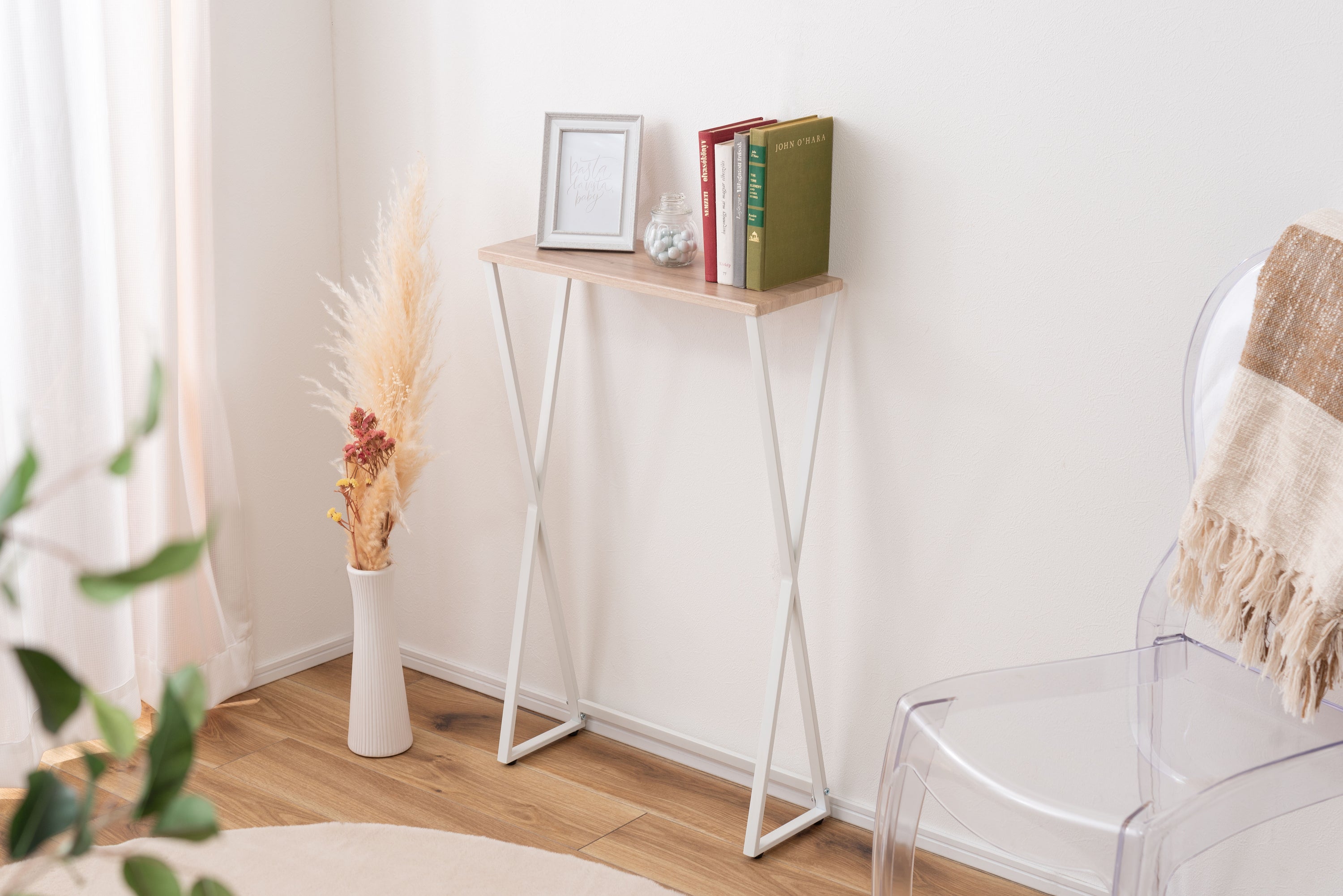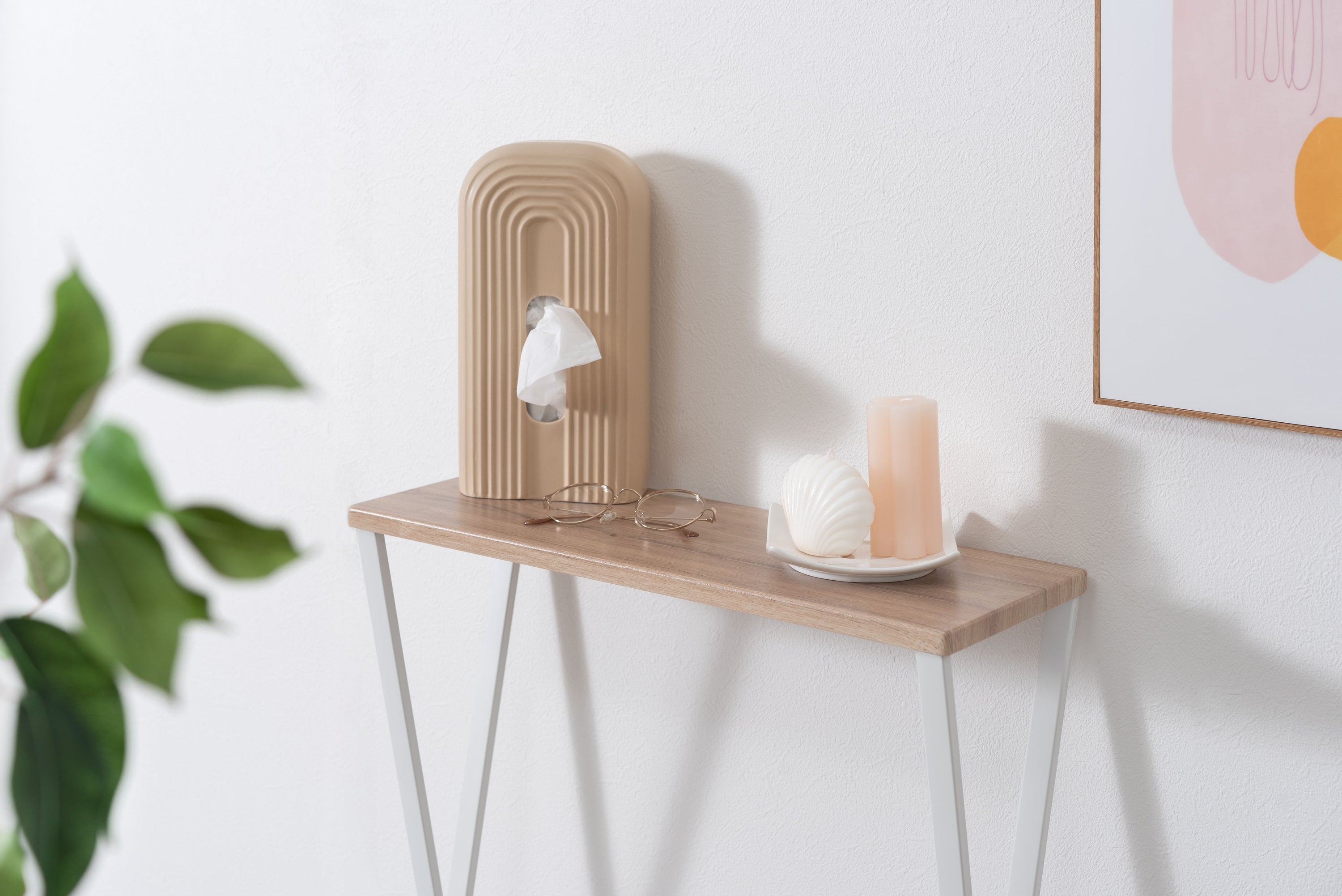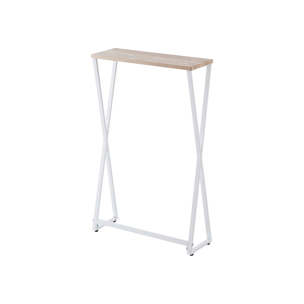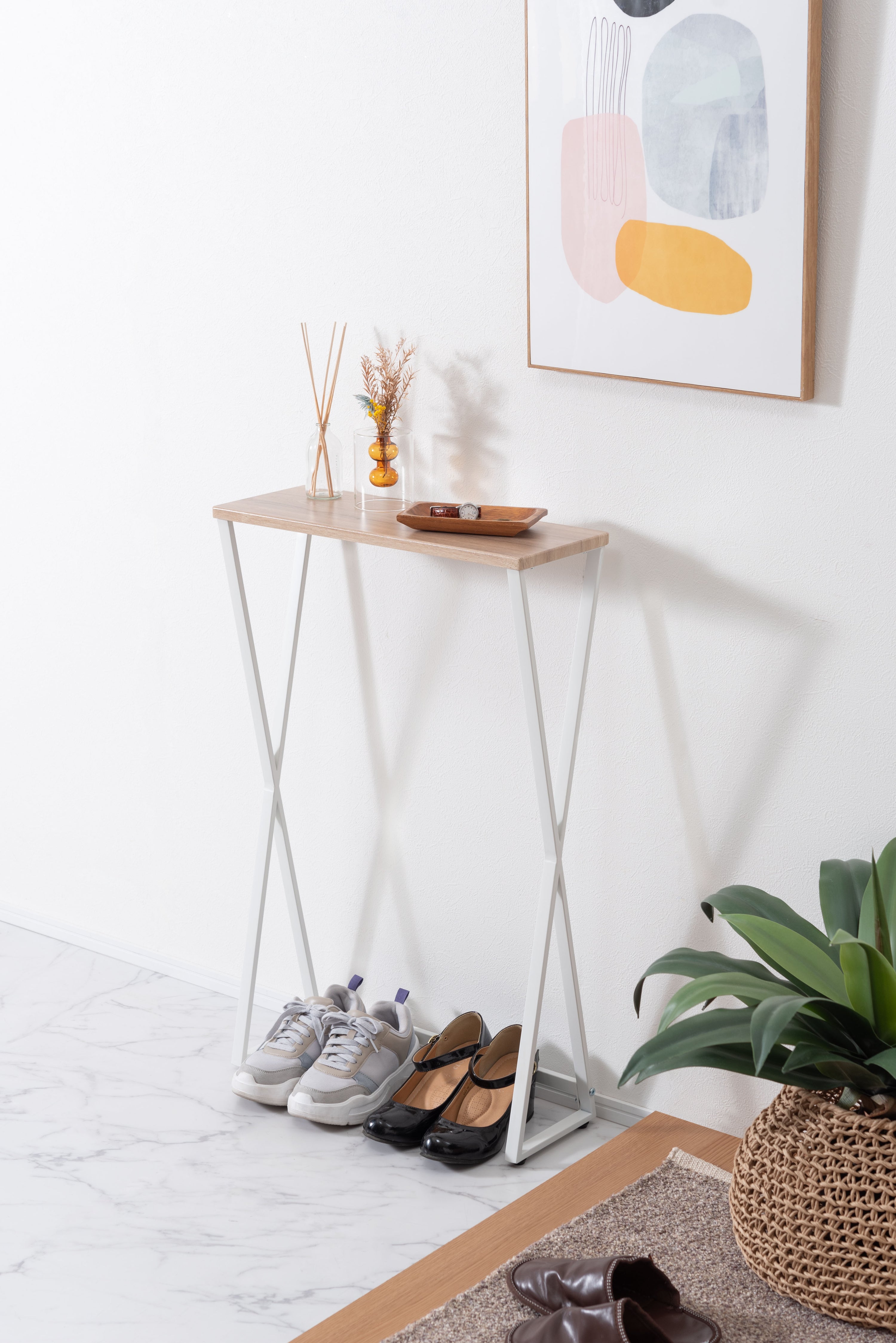 収納棚や飾り棚として活躍するコンソール。木目調の天板とスチール脚で構成されたシンプルなデザイン。奥行19cmとスリム設計で、置く場所を選ばず様々なシーンで活躍。玄関に置いて、鍵や腕時計などお出かけの際にサッと持ち出せる小物置きテーブルとして。リビングでも、ちょっとしたスペースに置いたりサイドテーブルにしたり。奥行19cmとスリム設計なので、置く場所を選ばず省スペースに設置可能。天板は木目調デザインで、ナチュラルな雰囲気を演出。脚フレームはお手入れがしやすいスチール製。脚裏にはアジャスターが付いているのでガタつきを軽減。