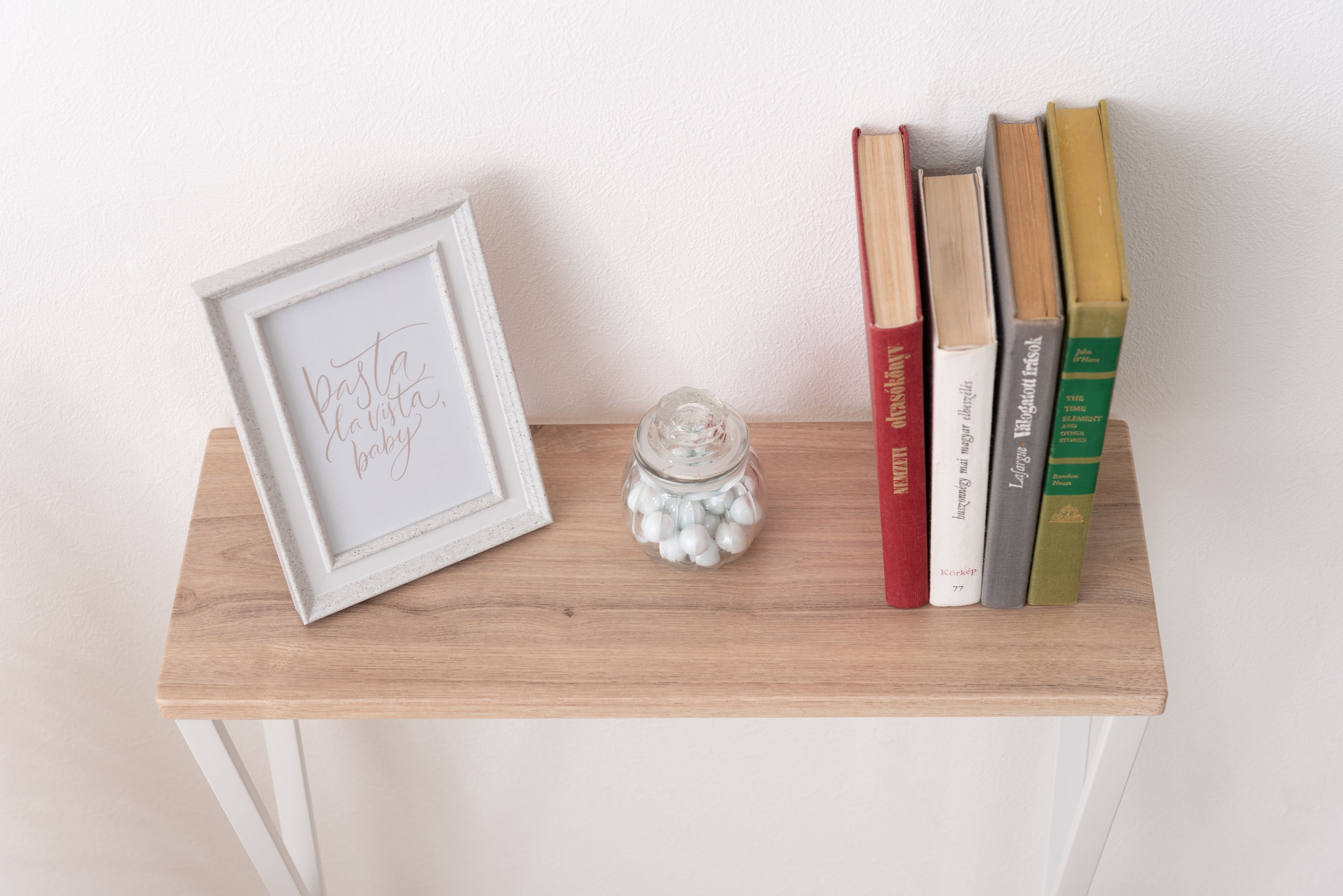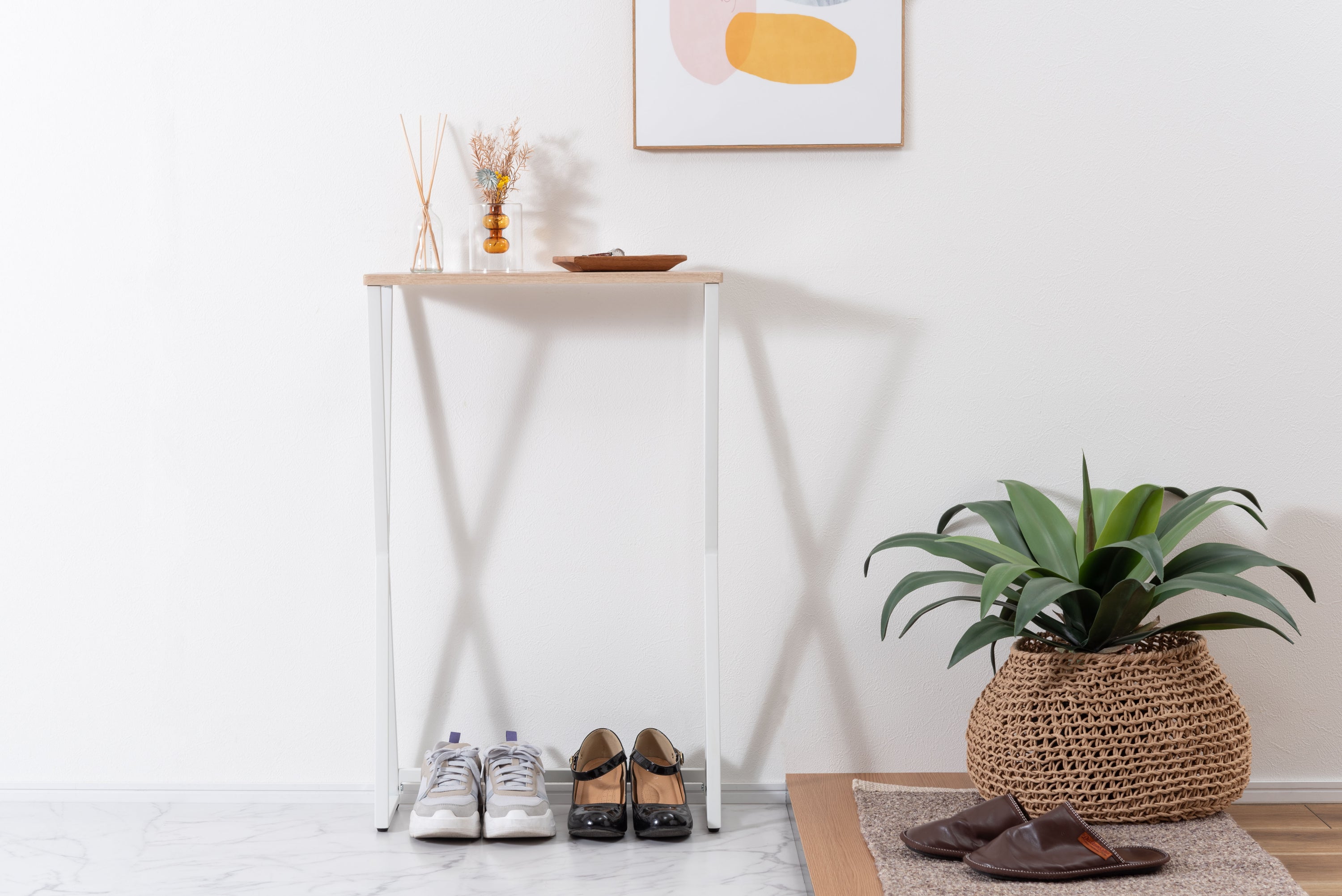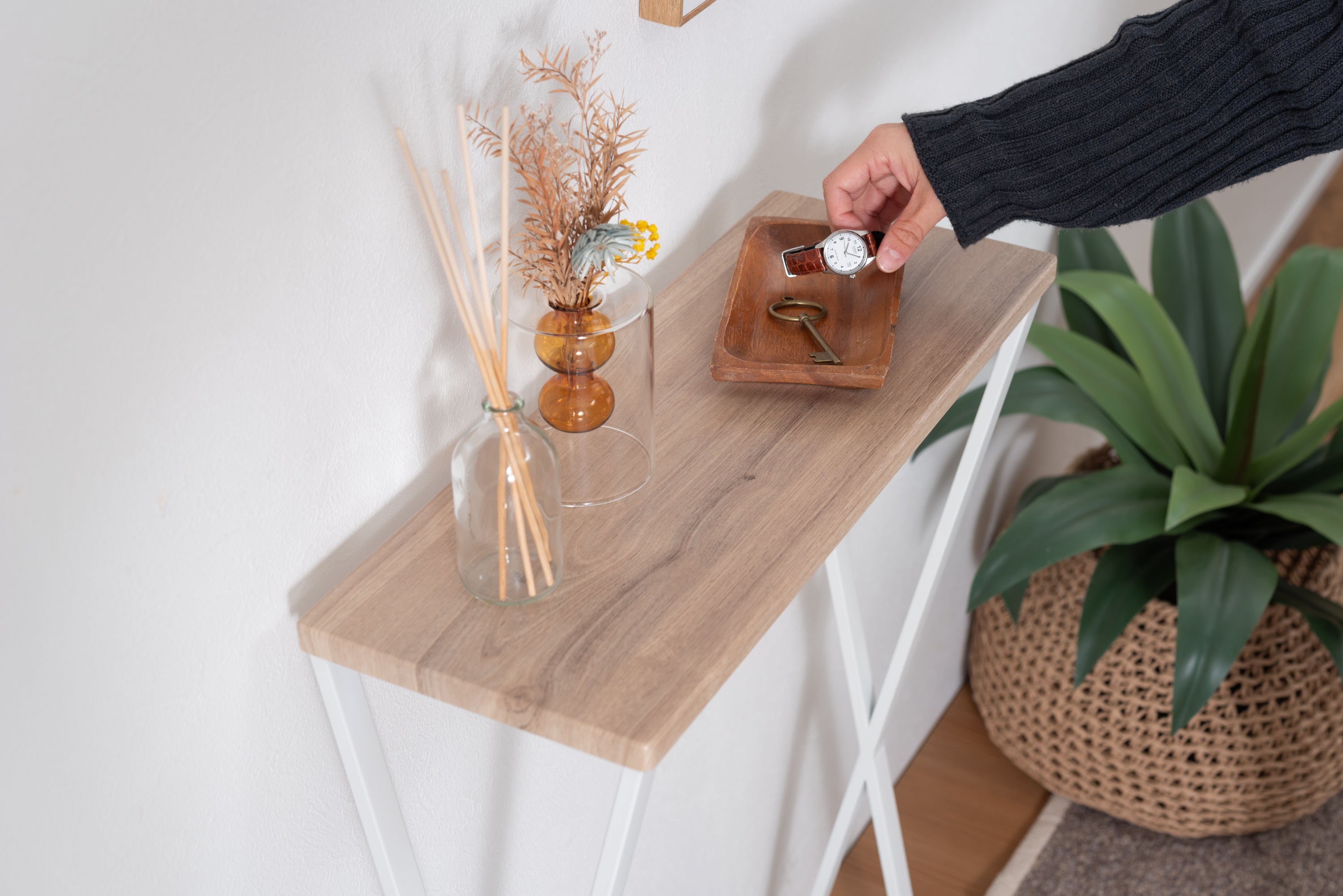収納棚や飾り棚として活躍するコンソール。木目調の天板とスチール脚で構成されたシンプルなデザイン。奥行19cmとスリム設計で、置く場所を選ばず様々なシーンで活躍。玄関に置いて、鍵や腕時計などお出かけの際にサッと持ち出せる小物置きテーブルとして。リビングでも、ちょっとしたスペースに置いたりサイドテーブルにしたり。奥行19cmとスリム設計なので、置く場所を選ばず省スペースに設置可能。天板は木目調デザインで、ナチュラルな雰囲気を演出。脚フレームはお手入れがしやすいスチール製。脚裏にはアジャスターが付いているのでガタつきを軽減。