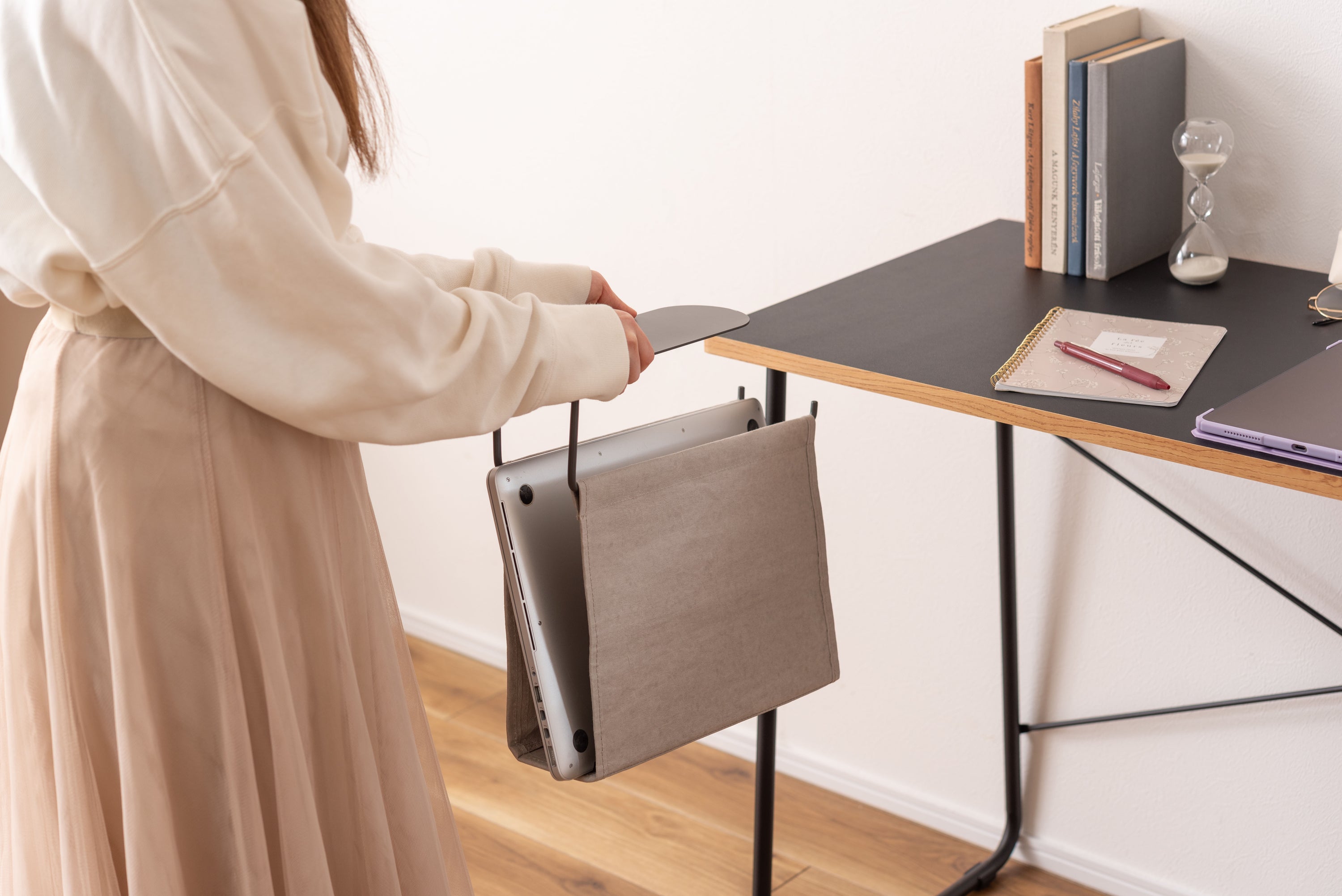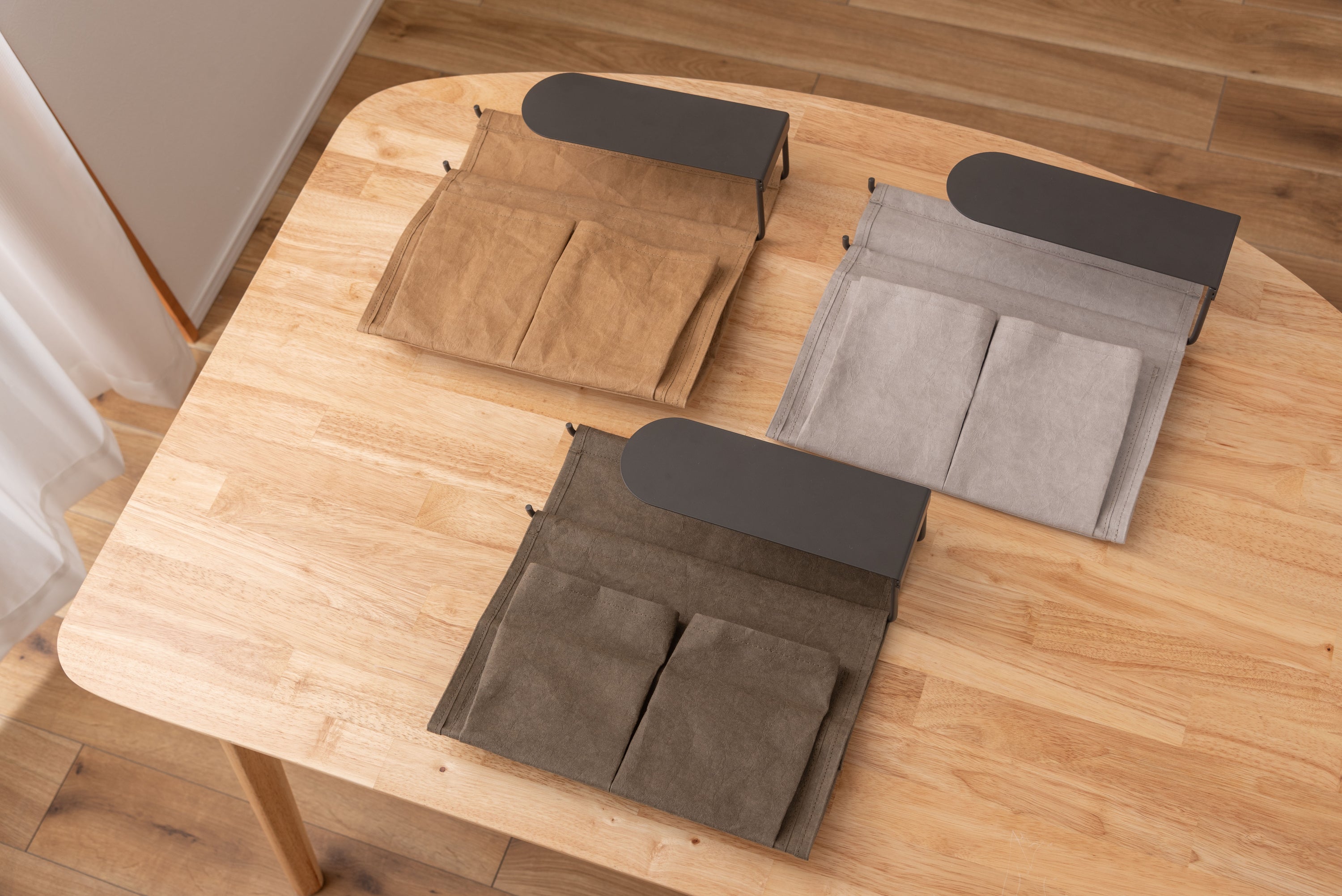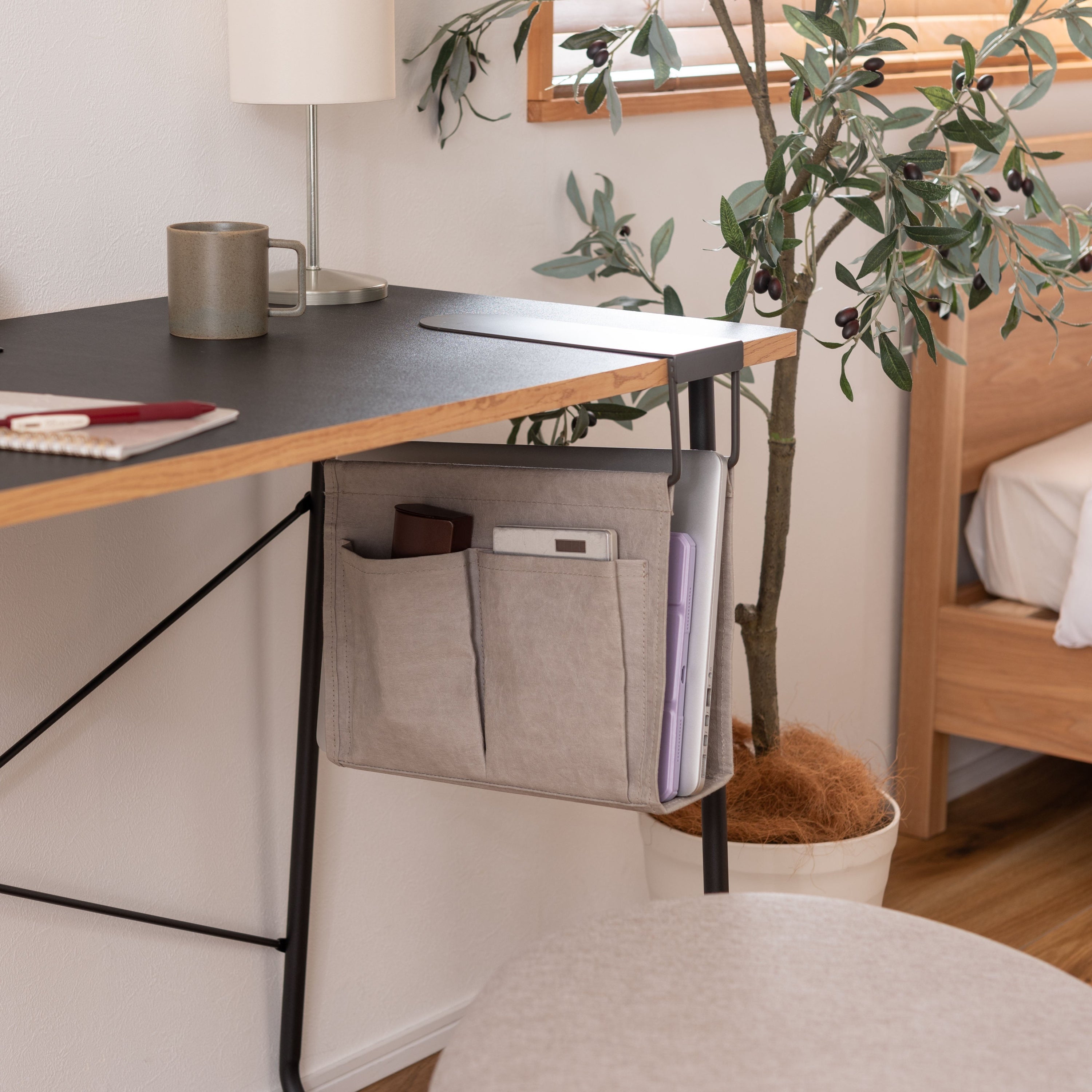テーブル下のデッドスペースを有効活用 リビングやデスクをスッキリさせるハンギング収納バッグ。 A4ファイルやタブレット端末も楽々入る大きさで、利便性も抜群。 強化べラム紙を使用し、シンプルかつお洒落に収納できます。