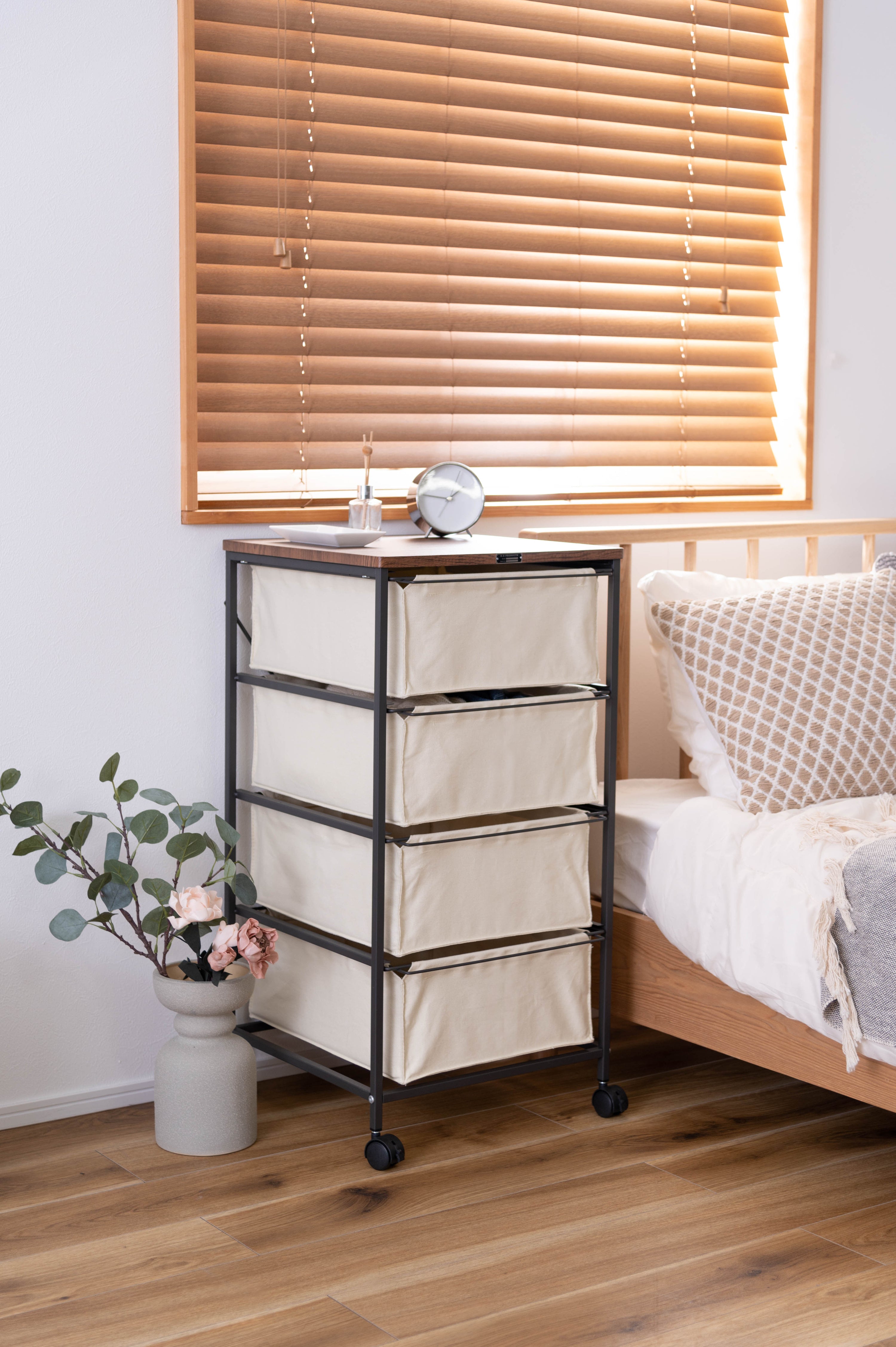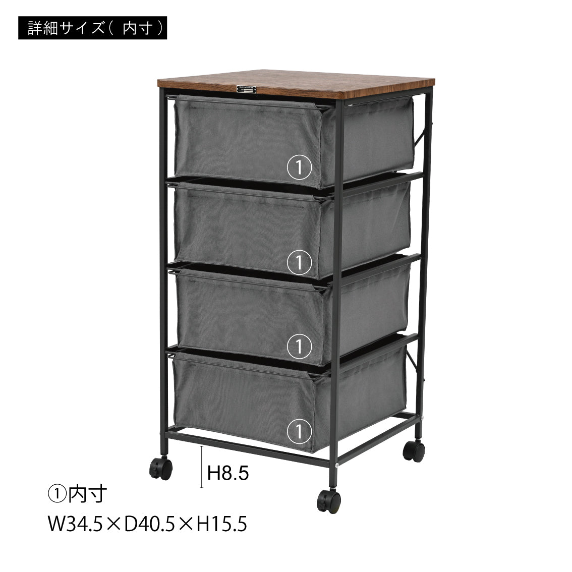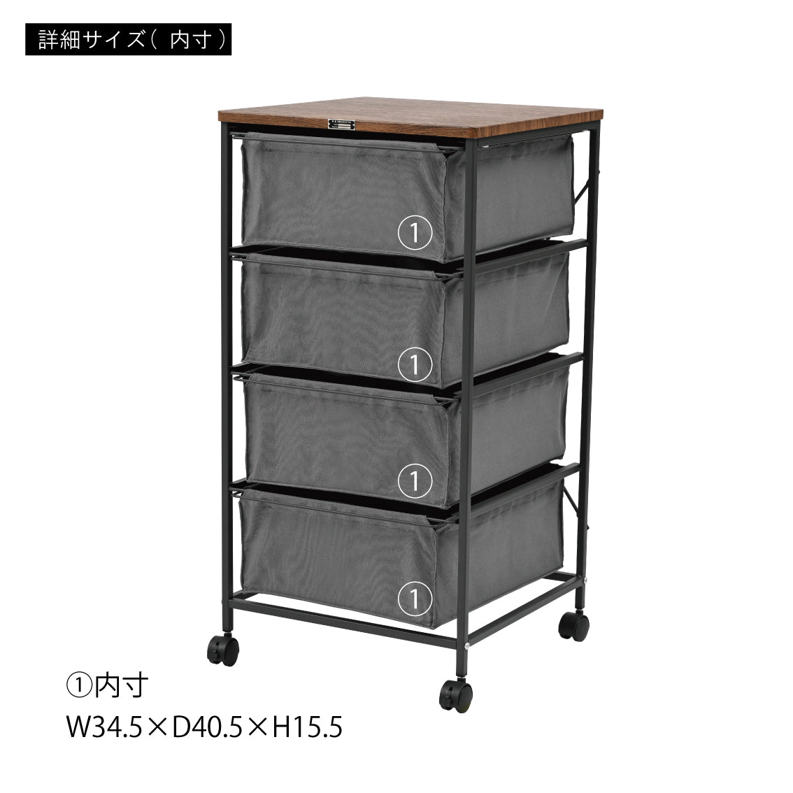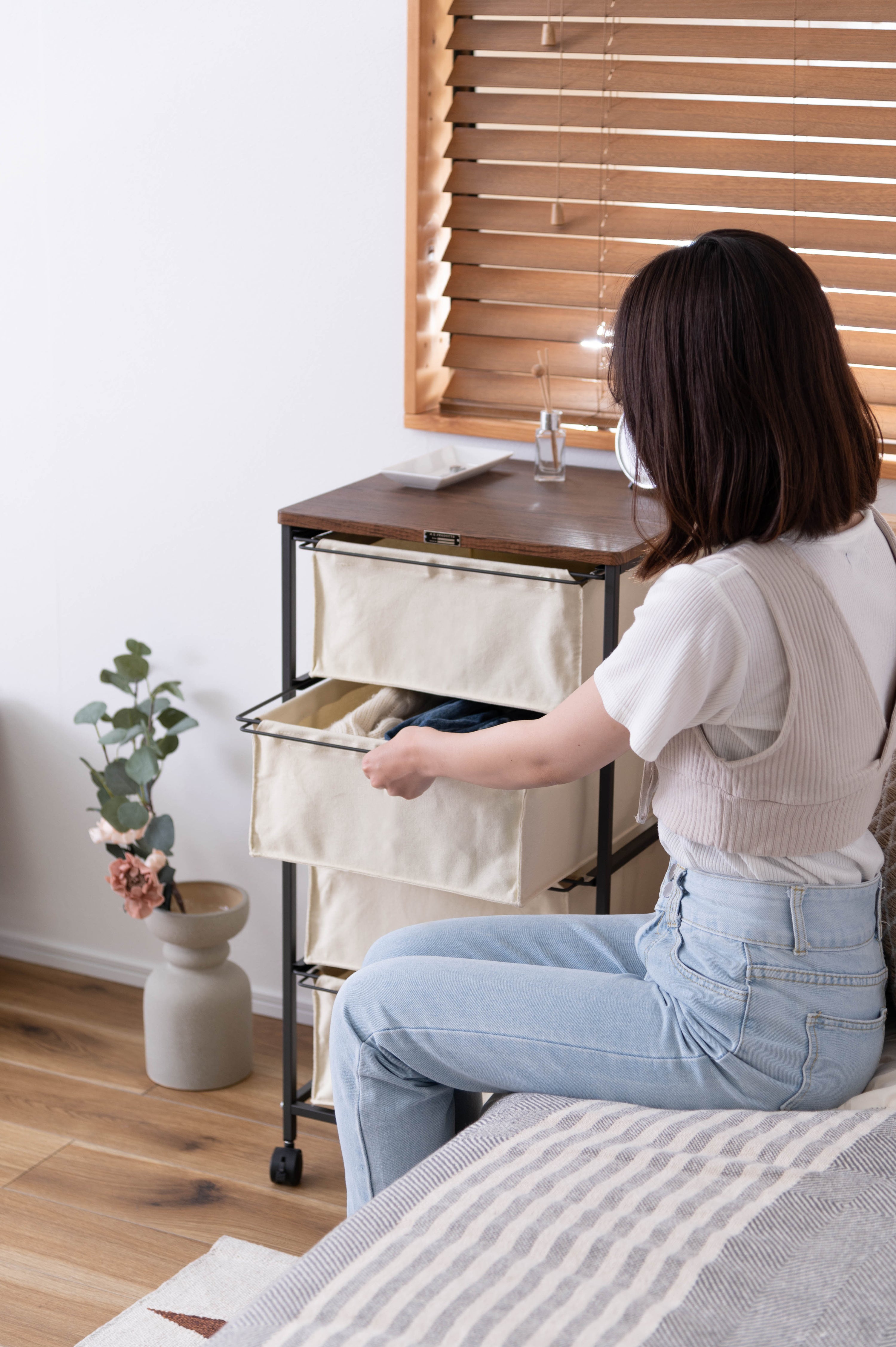 お部屋のインテリアにもなじみやすく、使い勝手のいいキャンバスチェスト。ダイニングや玄関、寝室、洗面所、キッチンなど、様々なシーンの収納として使えます。脚部はキャスター付きで移動もラクに行え、ストッパーも付いているのできちんと固定することもできます。天板はインテリア性のある木目調のシートを使用。角は丸く仕上げてあるので安心です。天板正面にはワンポイントデザインとして小さなプレート付き。引き出しには取っ手が付いているのでスムーズに出し入れできます。