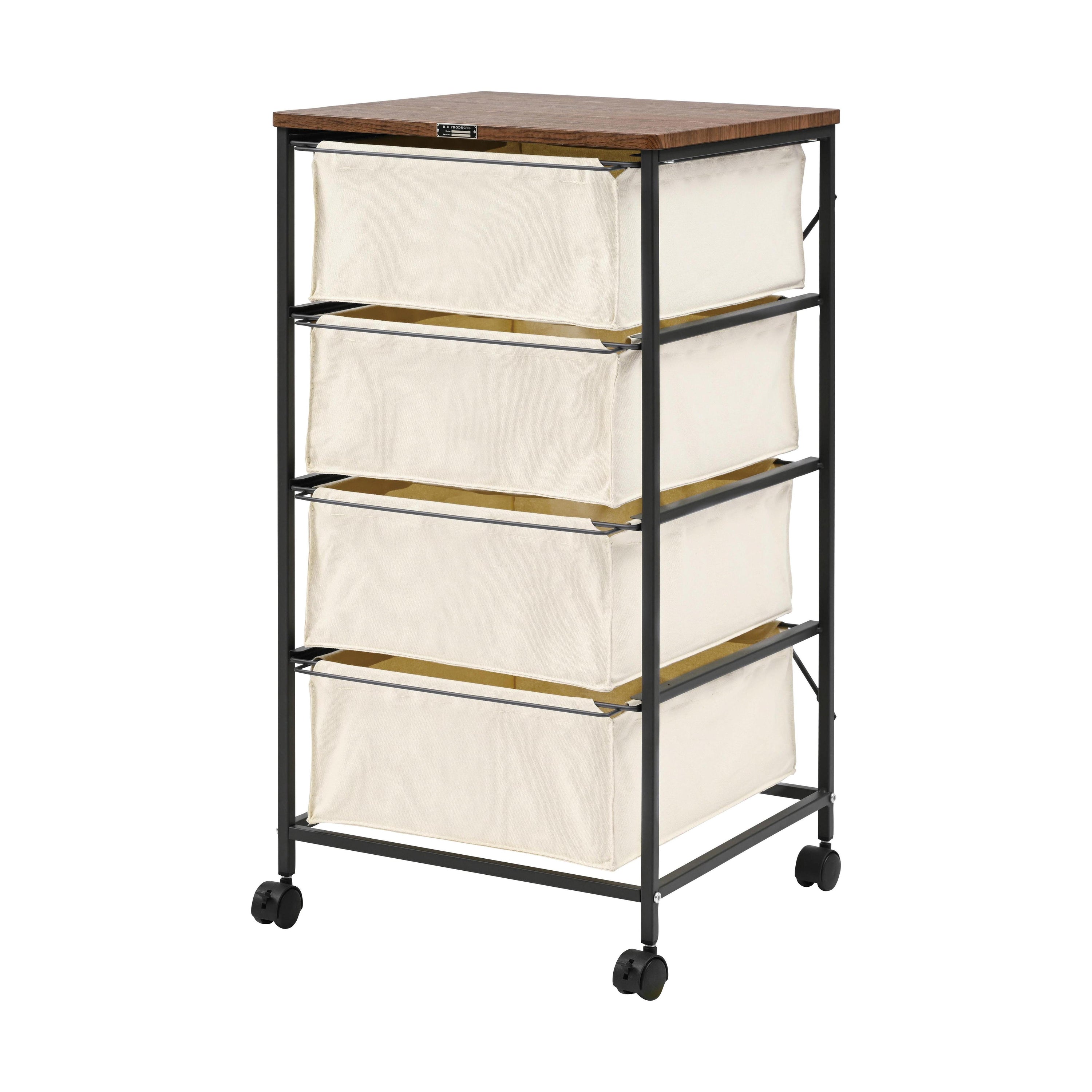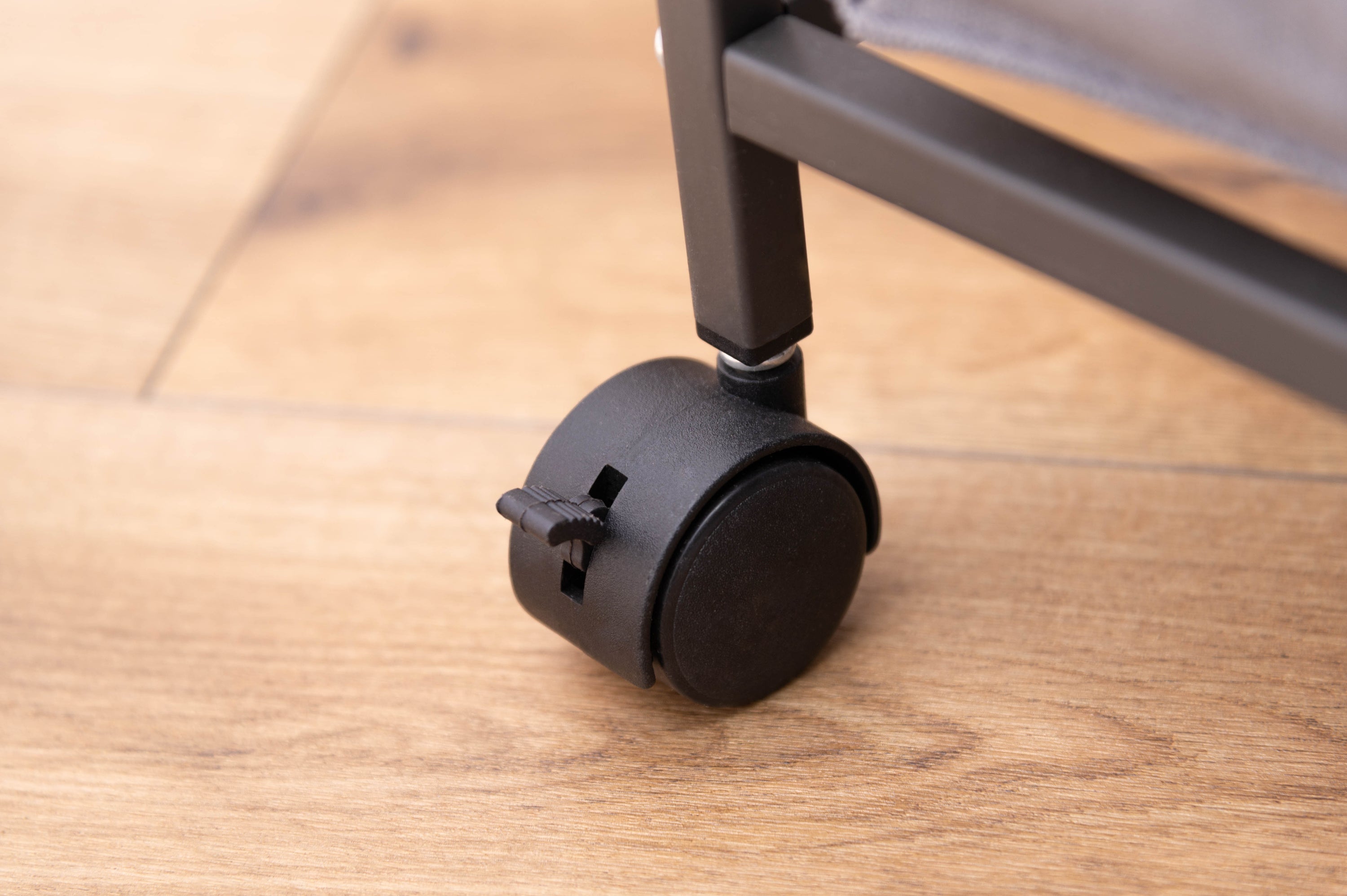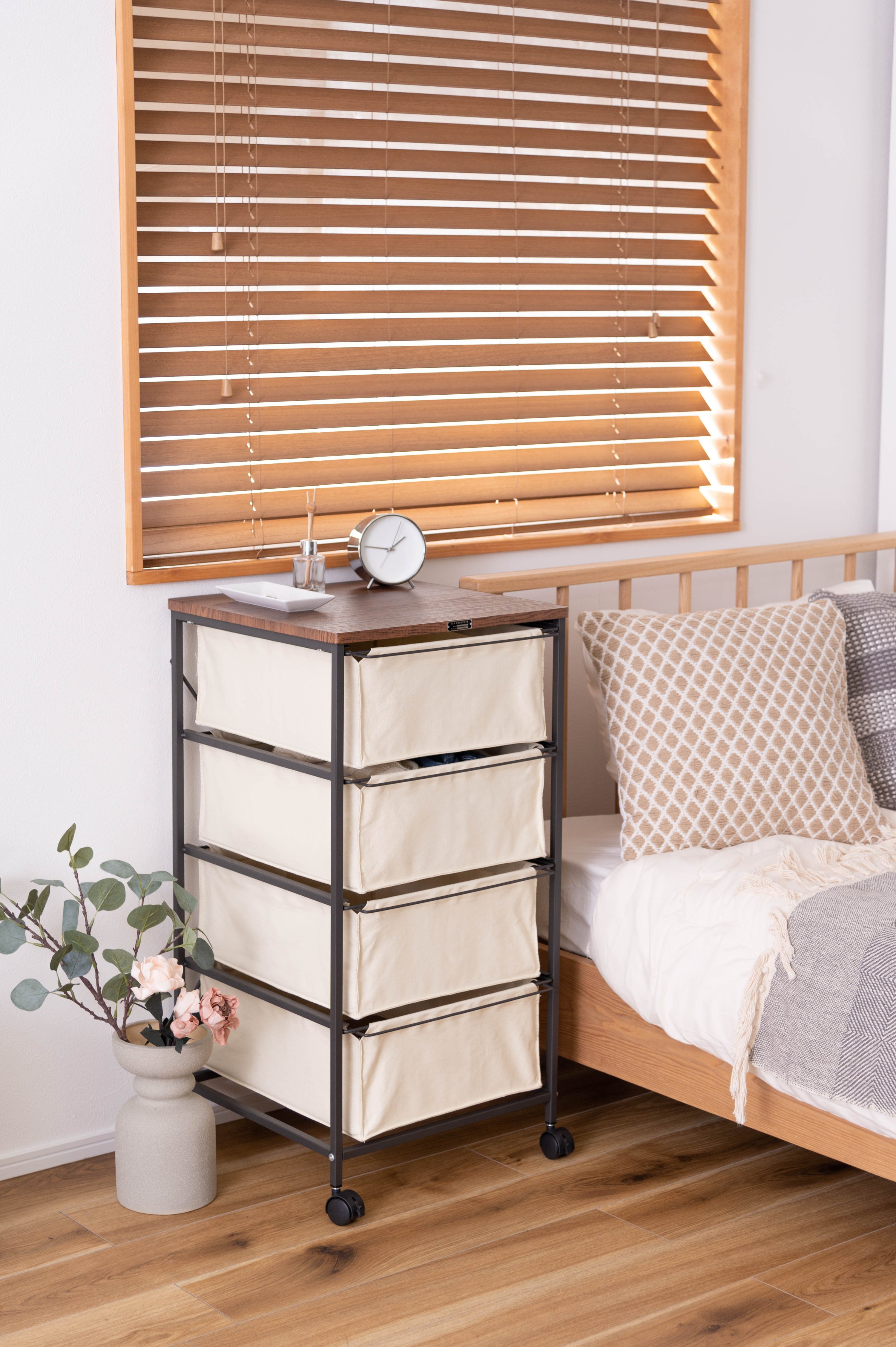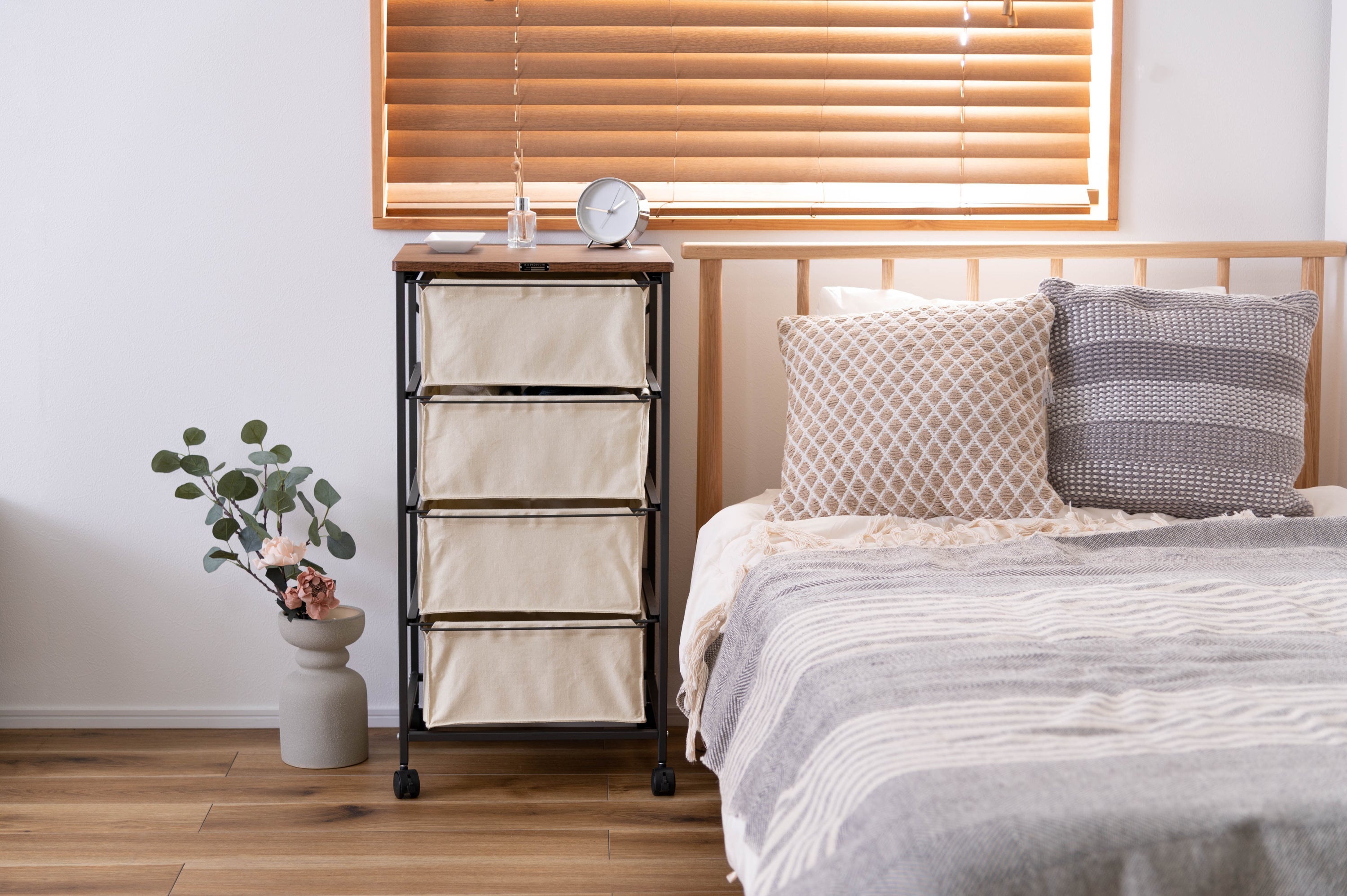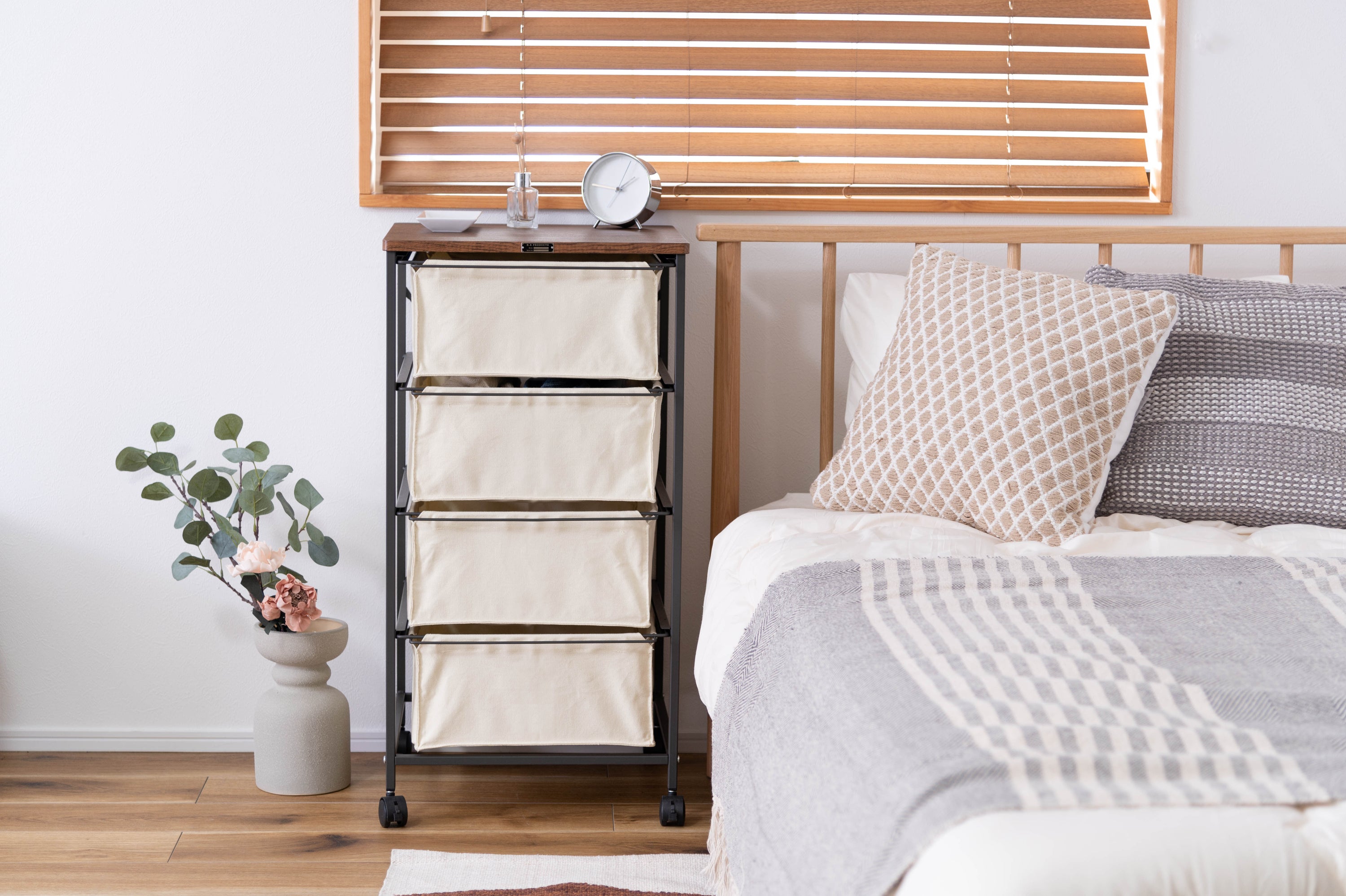 お部屋のインテリアにもなじみやすく、使い勝手のいいキャンバスチェスト。ダイニングや玄関、寝室、洗面所、キッチンなど、様々なシーンの収納として使えます。脚部はキャスター付きで移動もラクに行え、ストッパーも付いているのできちんと固定することもできます。天板はインテリア性のある木目調のシートを使用。角は丸く仕上げてあるので安心です。天板正面にはワンポイントデザインとして小さなプレート付き。引き出しには取っ手が付いているのでスムーズに出し入れできます。