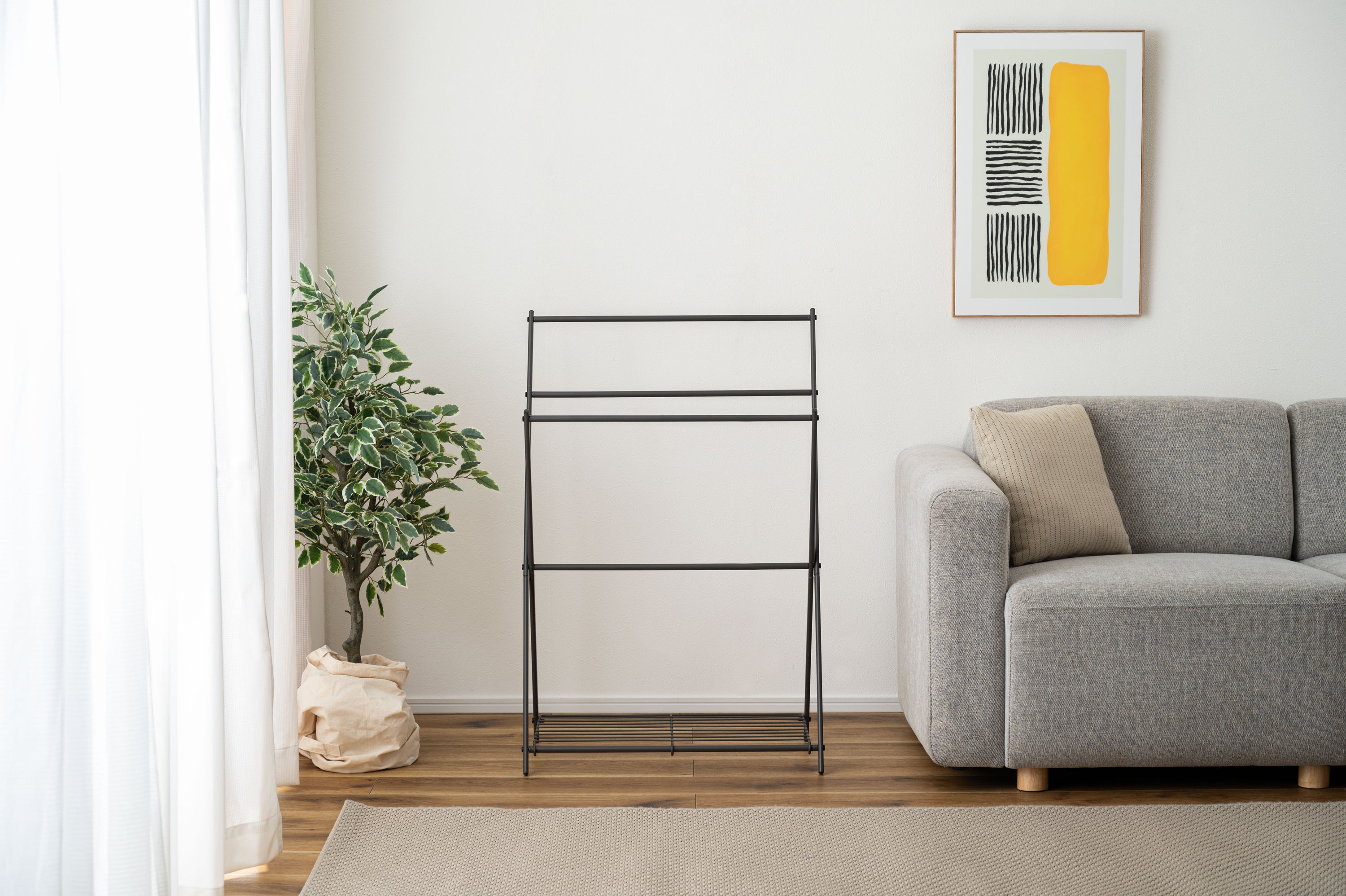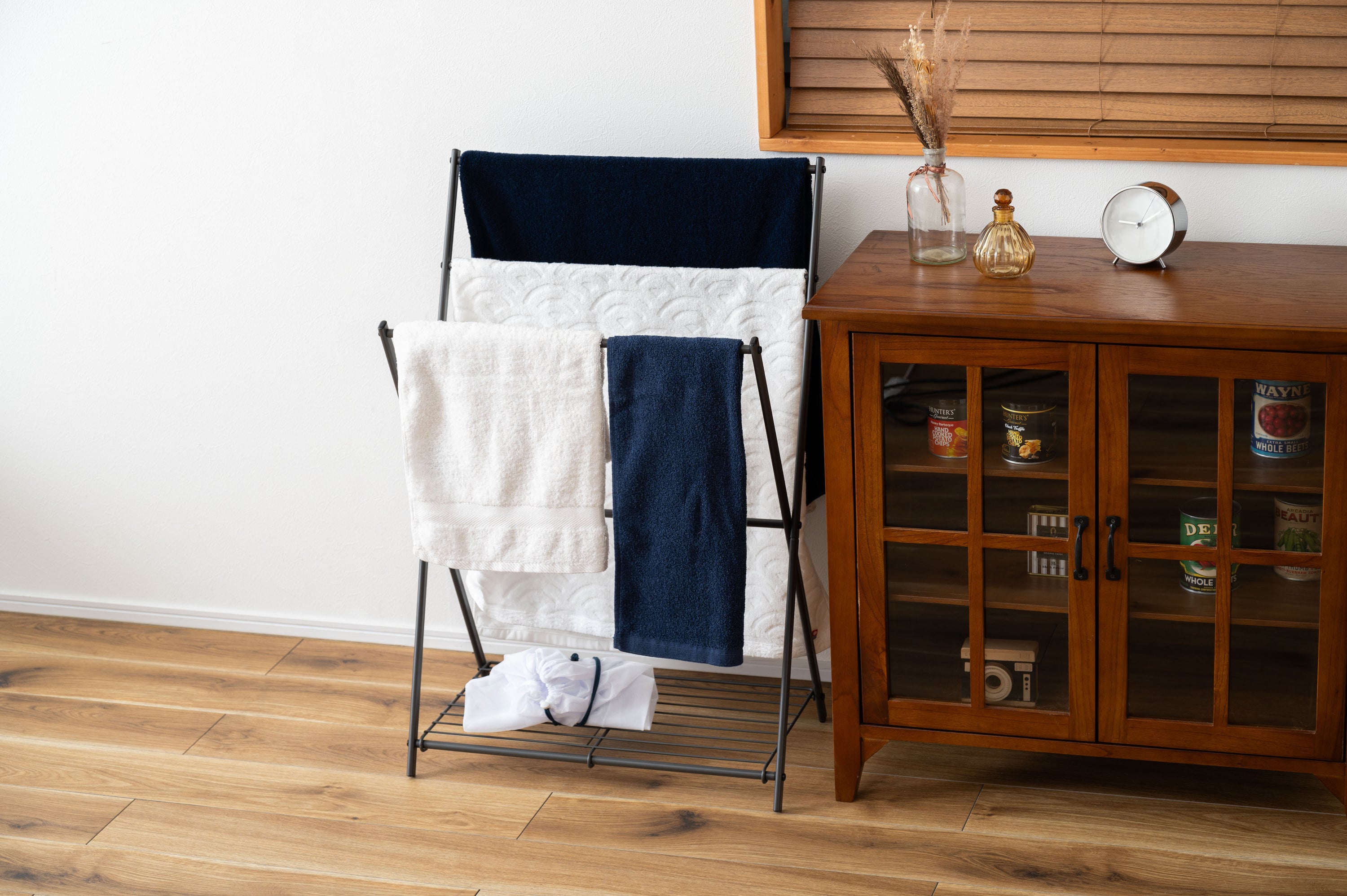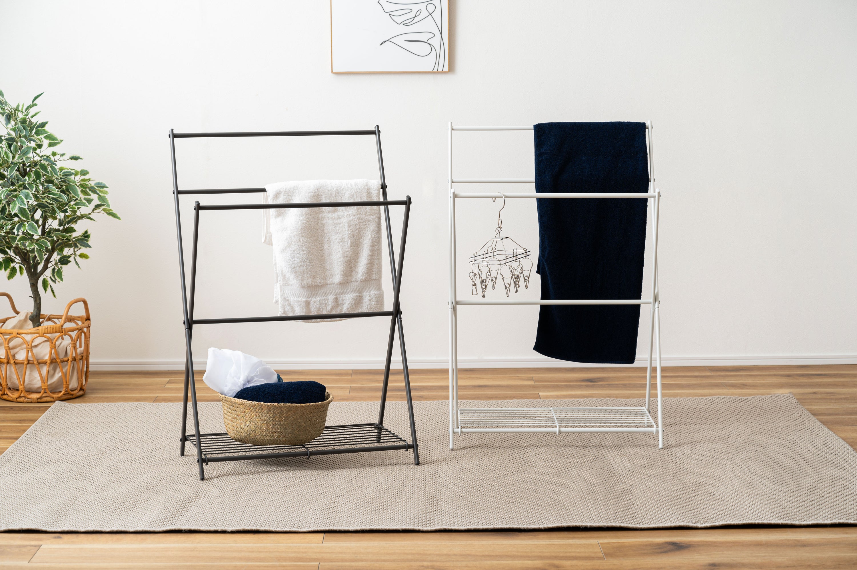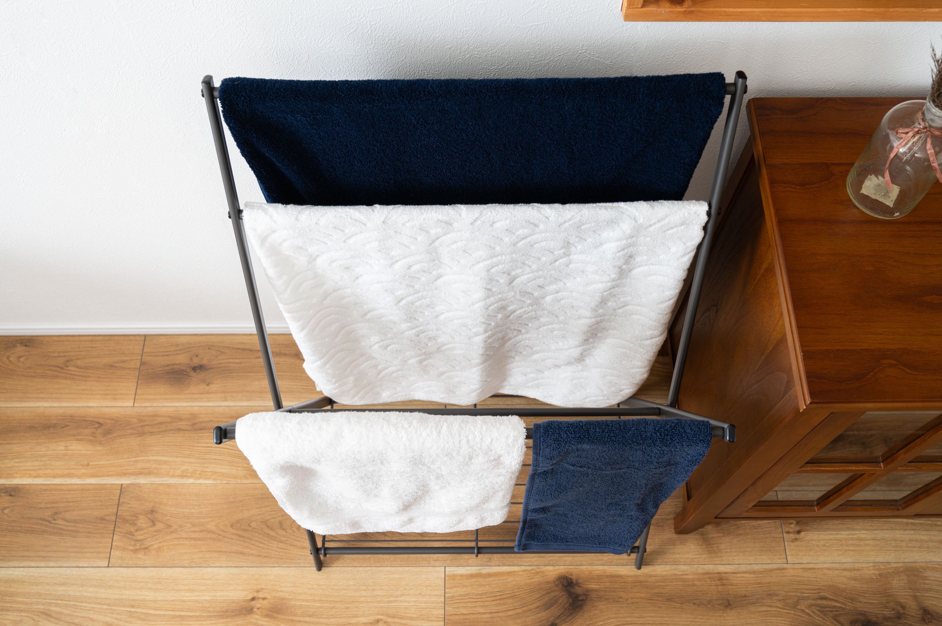 コンパクトサイズで場所を取らず、スッキリ置けるフォールディングタオルハンガー。 折りたたみ可能なので使わない時は省スペースに隙間収納ができます。 段違いに干す事が出来るので、風通しが良いのも嬉しいポイントです。