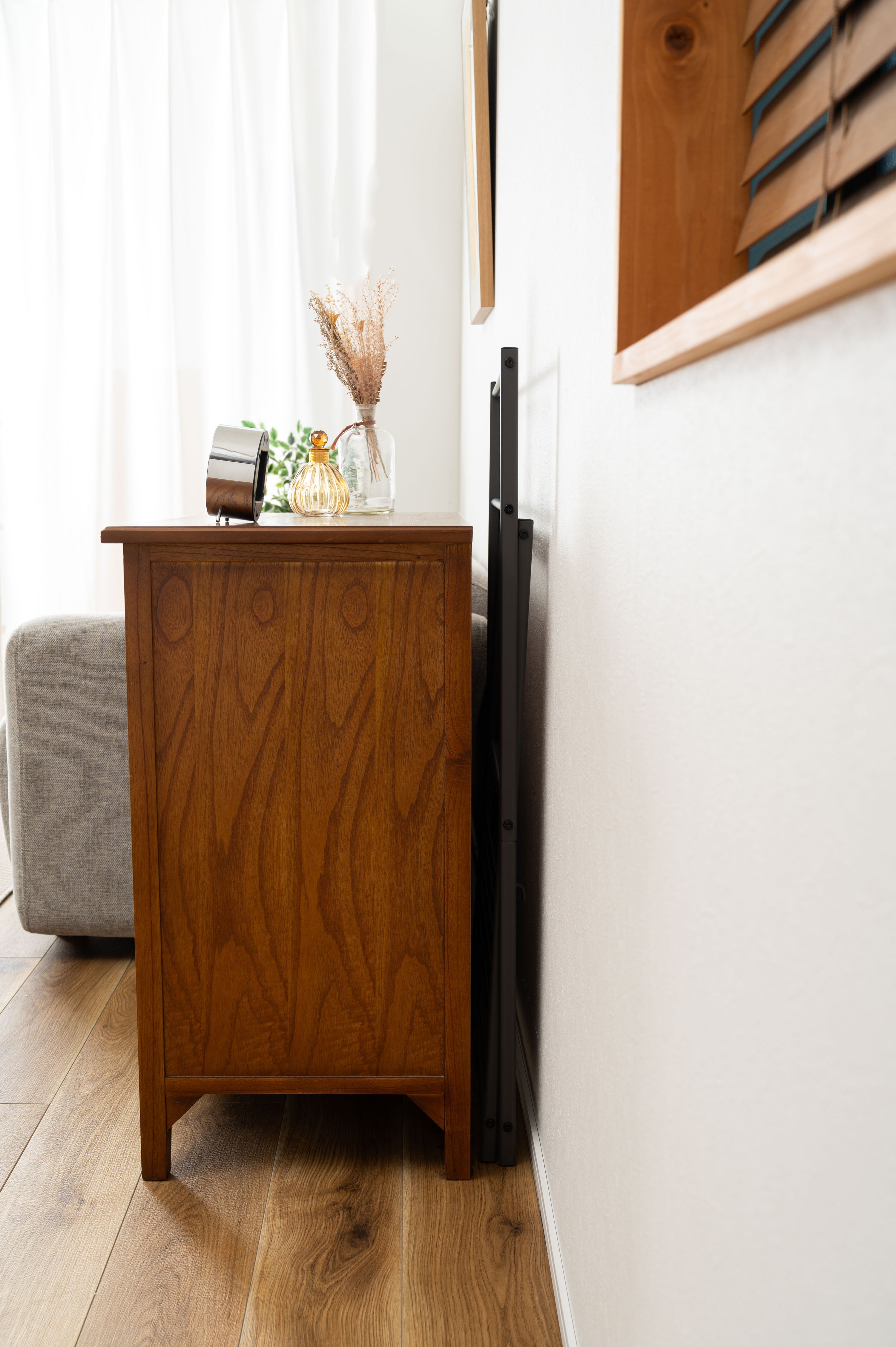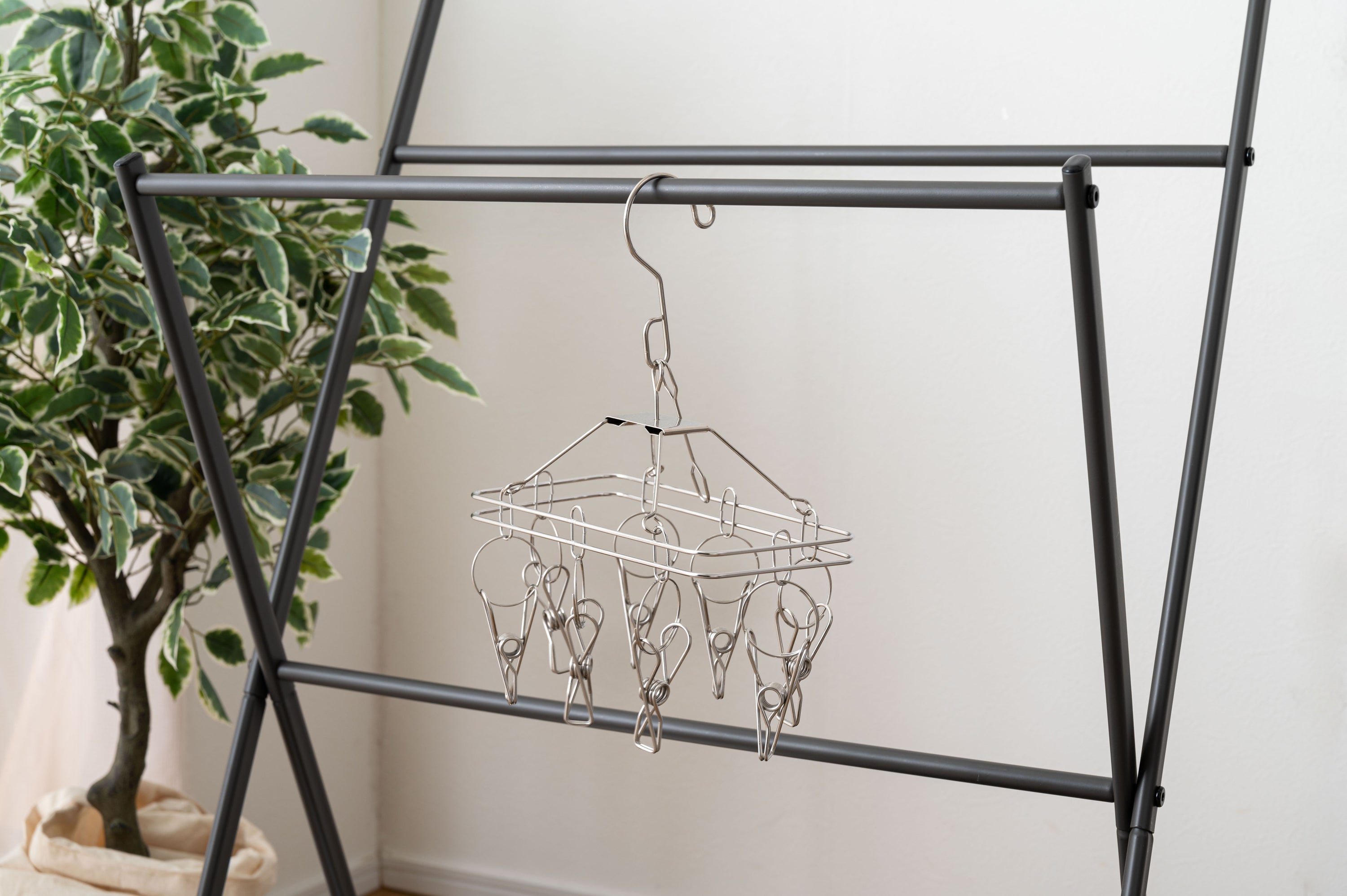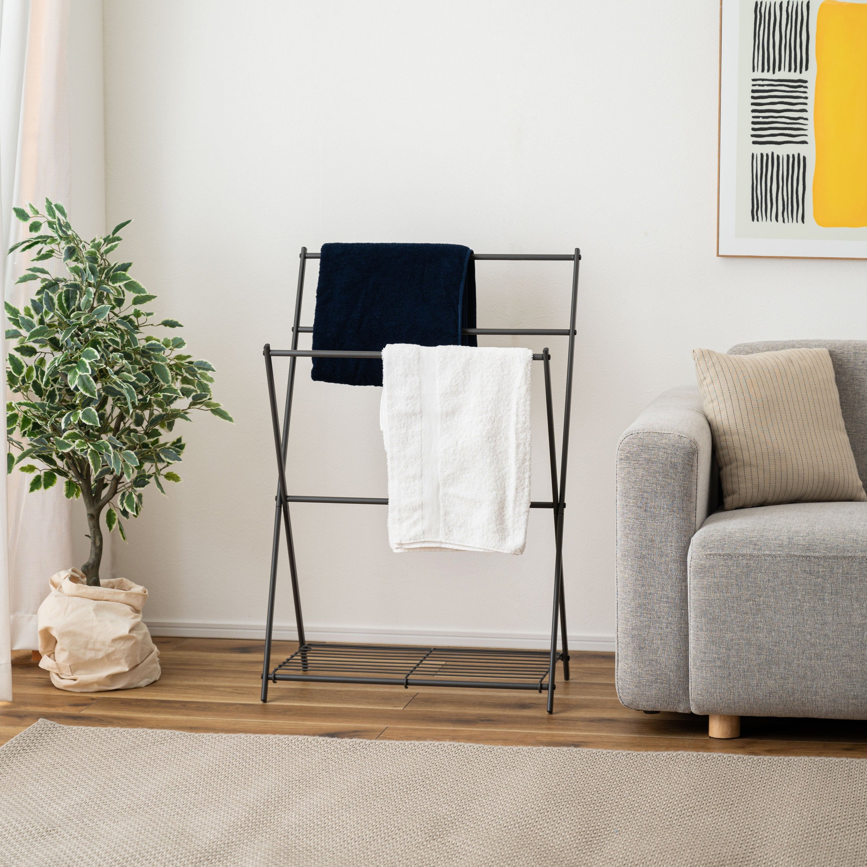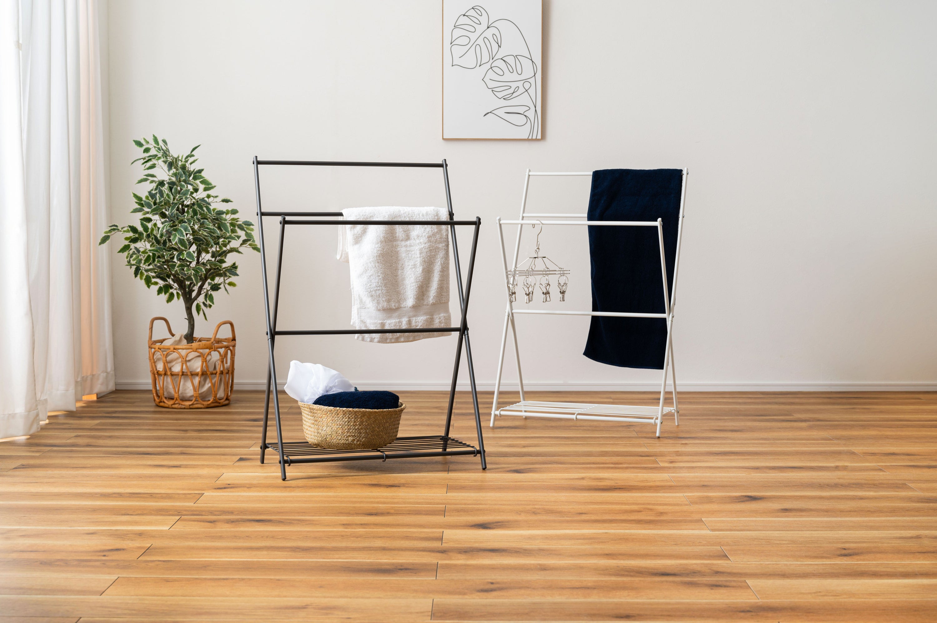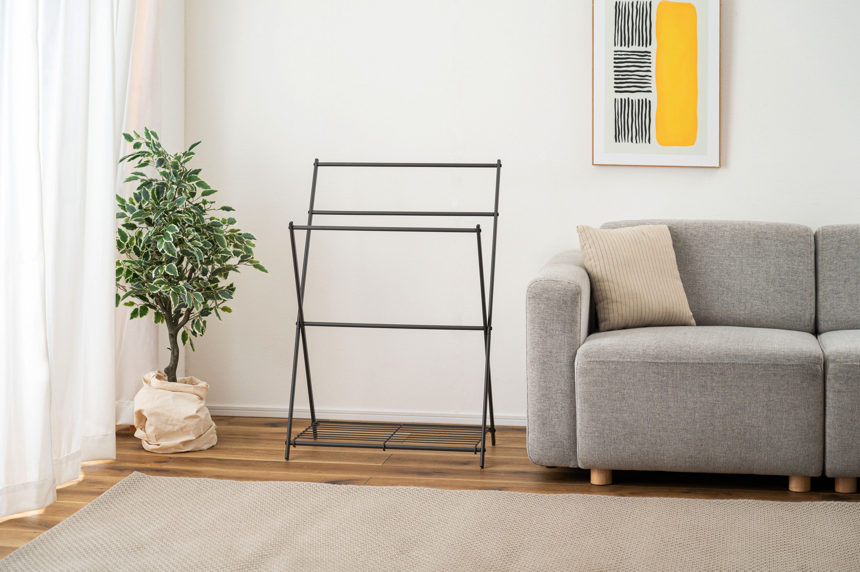 コンパクトサイズで場所を取らず、スッキリ置けるフォールディングタオルハンガー。 折りたたみ可能なので使わない時は省スペースに隙間収納ができます。 段違いに干す事が出来るので、風通しが良いのも嬉しいポイントです。