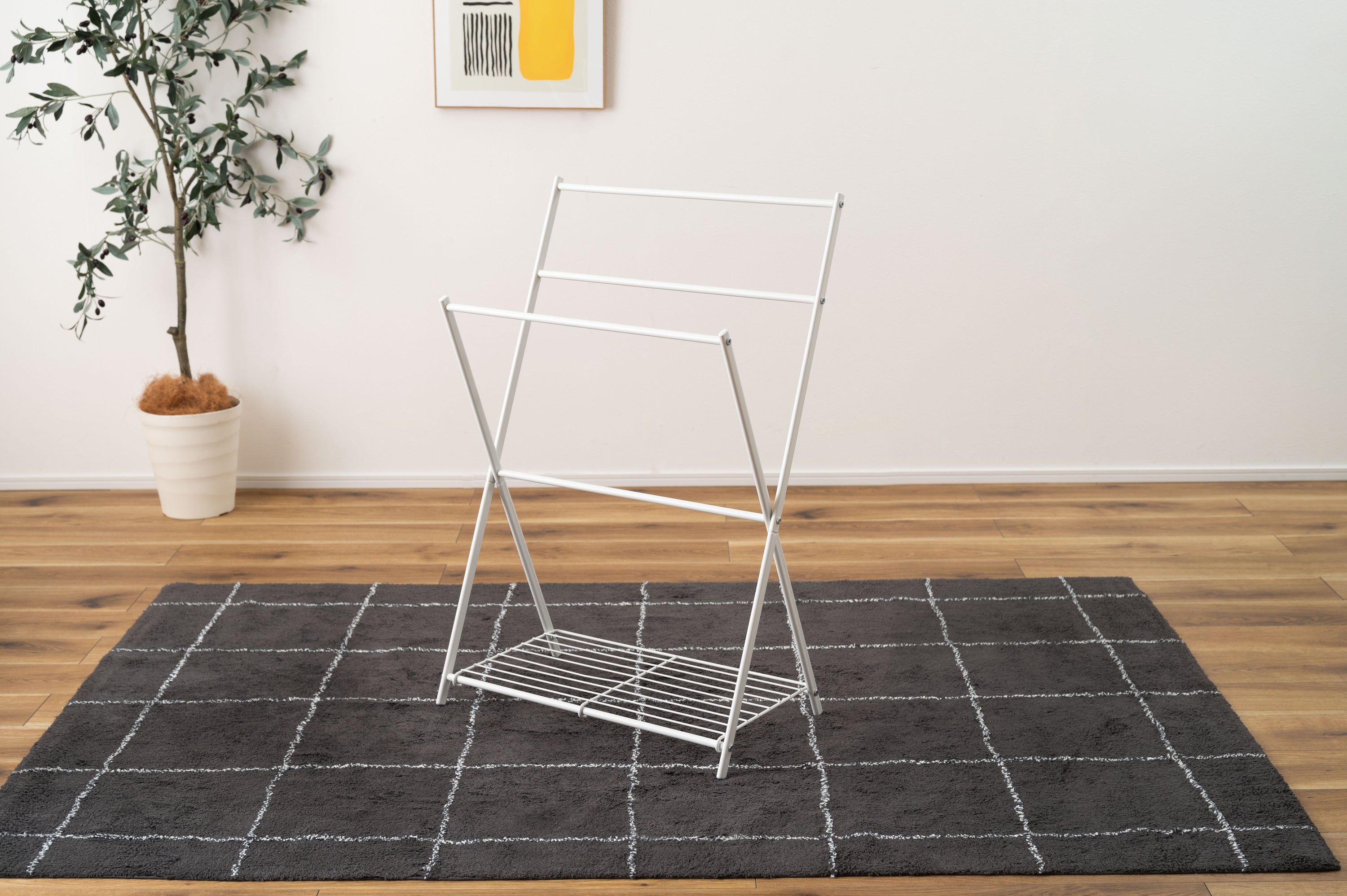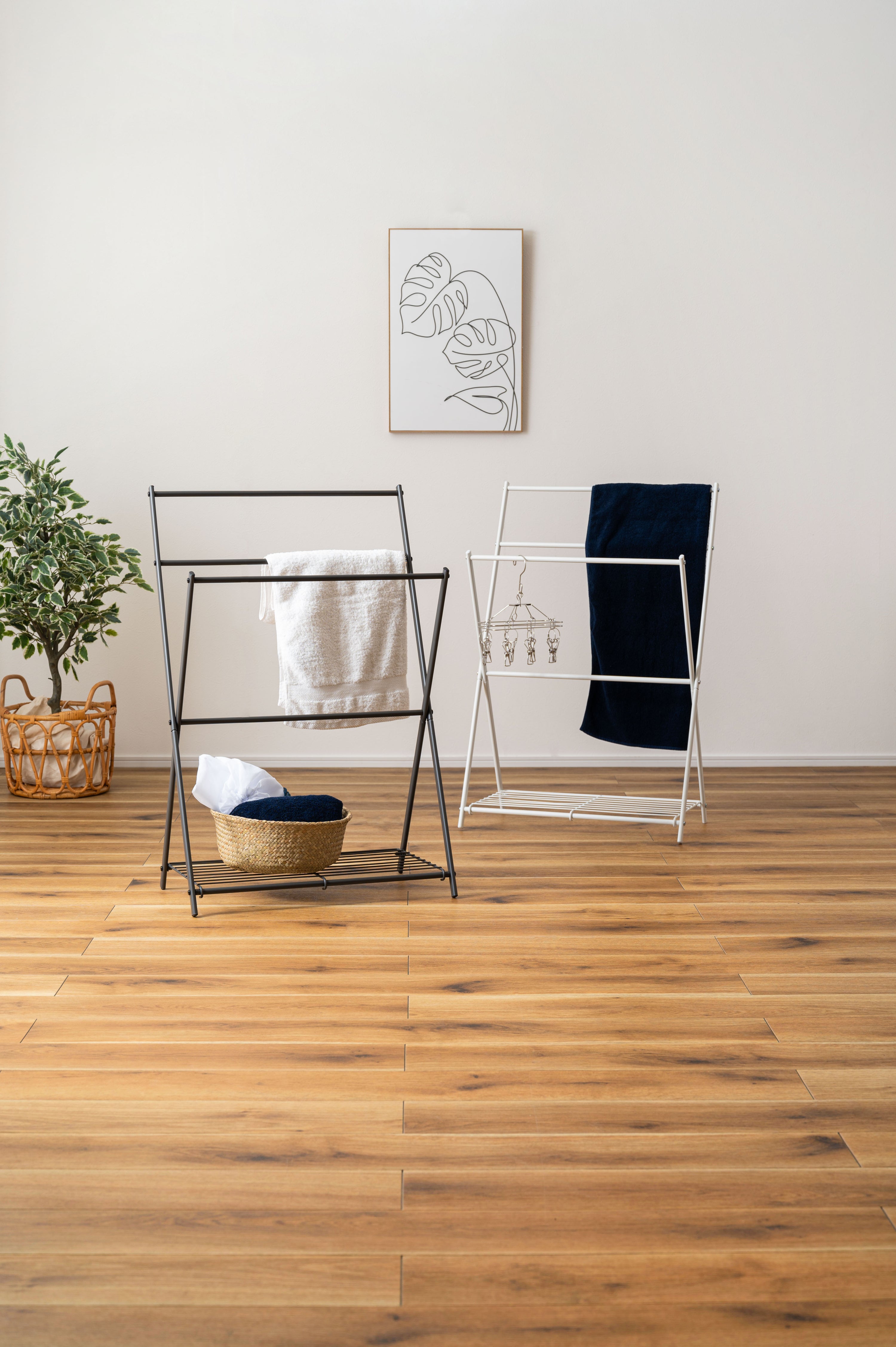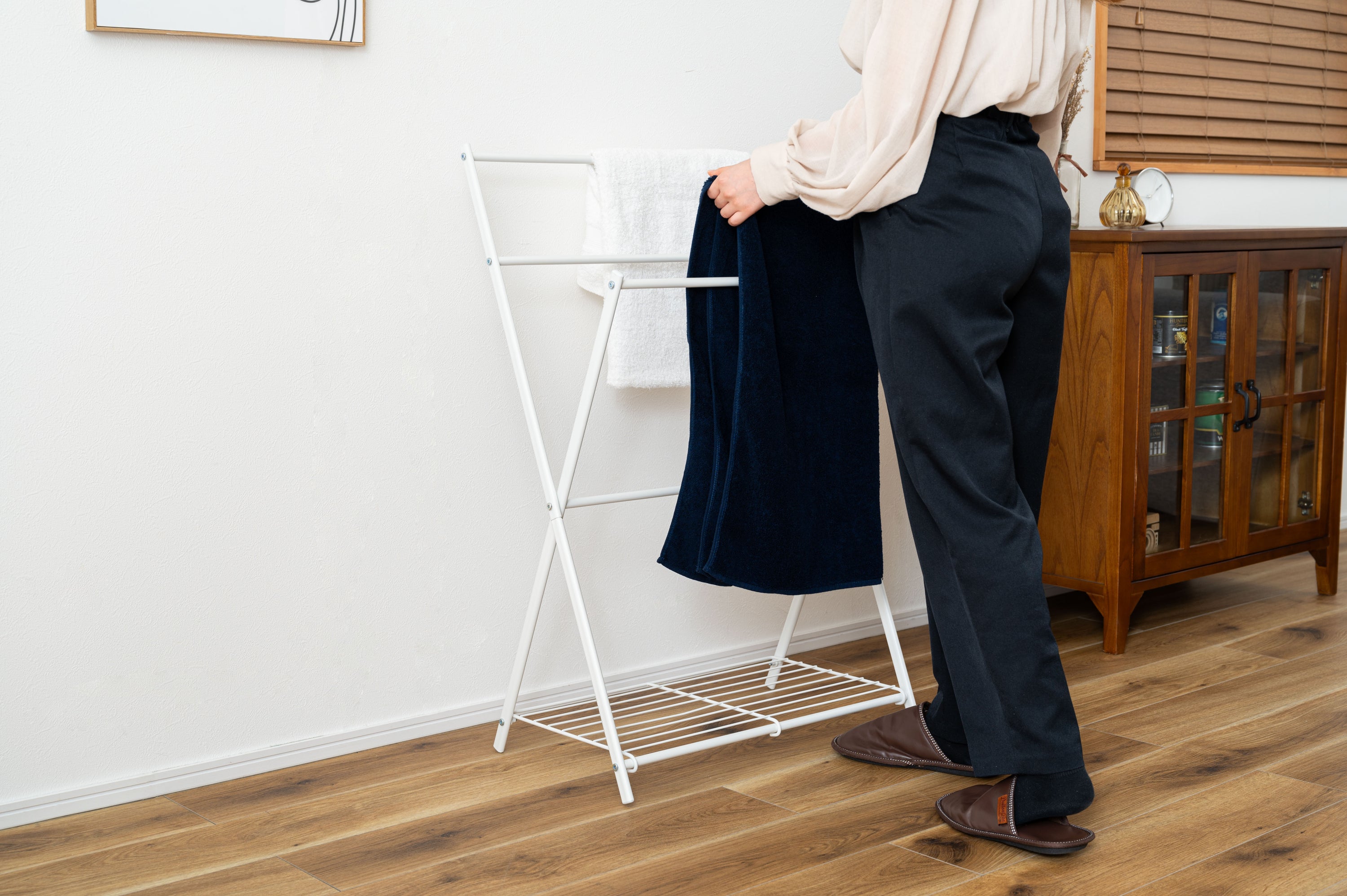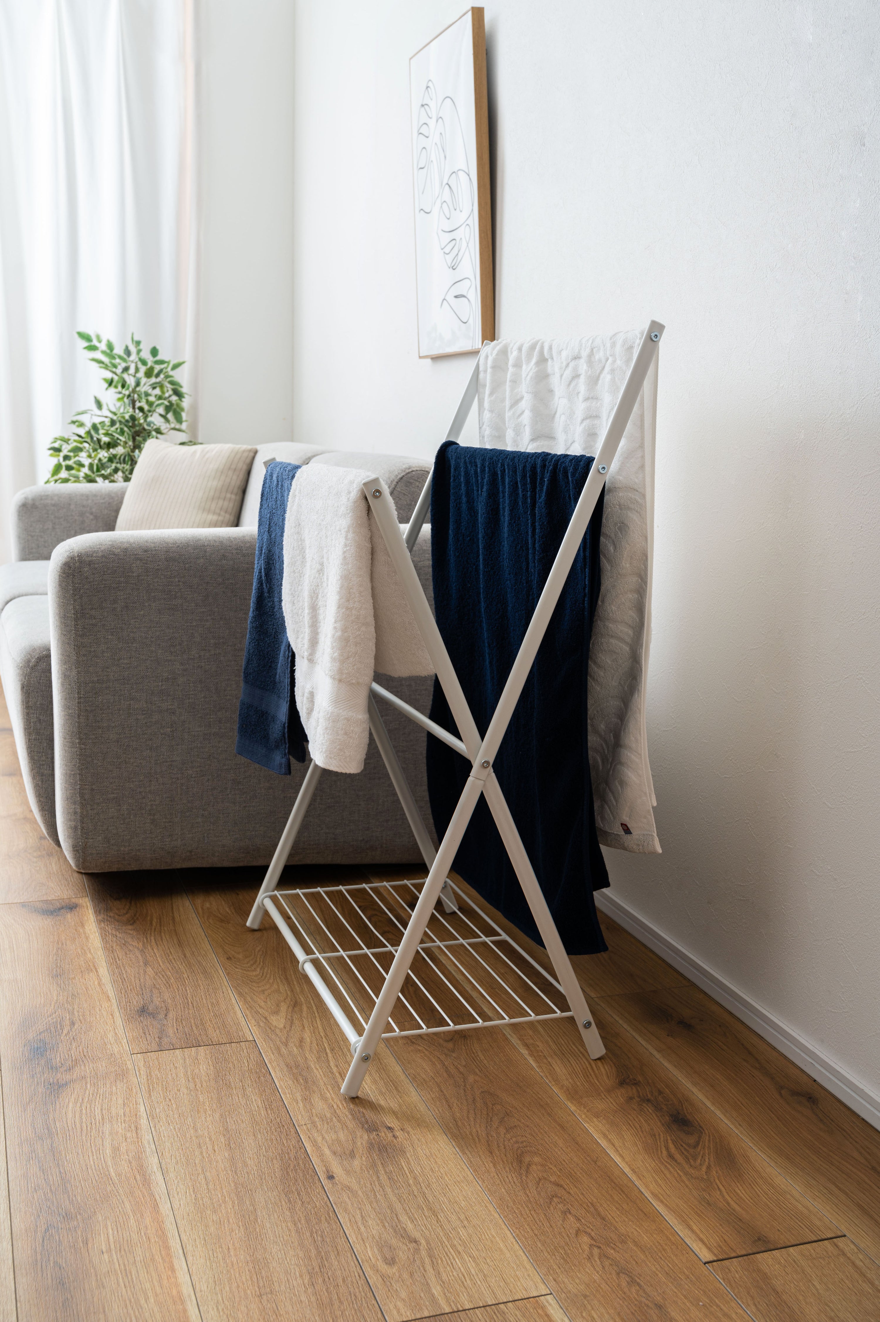 コンパクトサイズで場所を取らず、スッキリ置けるフォールディングタオルハンガー。 折りたたみ可能なので使わない時は省スペースに隙間収納ができます。 段違いに干す事が出来るので、風通しが良いのも嬉しいポイントです。