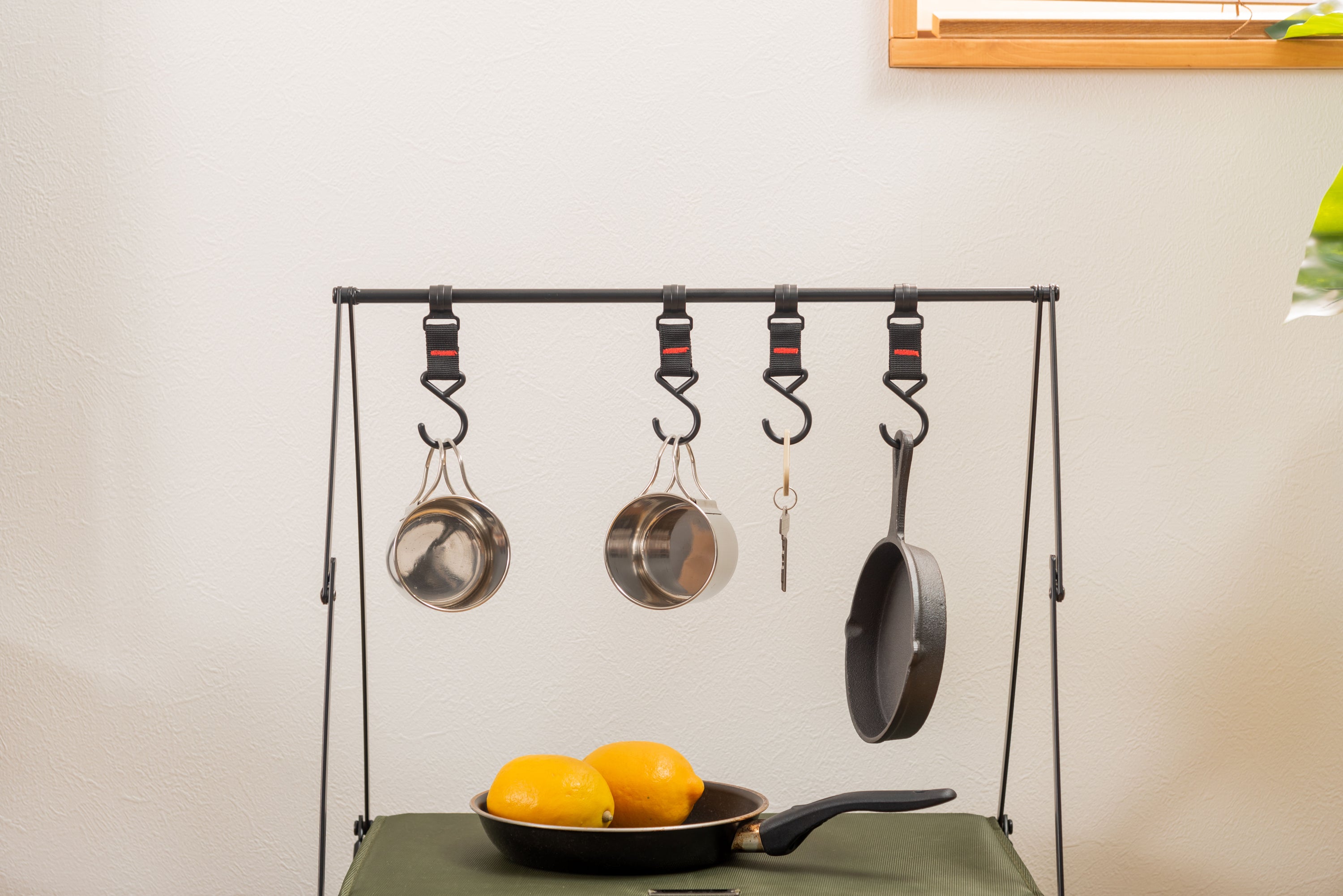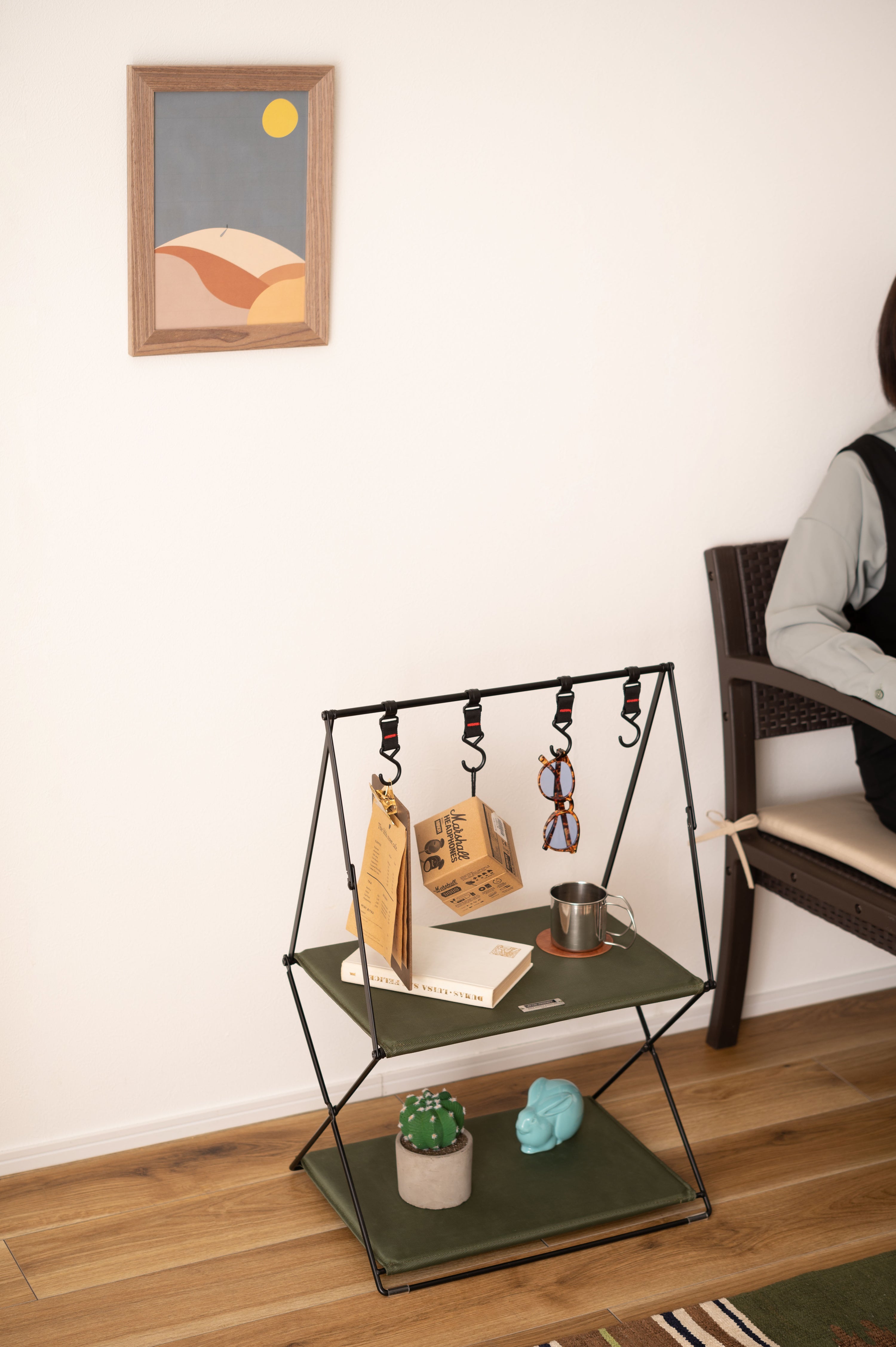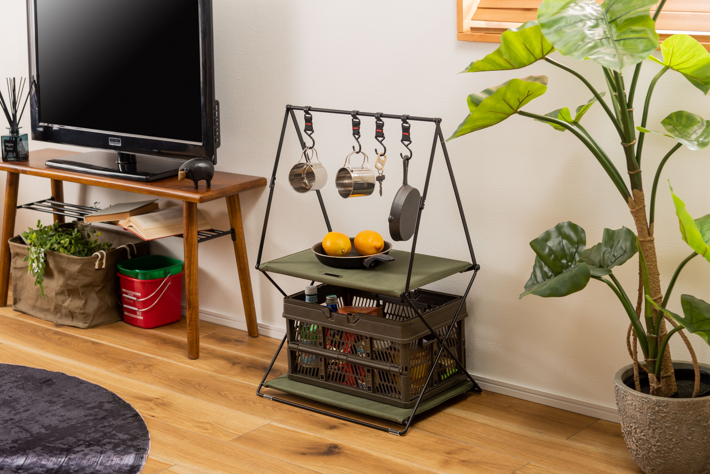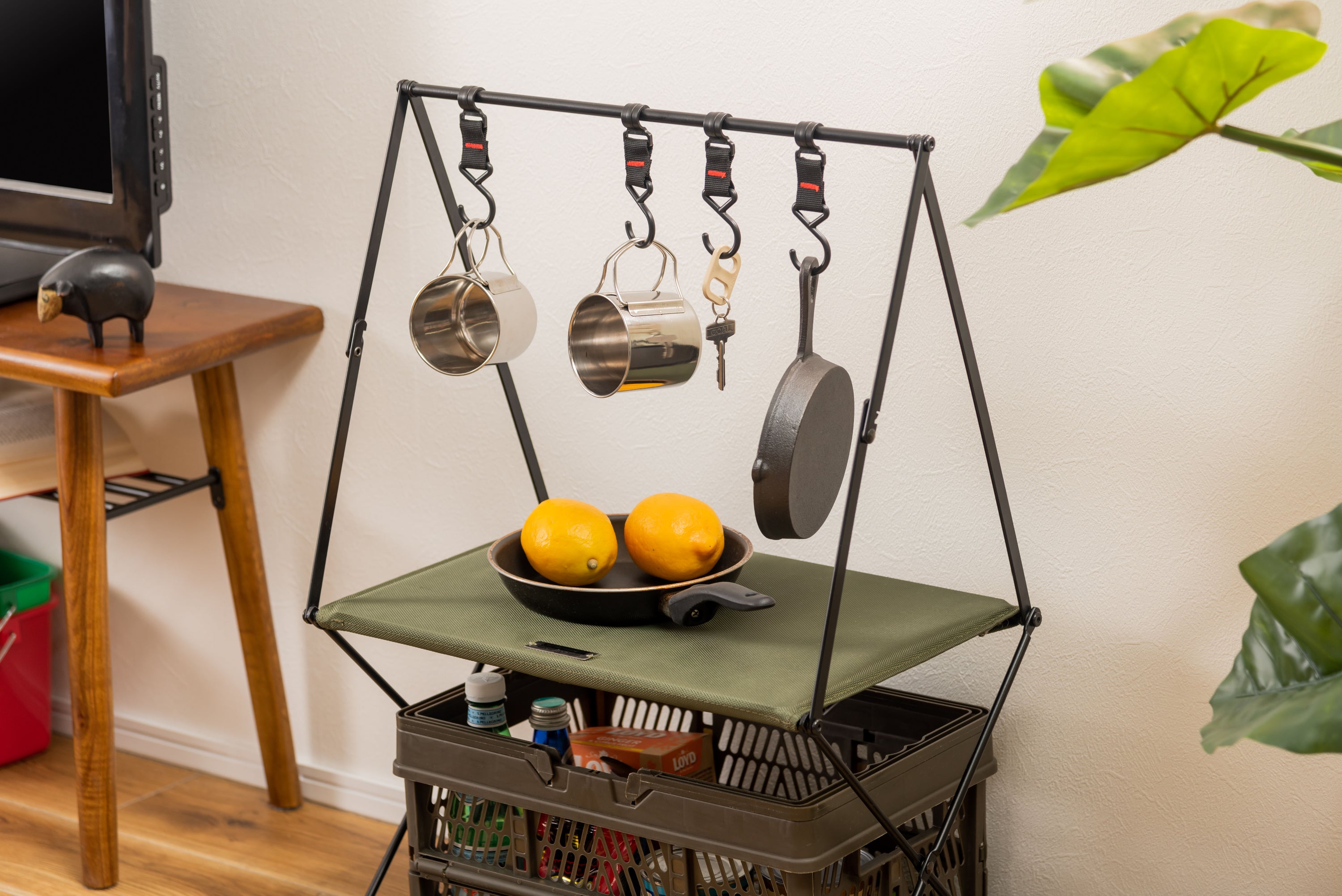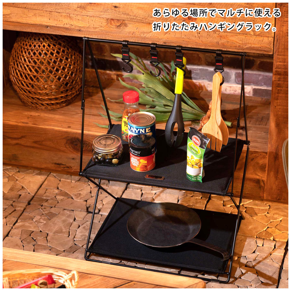 あらゆる場所でマルチに使える折りたたみハンギングラックです。場所を選ばず、散らかりがちな小物類を手軽にまとめて収納できます。4つのフックが付いているので、様々な物を手軽に掛けることができます。アウトドア・キャンプル・レジャーはもちろん、屋内の使用でも大活躍します。コンパクトに折りたたむことができるので移動や収納も邪魔になりません。
