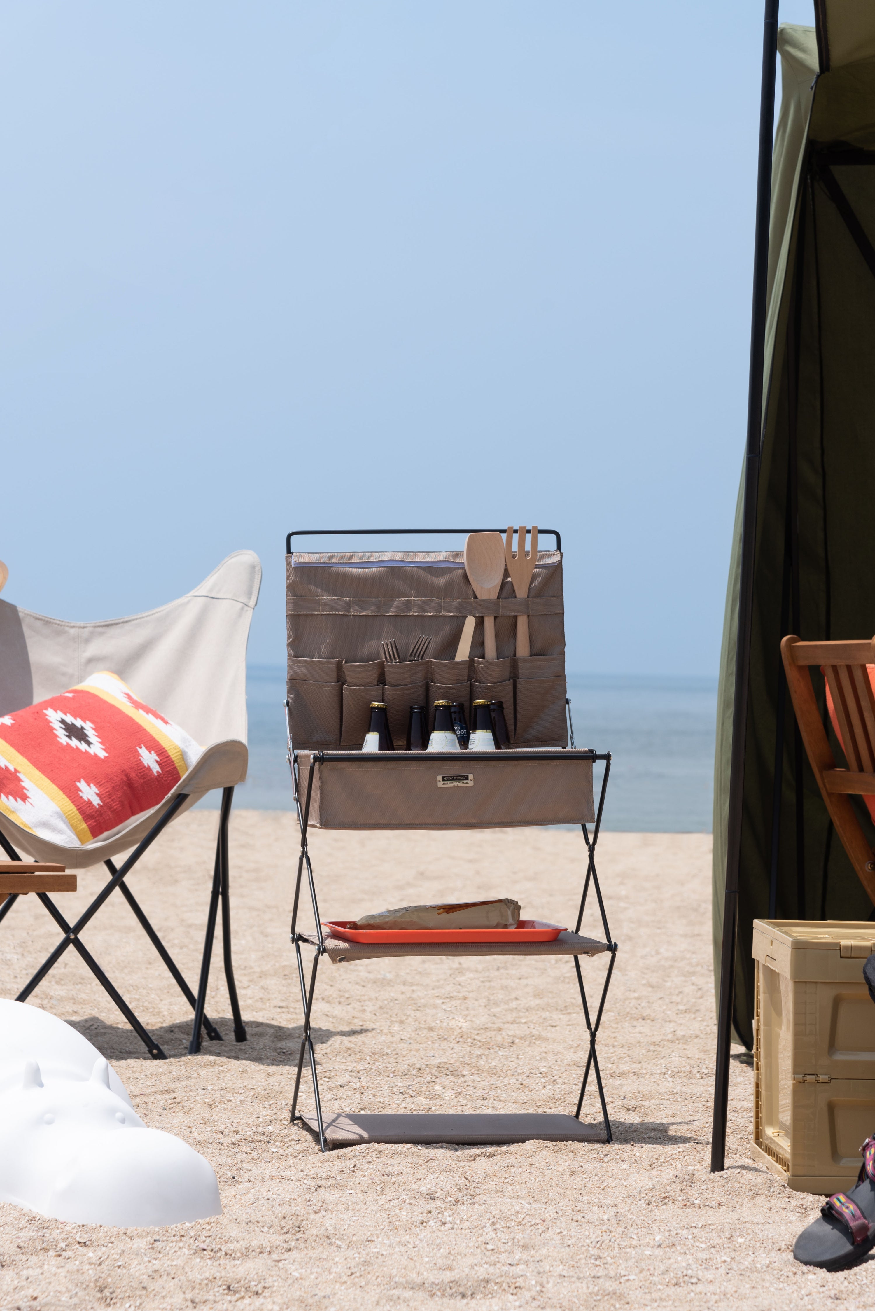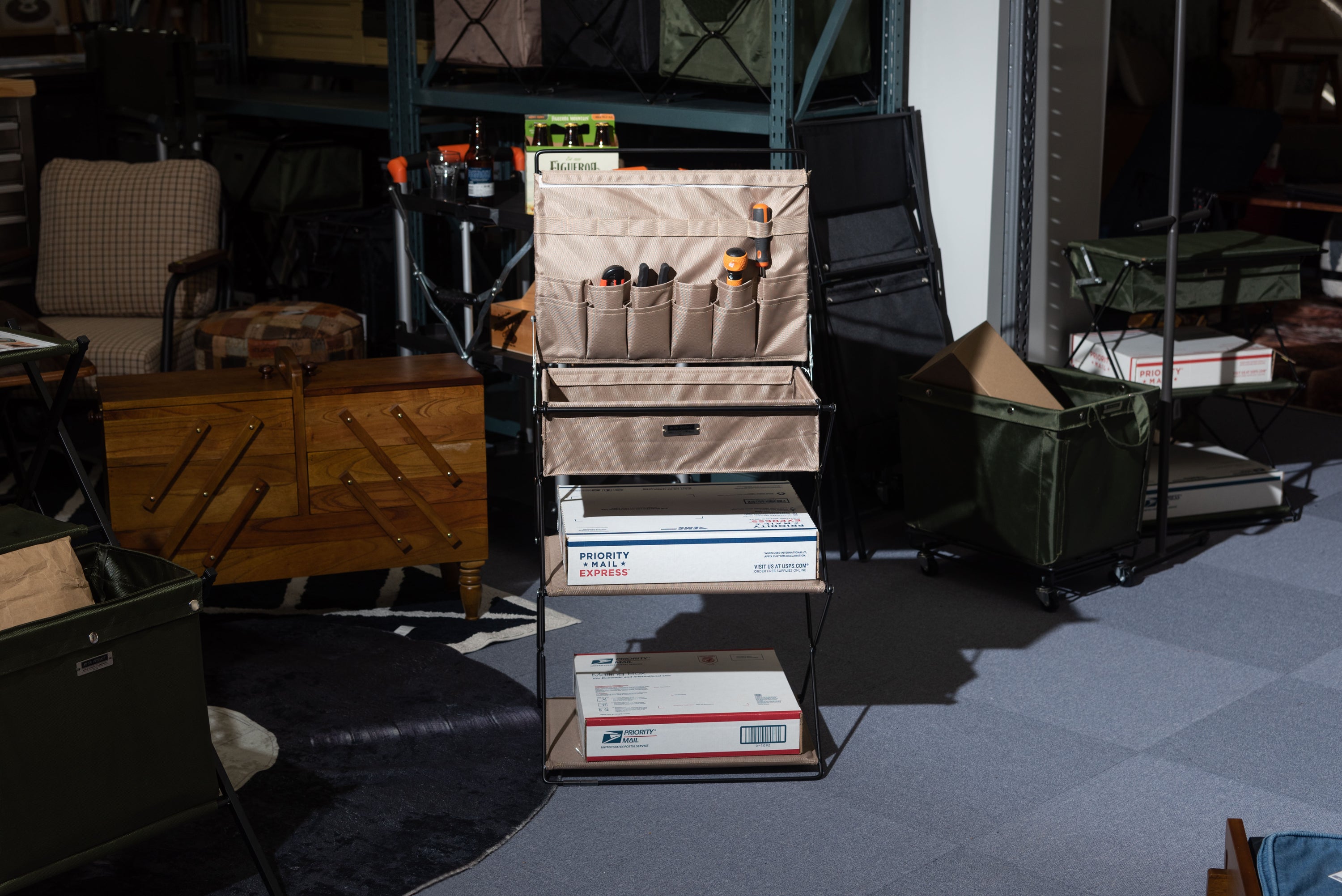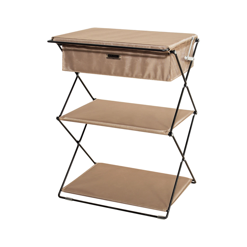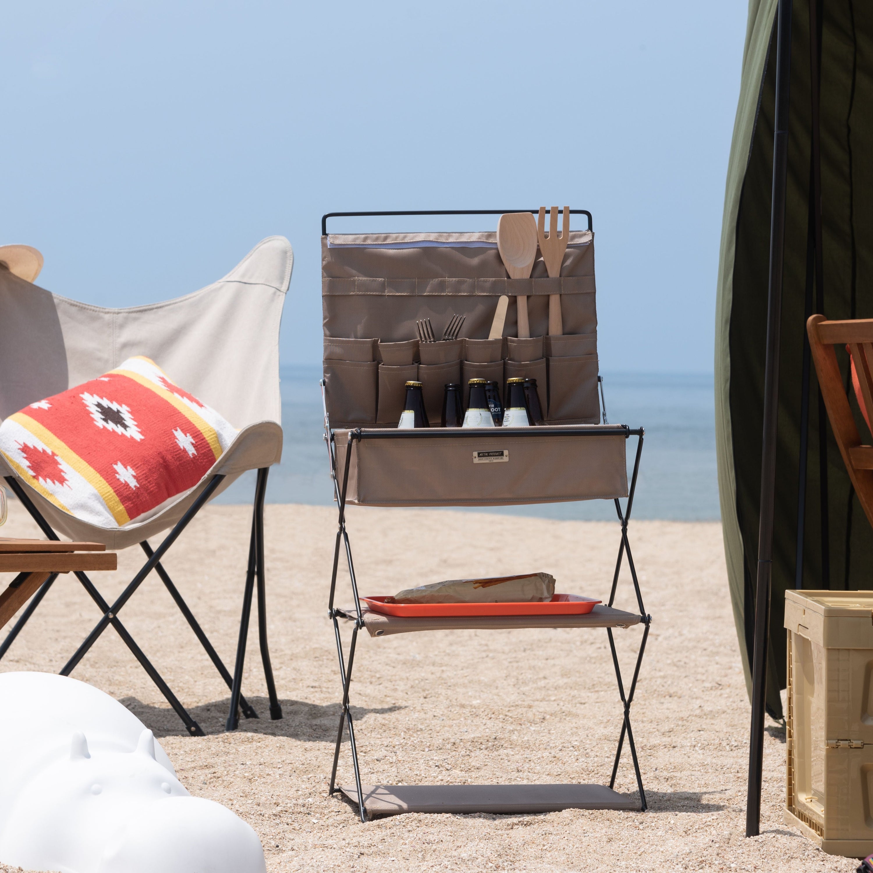 アウトドア・キャンプからソファやデスク横での使用まで、多彩に使える機能豊富なフォールディングラックです。収納ボックスや棚にはMDF板を使用しており、サイドテーブルとしても活躍します。収納ボックスは取り外して持ち運びができるトレータイプです。折りたたみ式なので持ち運びはコンパクトサイズになり便利です。