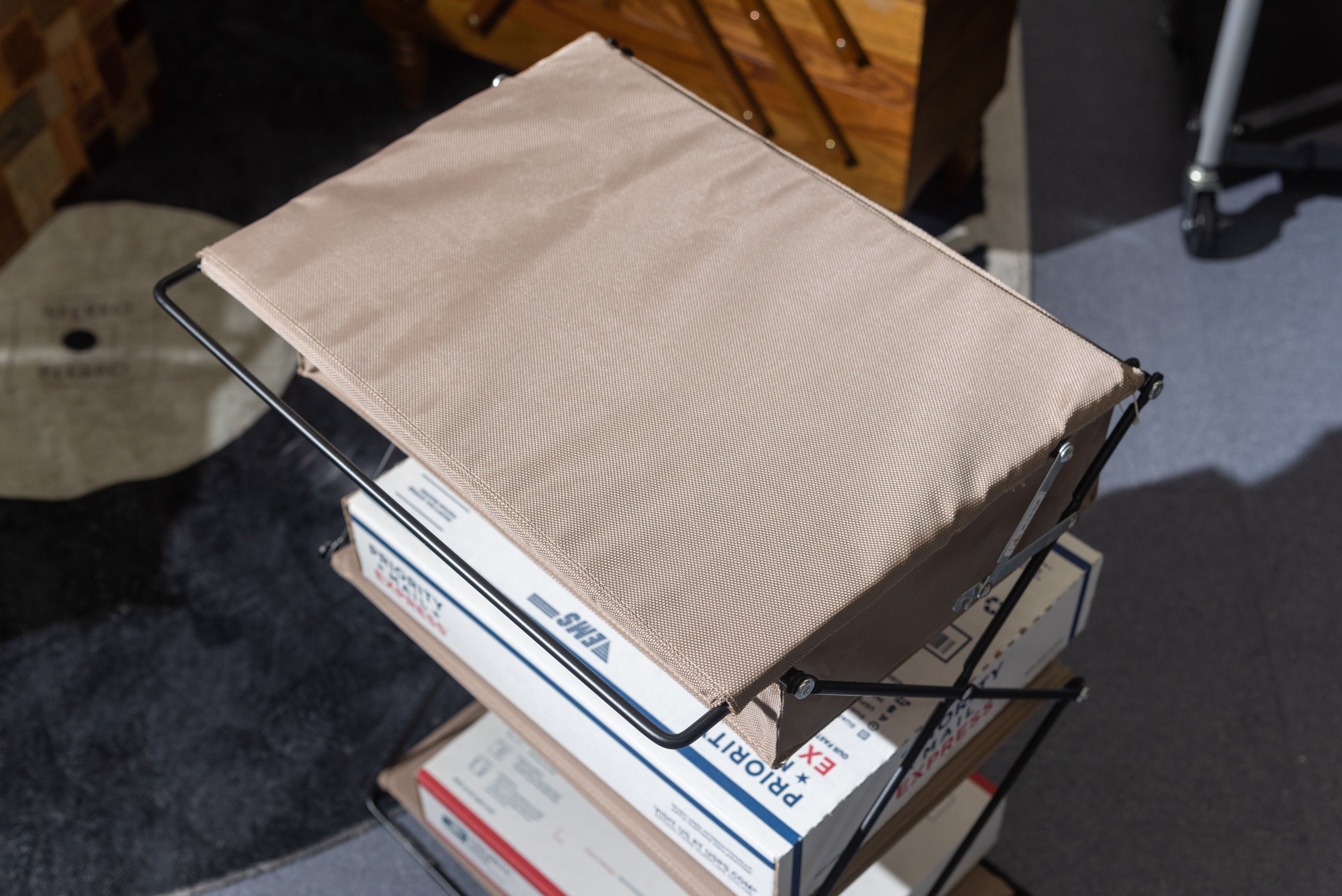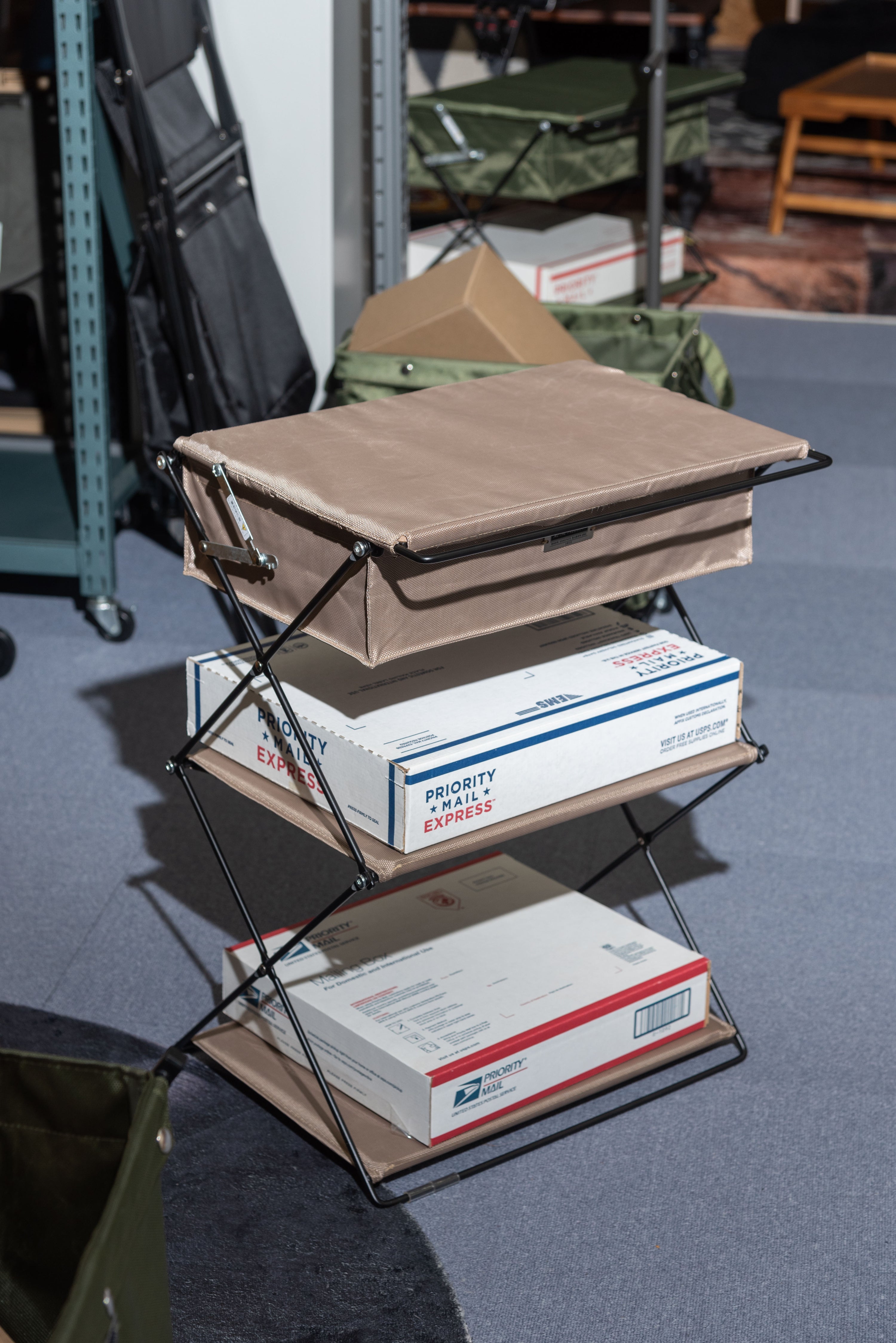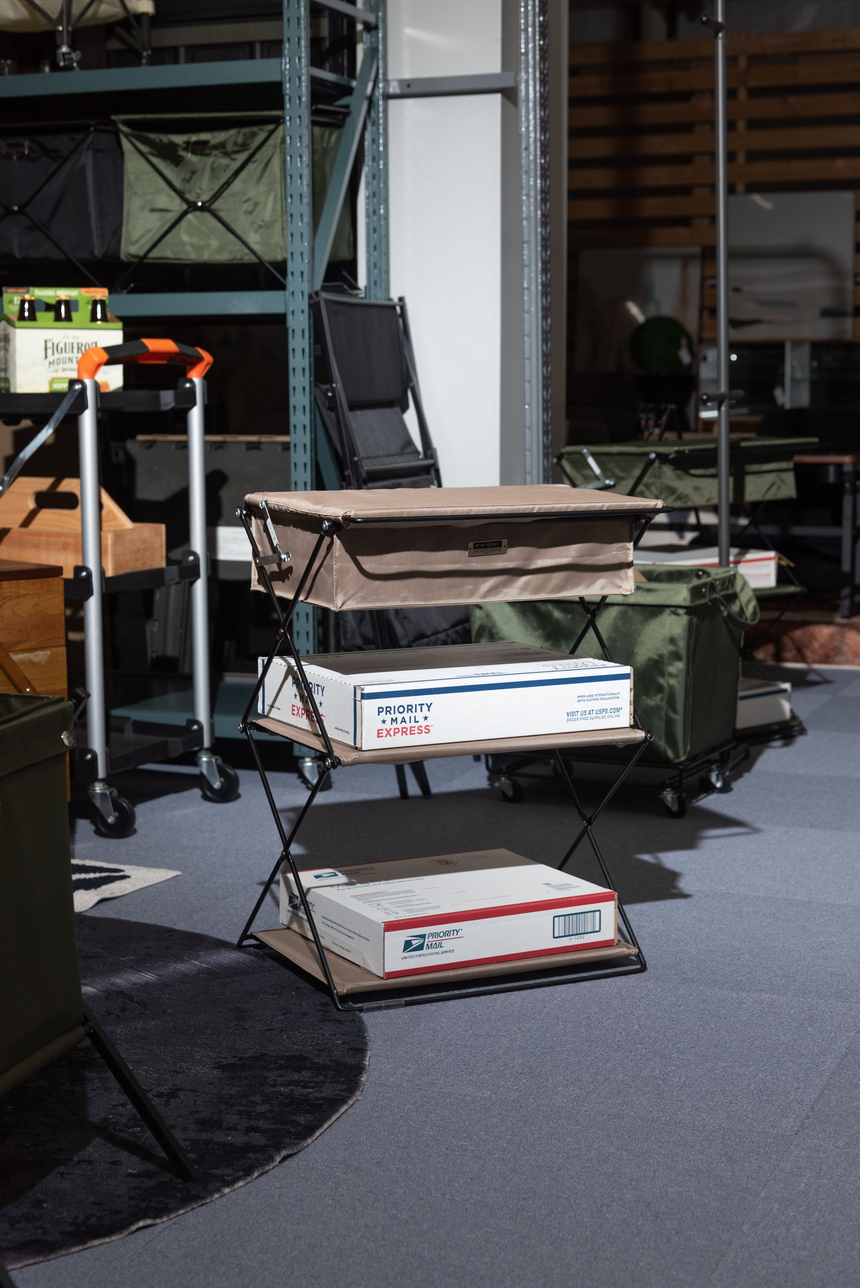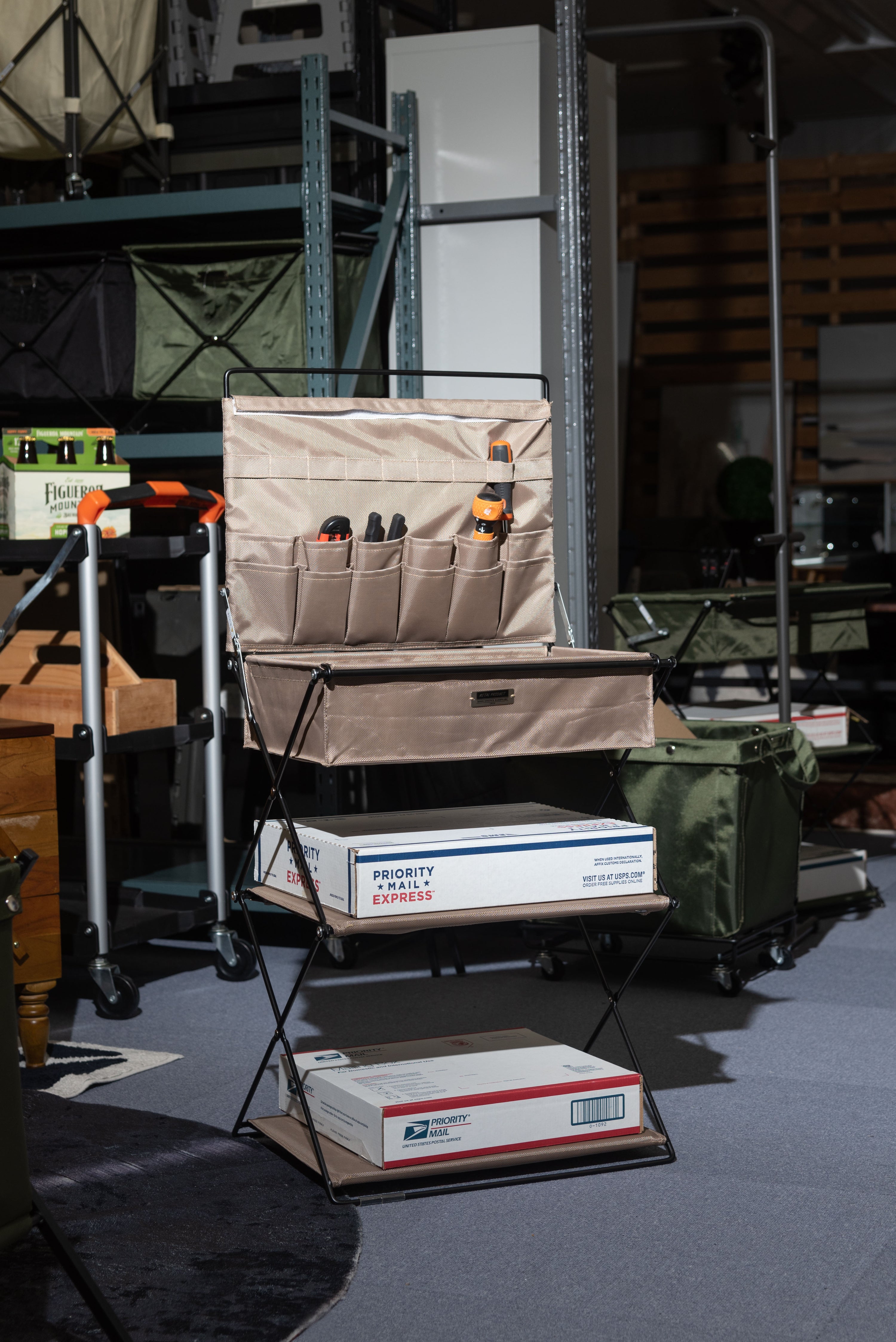 アウトドア・キャンプからソファやデスク横での使用まで、多彩に使える機能豊富なフォールディングラックです。収納ボックスや棚にはMDF板を使用しており、サイドテーブルとしても活躍します。収納ボックスは取り外して持ち運びができるトレータイプです。折りたたみ式なので持ち運びはコンパクトサイズになり便利です。
