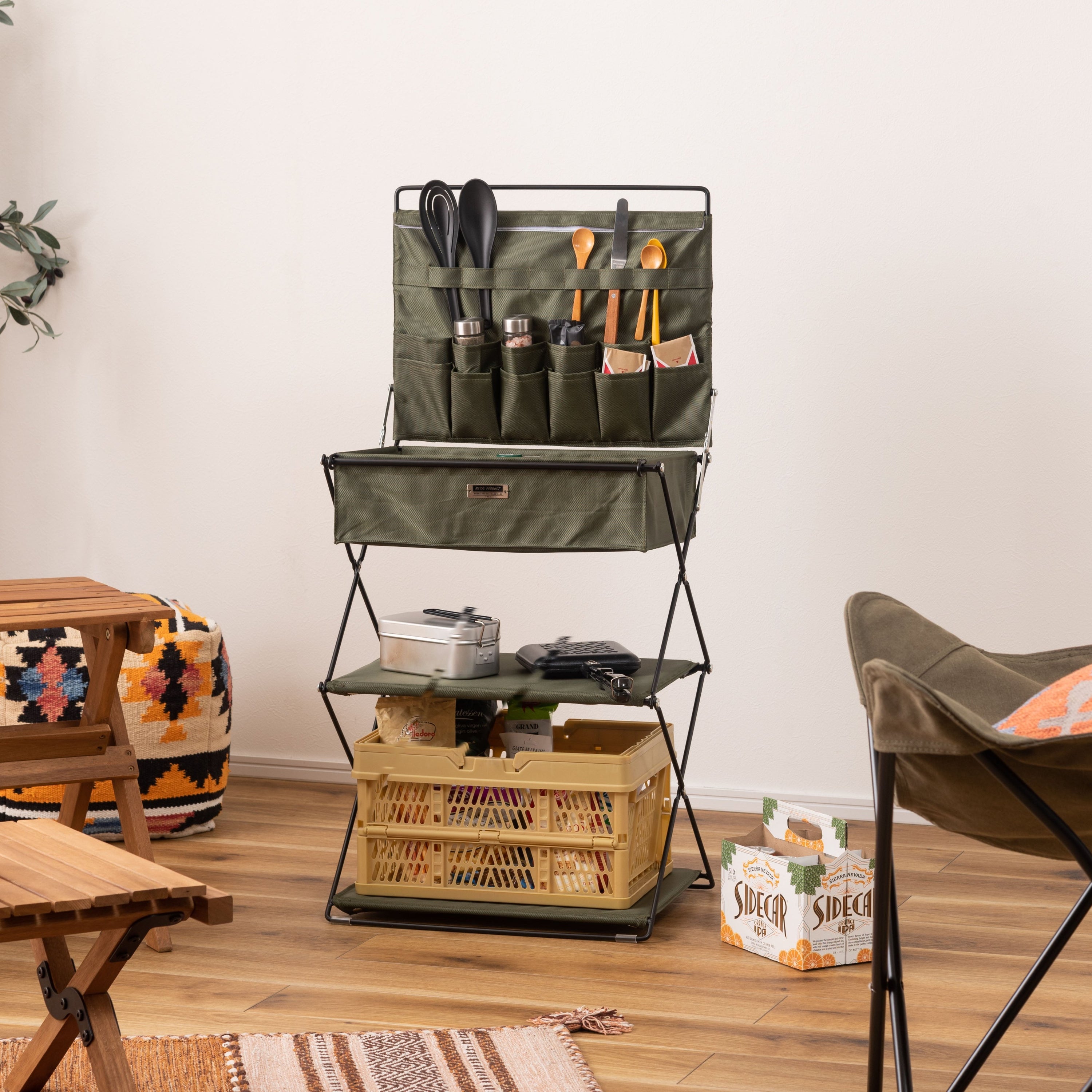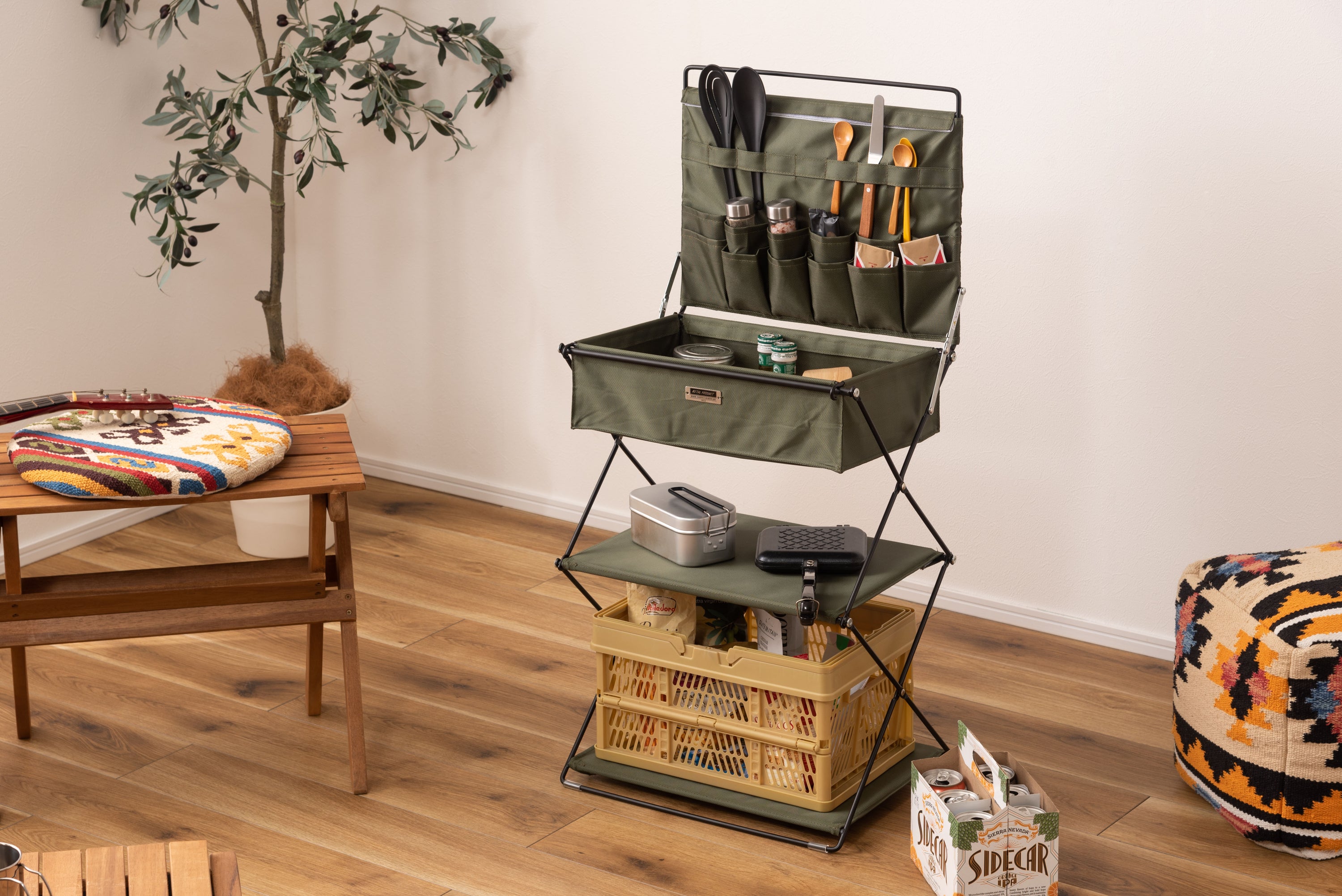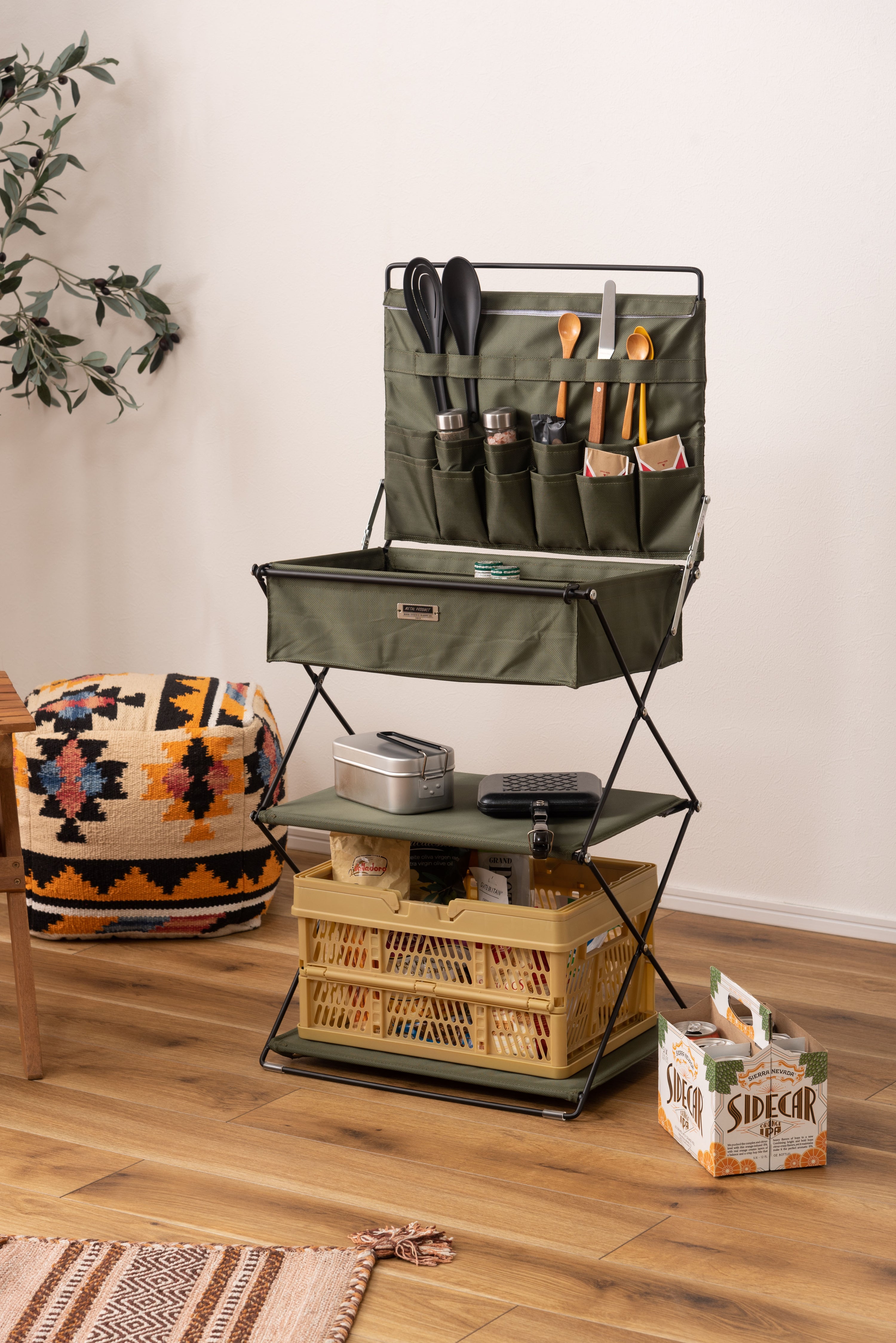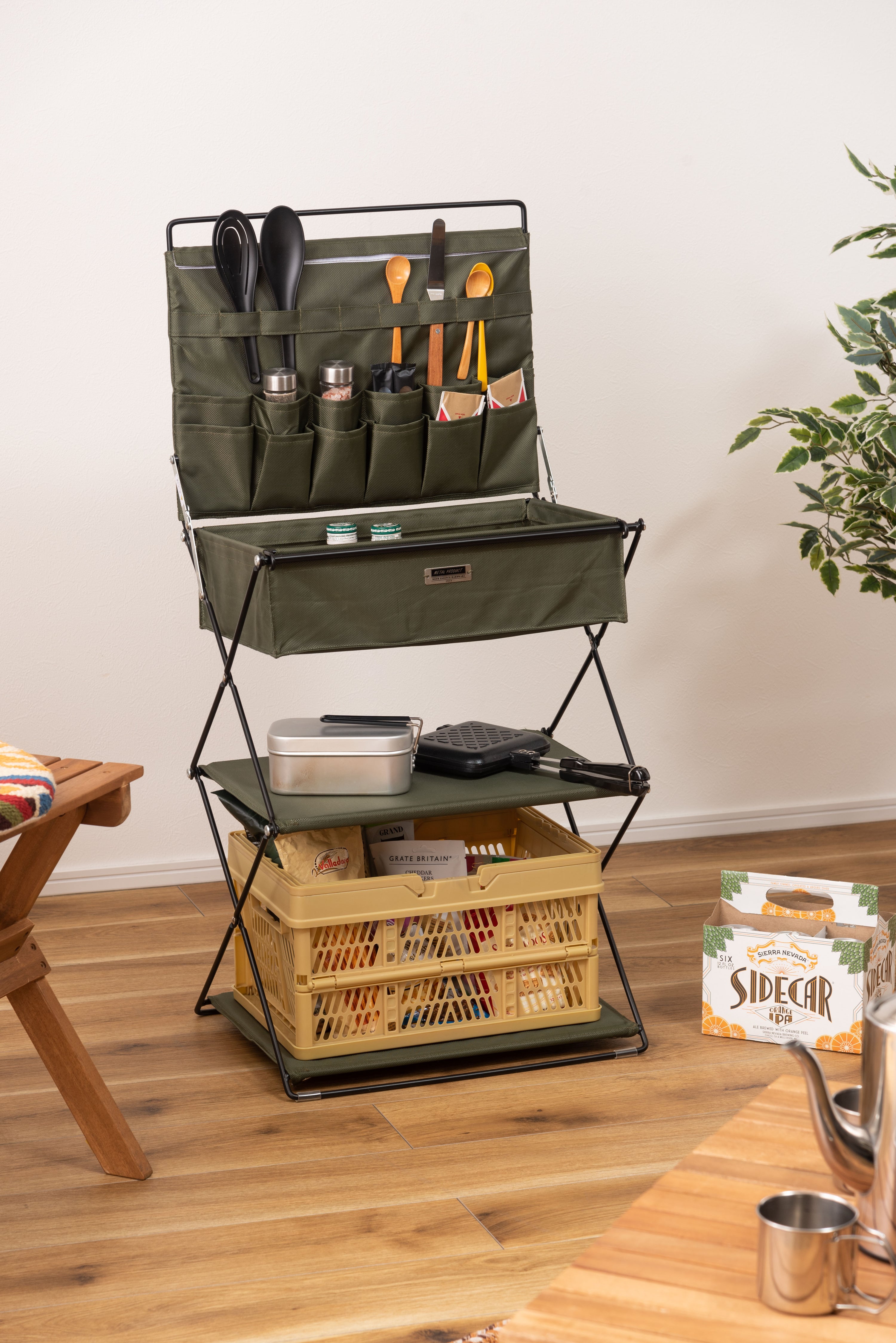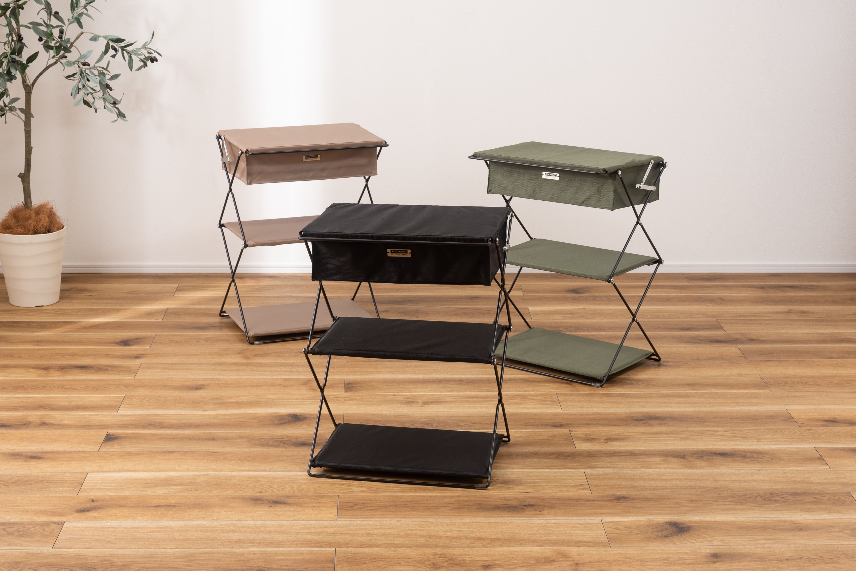 アウトドア・キャンプからソファやデスク横での使用まで、多彩に使える機能豊富なフォールディングラックです。収納ボックスや棚にはMDF板を使用しており、サイドテーブルとしても活躍します。収納ボックスは取り外して持ち運びができるトレータイプです。折りたたみ式なので持ち運びはコンパクトサイズになり便利です。