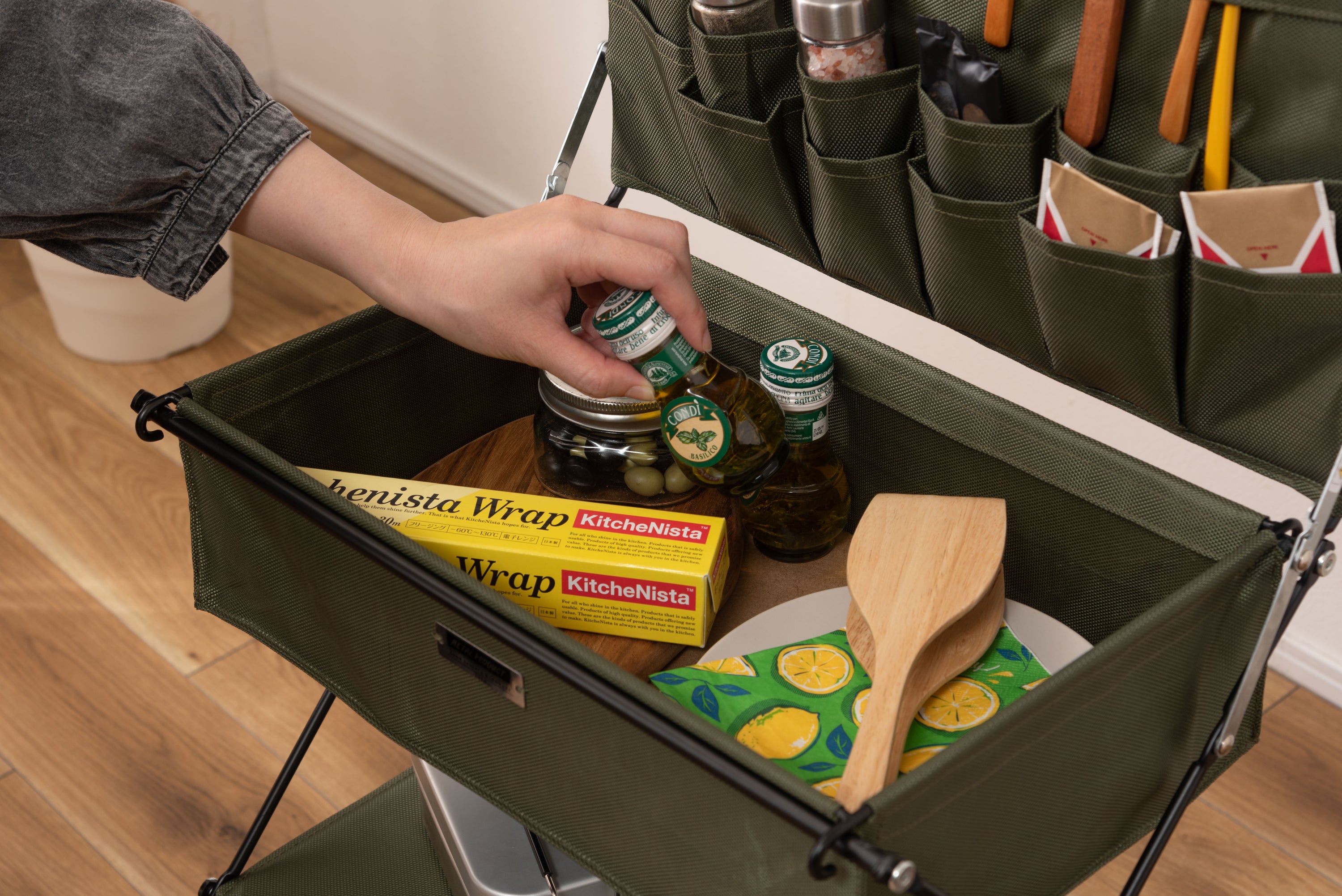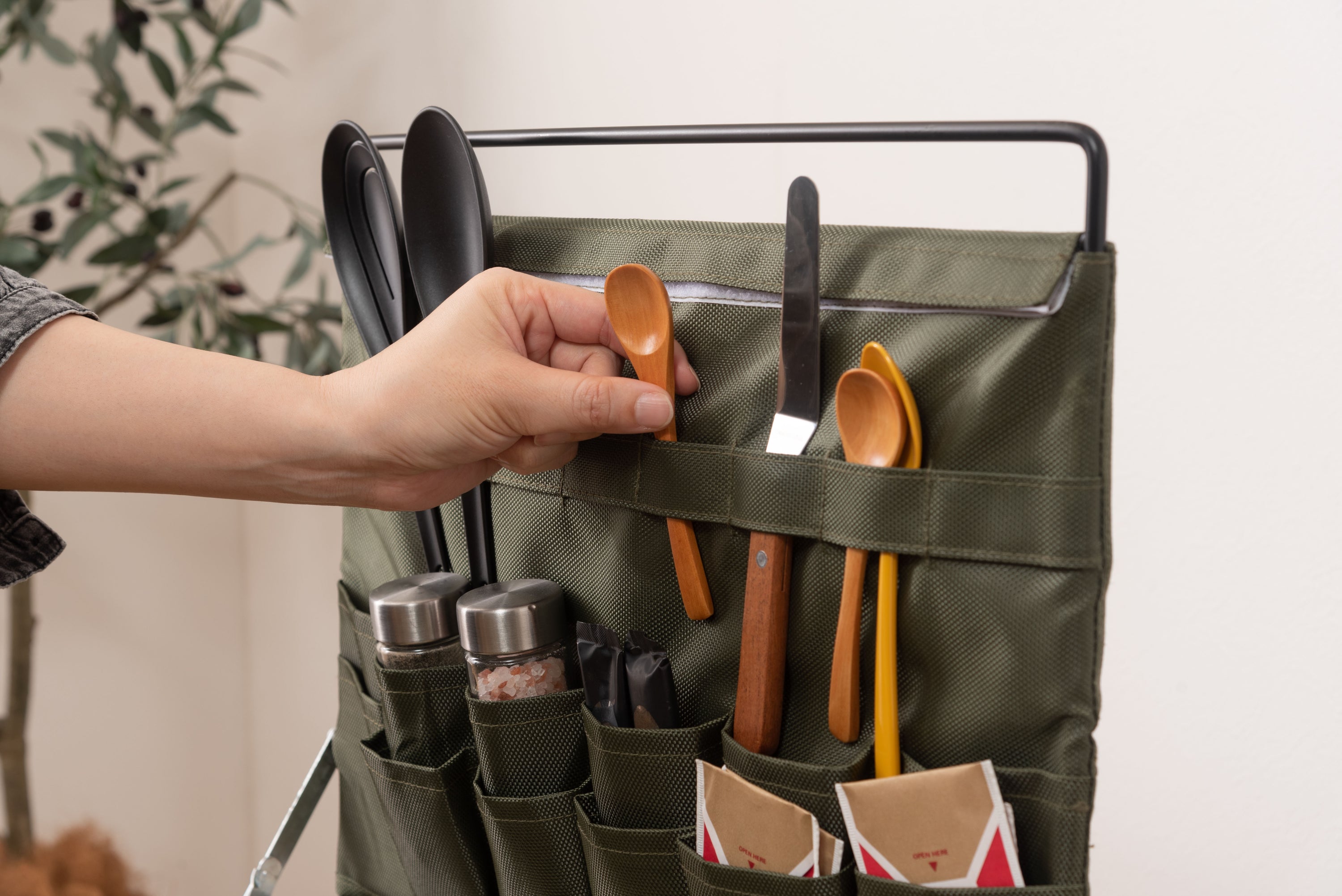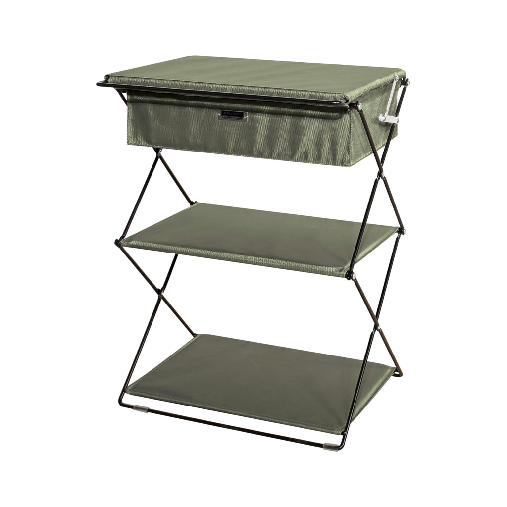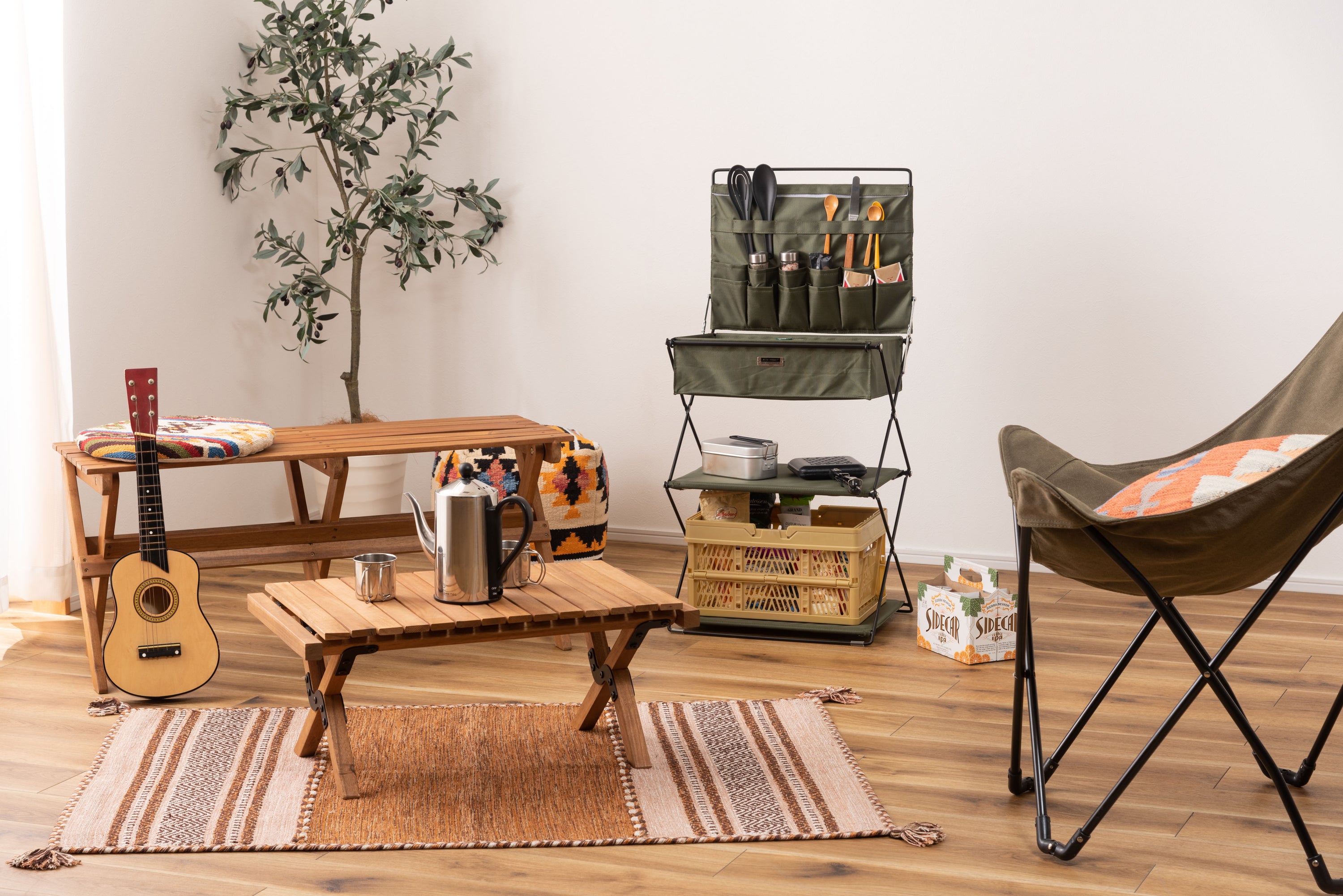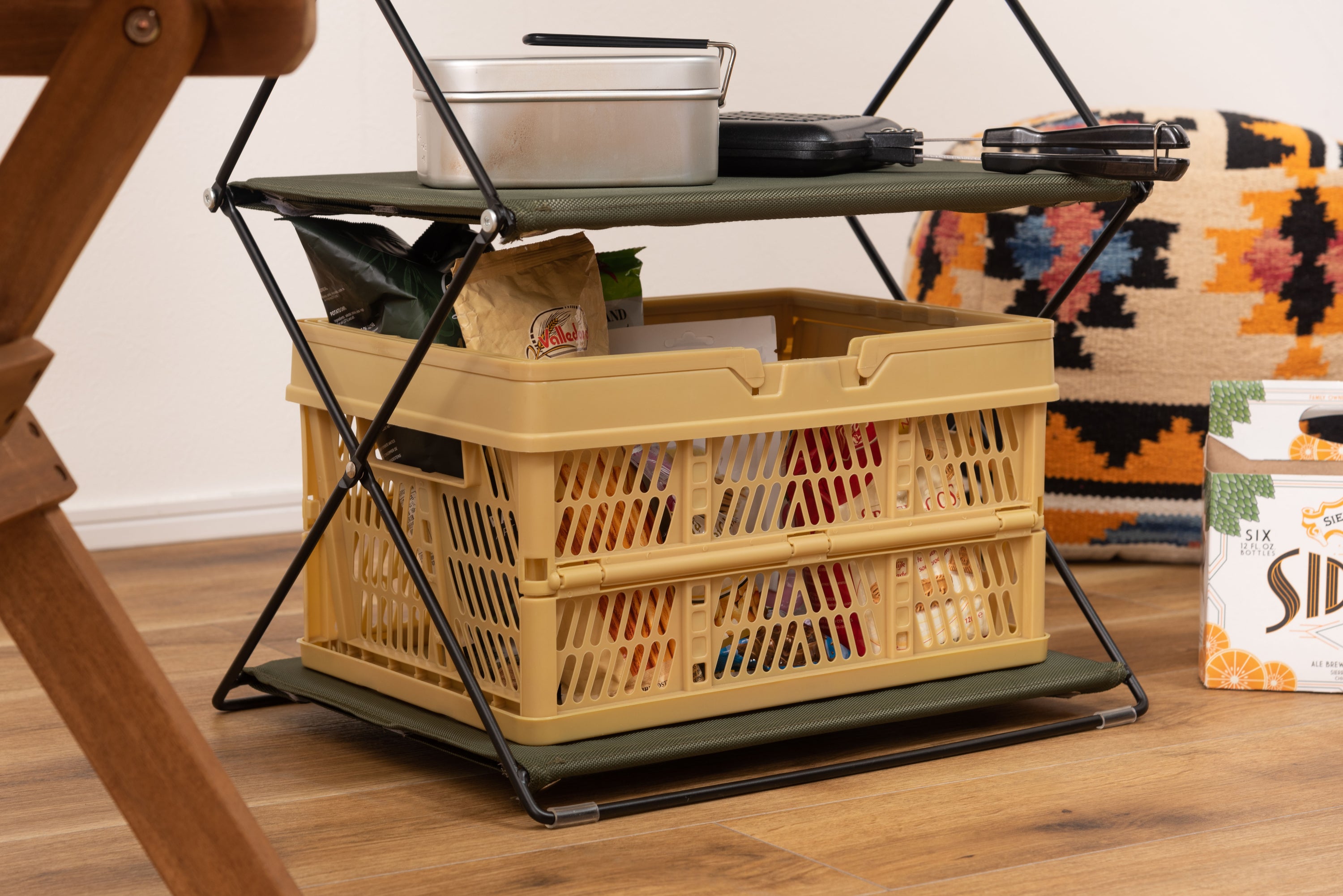 アウトドア・キャンプからソファやデスク横での使用まで、多彩に使える機能豊富なフォールディングラックです。収納ボックスや棚にはMDF板を使用しており、サイドテーブルとしても活躍します。収納ボックスは取り外して持ち運びができるトレータイプです。折りたたみ式なので持ち運びはコンパクトサイズになり便利です。