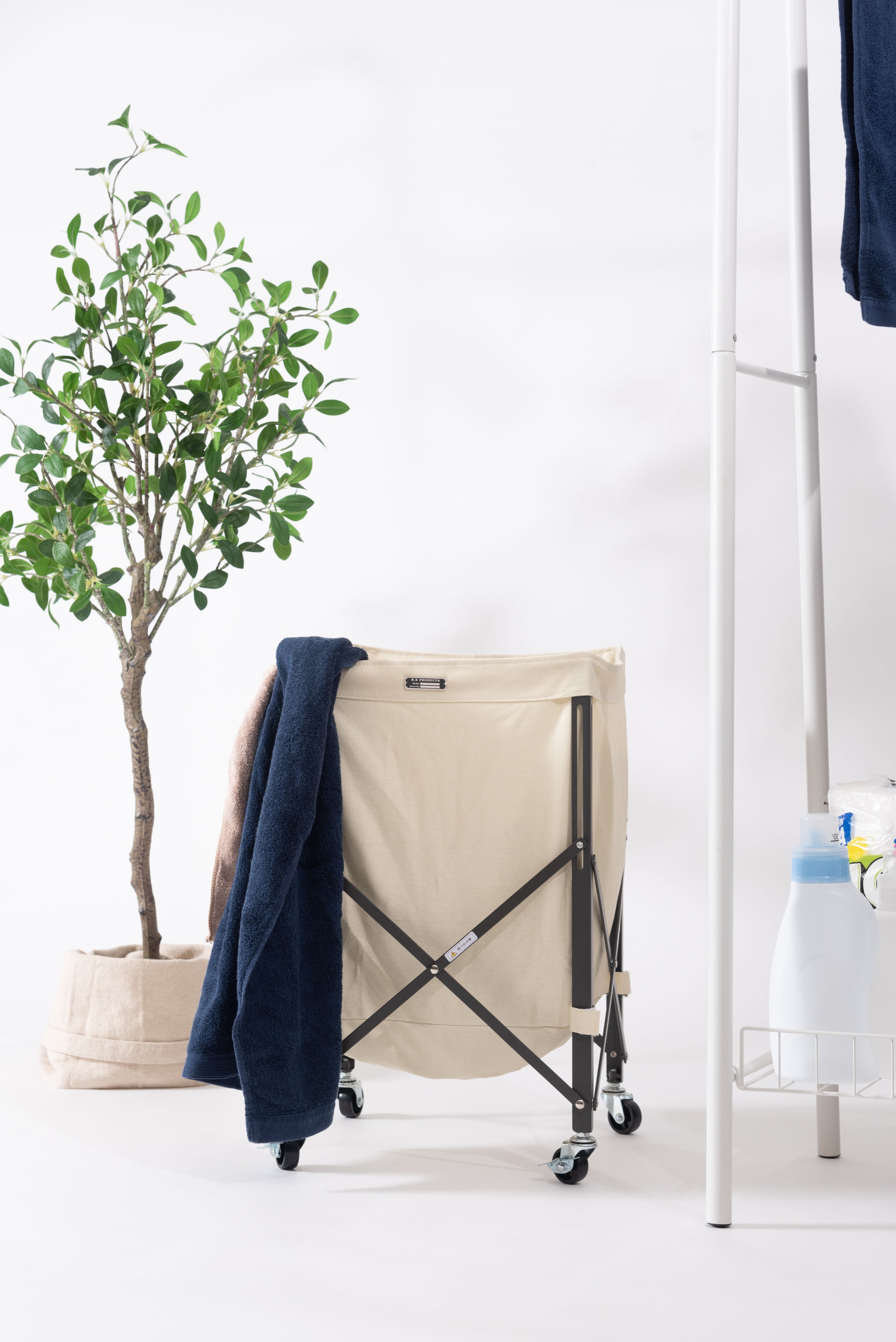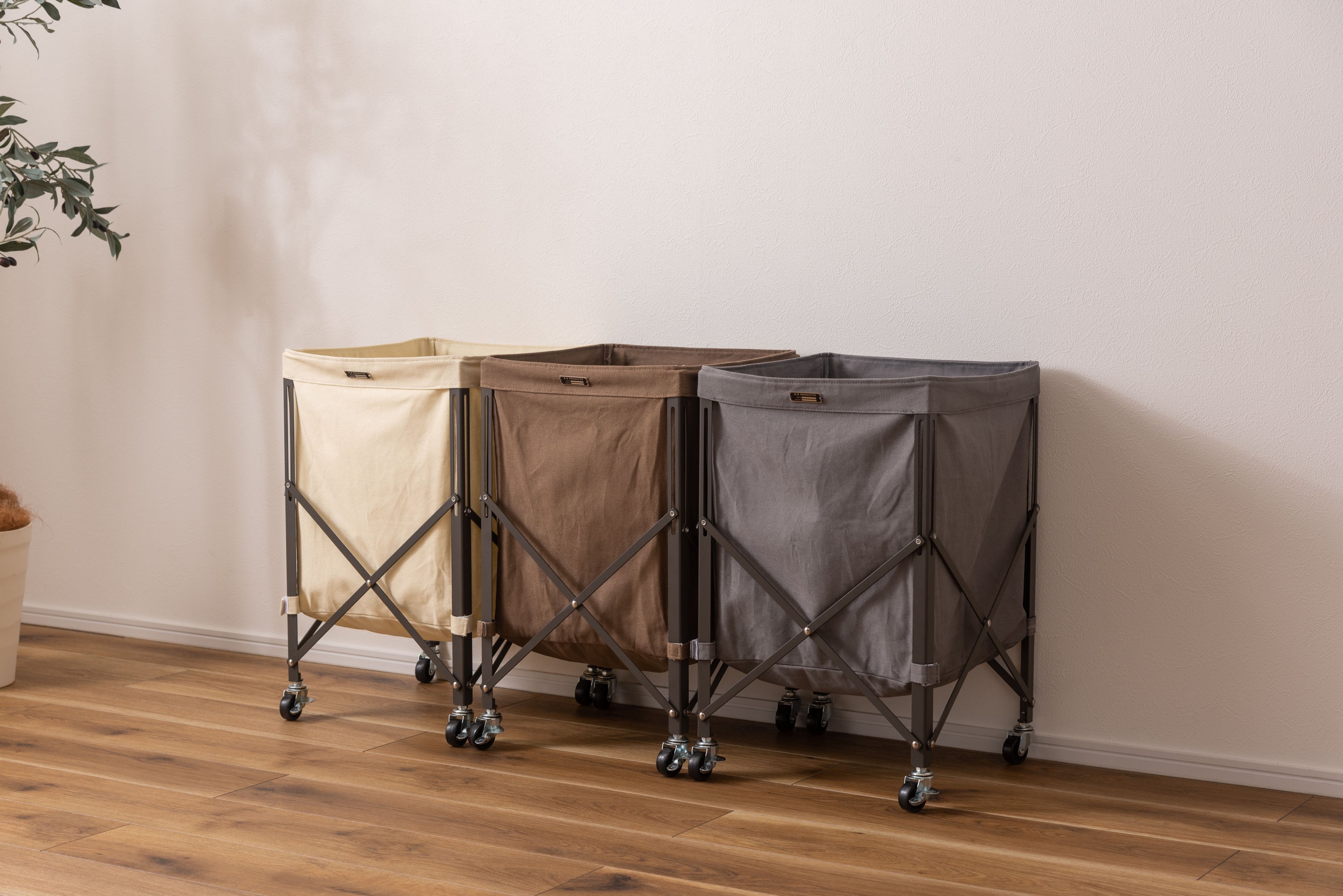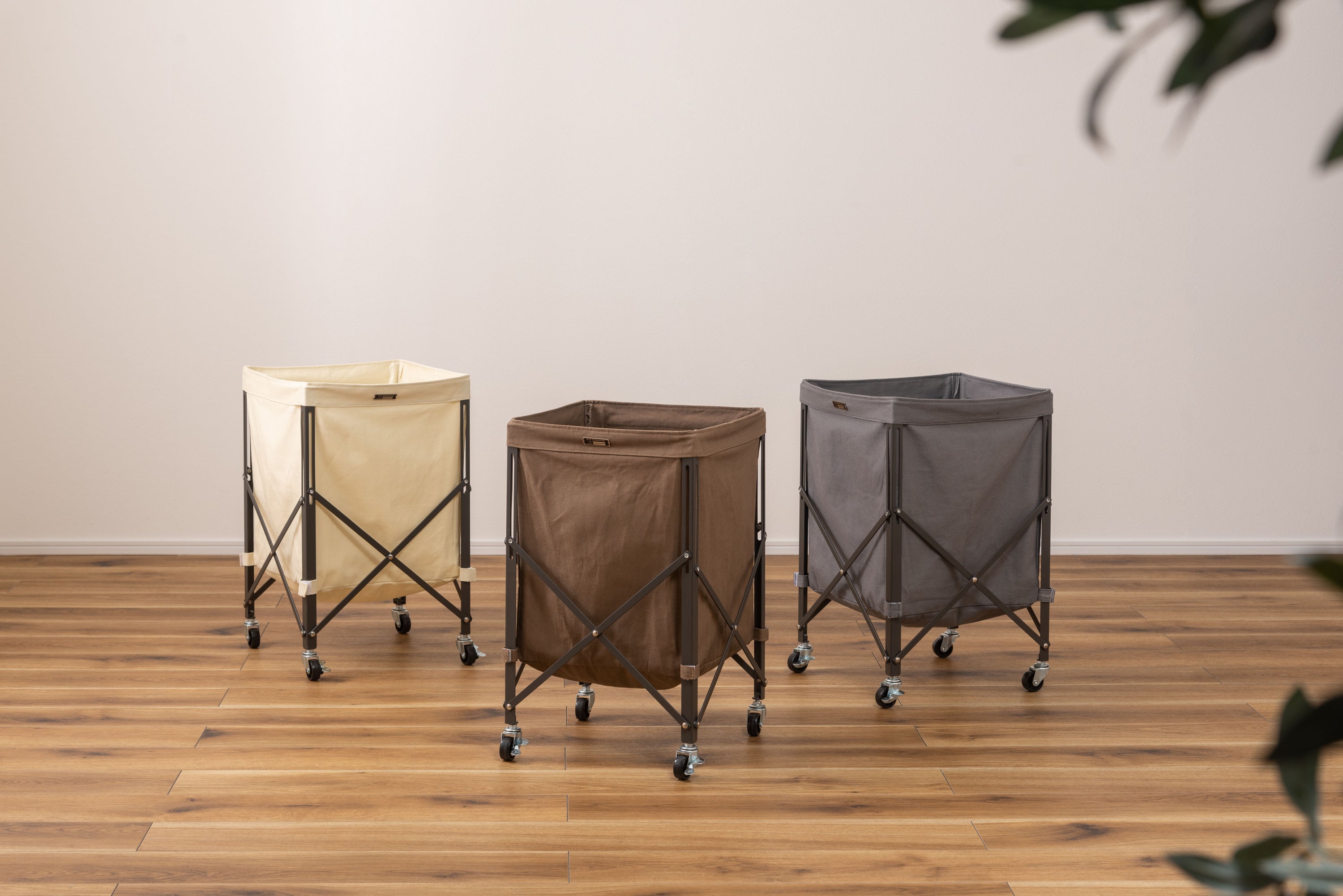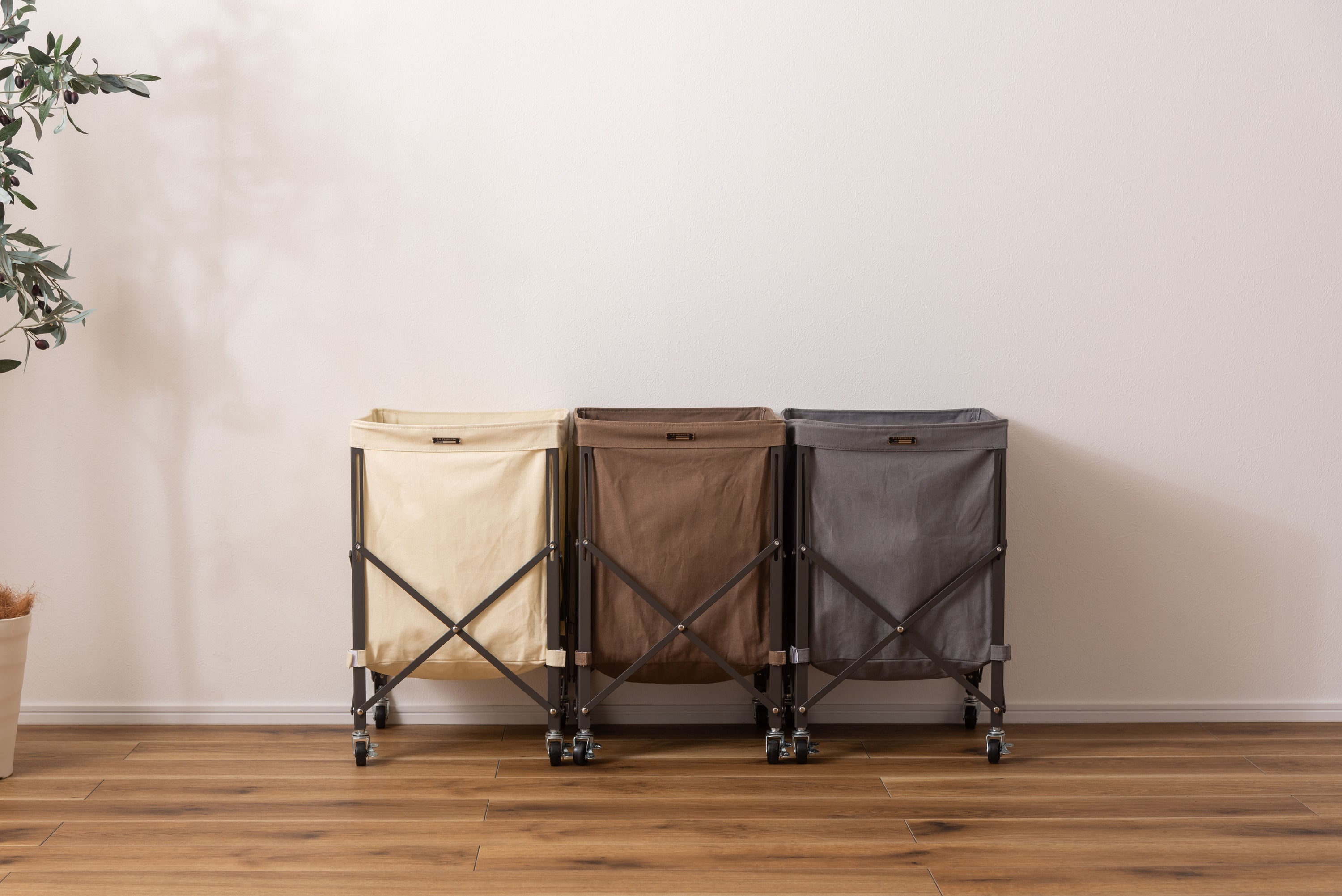屋内・屋外問わず使えるフォールディングバスケットワゴン。 コンパクトに折りたためるので持ち運びや省スペース収納に便利。 フレームを広げバスケットを被せマジックテープで固定するだけの簡単仕様。 大容量バスケットは36cmの深さがあるので背の高い物でも収納可能。 キャスター付きなので移動もらくらく。2個はストッパー付き。 脱衣所に置いてランドリーバスケットとして。 ソファ横に置いてリビングバスケットとして。 デスクや子供部屋に置いて多用途バスケットとして。 玄関周りに置いてバッグ・小物ワゴンとして。 本体重量は約2kgと軽量なので持ち運びも簡単。