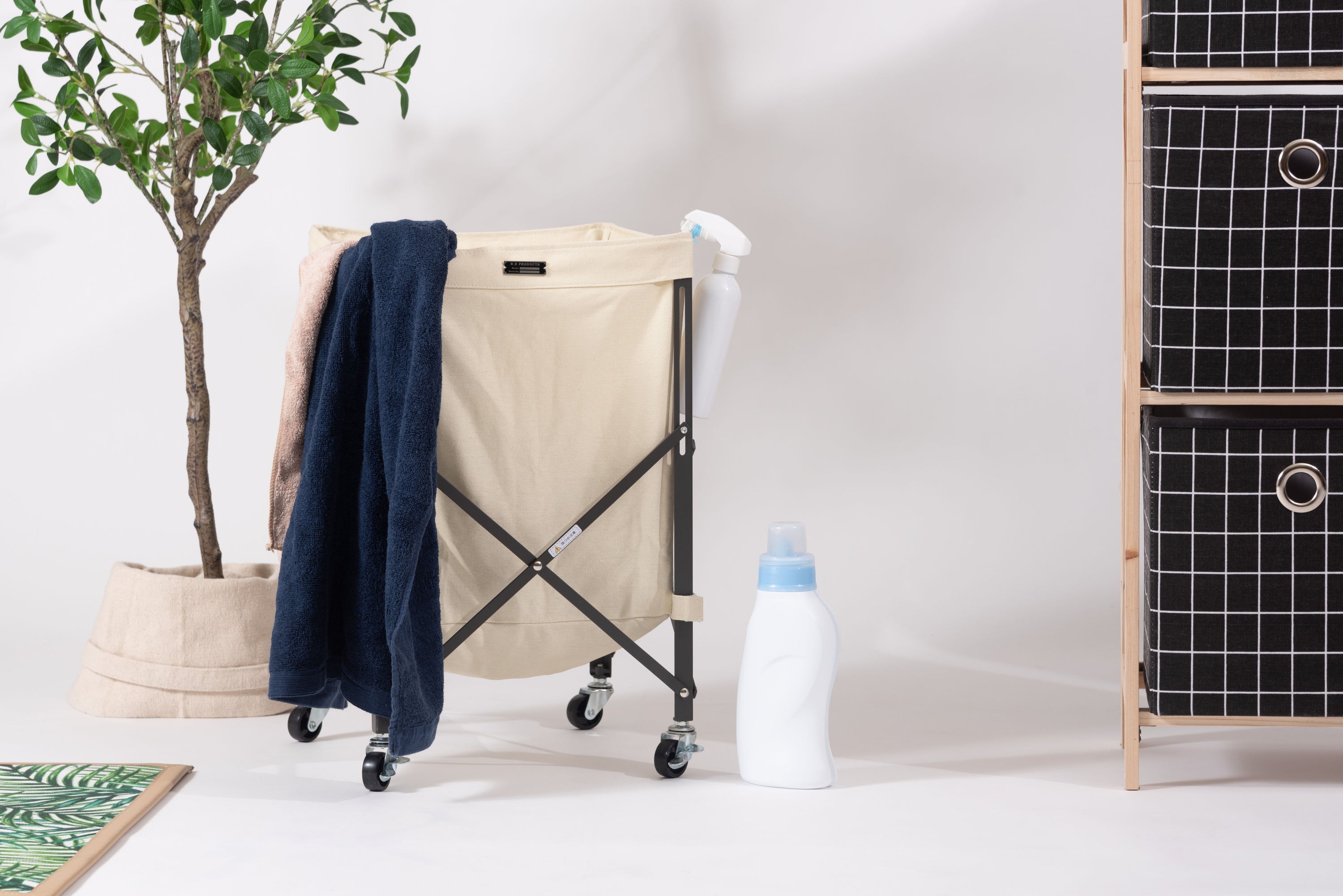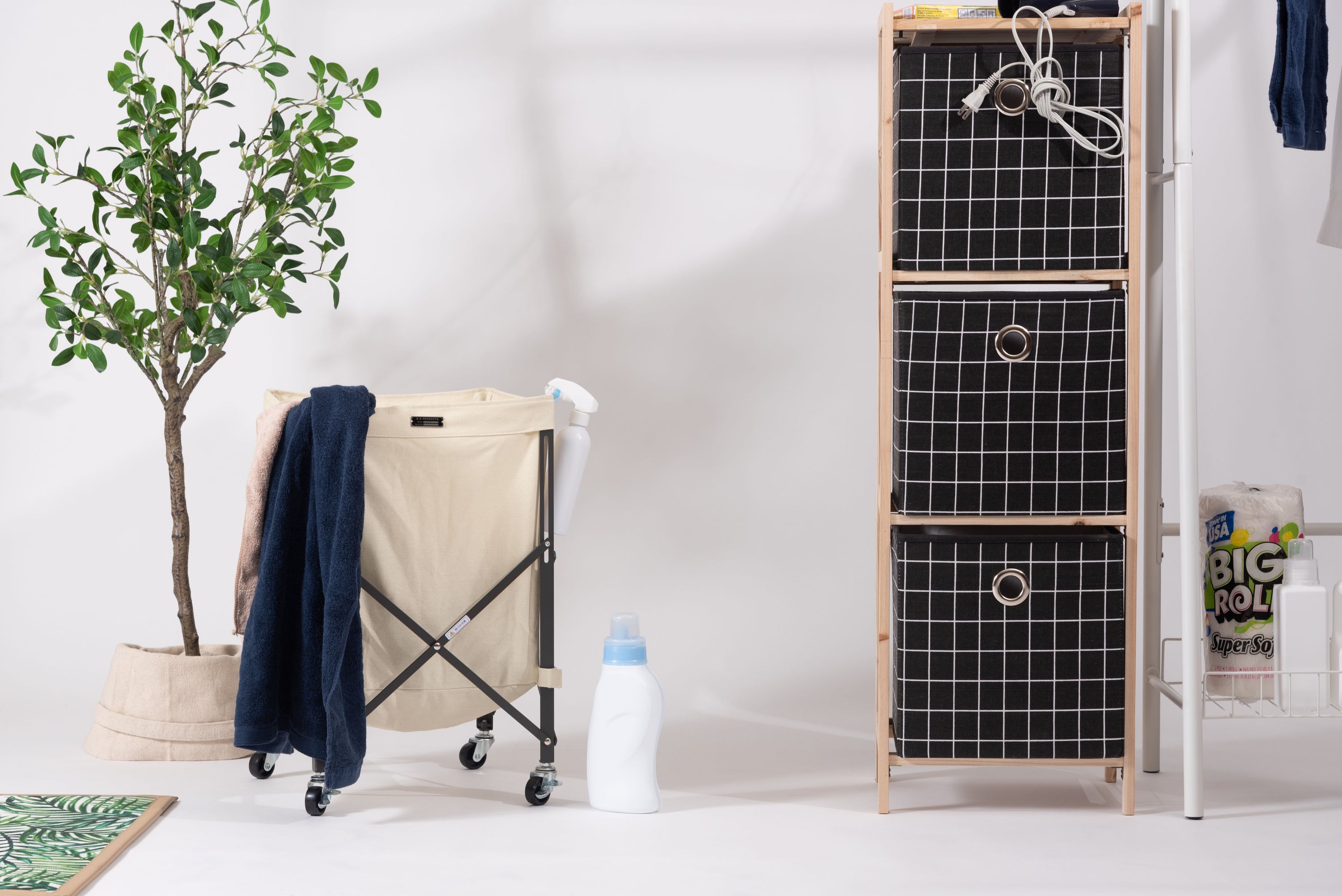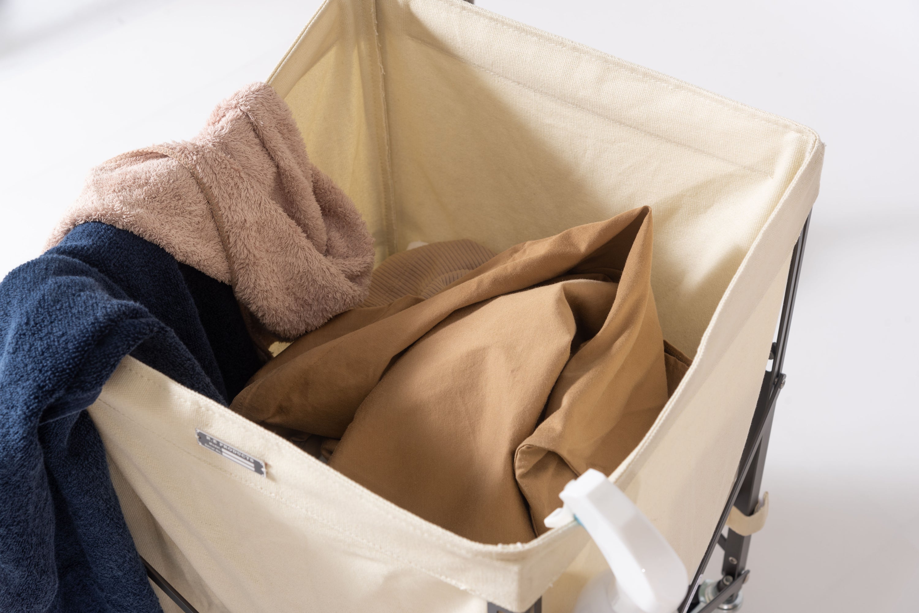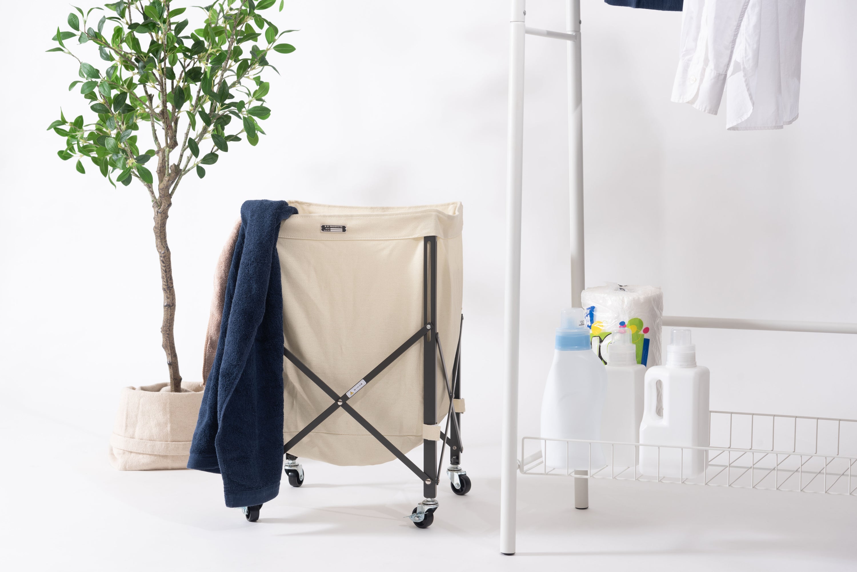 屋内・屋外問わず使えるフォールディングバスケットワゴン。 コンパクトに折りたためるので持ち運びや省スペース収納に便利。 フレームを広げバスケットを被せマジックテープで固定するだけの簡単仕様。 大容量バスケットは36cmの深さがあるので背の高い物でも収納可能。 キャスター付きなので移動もらくらく。2個はストッパー付き。 脱衣所に置いてランドリーバスケットとして。 ソファ横に置いてリビングバスケットとして。 デスクや子供部屋に置いて多用途バスケットとして。 玄関周りに置いてバッグ・小物ワゴンとして。 本体重量は約2kgと軽量なので持ち運びも簡単。