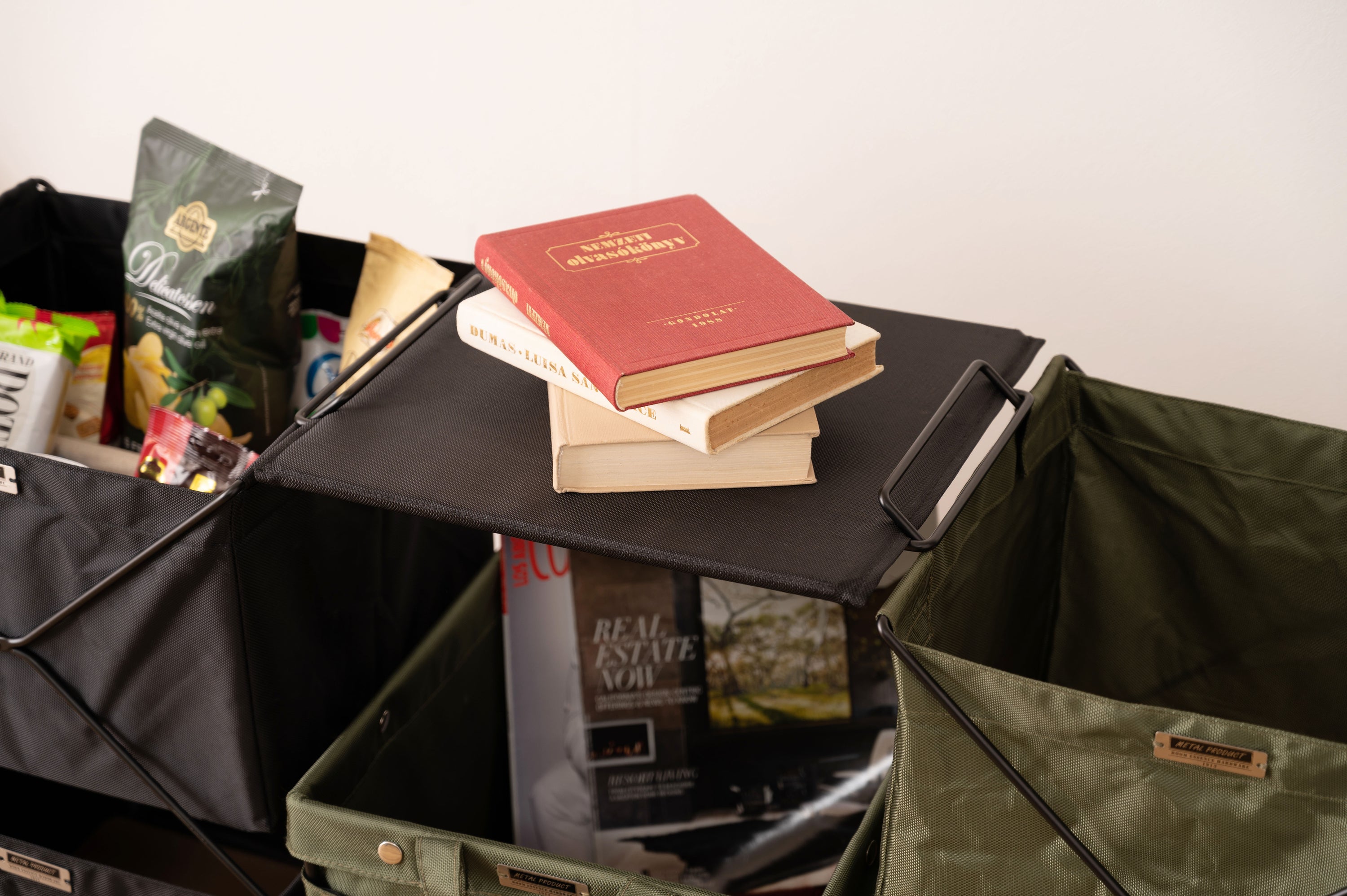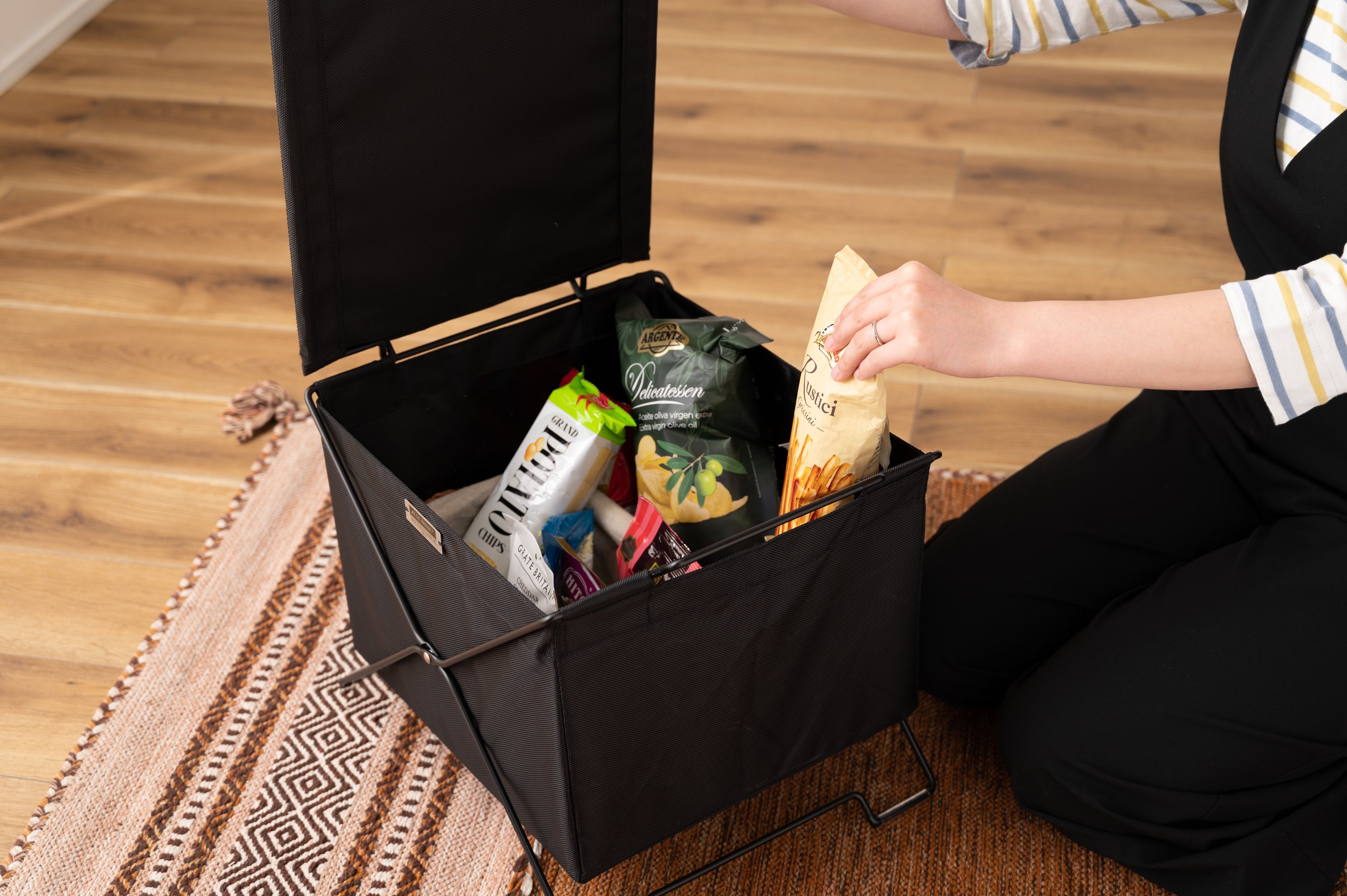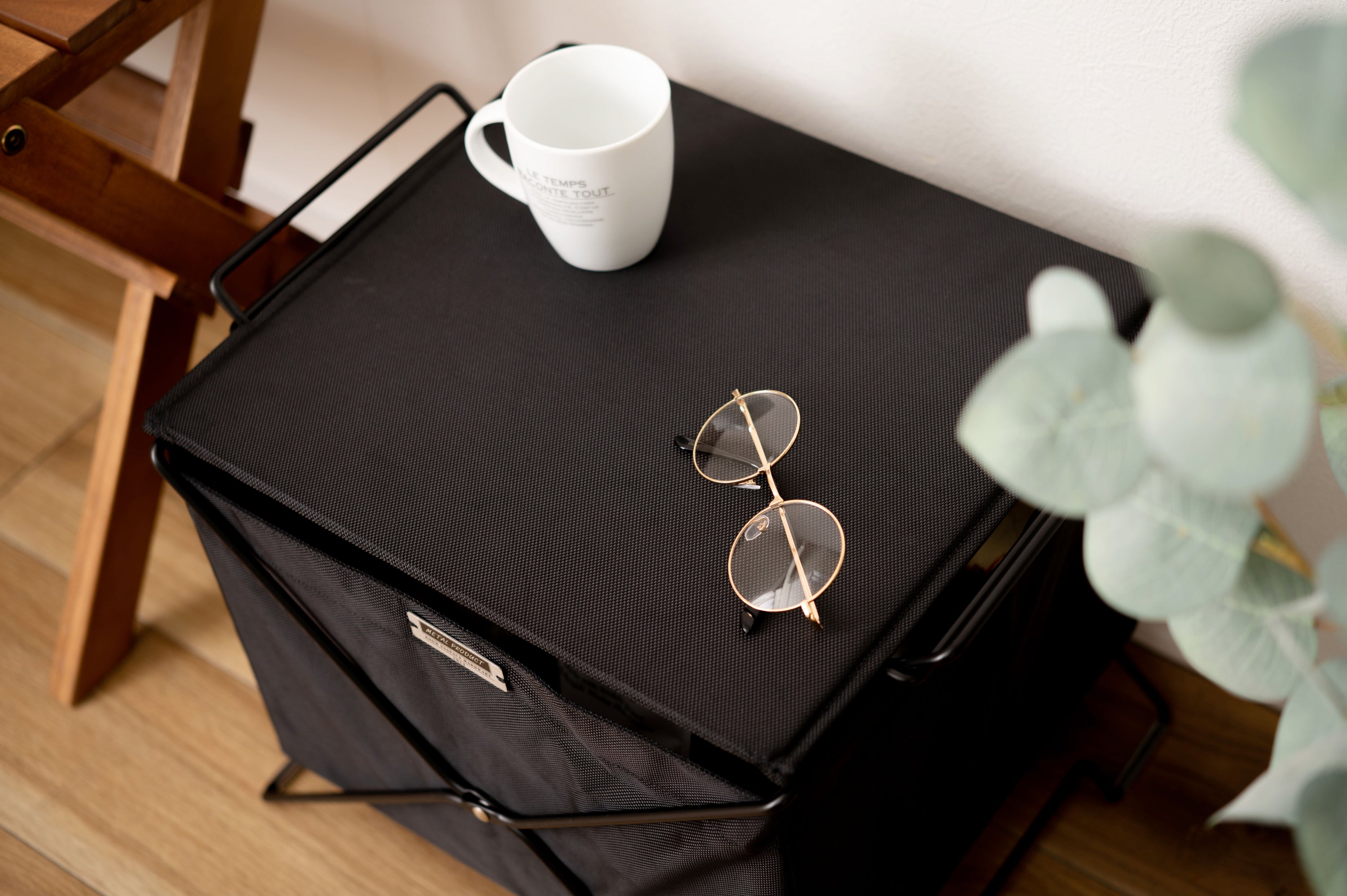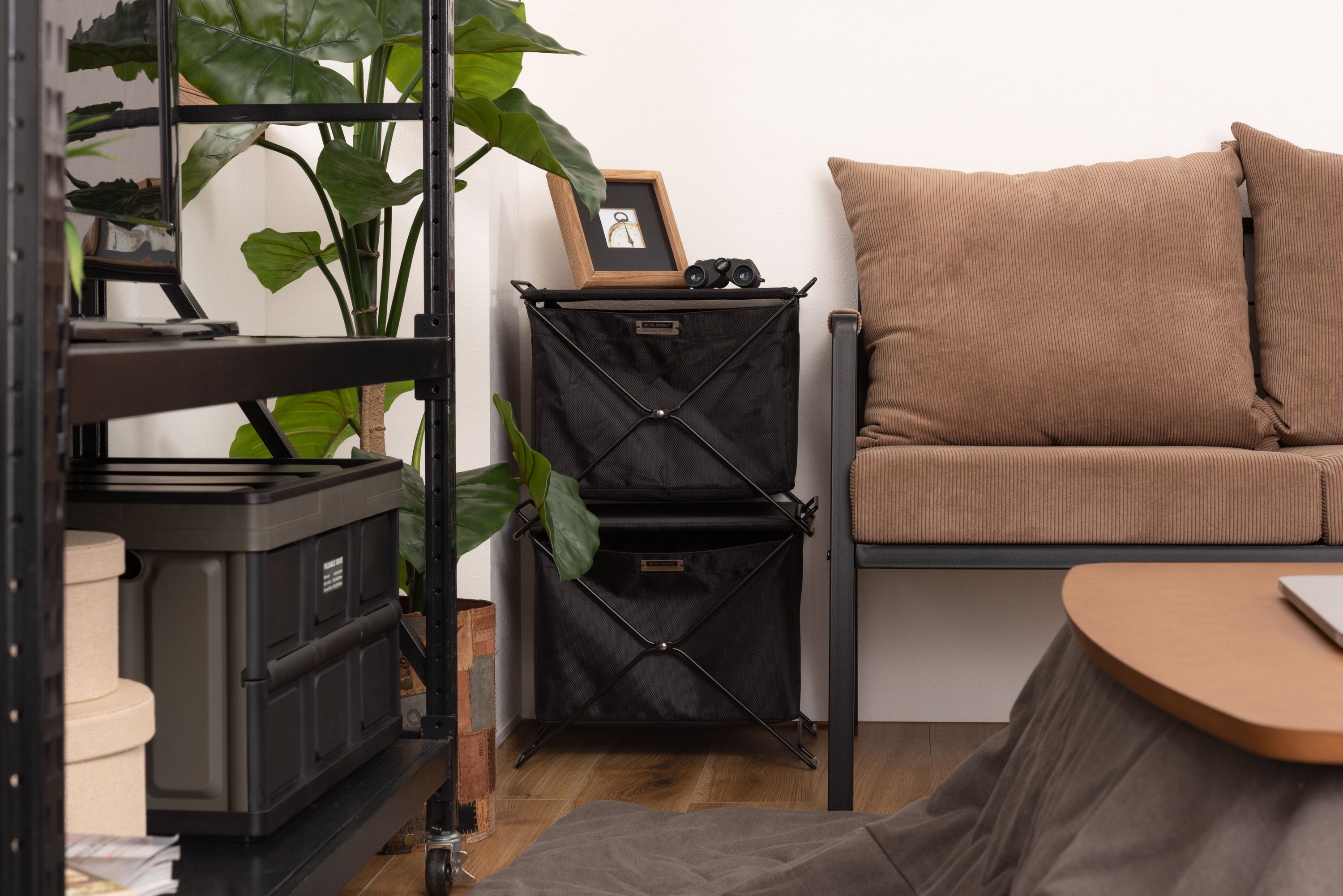 気軽に使えるフタ付きバスケット。机周りやアウトドアでの小物の収納に便利。軽くて持ち運びがしやすく、フタが平面でしっかりしているのでサイドテーブルにも使用できます。フタは取り外してトレーとしても使用できます。積み重ね(スタッキング)が可能なので、省スペースで効率よく収納ができます。取っ手が付いているので持ち運びもらくらく。