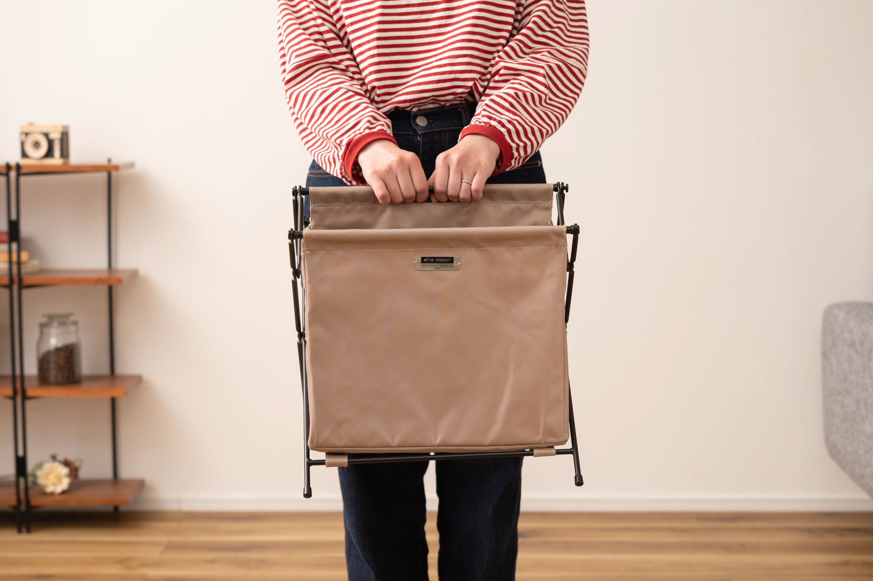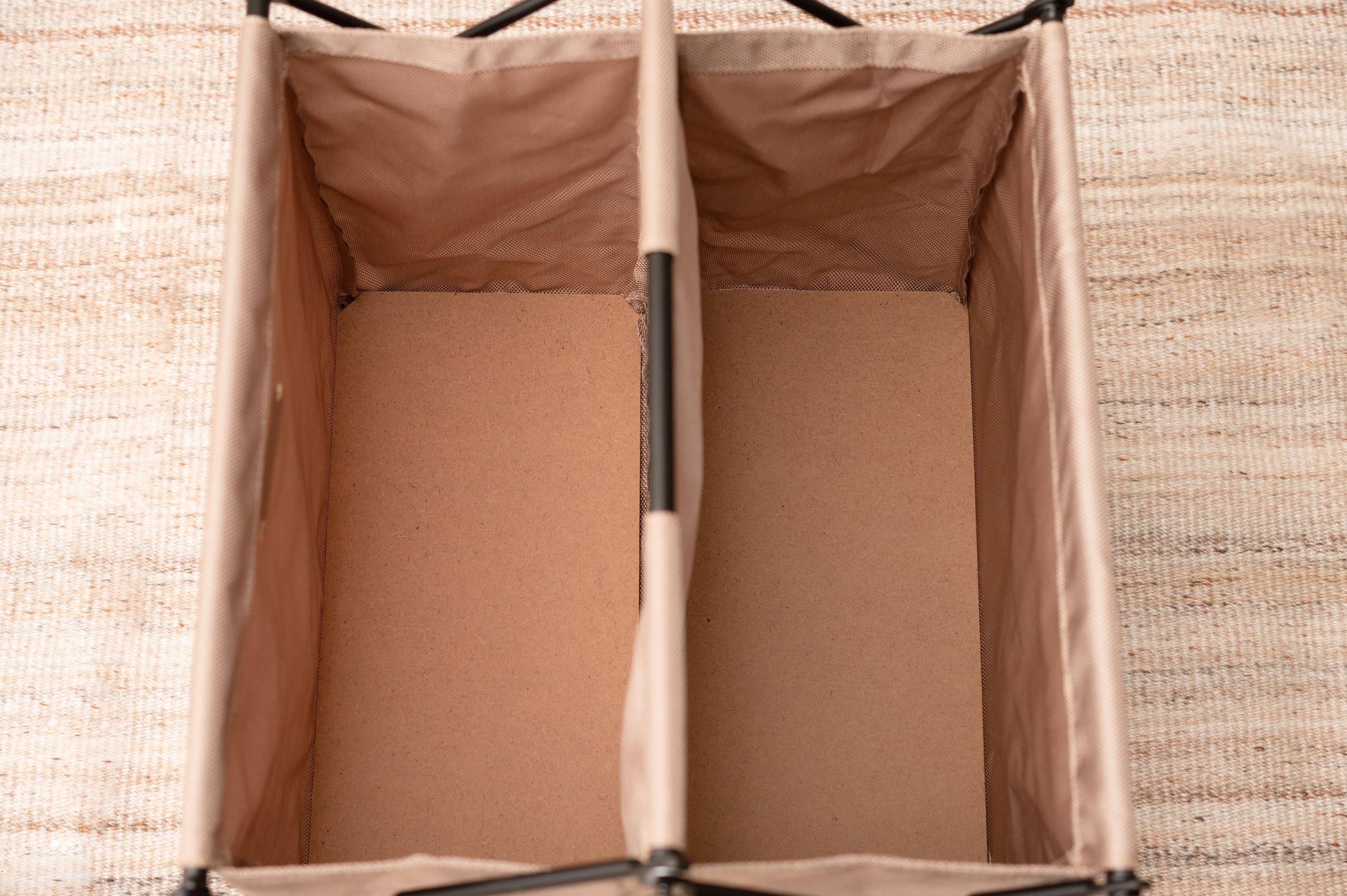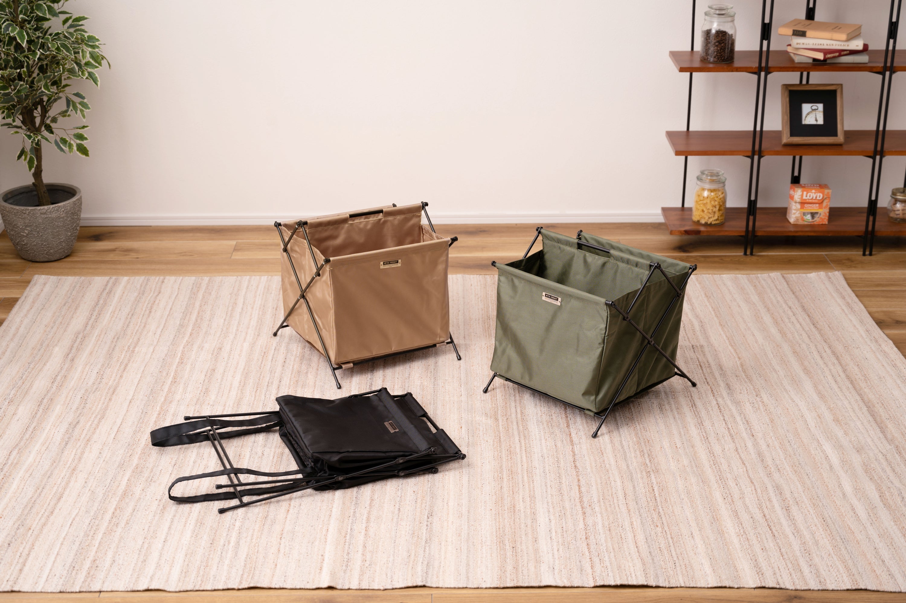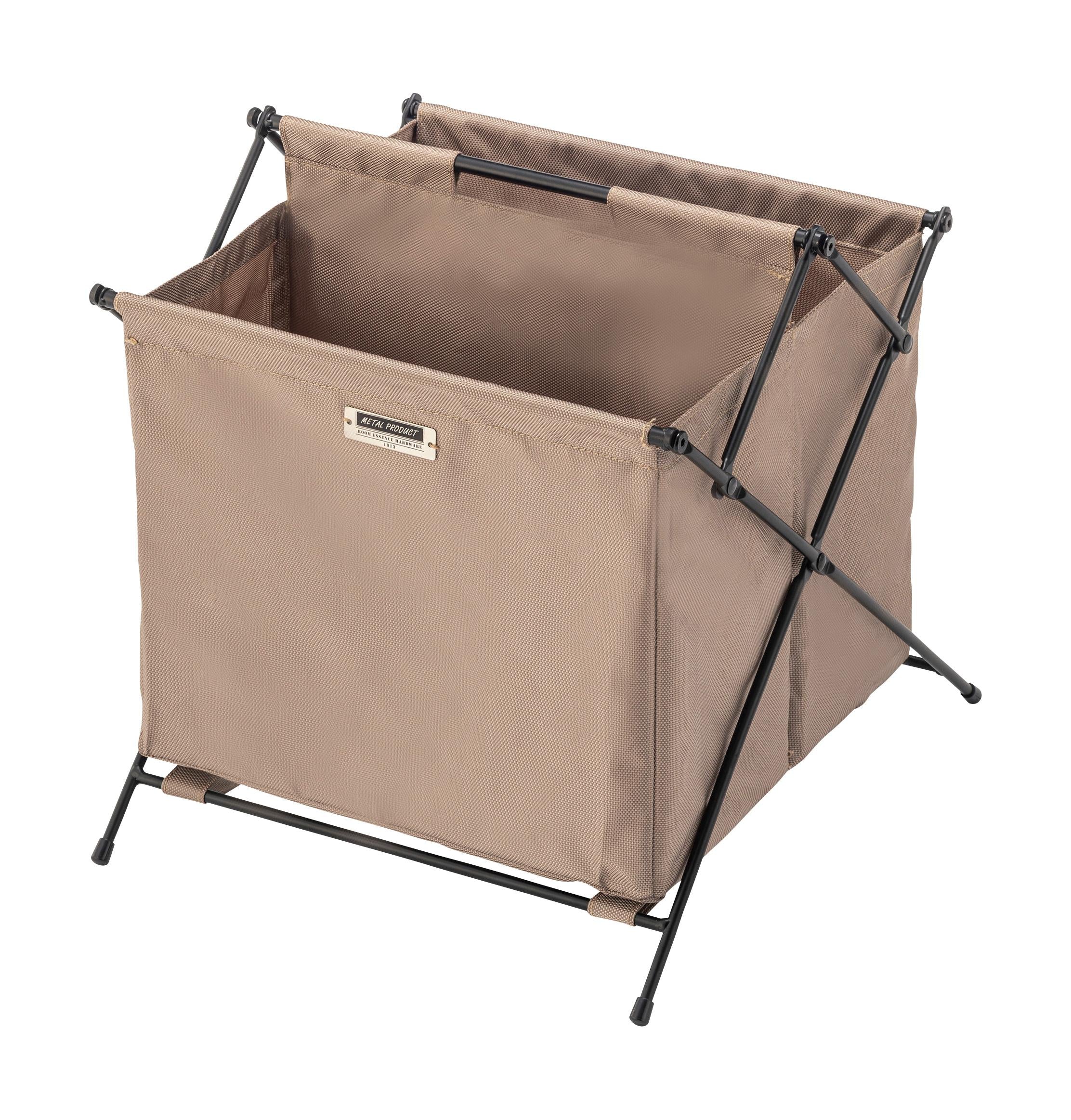 仕分け収納ができる仕切り付きフォールディングバスケット。二つに仕切られたバスケットは、自分好みに仕分けて収納。両端を内側に押し込むだけで折り畳むことができ、中央には取っ手が付いているので持ち運びラクラク。使わない時は折り畳んでちょっとした隙間に収納が可能。MDFの底板が付いているので、しっかり綺麗に収納をサポート。脚先キャップ付きで床への傷防止になり安心。アウトドアテイストの落ち着いたカラーで、どのお部屋にもしっくりと馴染みます。