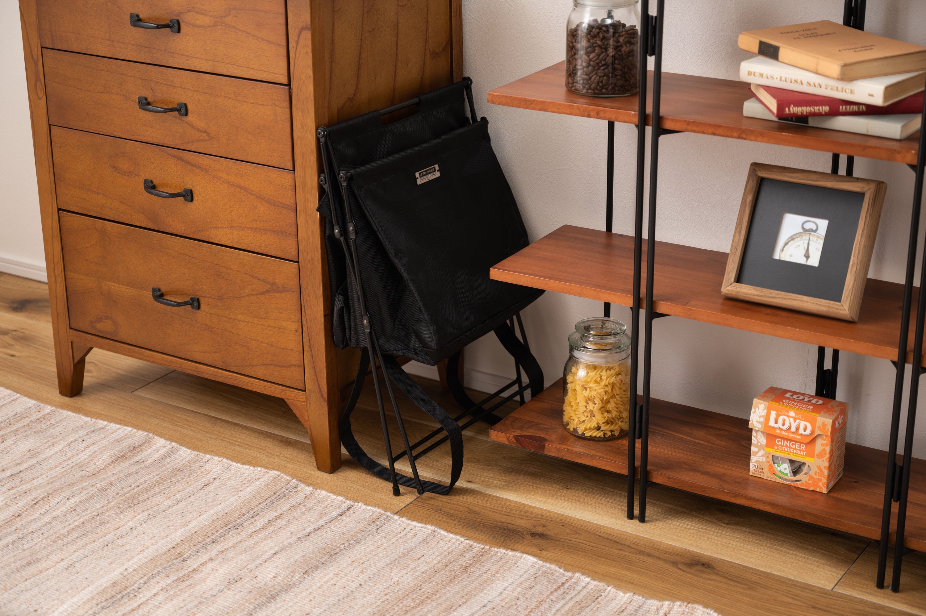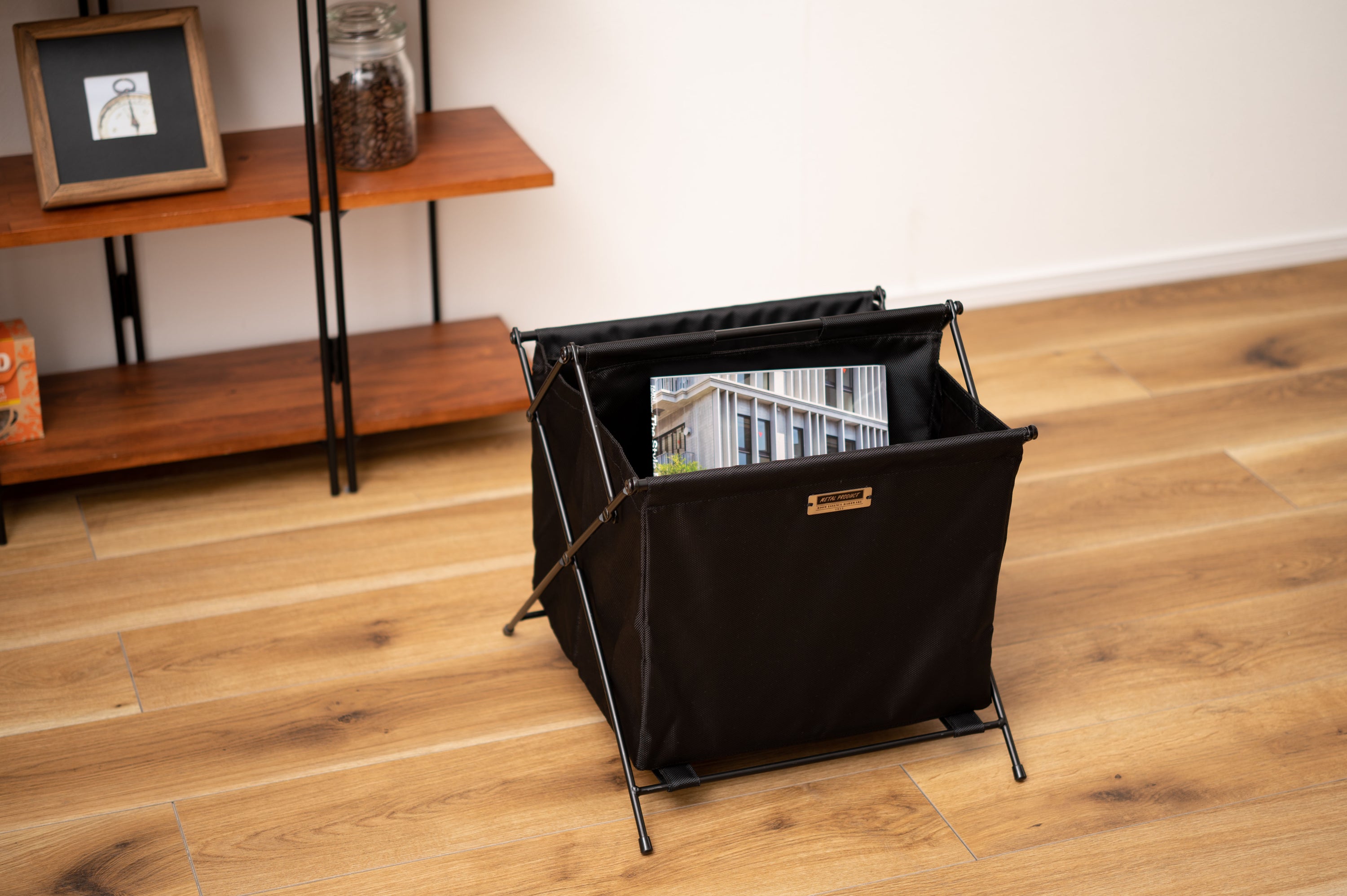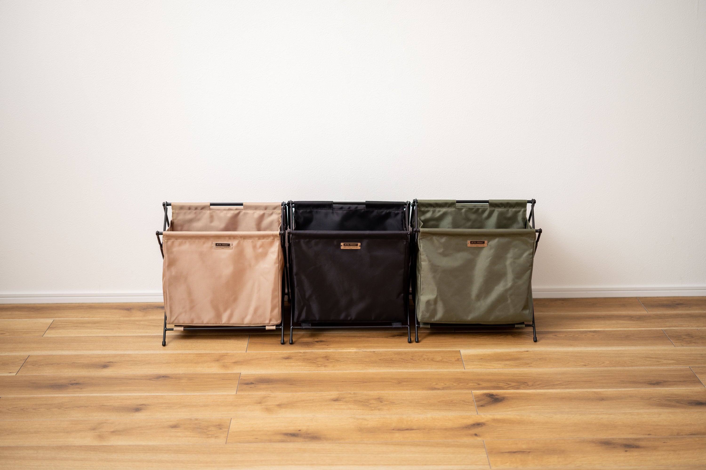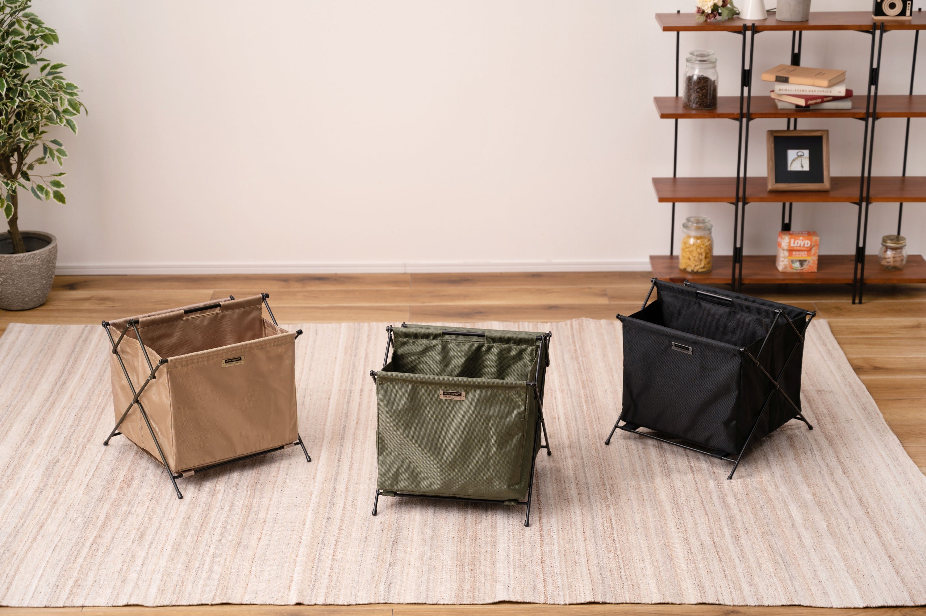 仕分け収納ができる仕切り付きフォールディングバスケット。二つに仕切られたバスケットは、自分好みに仕分けて収納。両端を内側に押し込むだけで折り畳むことができ、中央には取っ手が付いているので持ち運びラクラク。使わない時は折り畳んでちょっとした隙間に収納が可能。MDFの底板が付いているので、しっかり綺麗に収納をサポート。脚先キャップ付きで床への傷防止になり安心。アウトドアテイストの落ち着いたカラーで、どのお部屋にもしっくりと馴染みます。