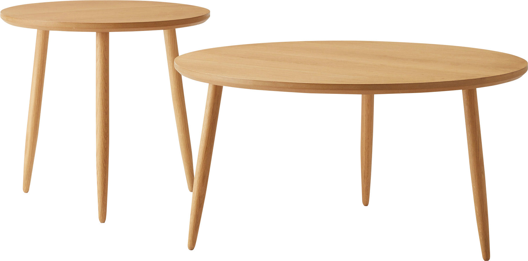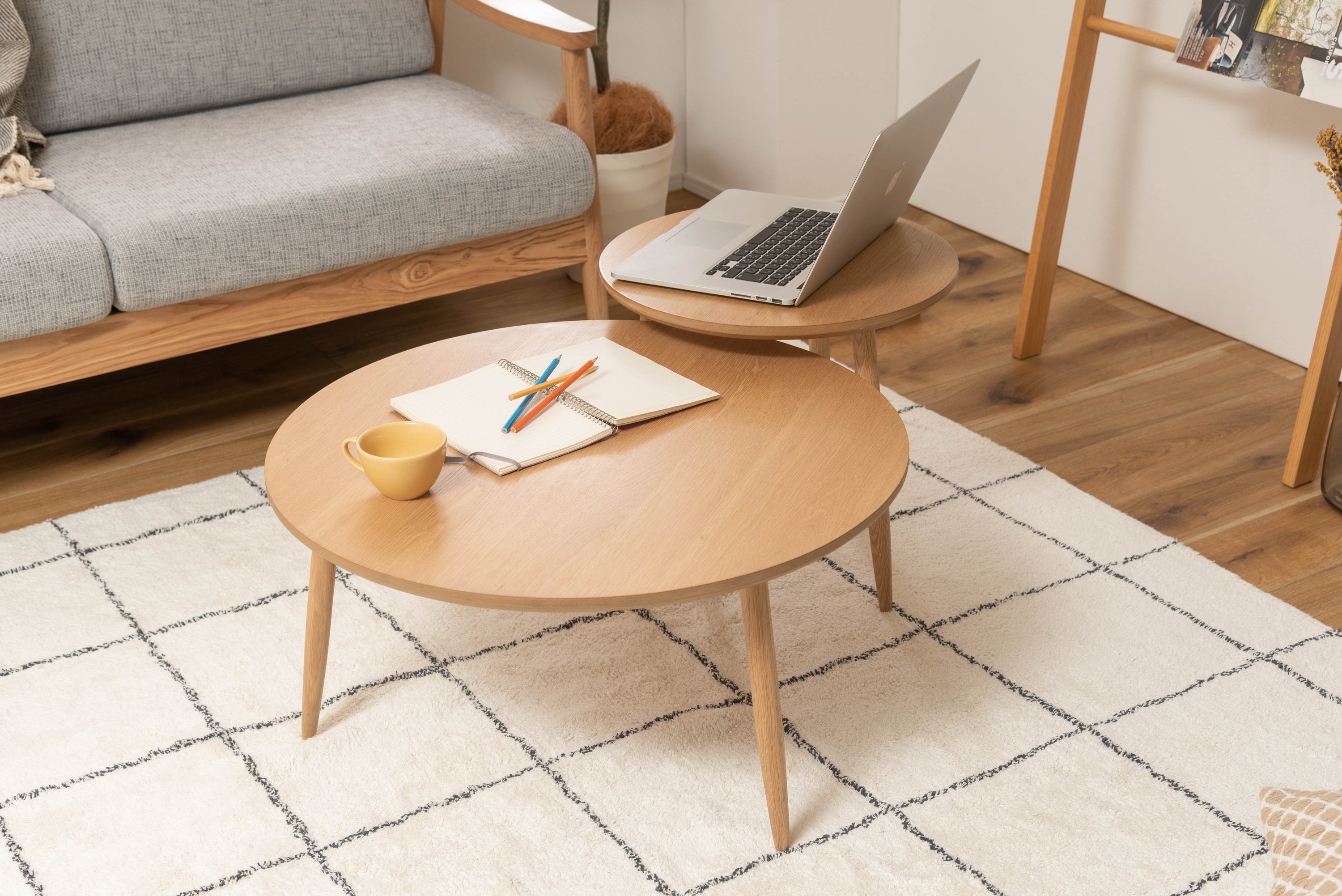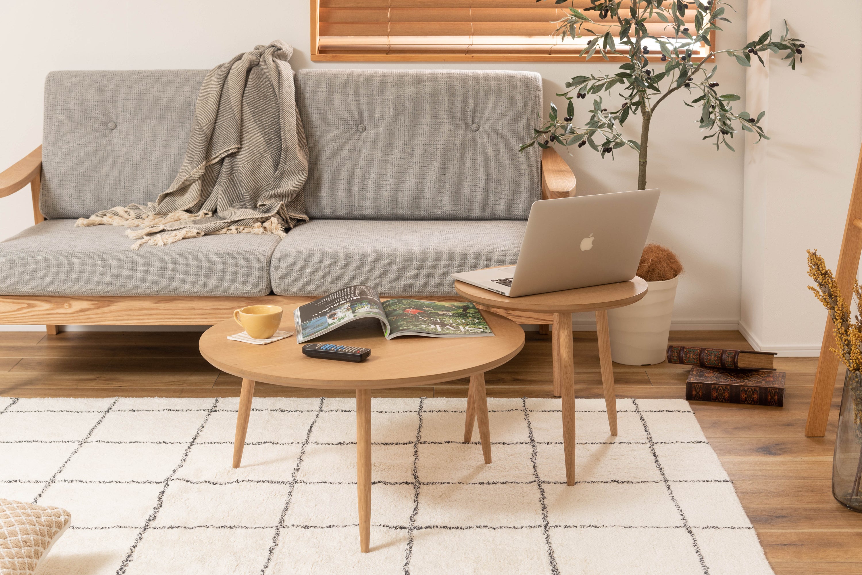 いろいろな使い方ができ、ナチュラルな空間を演出する2タイプのラウンドテーブルです。木目が美しいホワイトオークを使用して清楚感があり、ナチュラル系インテリアの代表的な材として、オーク材の魅力を活かしたシンプルなデザインになっています。それぞれ、サイドテーブルやリビングテーブルとして使用するほか、SサイズとLサイズを組み合わせてネストテーブルとして使用すれば、リビングの空間もインテリア性が高く仕上がります。