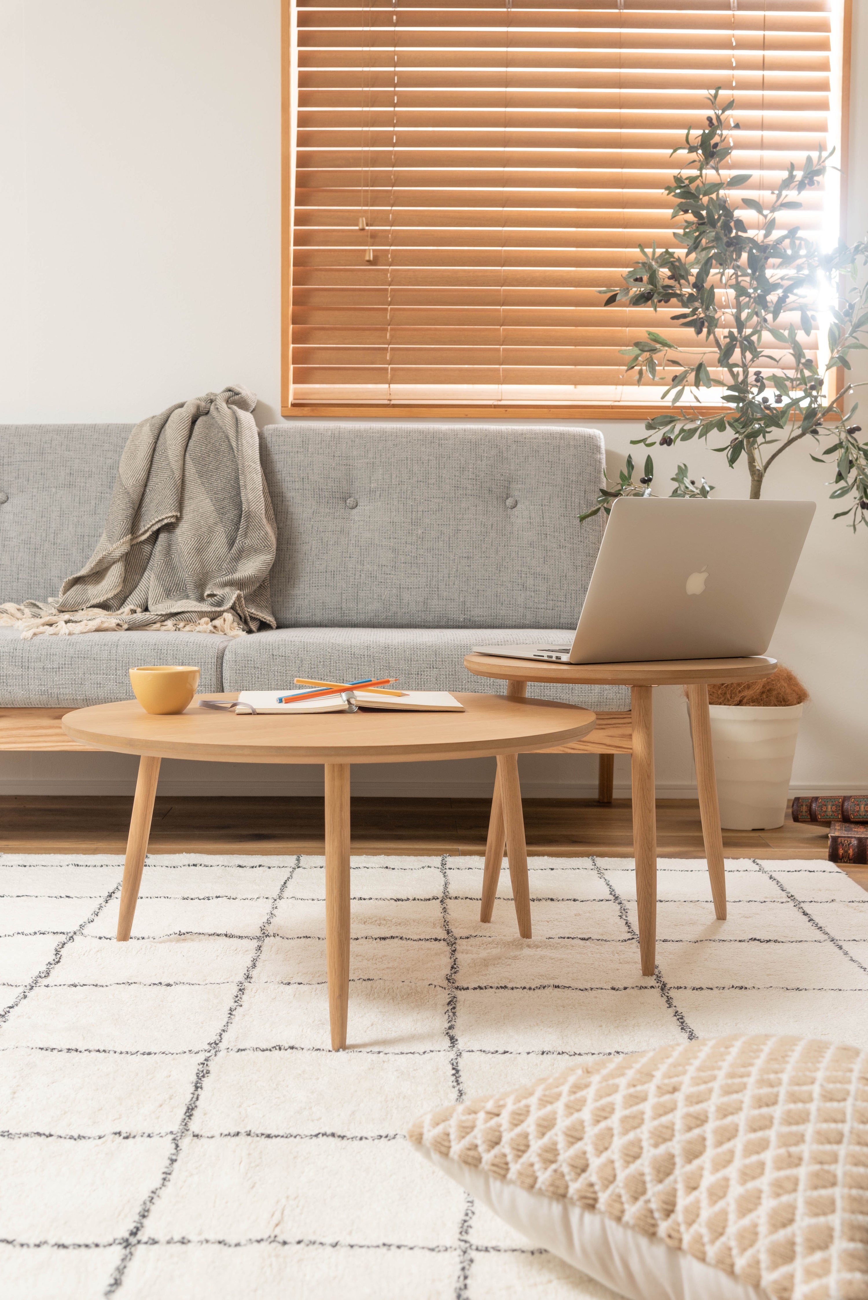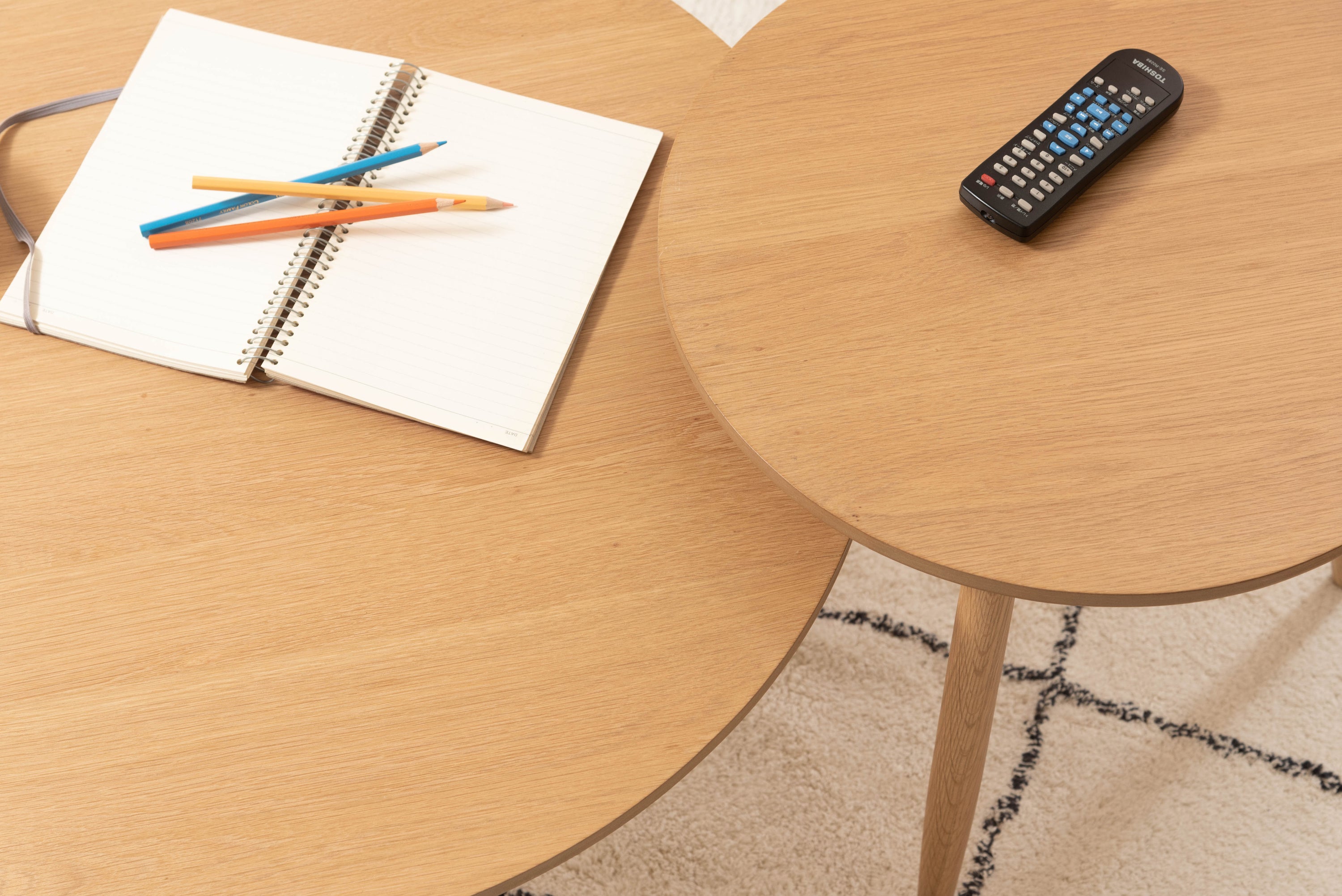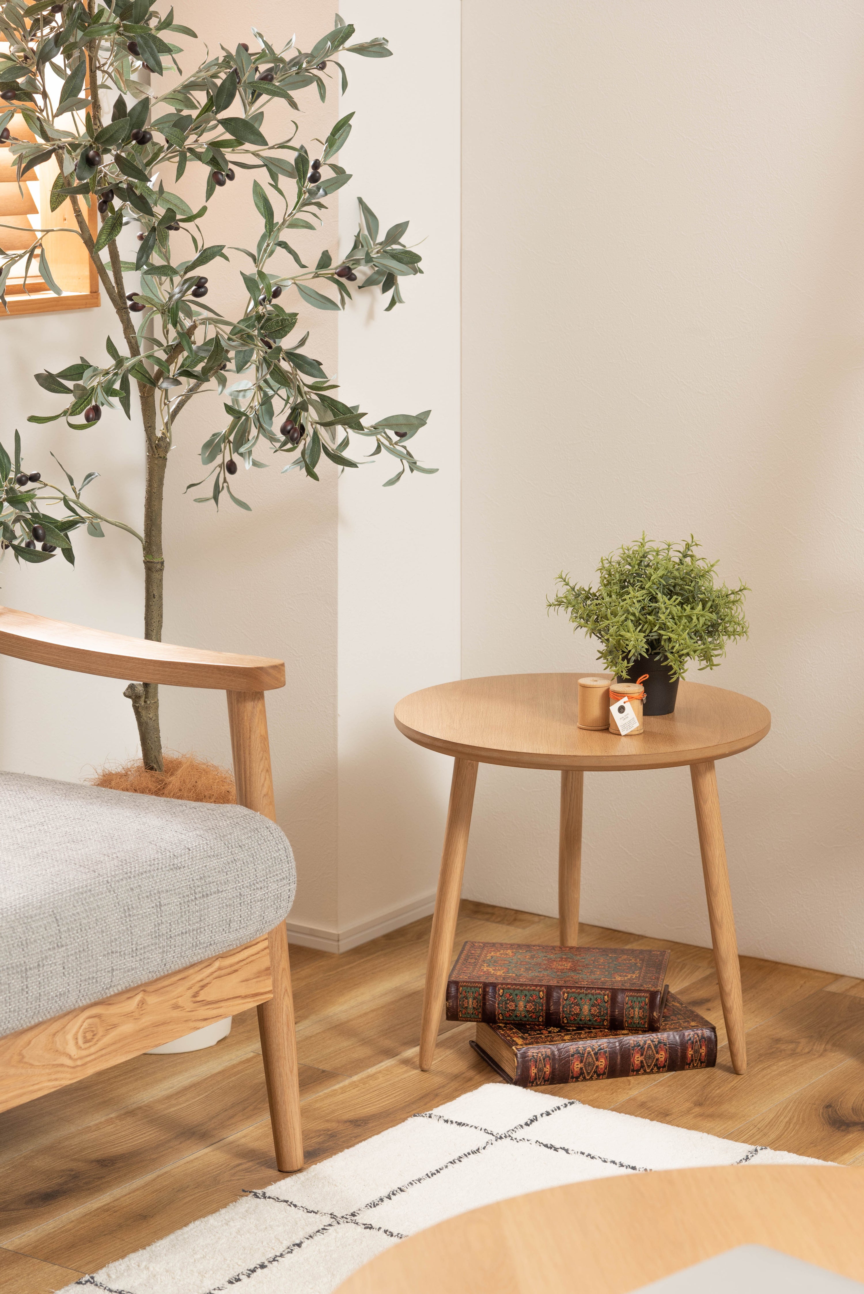 いろいろな使い方ができ、ナチュラルな空間を演出する2タイプのラウンドテーブルです。木目が美しいホワイトオークを使用して清楚感があり、ナチュラル系インテリアの代表的な材として、オーク材の魅力を活かしたシンプルなデザインになっています。それぞれ、サイドテーブルやリビングテーブルとして使用するほか、SサイズとLサイズを組み合わせてネストテーブルとして使用すれば、リビングの空間もインテリア性が高く仕上がります。