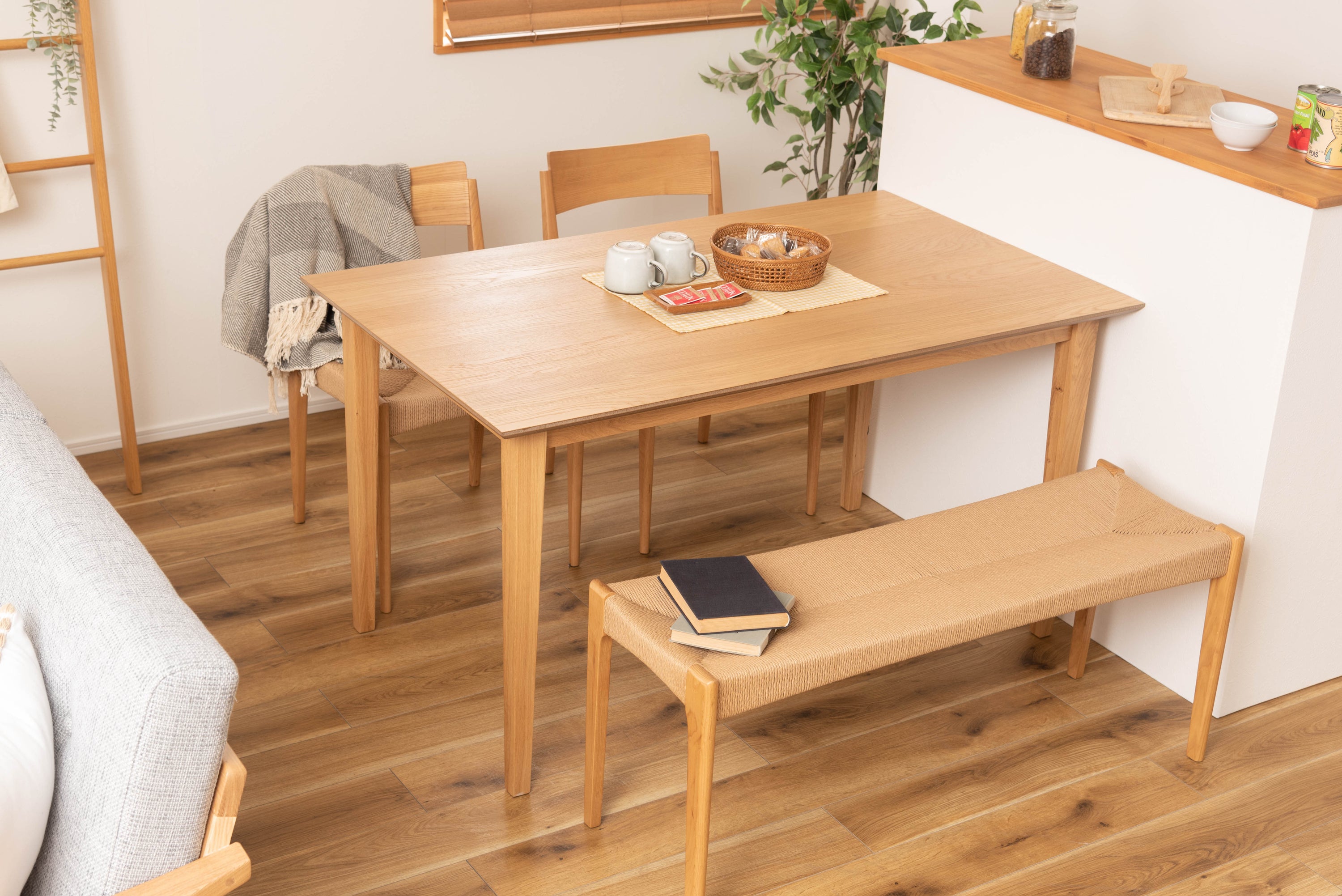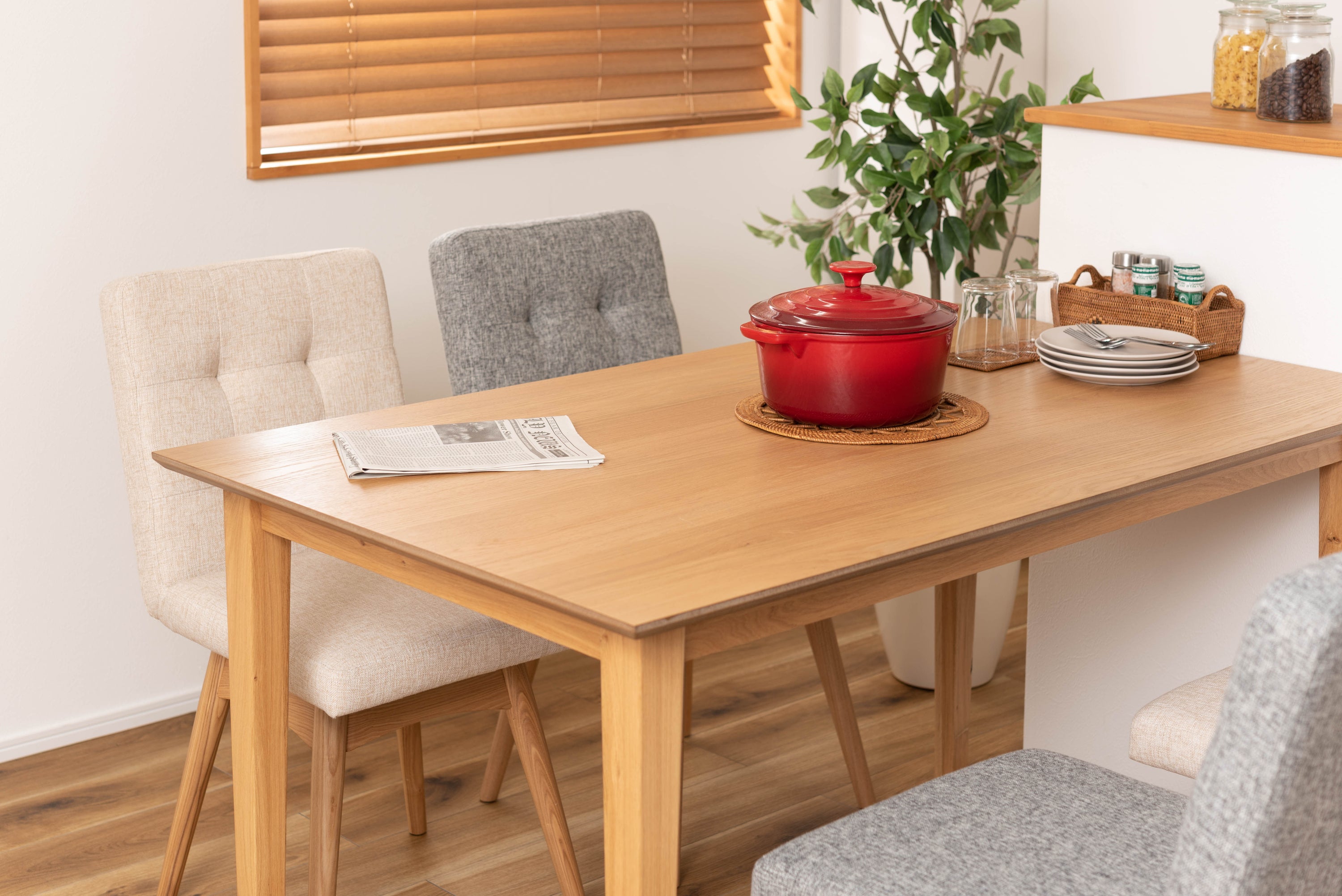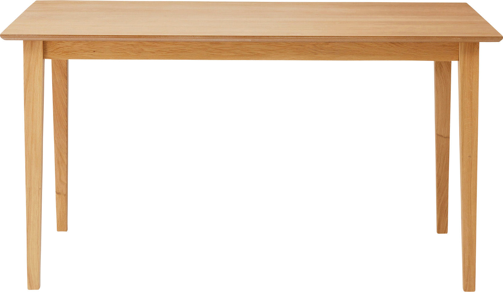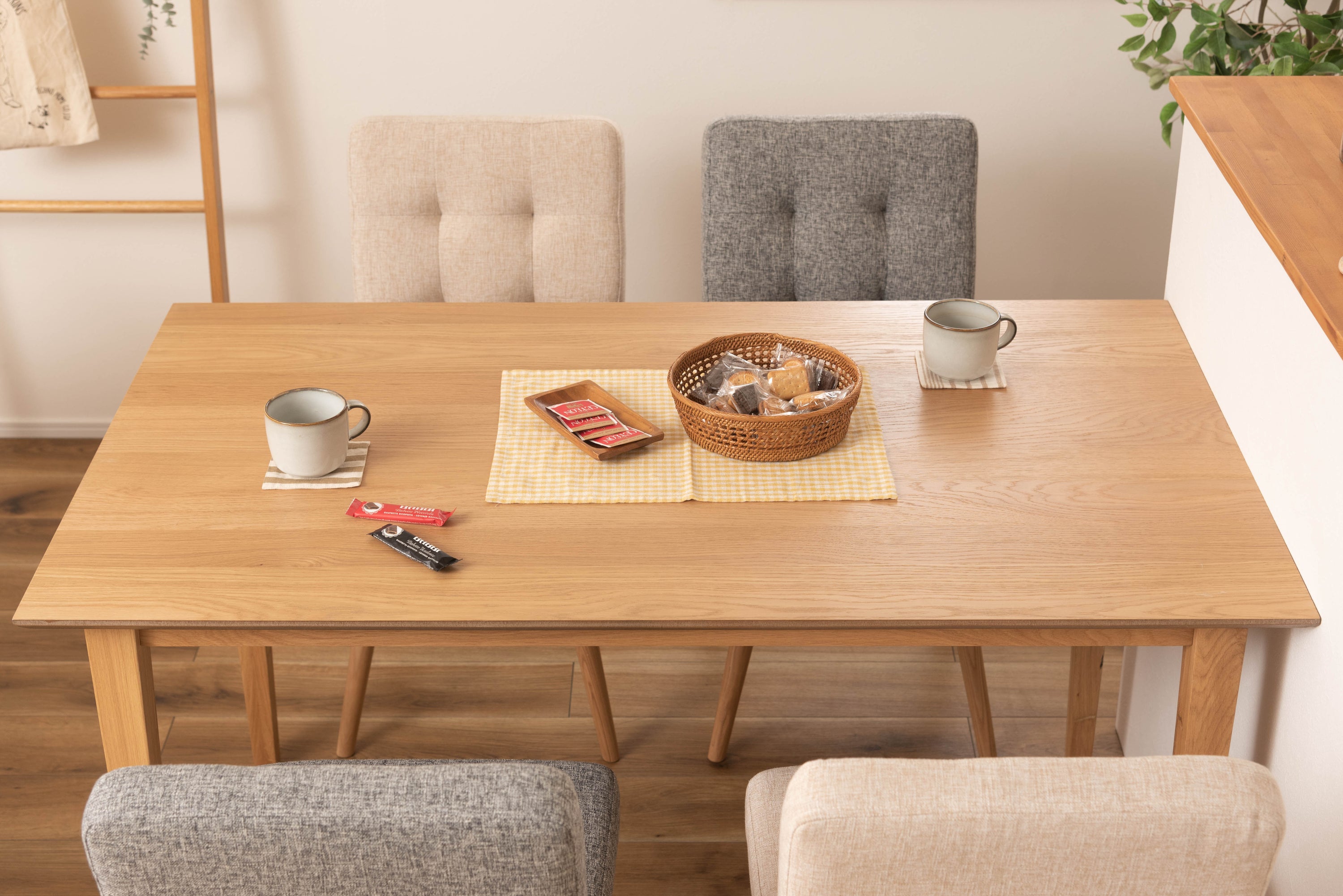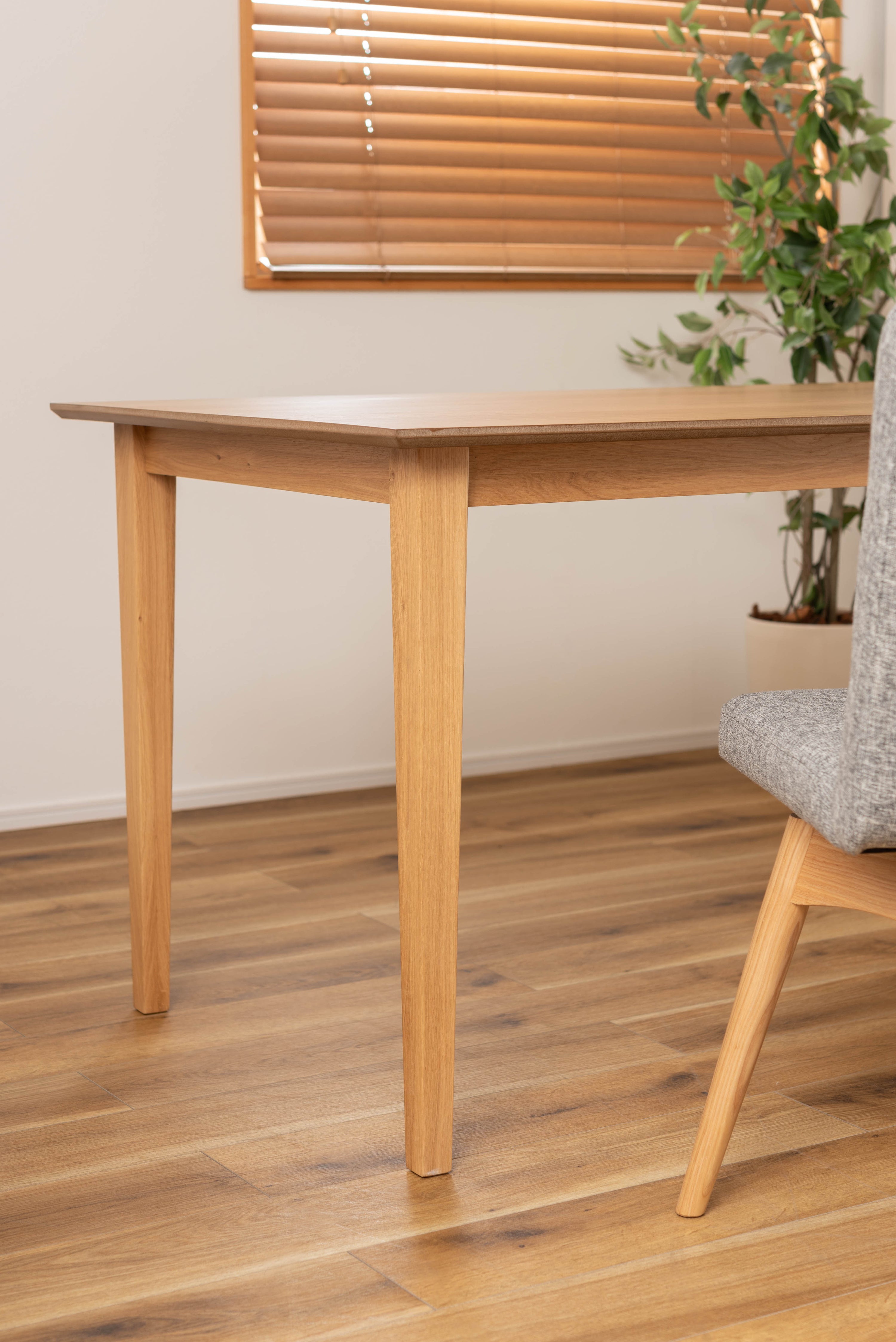 ホワイトオークの木目を活かした、シンプルなデザインのダイニングテーブル。木目が美しいホワイトオークを使用。清楚感があり上品な色味と木目が特徴で、ナチュラル系インテリアの代表的な材として、オーク材の魅力を活かしたシンプルなデザイン。脚は天板側から床側にかけて徐々に細くなっていくテーパードレッグ。ダイニングスペースが重くなりすぎず、様々なチェアに合わせられるデザイン。天板のエッジは斜めにカットしデザイン性の高い仕上がり。サイズ展開は省スペースでも使いやすい135センチと、4人で座ってもゆったりと使用できる150センチの2種類からお選びいただけます。木目の表情を活かした天板が食卓に彩りを与えてくれます。