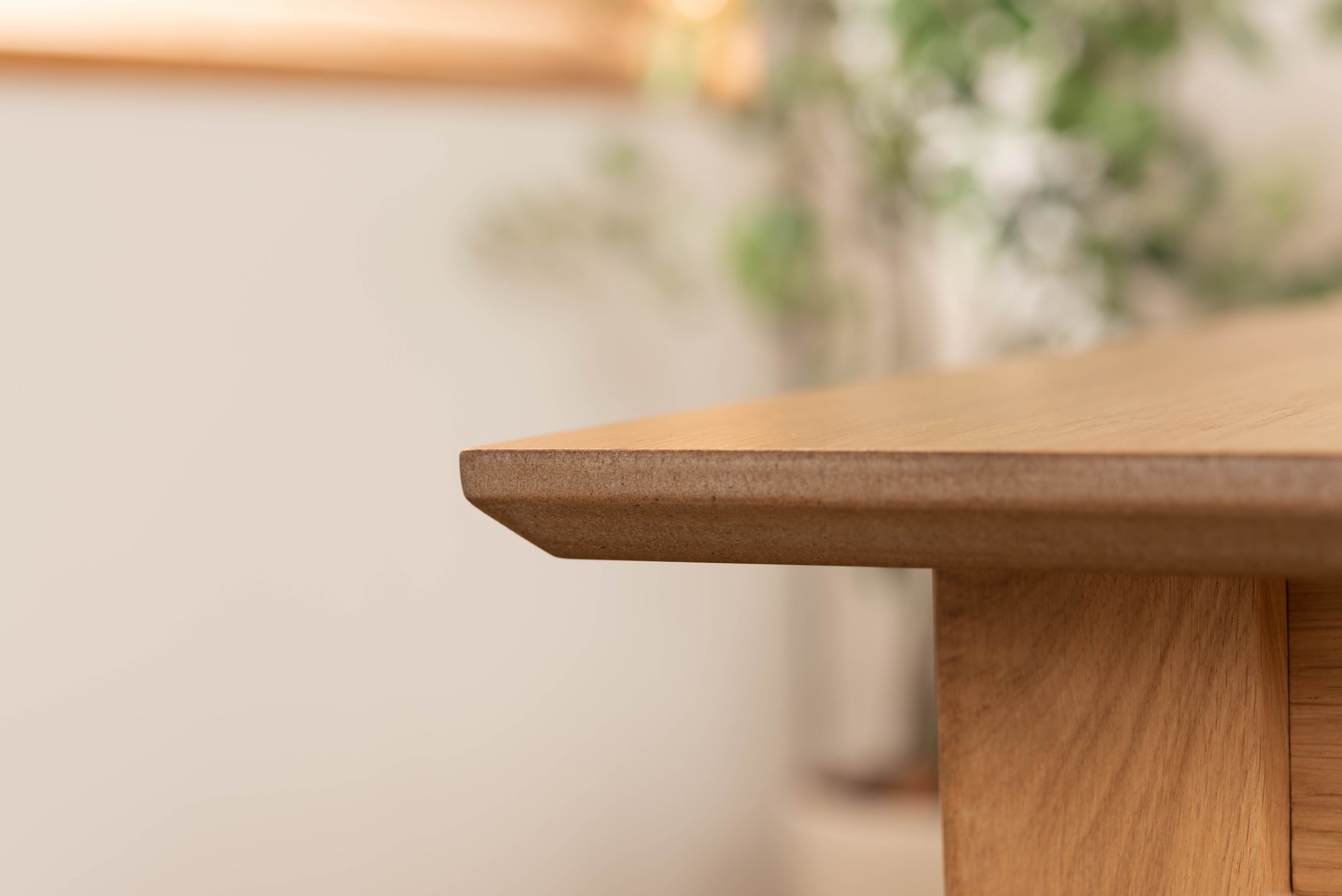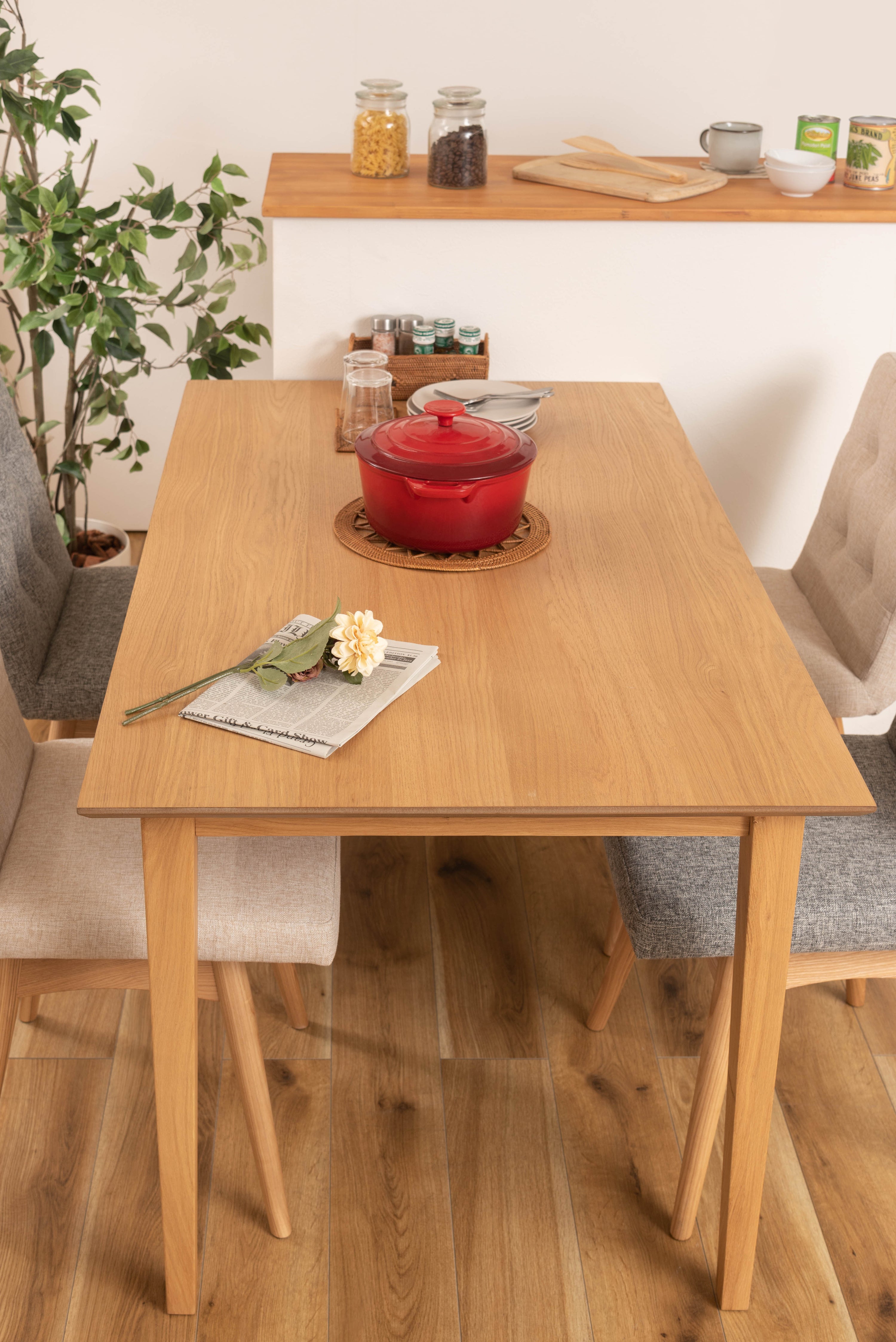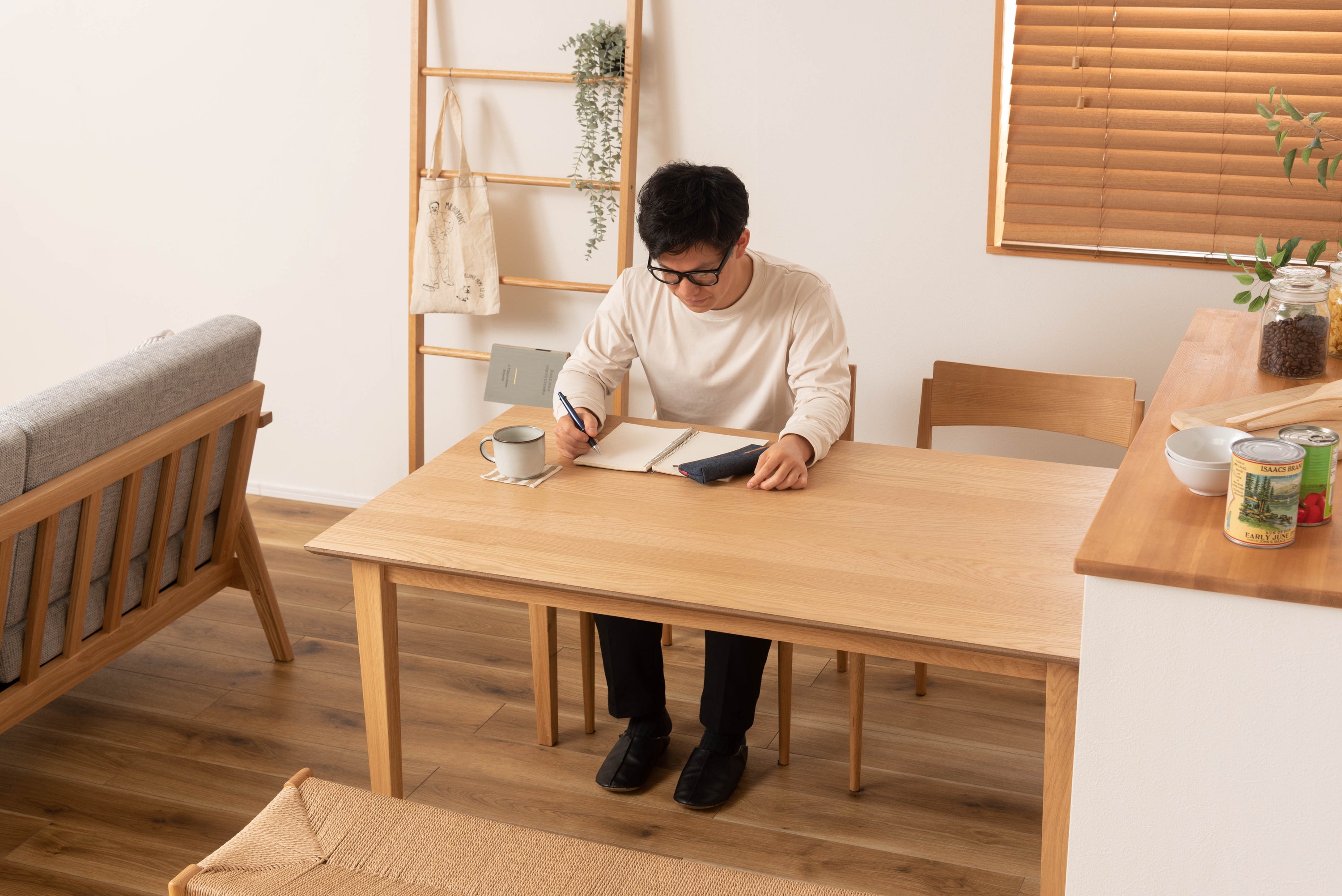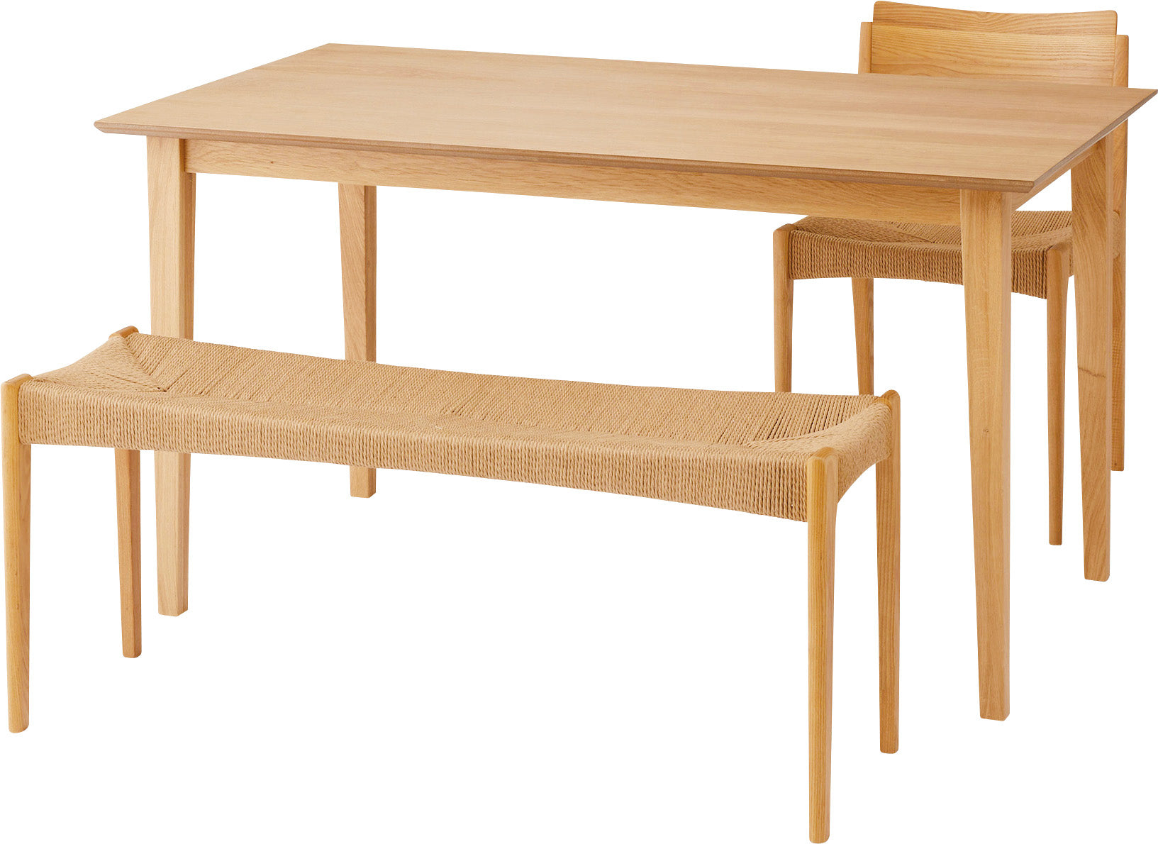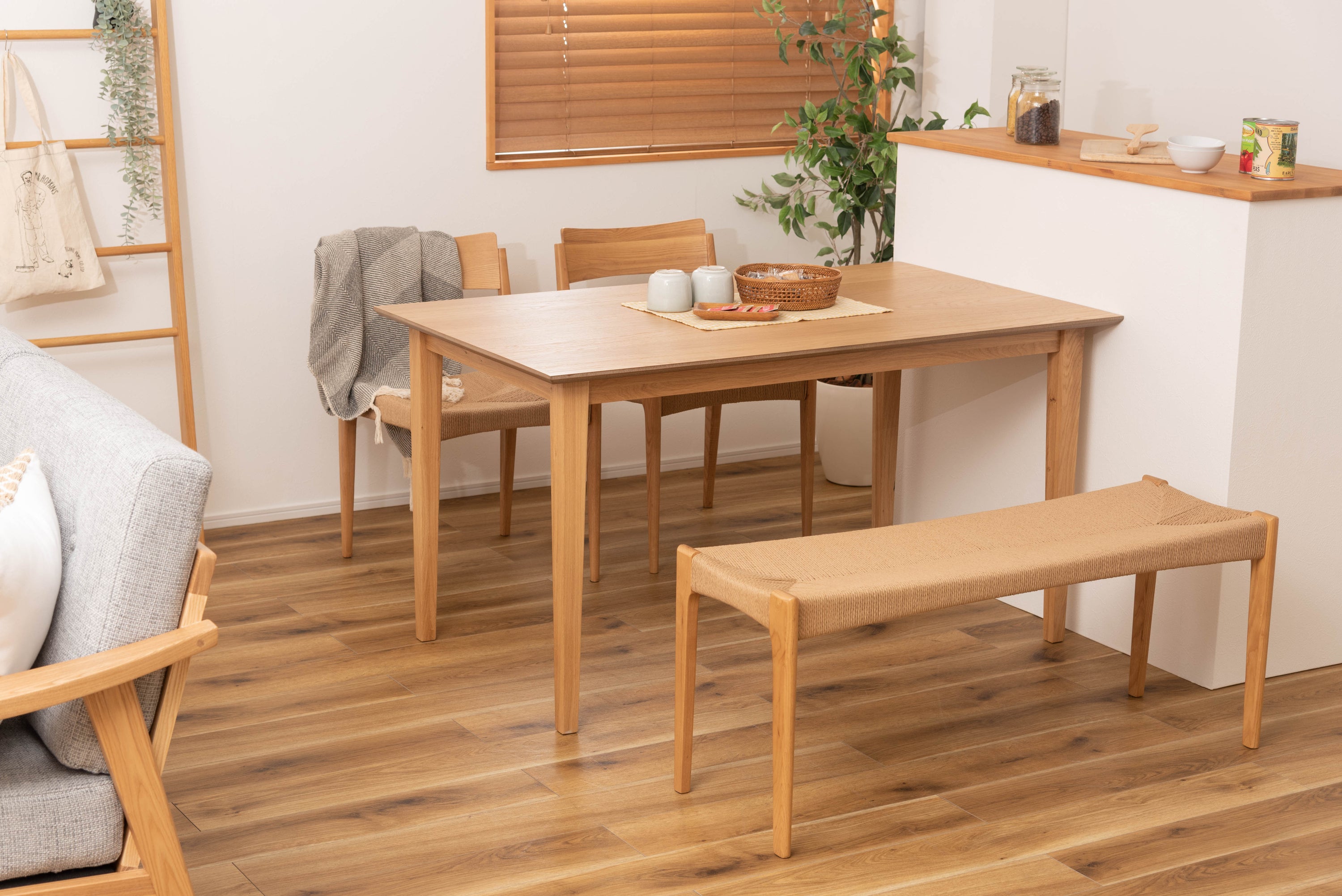 ホワイトオークの木目を活かした、シンプルなデザインのダイニングテーブル。木目が美しいホワイトオークを使用。清楚感があり上品な色味と木目が特徴で、ナチュラル系インテリアの代表的な材として、オーク材の魅力を活かしたシンプルなデザイン。脚は天板側から床側にかけて徐々に細くなっていくテーパードレッグ。ダイニングスペースが重くなりすぎず、様々なチェアに合わせられるデザイン。天板のエッジは斜めにカットしデザイン性の高い仕上がり。サイズ展開は省スペースでも使いやすい135センチと、4人で座ってもゆったりと使用できる150センチの2種類からお選びいただけます。木目の表情を活かした天板が食卓に彩りを与えてくれます。