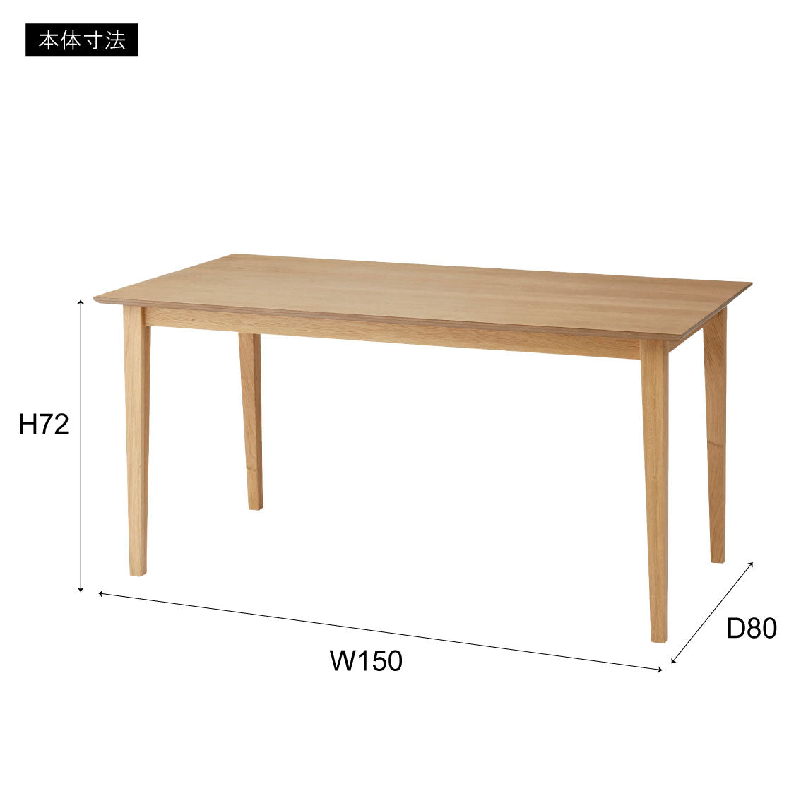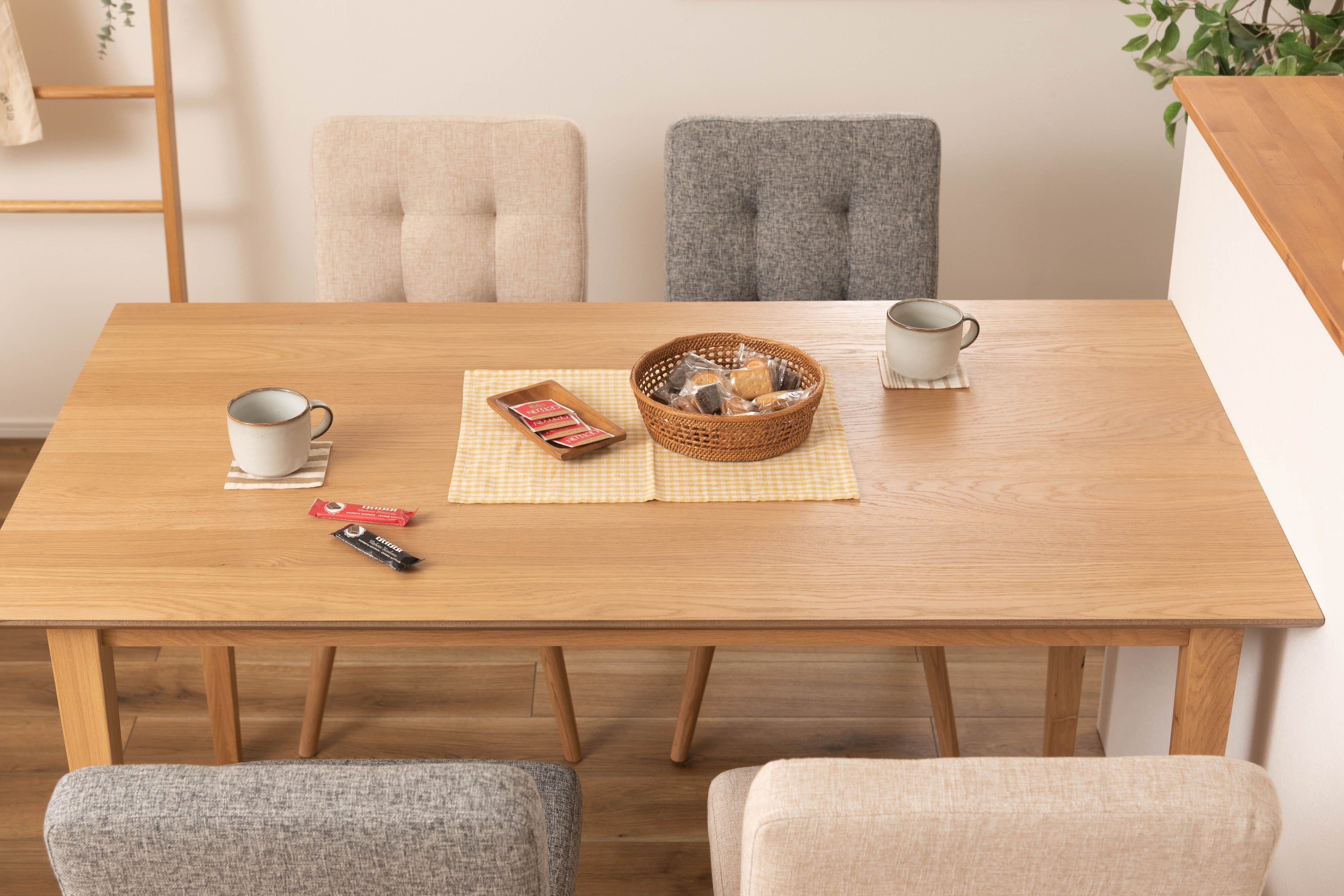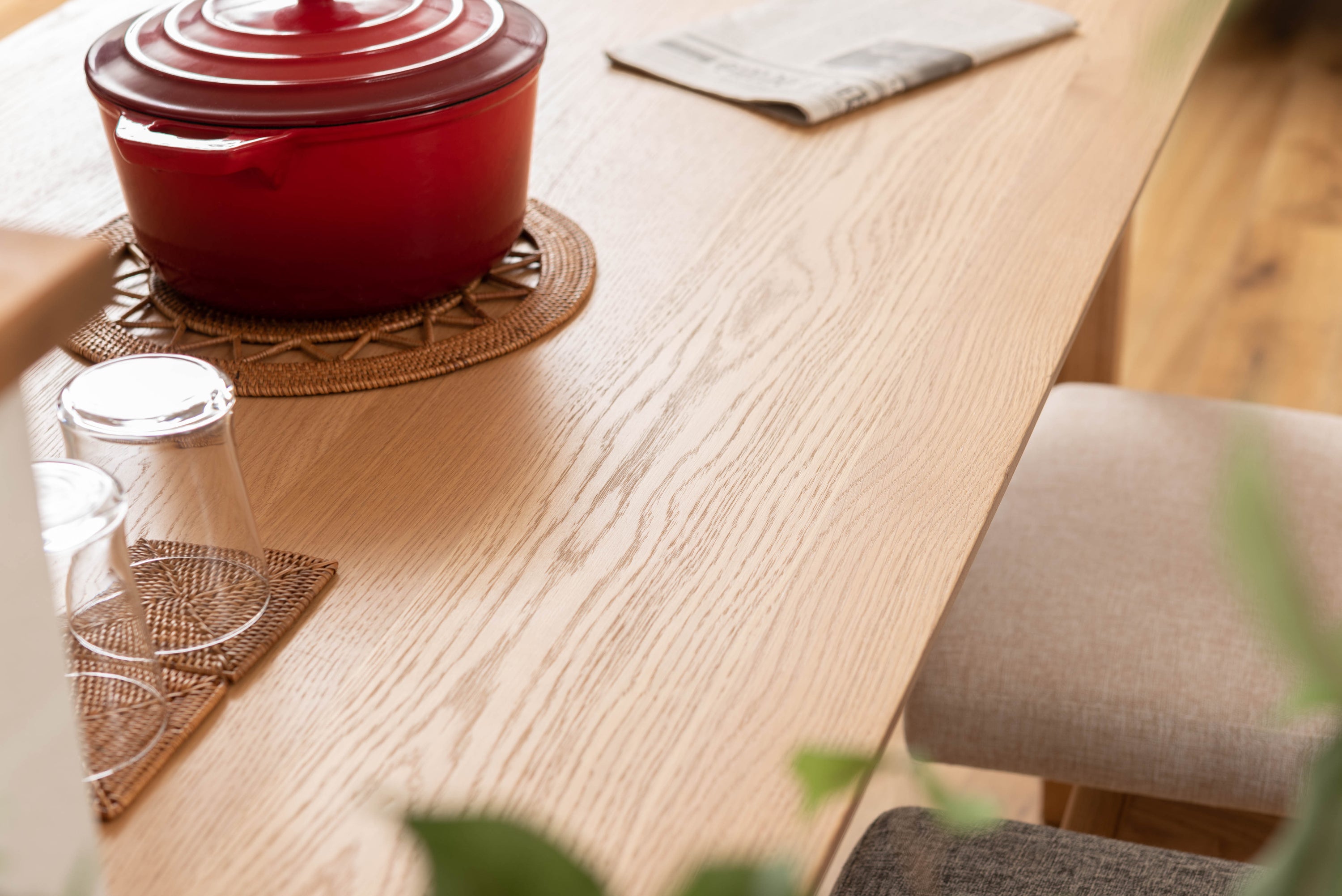 ホワイトオークの木目を活かした、シンプルなデザインのダイニングテーブル。木目が美しいホワイトオークを使用。清楚感があり上品な色味と木目が特徴で、ナチュラル系インテリアの代表的な材として、オーク材の魅力を活かしたシンプルなデザイン。脚は天板側から床側にかけて徐々に細くなっていくテーパードレッグ。ダイニングスペースが重くなりすぎず、様々なチェアに合わせられるデザイン。天板のエッジは斜めにカットしデザイン性の高い仕上がり。サイズ展開は省スペースでも使いやすい135センチと、4人で座ってもゆったりと使用できる150センチの2種類からお選びいただけます。木目の表情を活かした天板が食卓に彩りを与えてくれます。