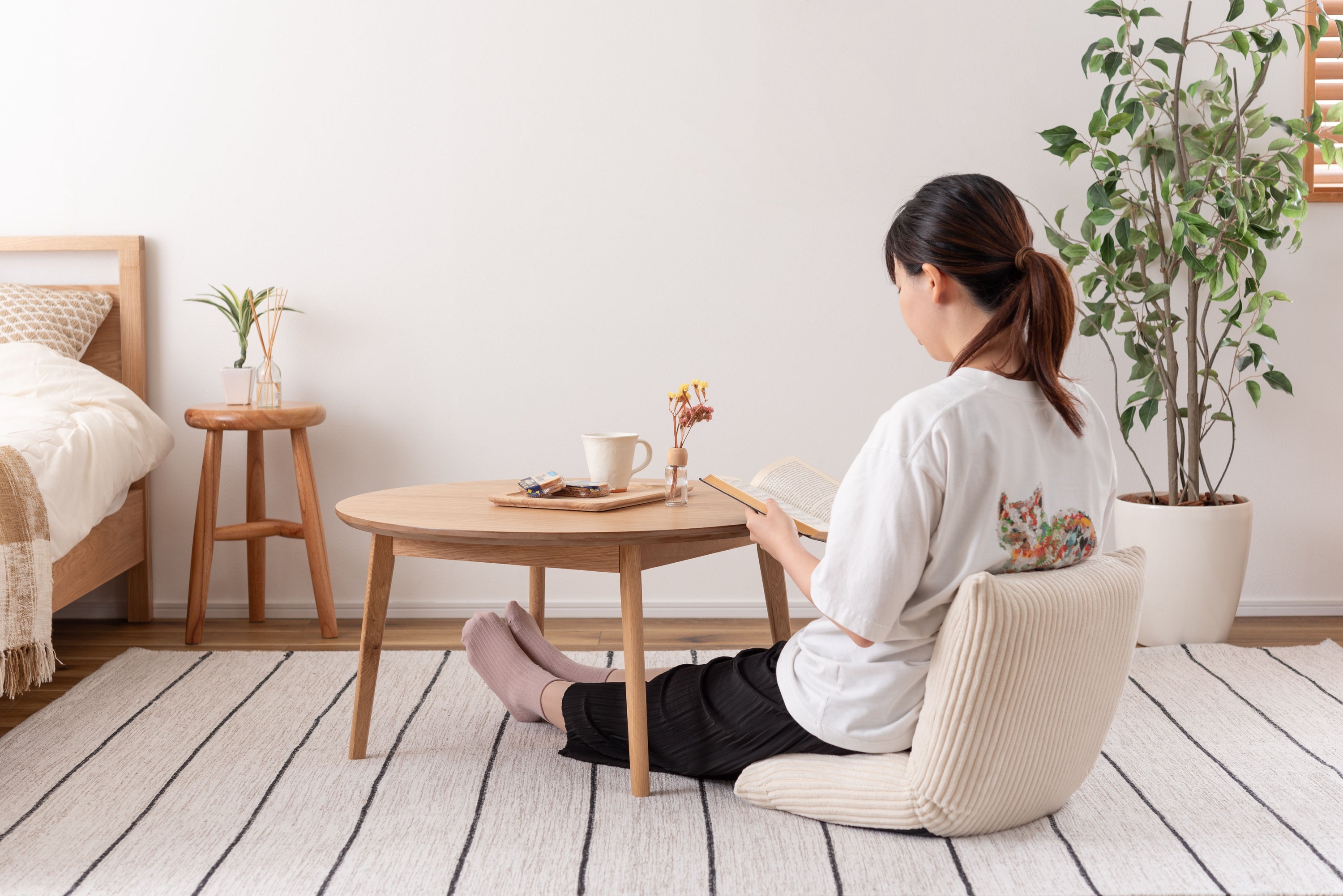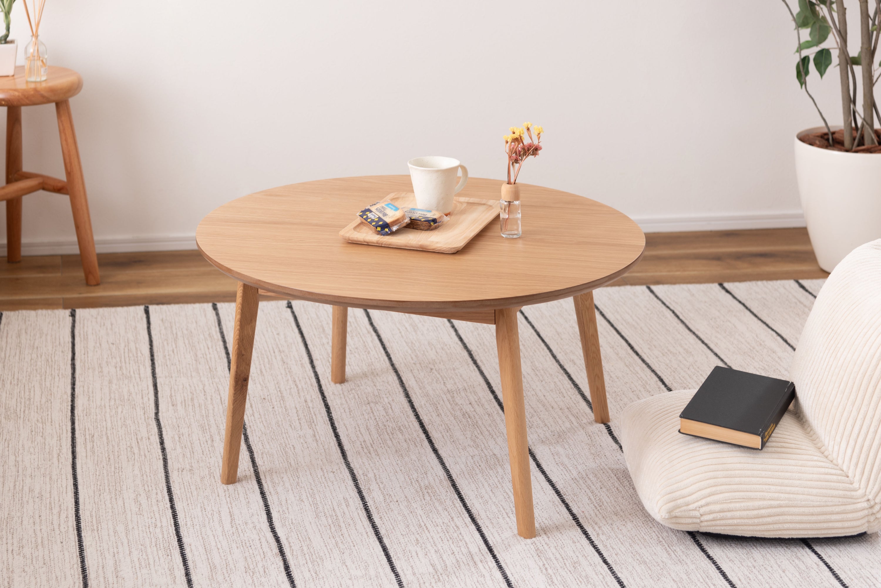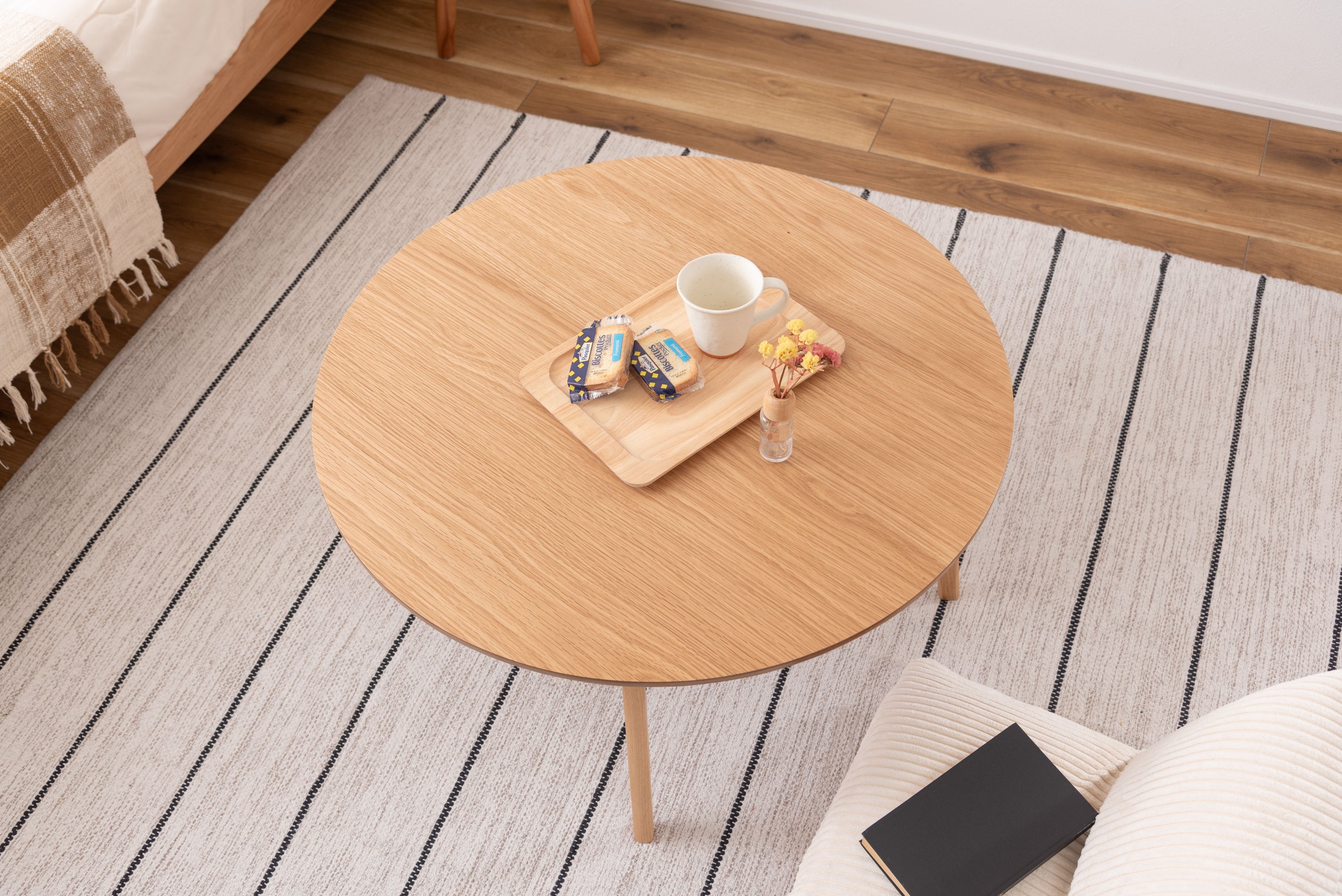 シンプルで使いやすいラウンドテーブル 角がなくどこからでも座ることのできる丸い形は、おしゃれなローテーブルとしてぴったり。1人で使用しても2人以上で使用しても余裕のある天板の大きさです。