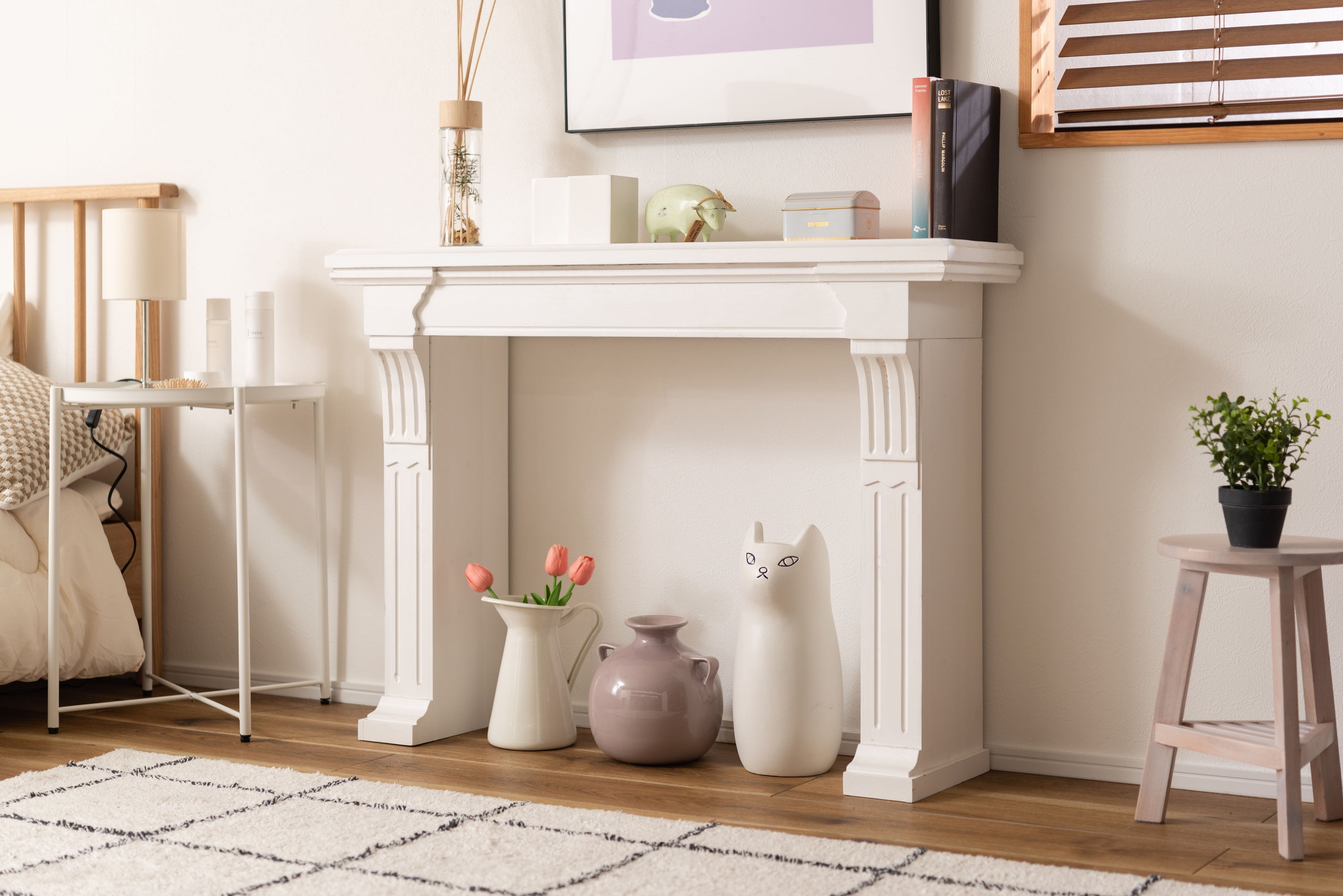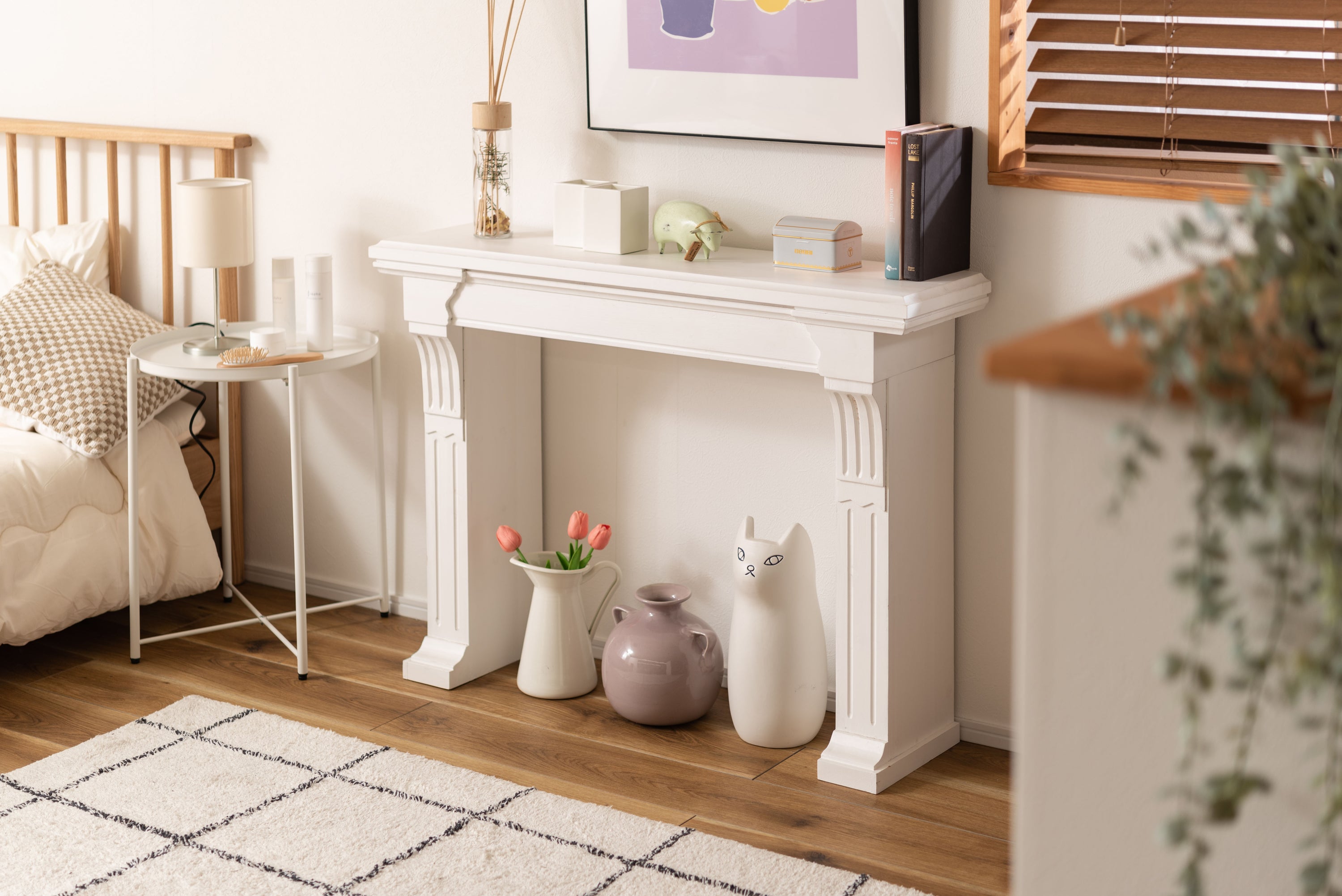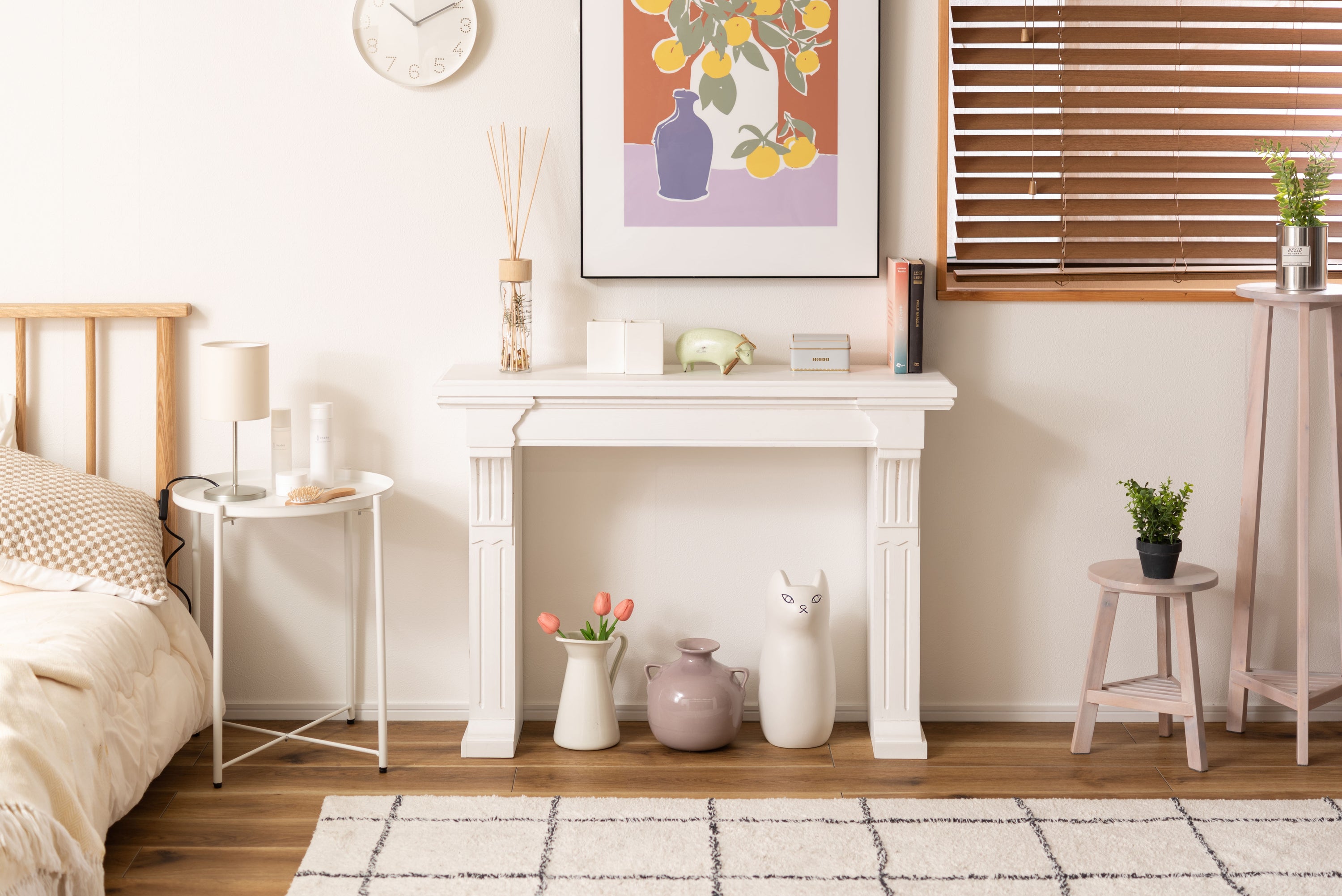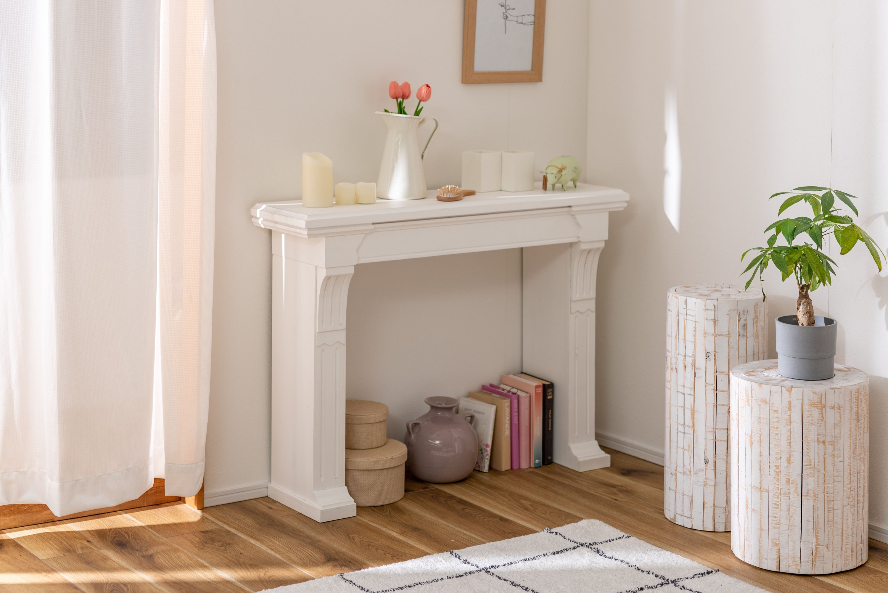 マントルピースにホワイトカラーが登場。細部までこだわった装飾がエレガントな空間を演出します。お部屋はもちろん、玄関先などに置いて生活感を感じさせないおしゃれな空間づくりとしても活躍します。流行の韓国インテリアとしてもおすすめです。韓国インテリアとは、ホワイト系の色を中心としたくすんだ淡色を使い、木製の家具、ファブリックアイテム、ラタン調アイテムでコーディネートされたインテリア。