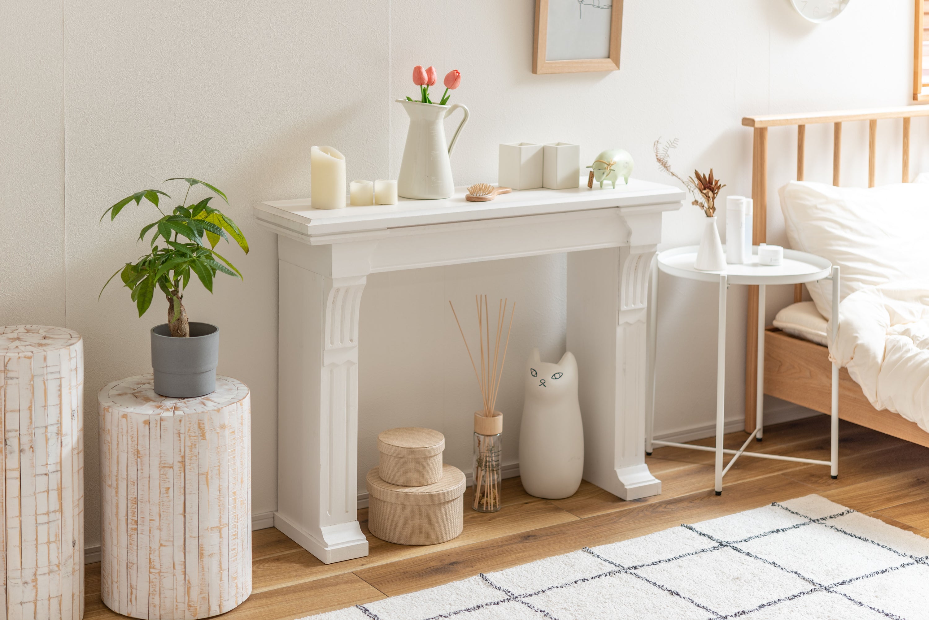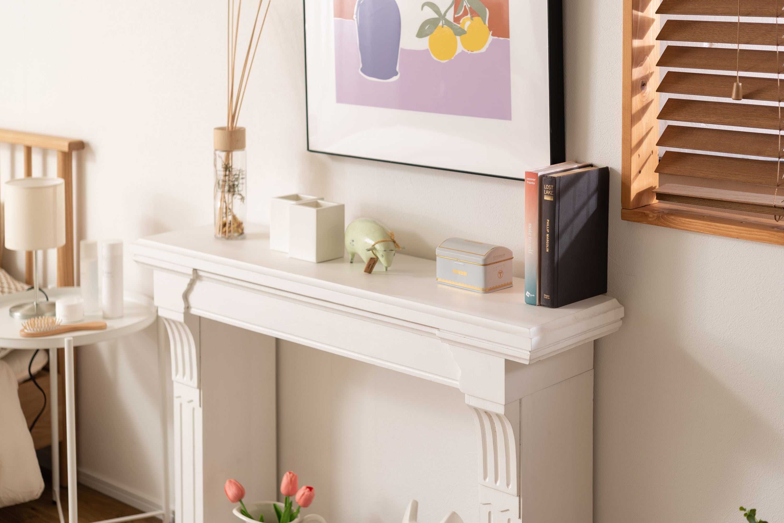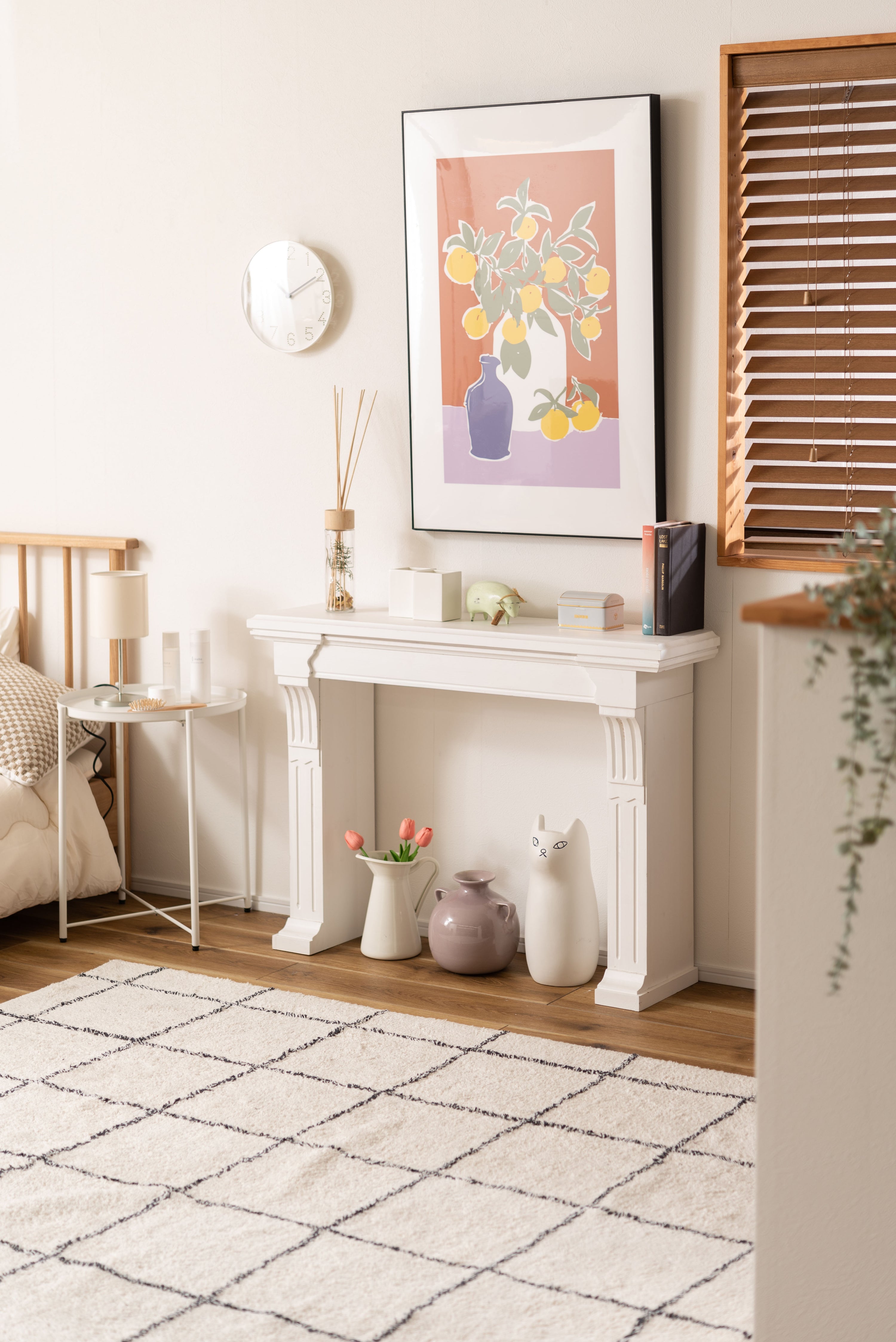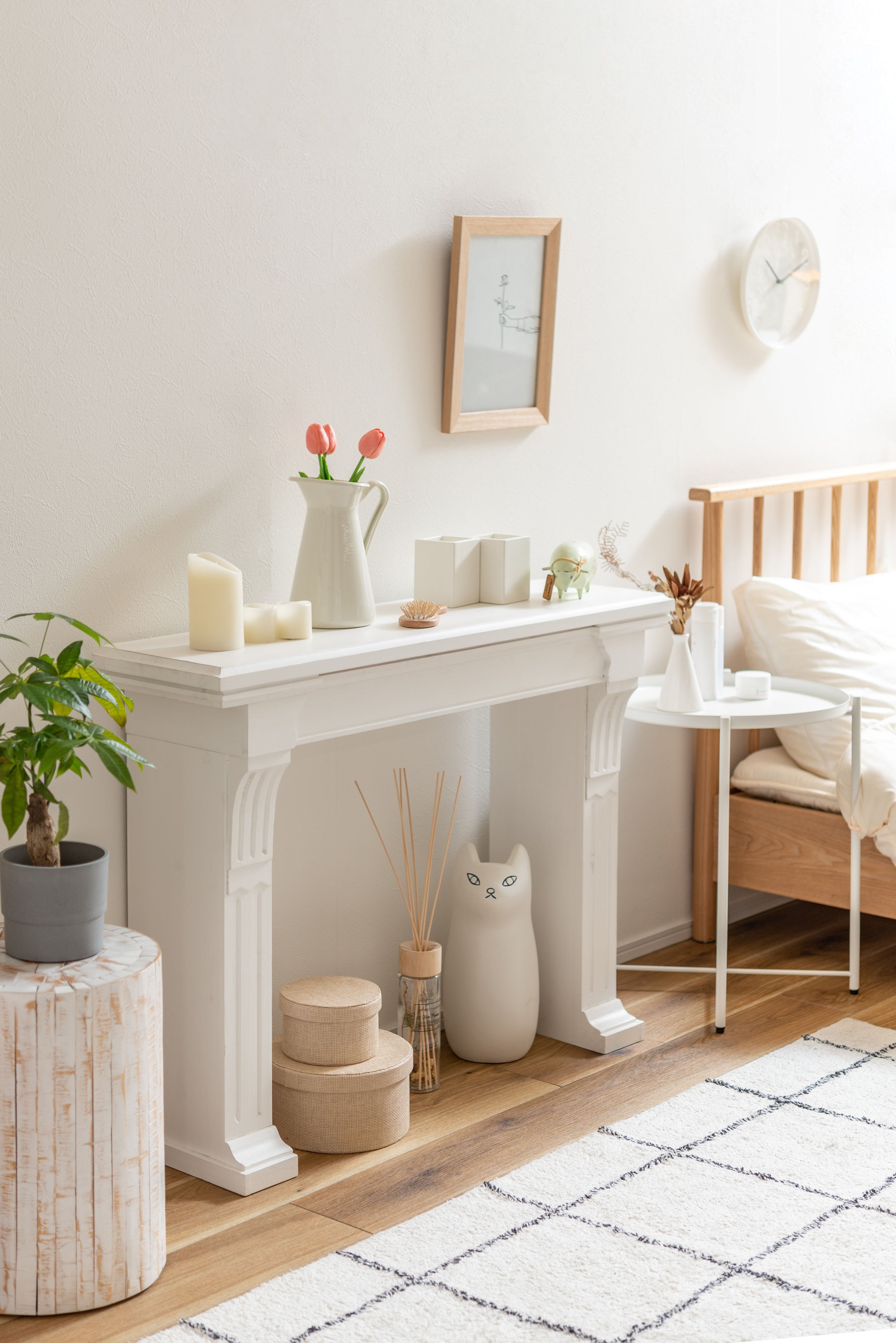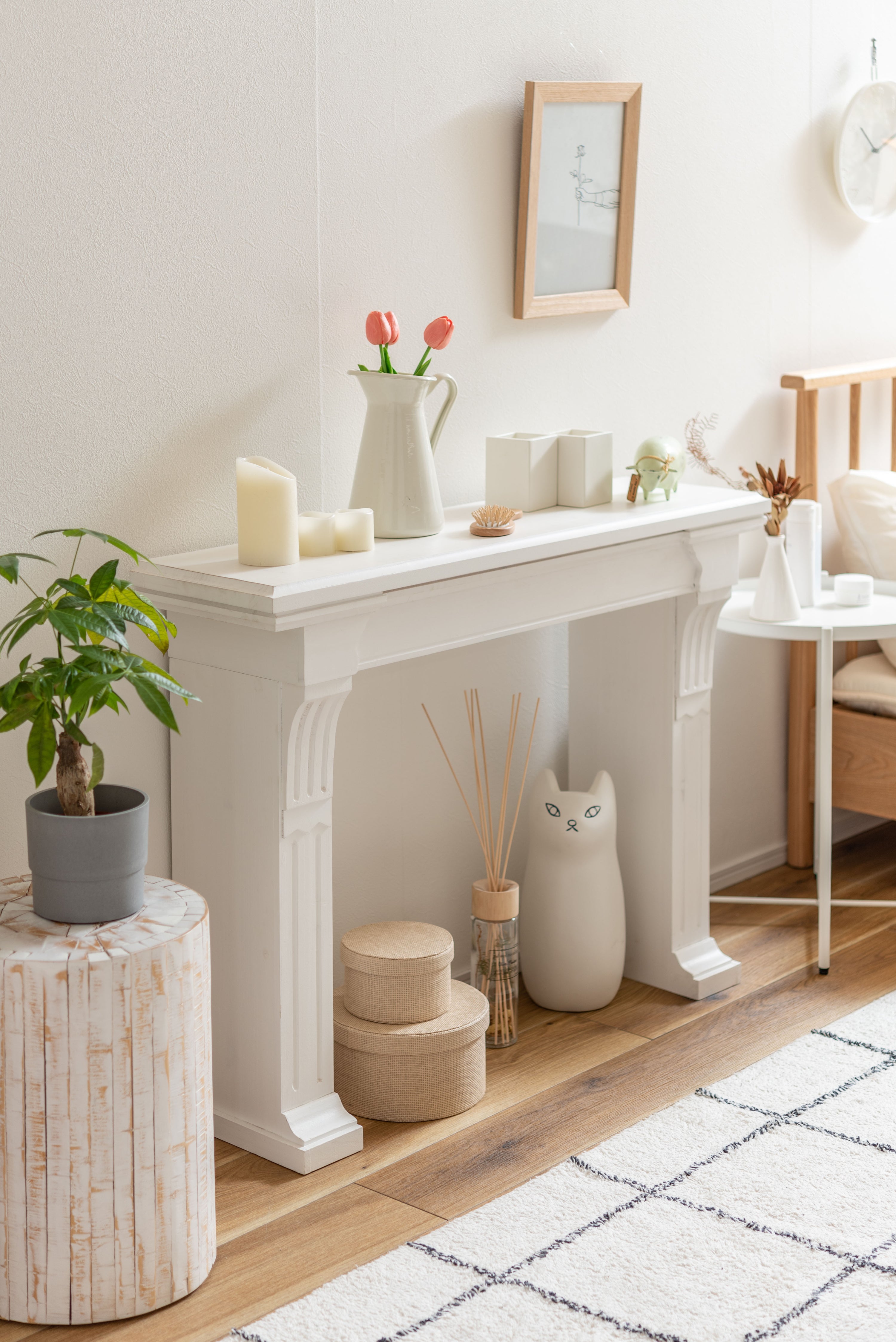 マントルピースにホワイトカラーが登場。細部までこだわった装飾がエレガントな空間を演出します。お部屋はもちろん、玄関先などに置いて生活感を感じさせないおしゃれな空間づくりとしても活躍します。流行の韓国インテリアとしてもおすすめです。韓国インテリアとは、ホワイト系の色を中心としたくすんだ淡色を使い、木製の家具、ファブリックアイテム、ラタン調アイテムでコーディネートされたインテリア。