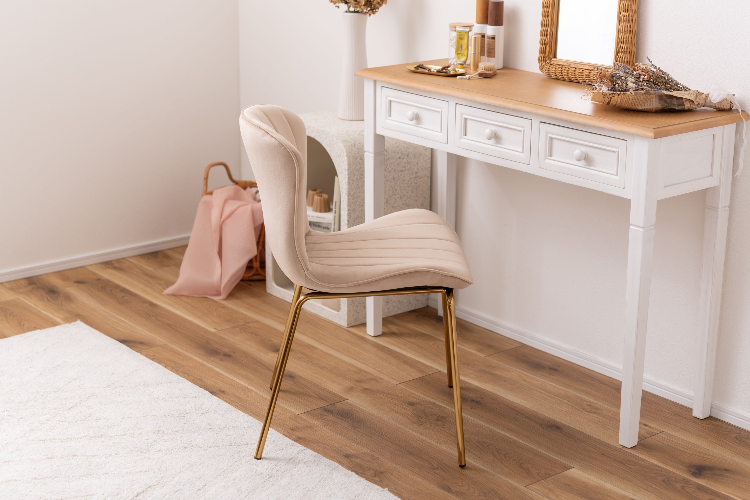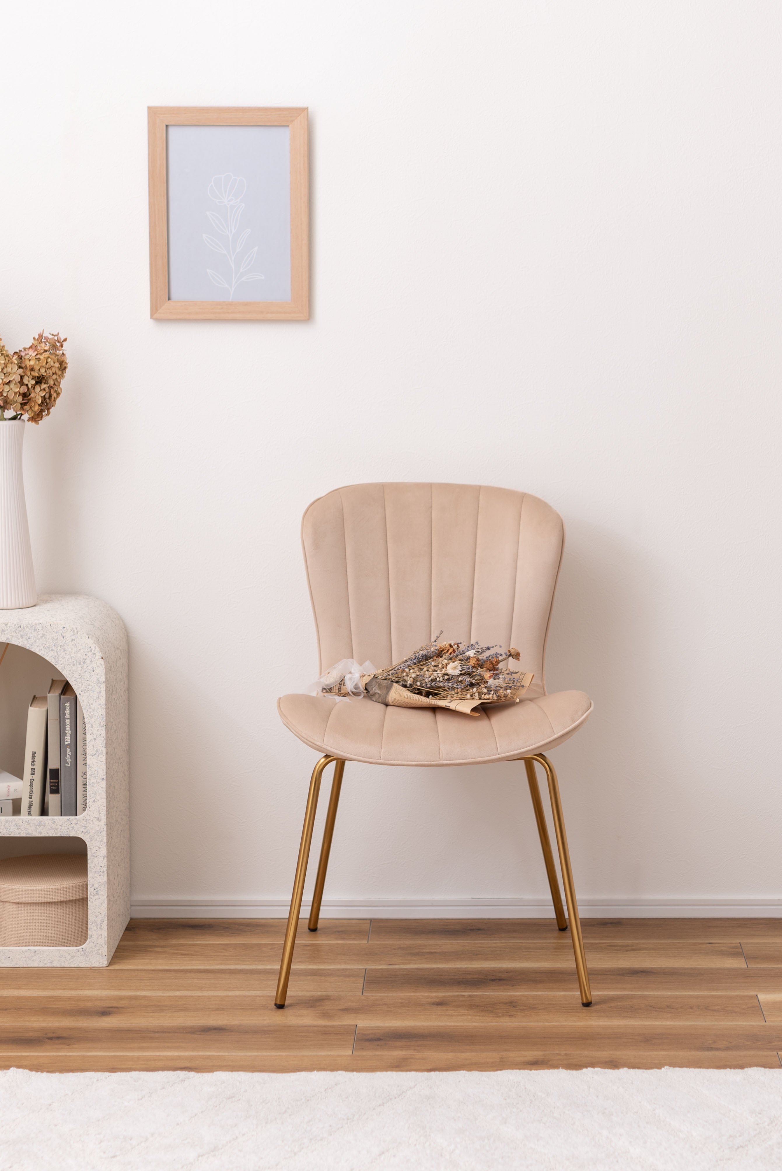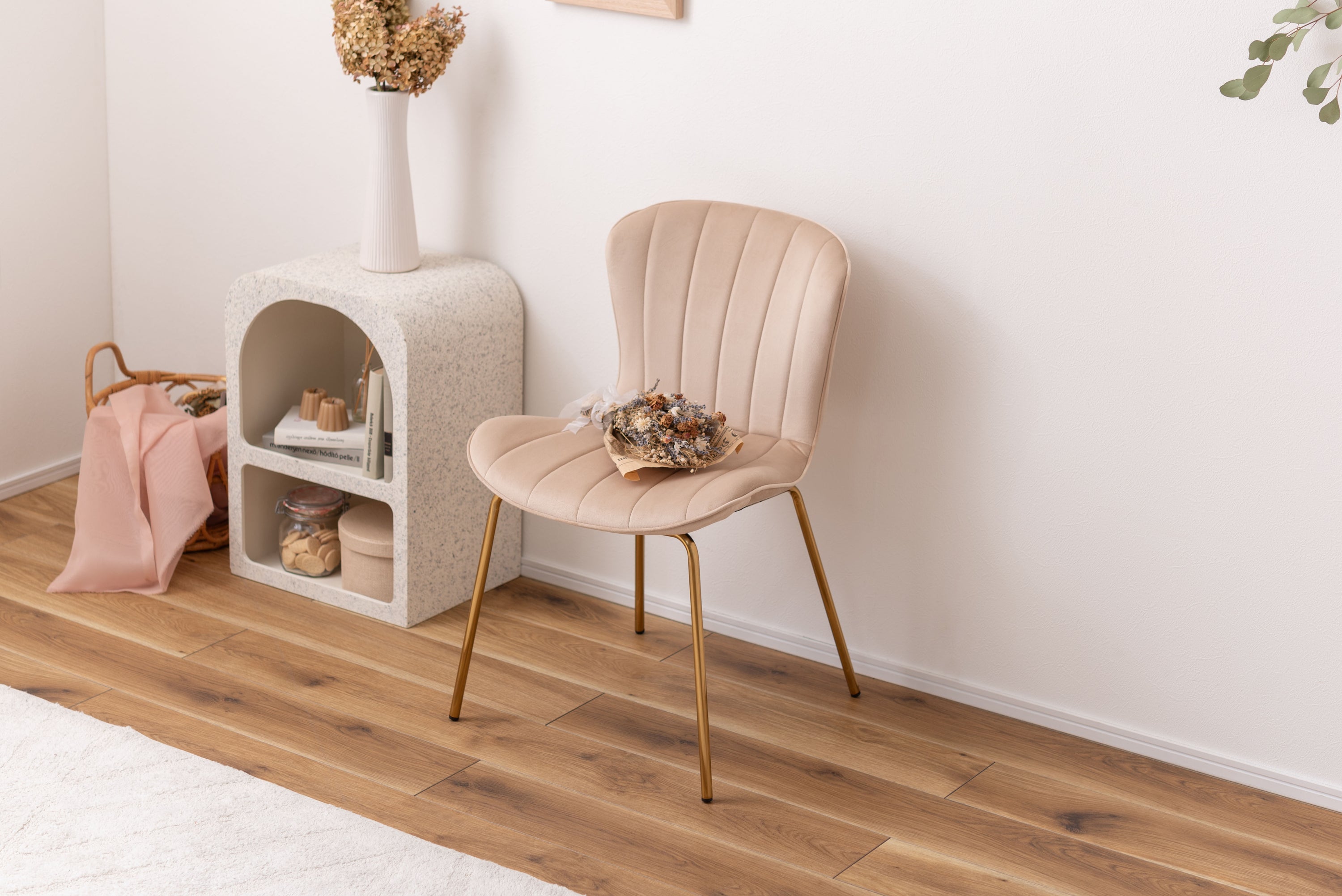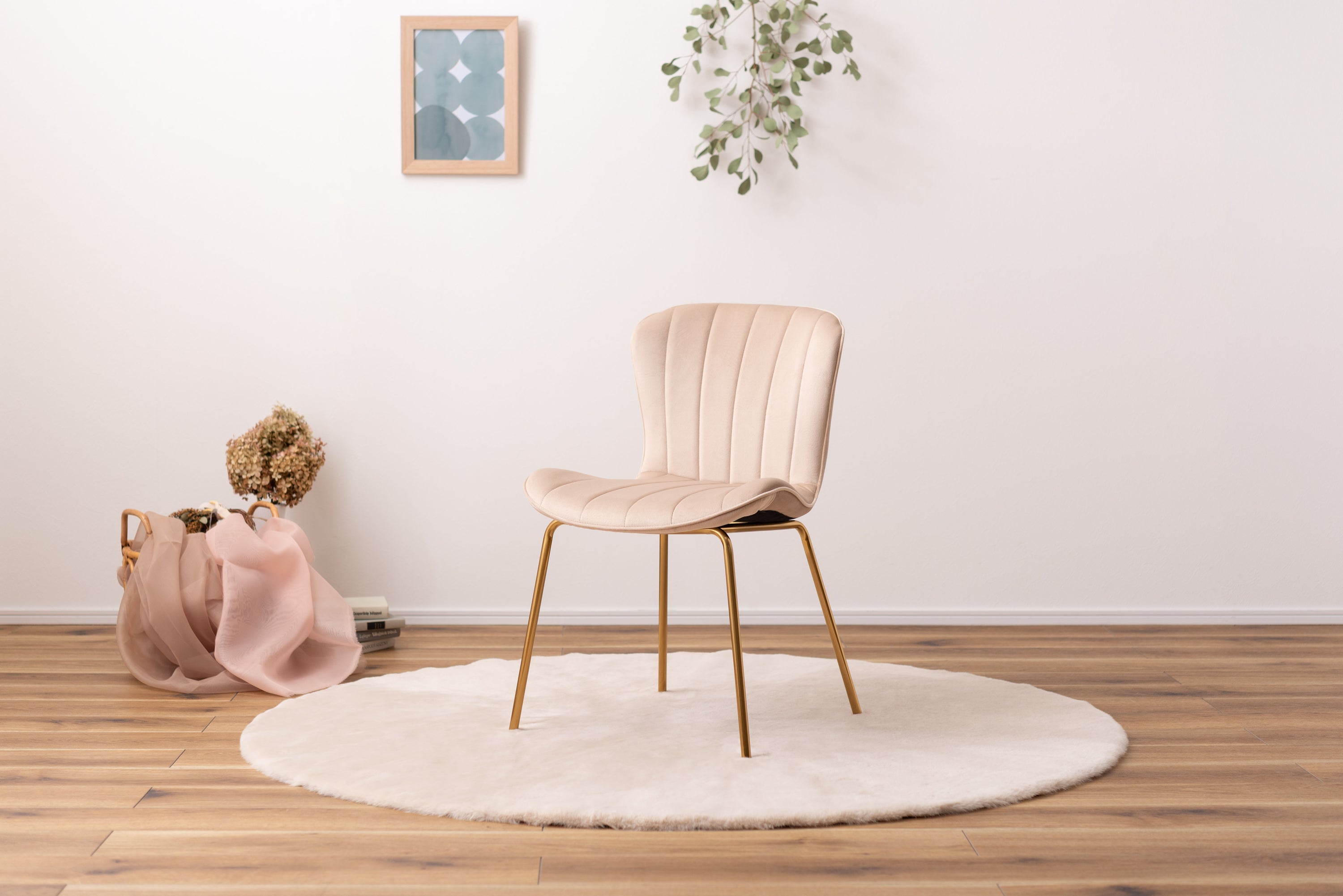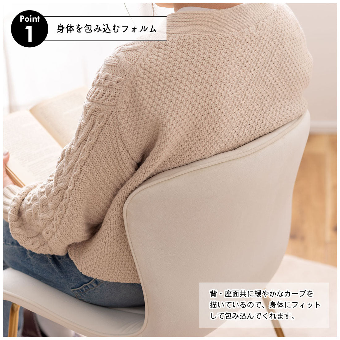 ベロア調の生地×アンティークゴールド脚の組合せが、ガーリーでトレンド感のある雰囲気を演出。身体を包み込むようなフォルムで、デザイン性にプラスして使いやすさにもとことんこだわりました。背・座面共に緩やかなカーブを描いているので、身体にフィットして包み込んでくれます。背面も座面も弾力があり、クッション性もある作りになっているので、座り心地も抜群。生地はベロア調の物を採用。程よく光沢感があり様々な表情を見せ高級感を演出。アンティークゴールドを施した細身の脚がアクセントになり、チェアのデザイン性を引き上げています。