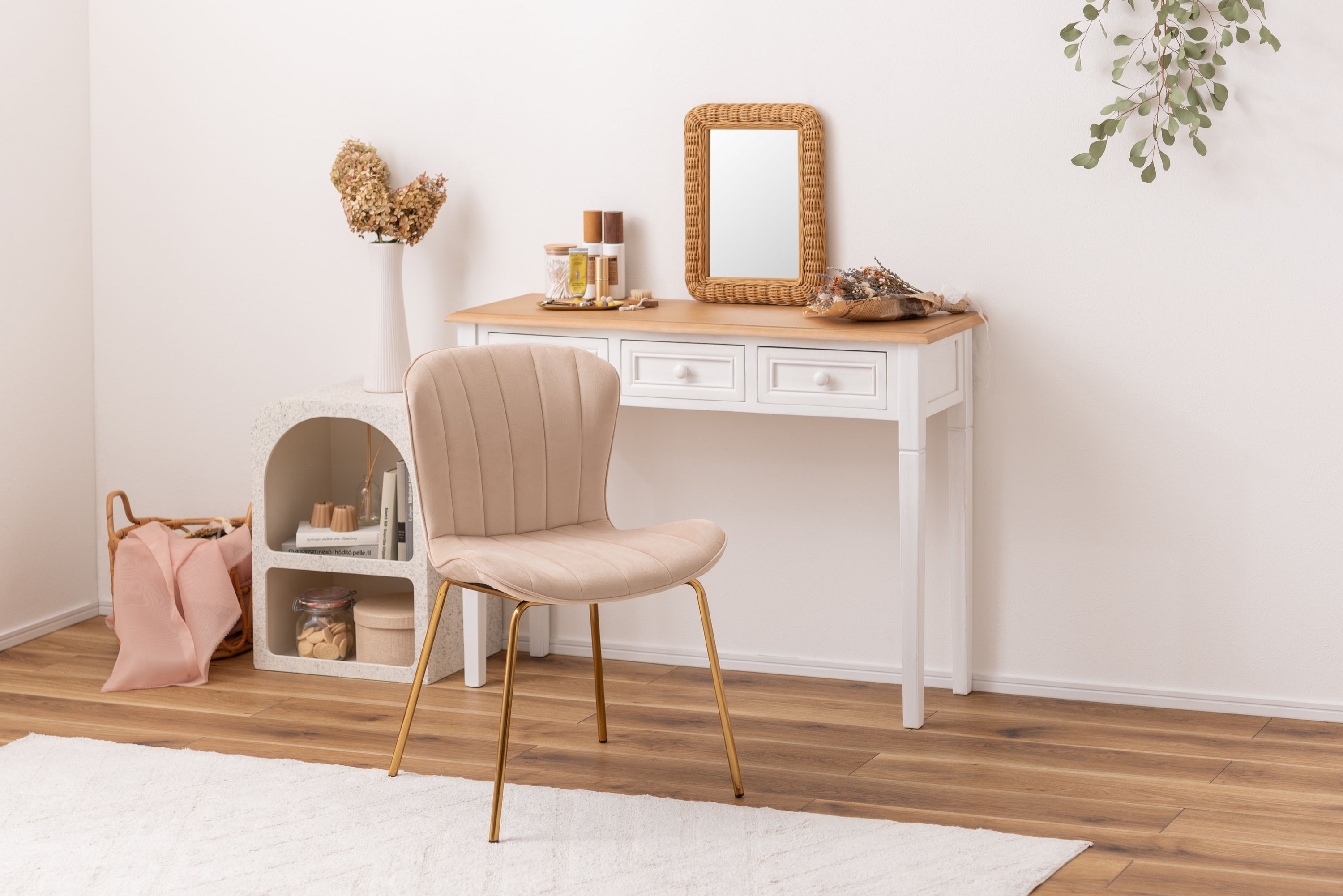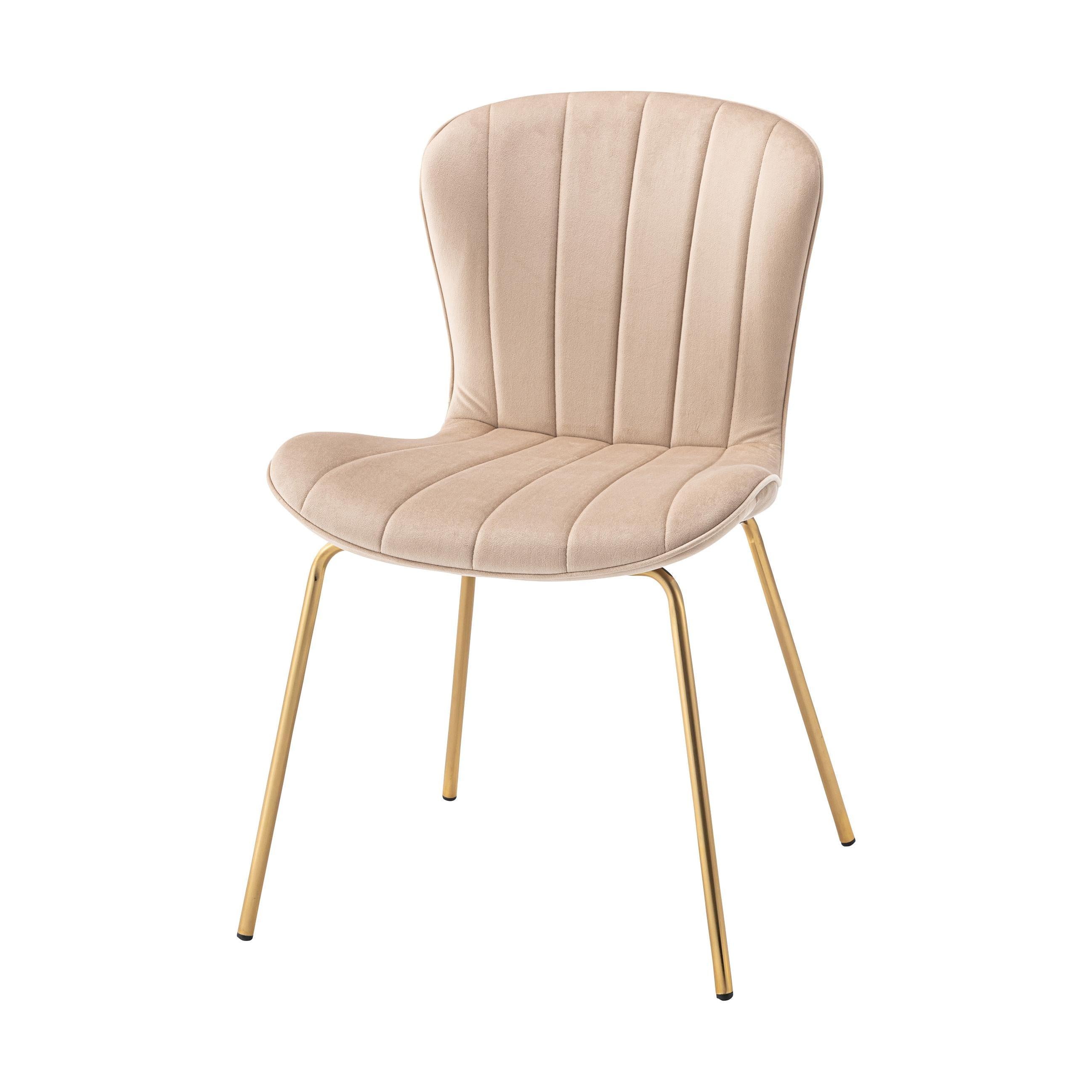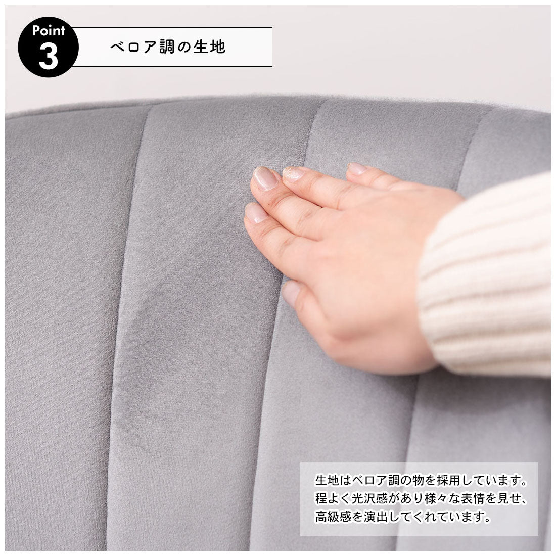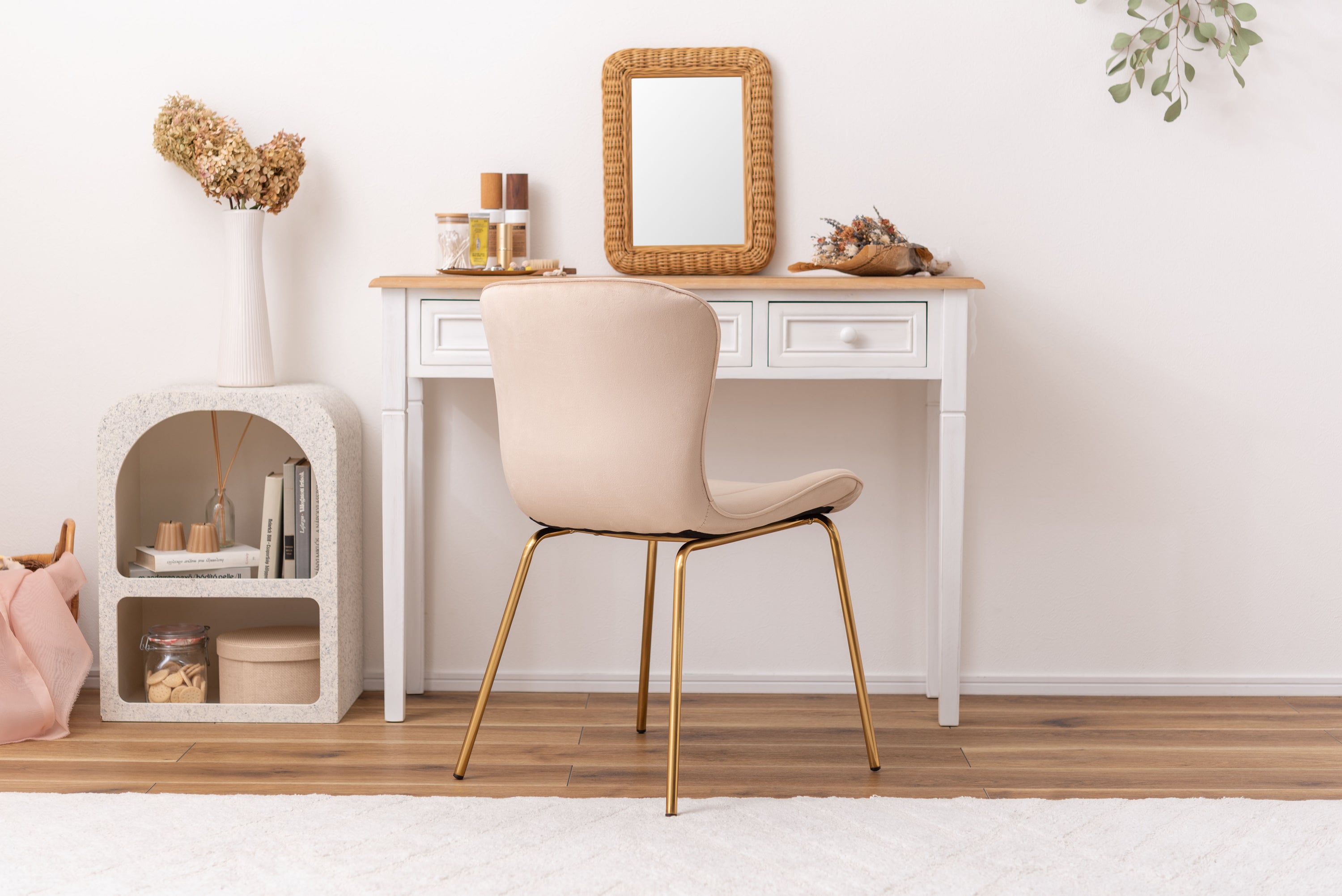 ベロア調の生地×アンティークゴールド脚の組合せが、ガーリーでトレンド感のある雰囲気を演出。身体を包み込むようなフォルムで、デザイン性にプラスして使いやすさにもとことんこだわりました。背・座面共に緩やかなカーブを描いているので、身体にフィットして包み込んでくれます。背面も座面も弾力があり、クッション性もある作りになっているので、座り心地も抜群。生地はベロア調の物を採用。程よく光沢感があり様々な表情を見せ高級感を演出。アンティークゴールドを施した細身の脚がアクセントになり、チェアのデザイン性を引き上げています。