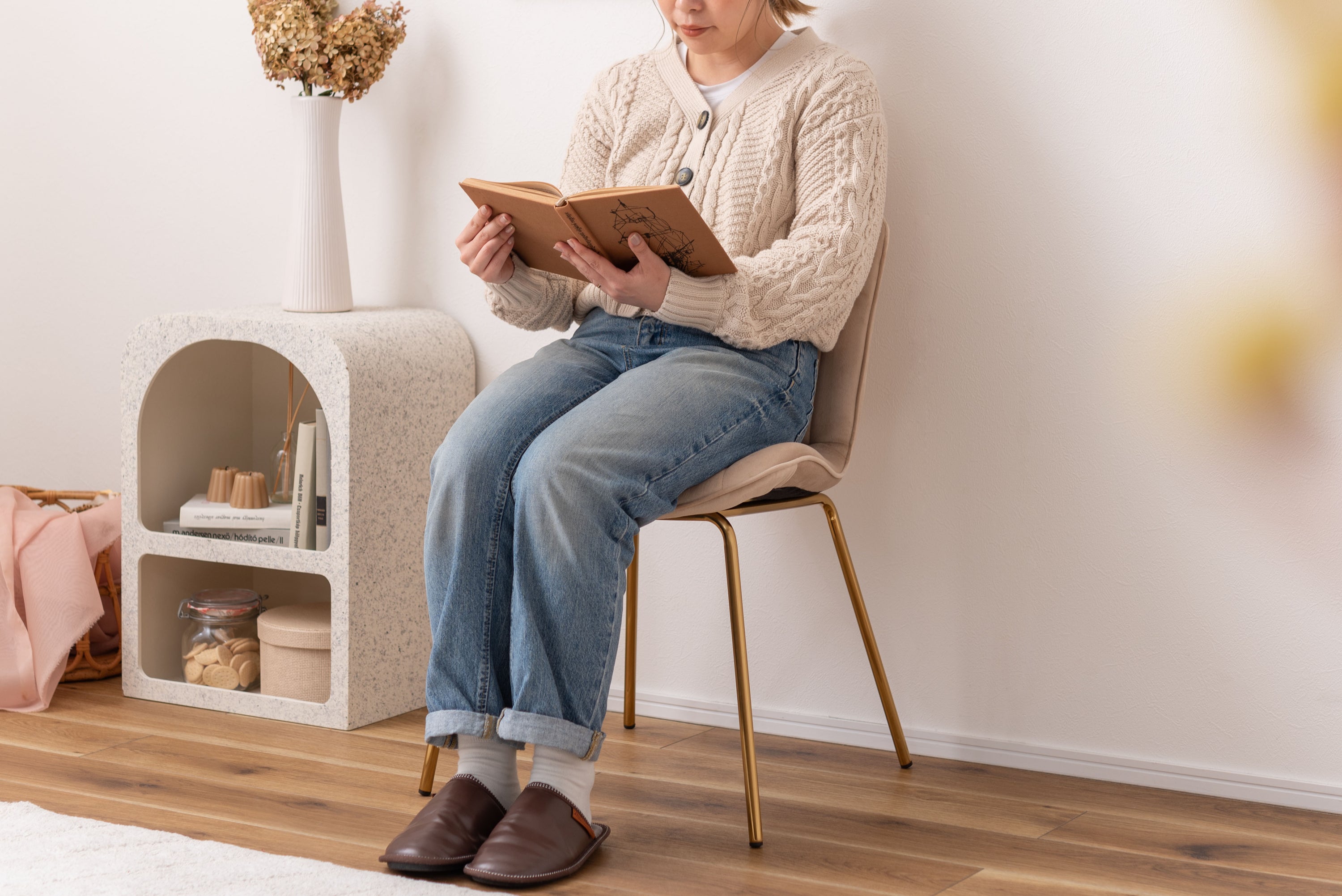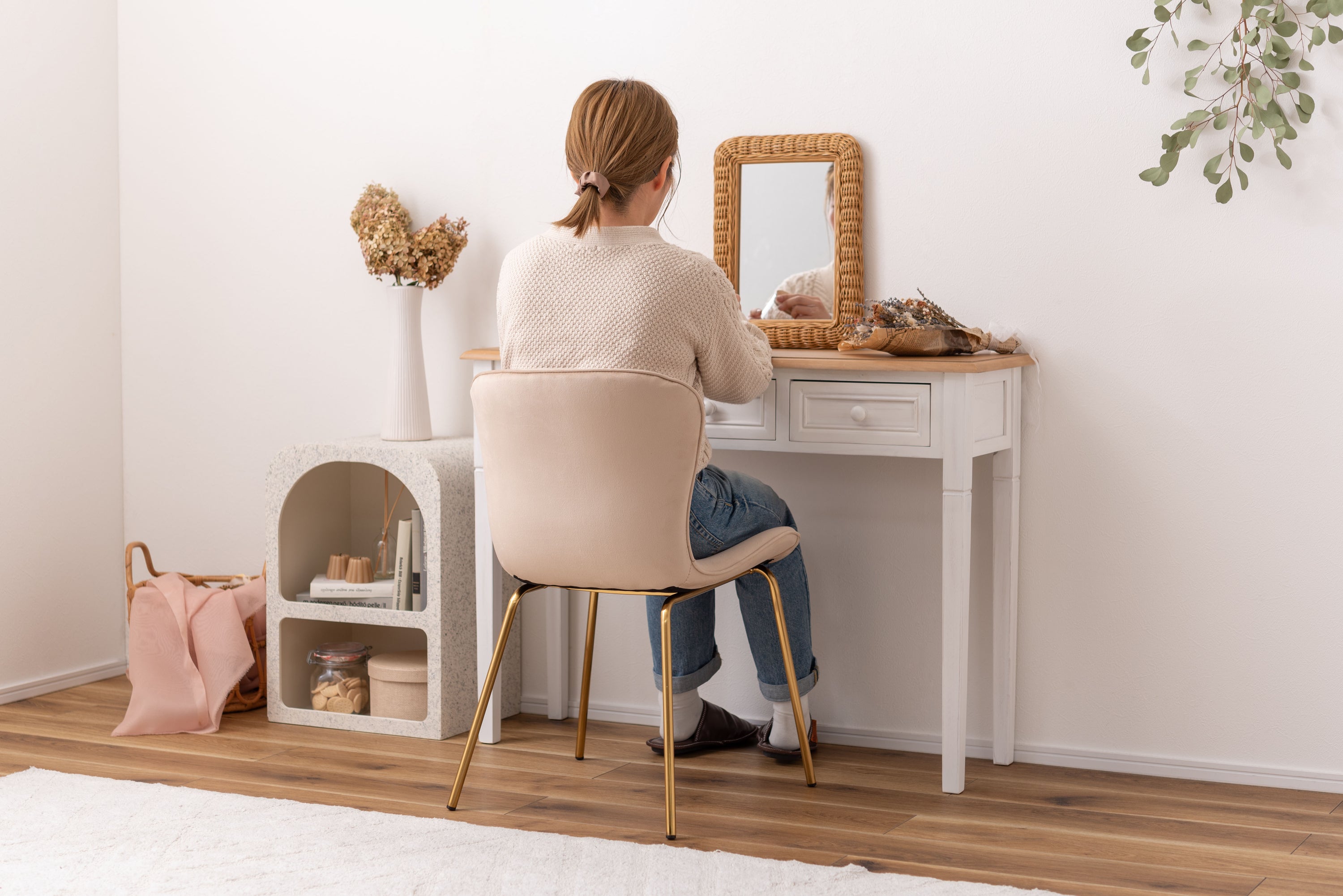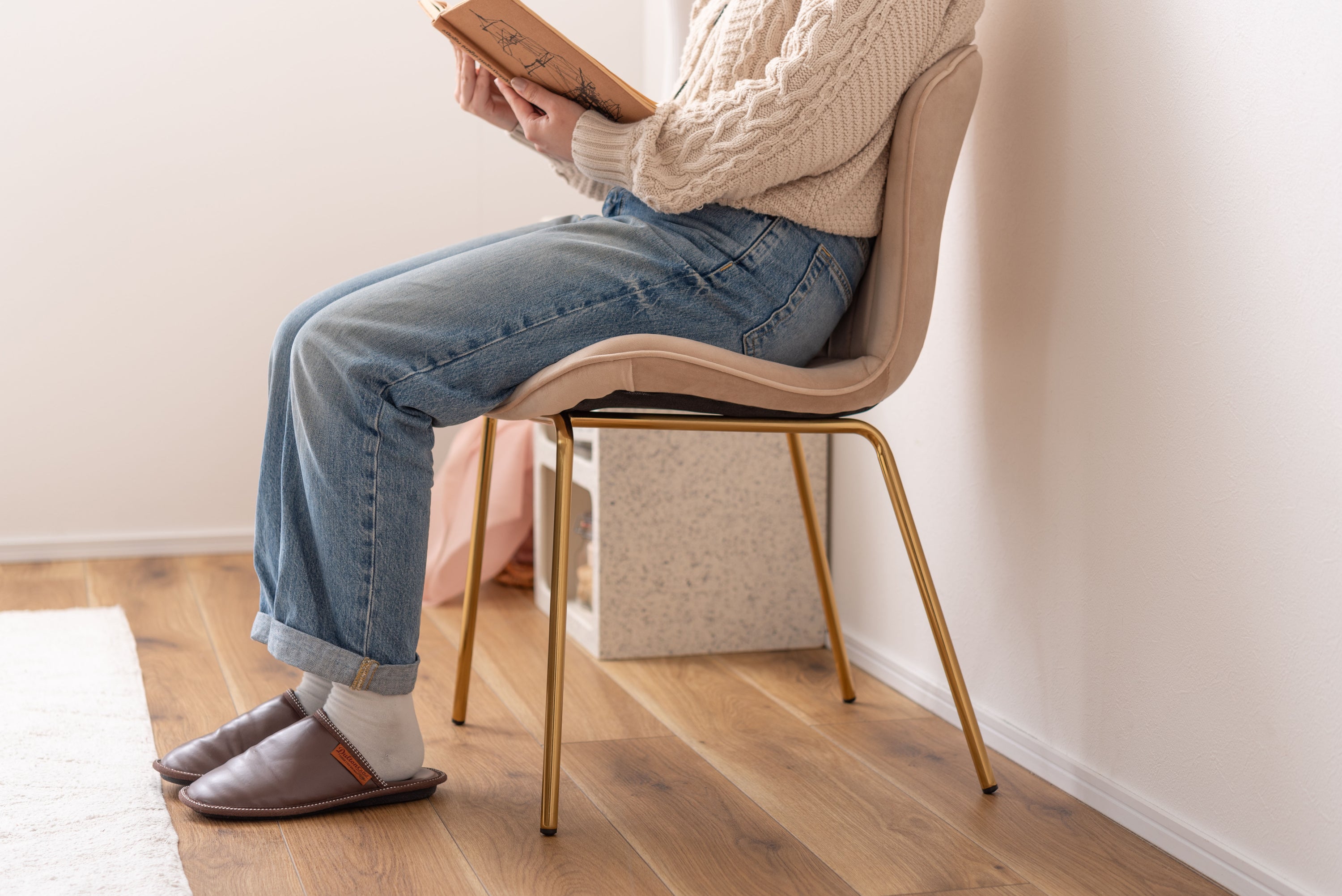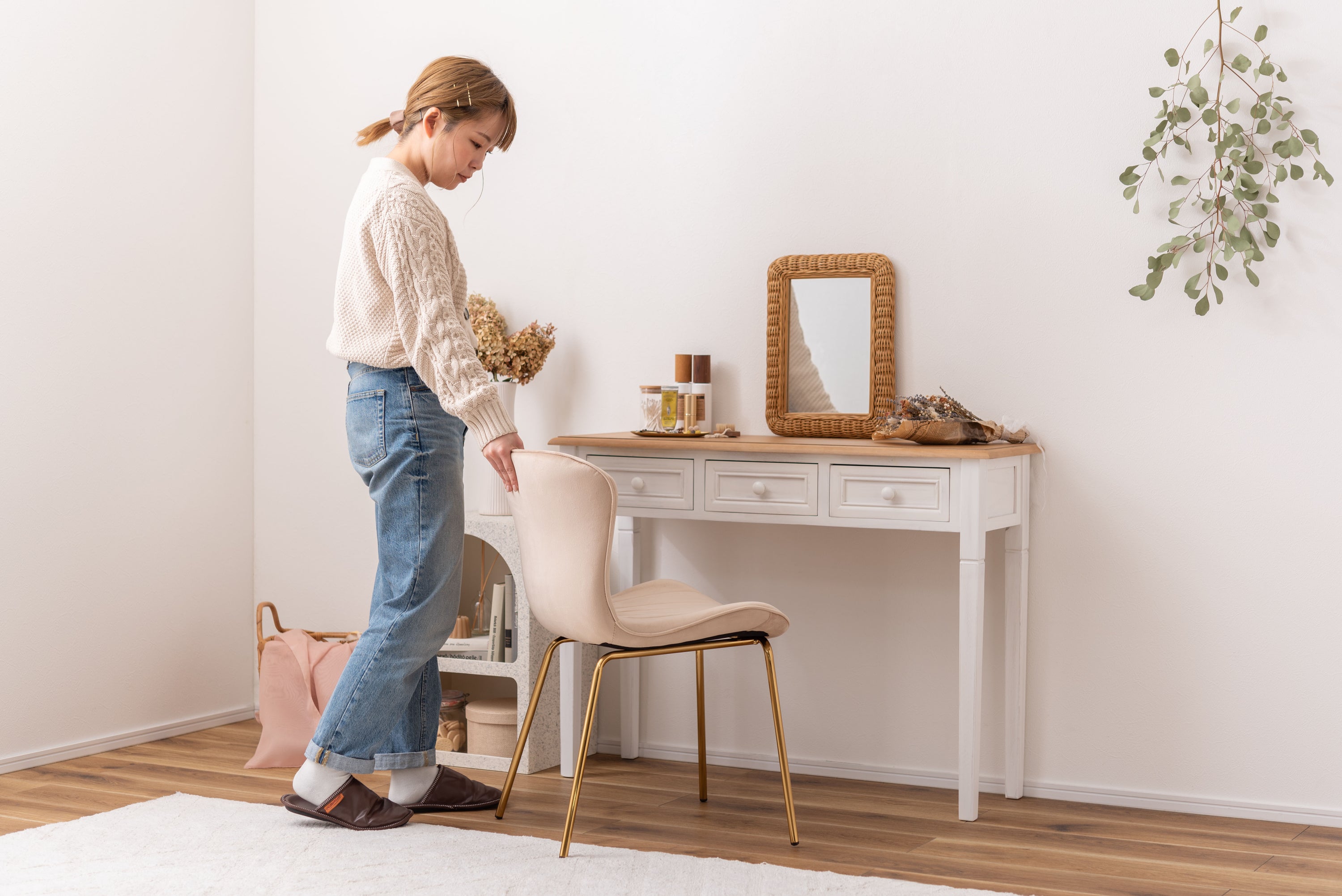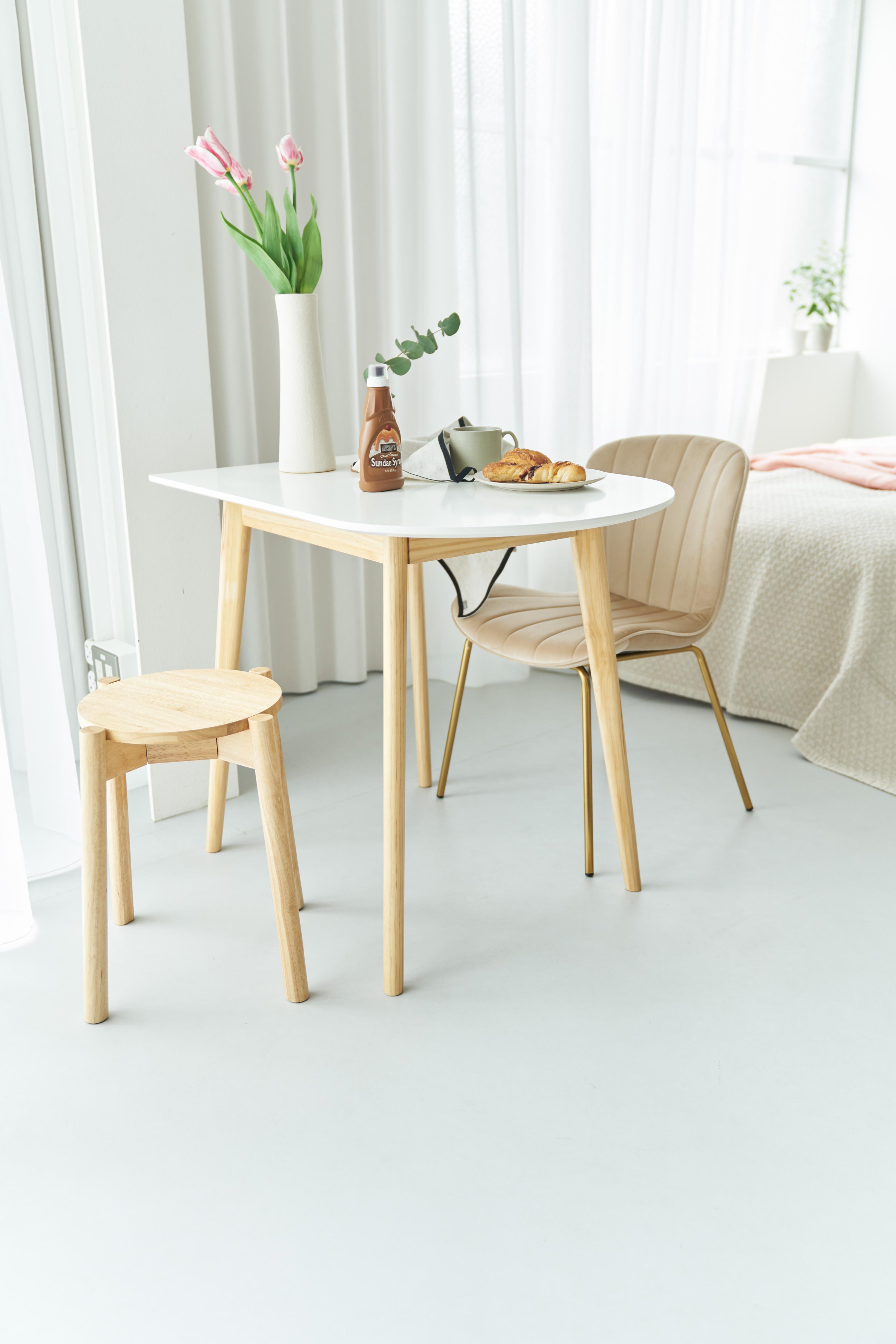 ベロア調の生地×アンティークゴールド脚の組合せが、ガーリーでトレンド感のある雰囲気を演出。身体を包み込むようなフォルムで、デザイン性にプラスして使いやすさにもとことんこだわりました。背・座面共に緩やかなカーブを描いているので、身体にフィットして包み込んでくれます。背面も座面も弾力があり、クッション性もある作りになっているので、座り心地も抜群。生地はベロア調の物を採用。程よく光沢感があり様々な表情を見せ高級感を演出。アンティークゴールドを施した細身の脚がアクセントになり、チェアのデザイン性を引き上げています。