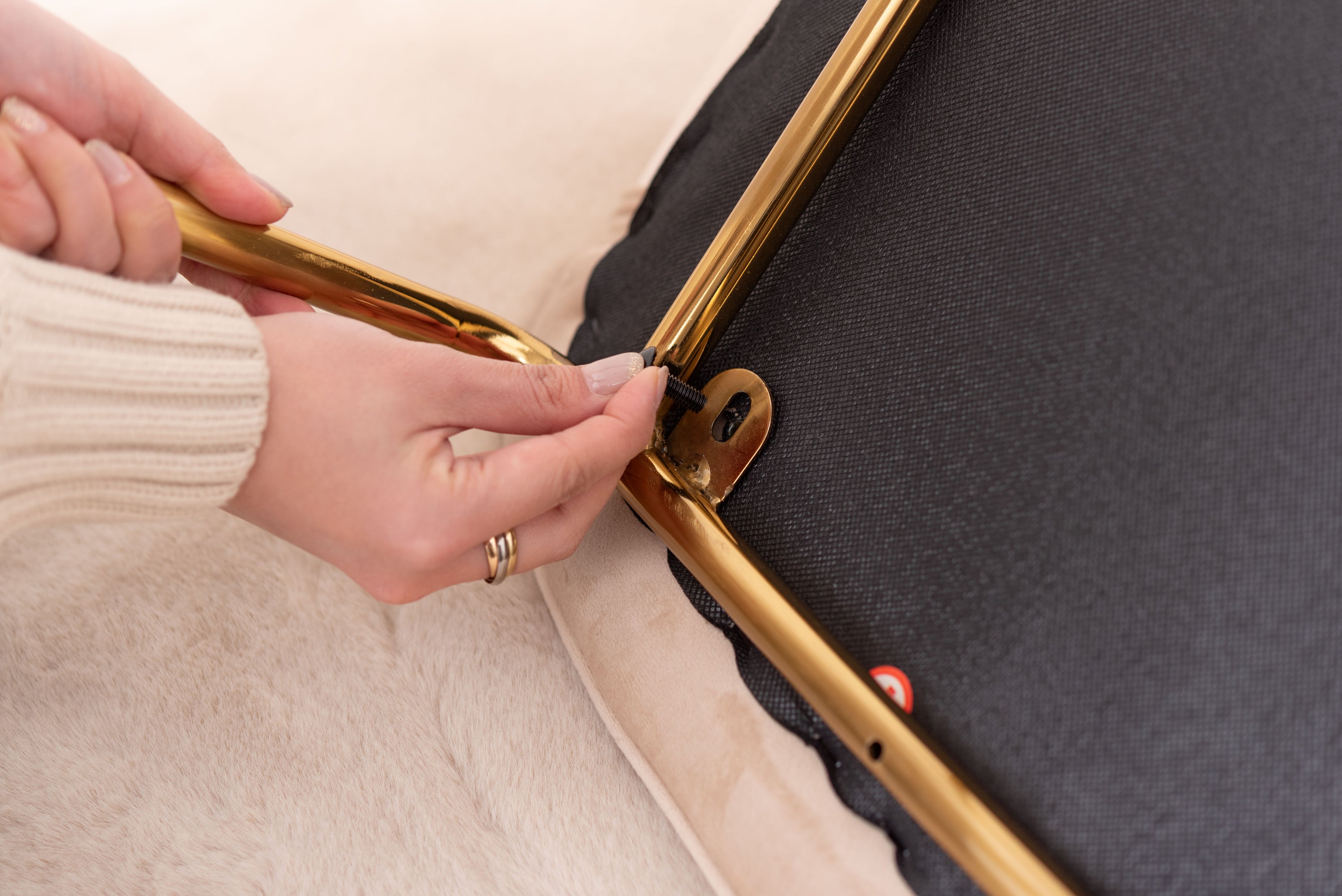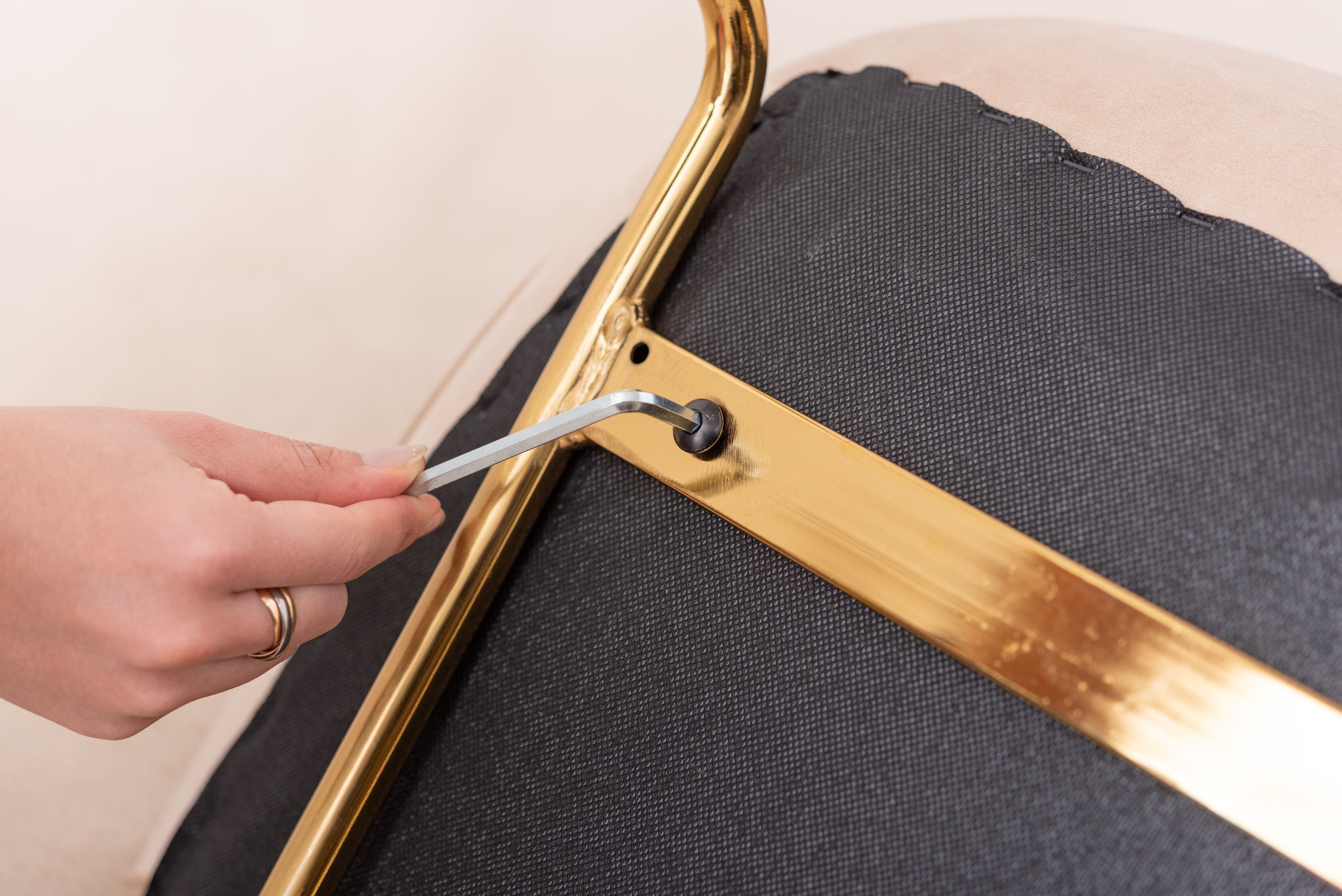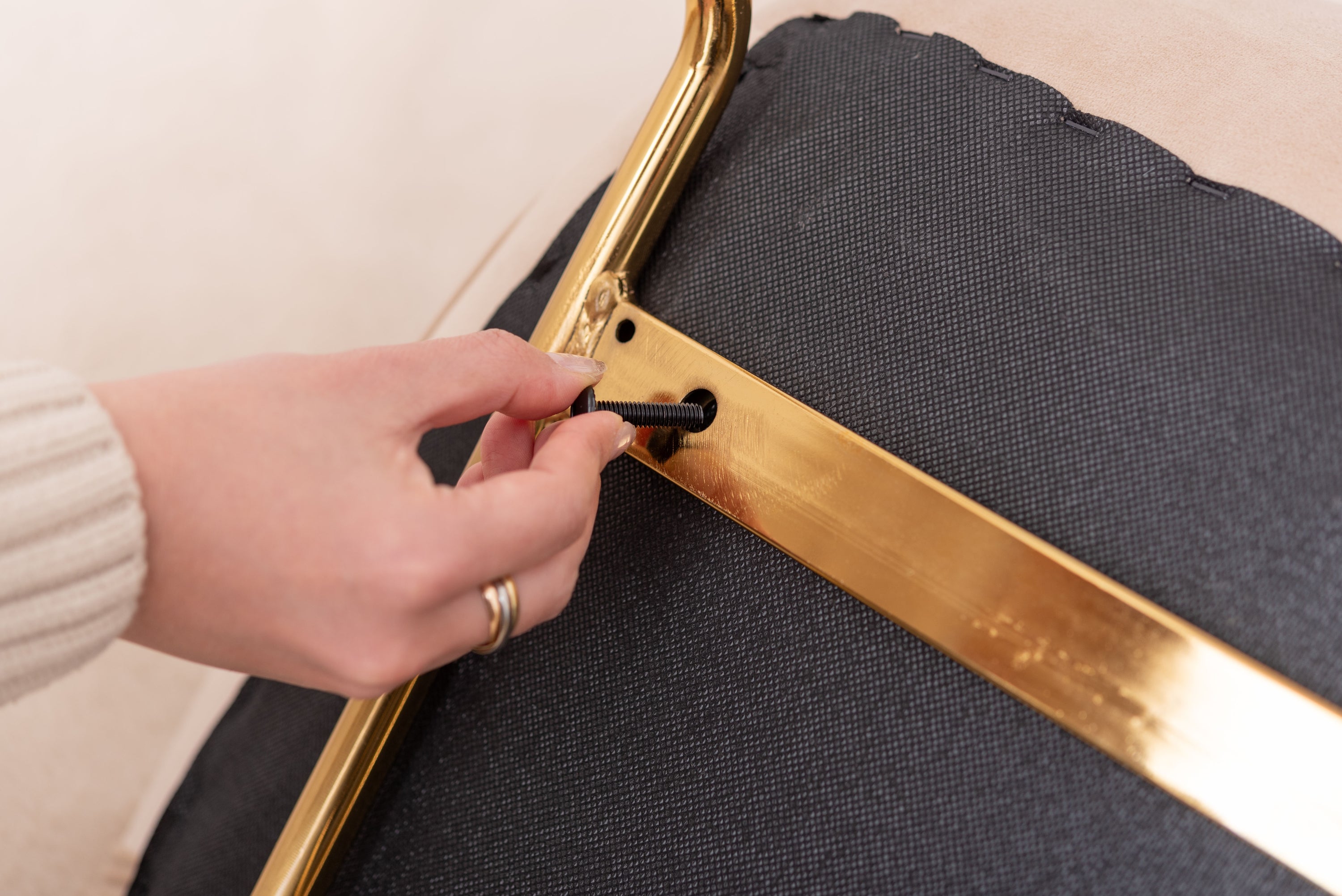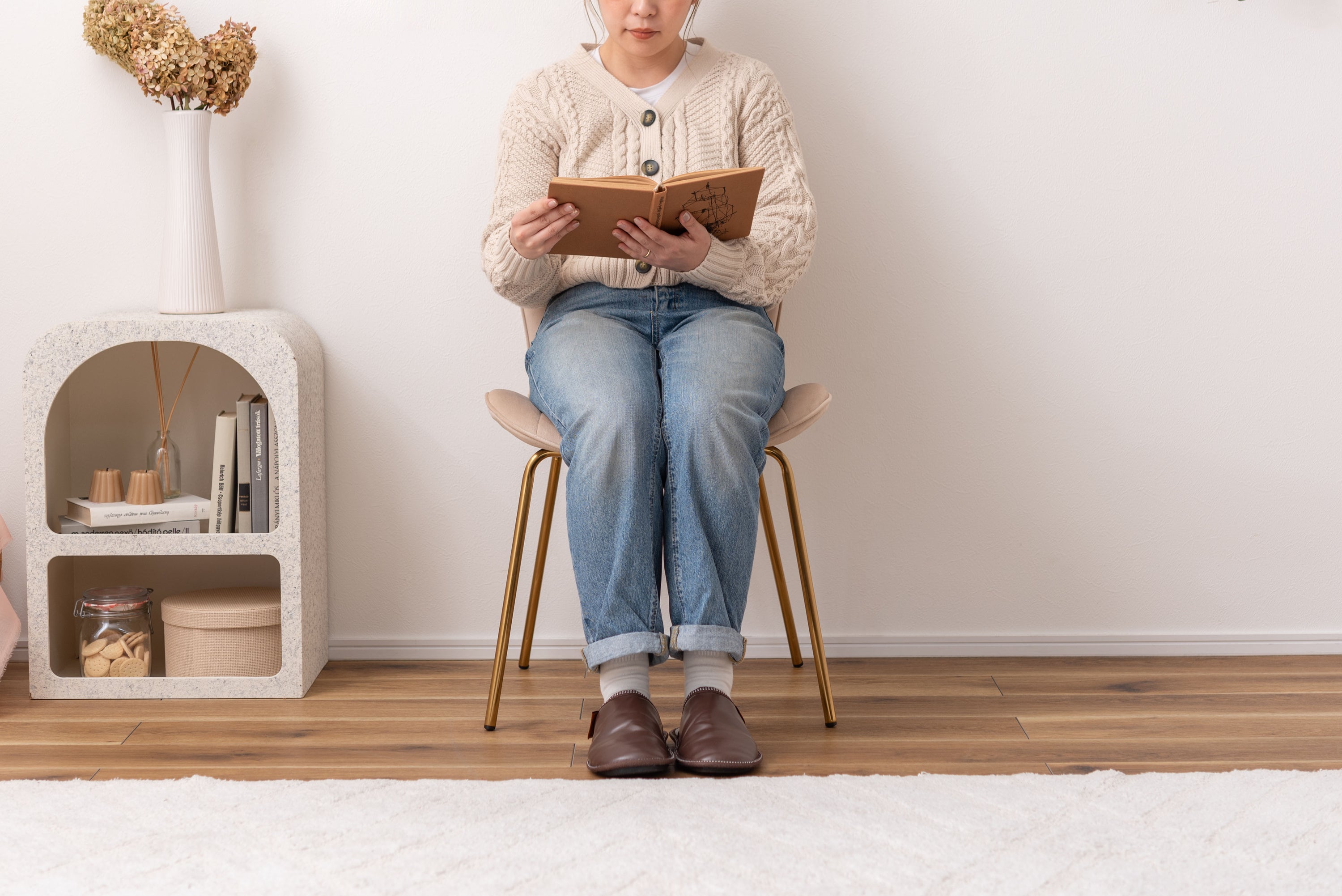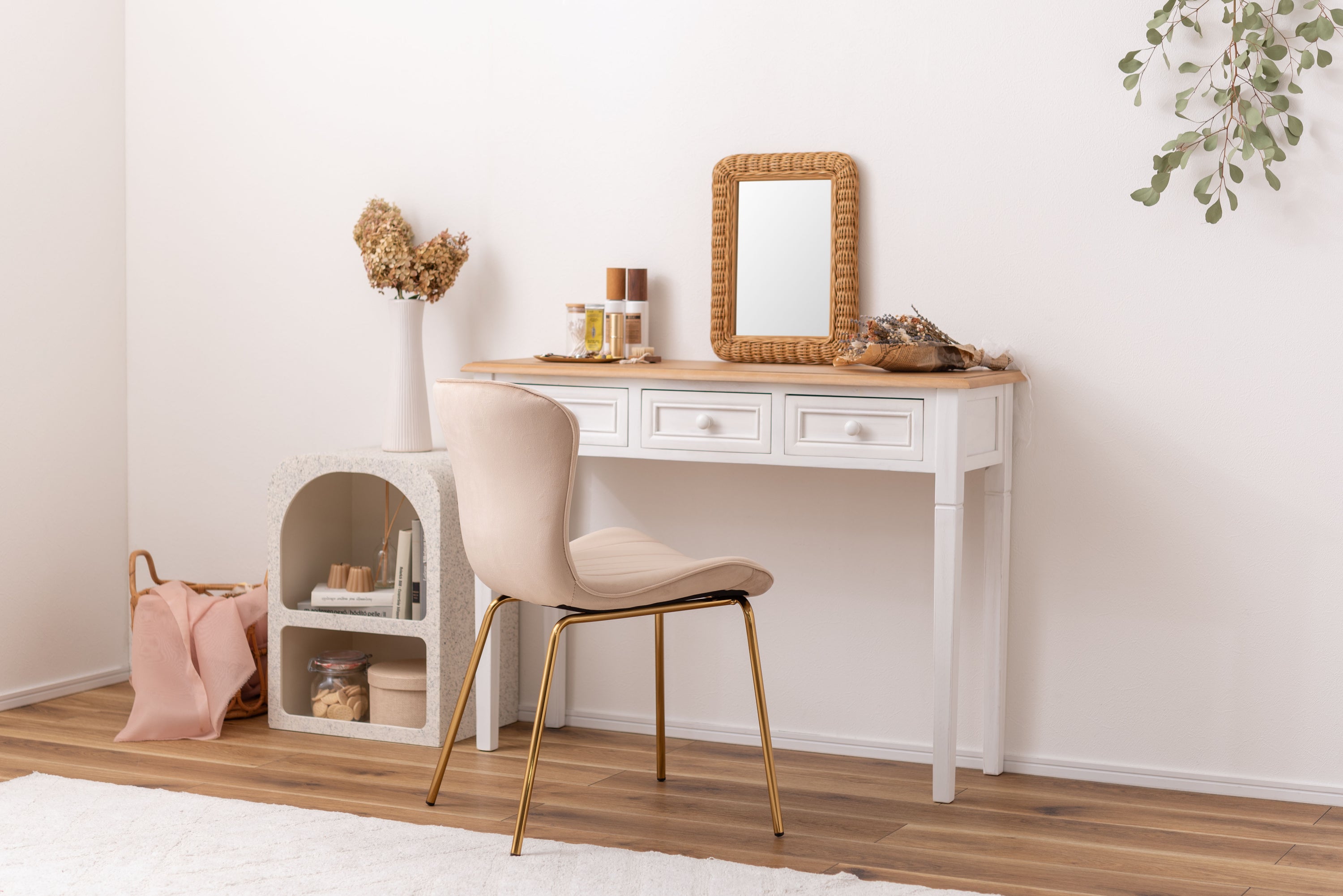 ベロア調の生地×アンティークゴールド脚の組合せが、ガーリーでトレンド感のある雰囲気を演出。身体を包み込むようなフォルムで、デザイン性にプラスして使いやすさにもとことんこだわりました。背・座面共に緩やかなカーブを描いているので、身体にフィットして包み込んでくれます。背面も座面も弾力があり、クッション性もある作りになっているので、座り心地も抜群。生地はベロア調の物を採用。程よく光沢感があり様々な表情を見せ高級感を演出。アンティークゴールドを施した細身の脚がアクセントになり、チェアのデザイン性を引き上げています。