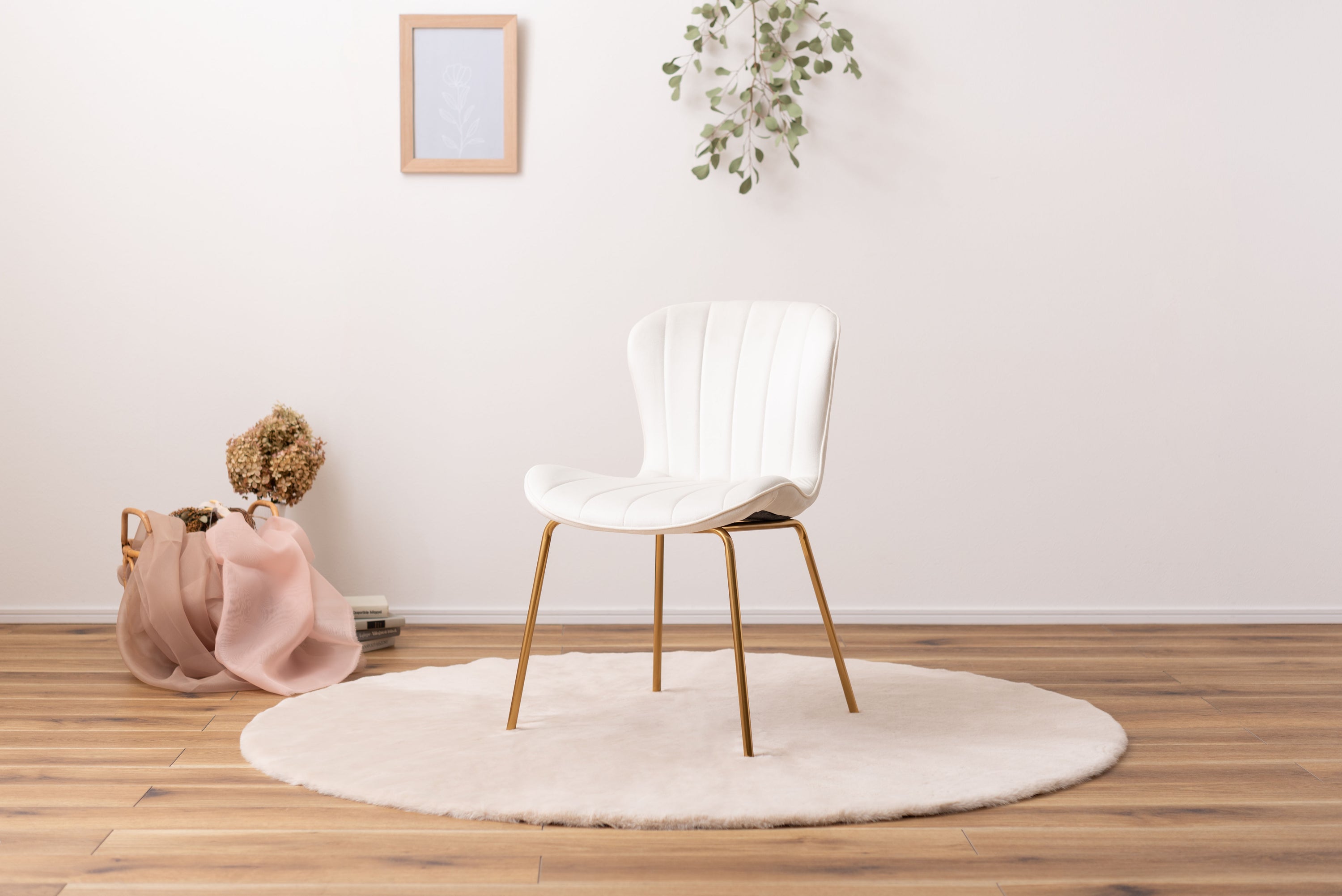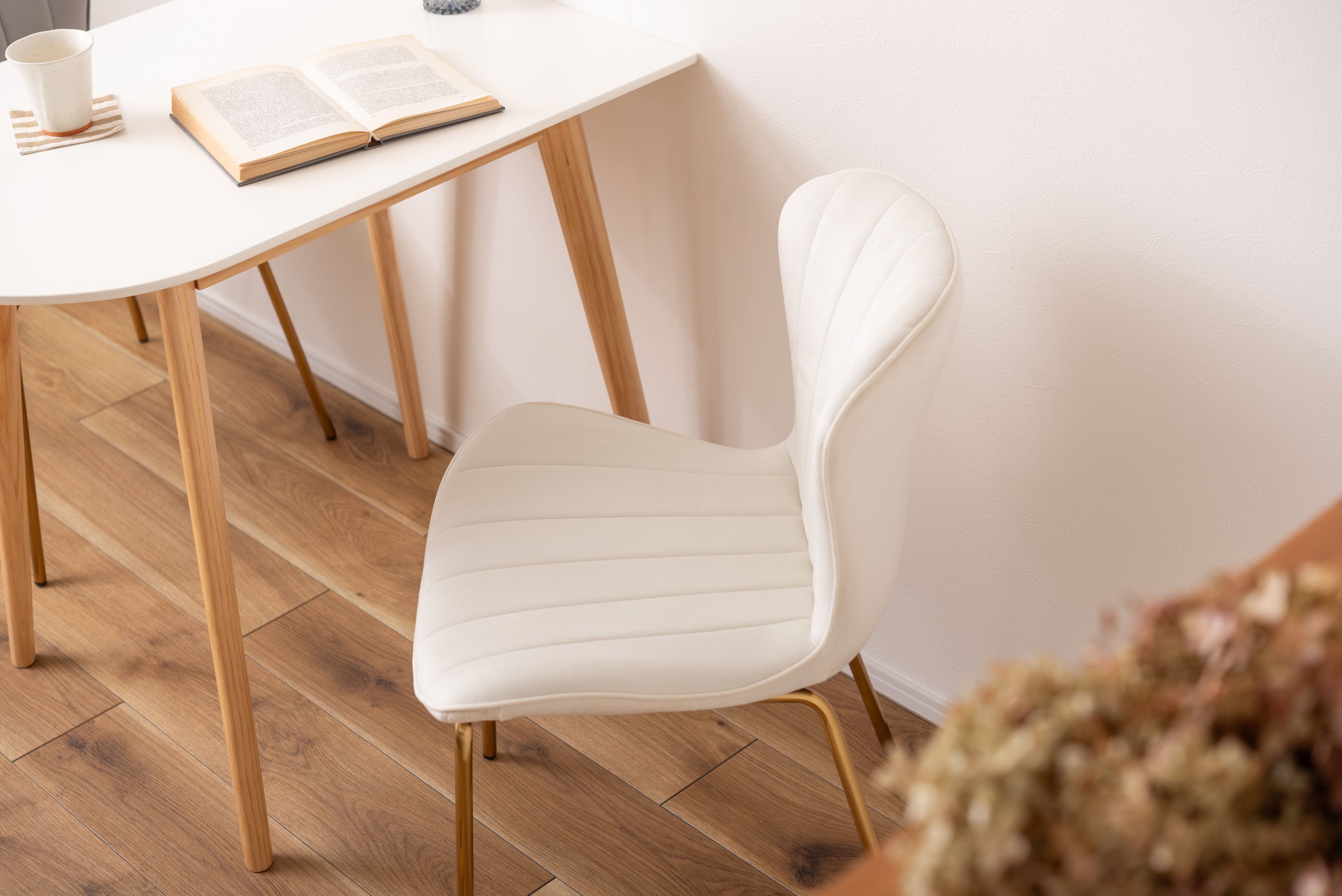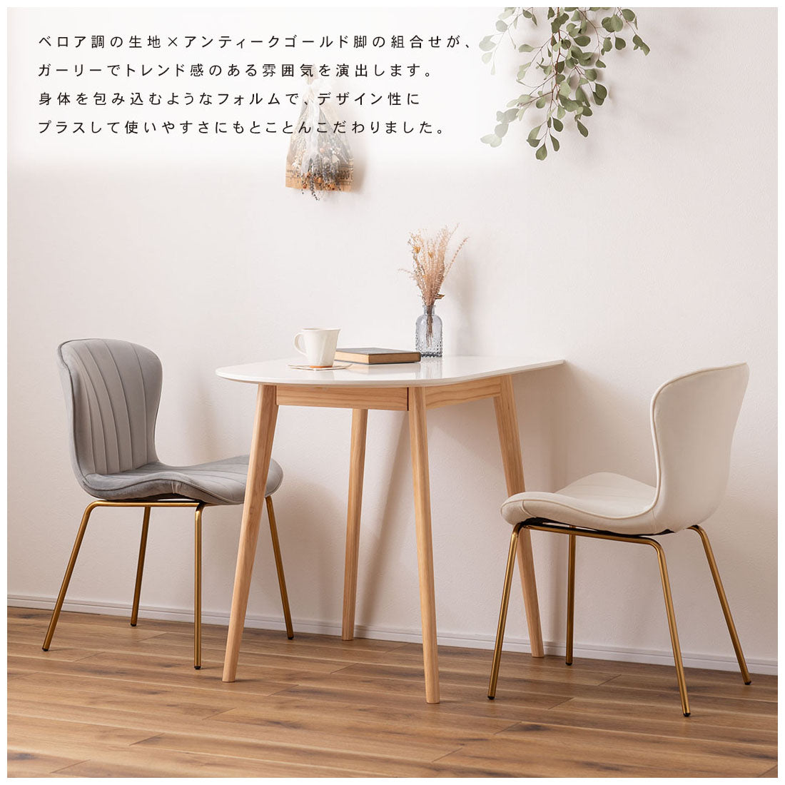 ベロア調の生地×アンティークゴールド脚の組合せが、ガーリーでトレンド感のある雰囲気を演出。身体を包み込むようなフォルムで、デザイン性にプラスして使いやすさにもとことんこだわりました。背・座面共に緩やかなカーブを描いているので、身体にフィットして包み込んでくれます。背面も座面も弾力があり、クッション性もある作りになっているので、座り心地も抜群。生地はベロア調の物を採用。程よく光沢感があり様々な表情を見せ高級感を演出。アンティークゴールドを施した細身の脚がアクセントになり、チェアのデザイン性を引き上げています。