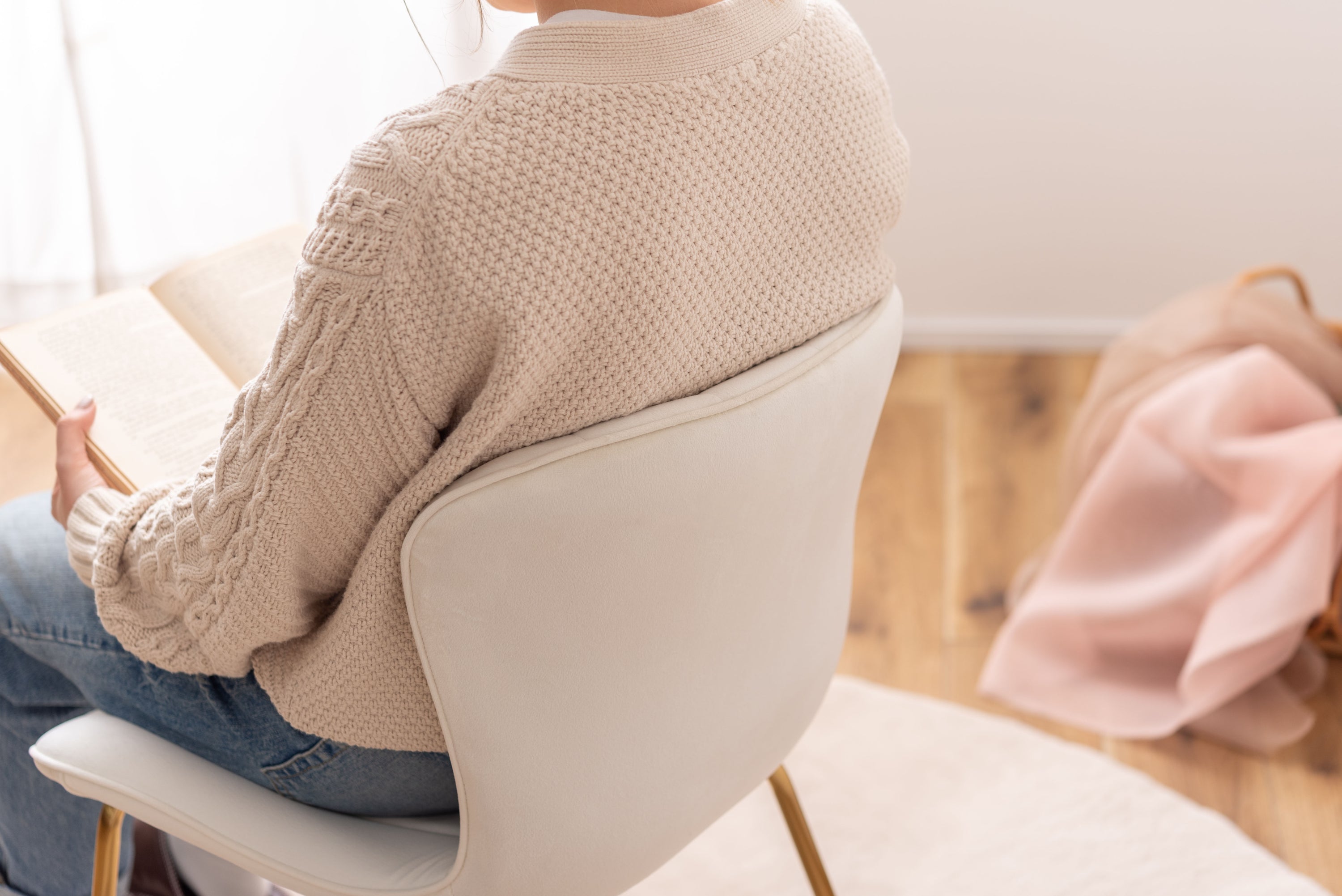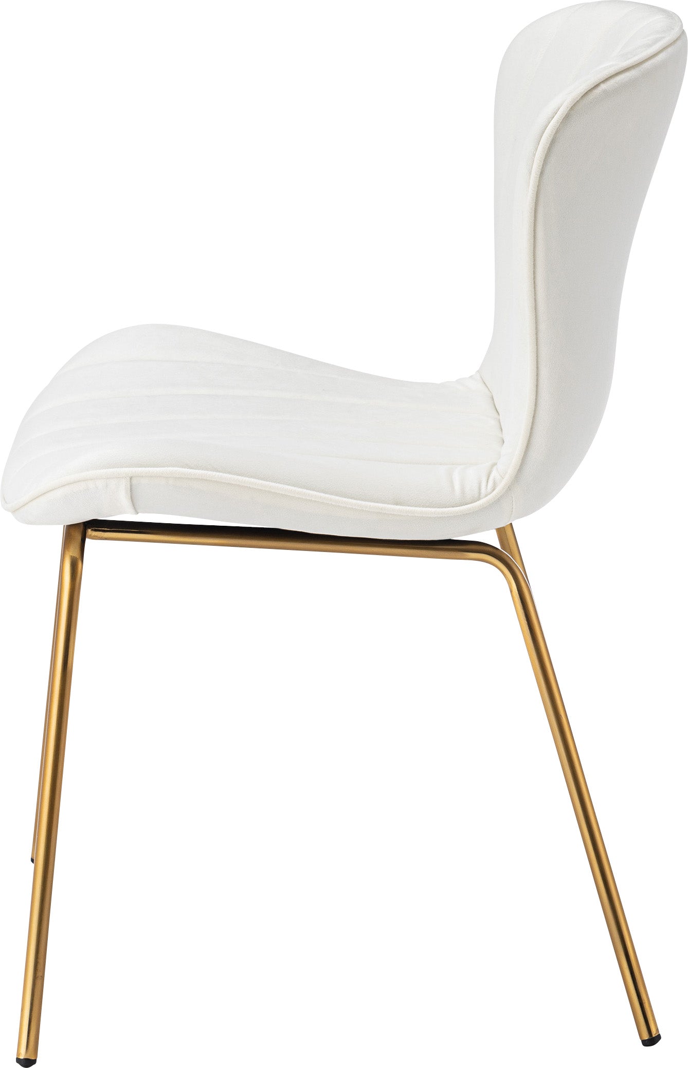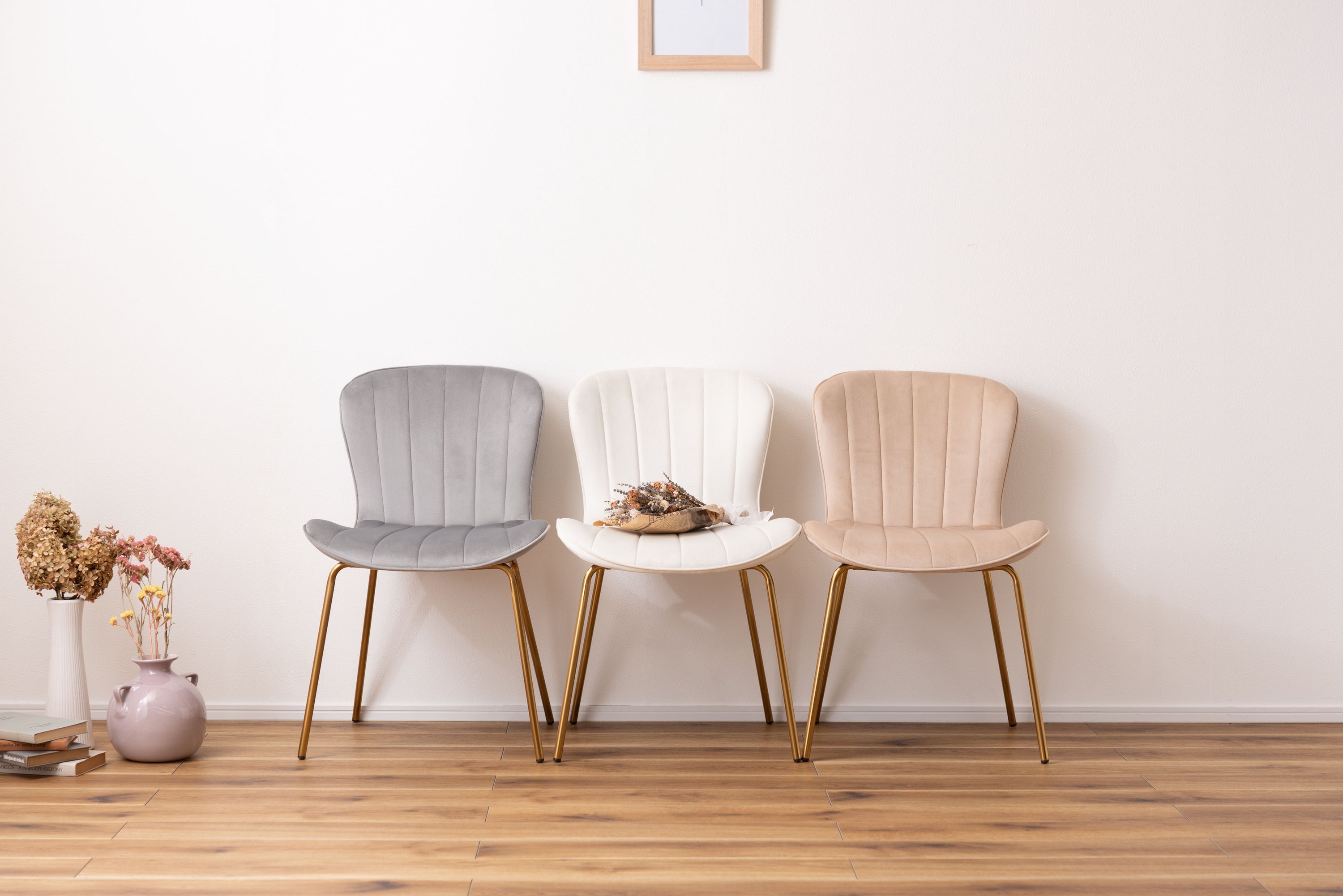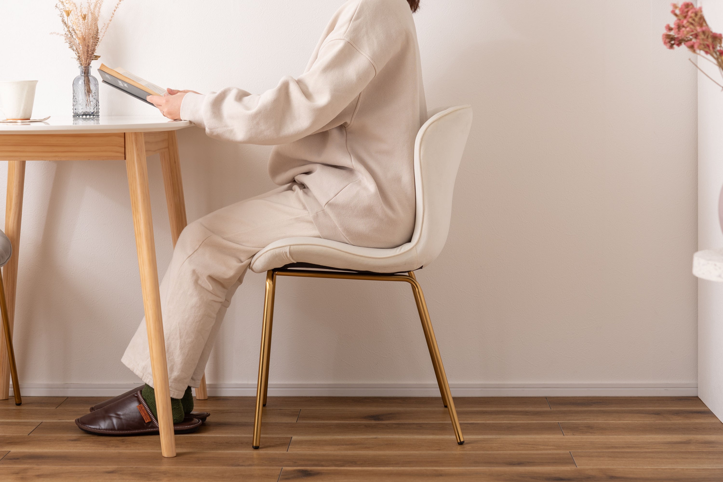 ベロア調の生地×アンティークゴールド脚の組合せが、ガーリーでトレンド感のある雰囲気を演出。身体を包み込むようなフォルムで、デザイン性にプラスして使いやすさにもとことんこだわりました。背・座面共に緩やかなカーブを描いているので、身体にフィットして包み込んでくれます。背面も座面も弾力があり、クッション性もある作りになっているので、座り心地も抜群。生地はベロア調の物を採用。程よく光沢感があり様々な表情を見せ高級感を演出。アンティークゴールドを施した細身の脚がアクセントになり、チェアのデザイン性を引き上げています。