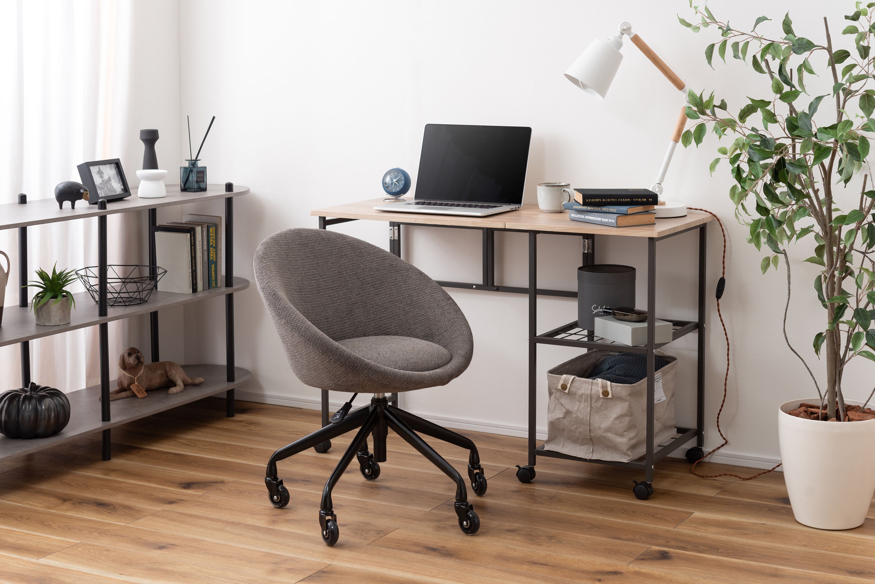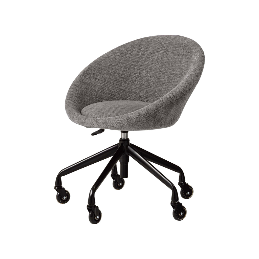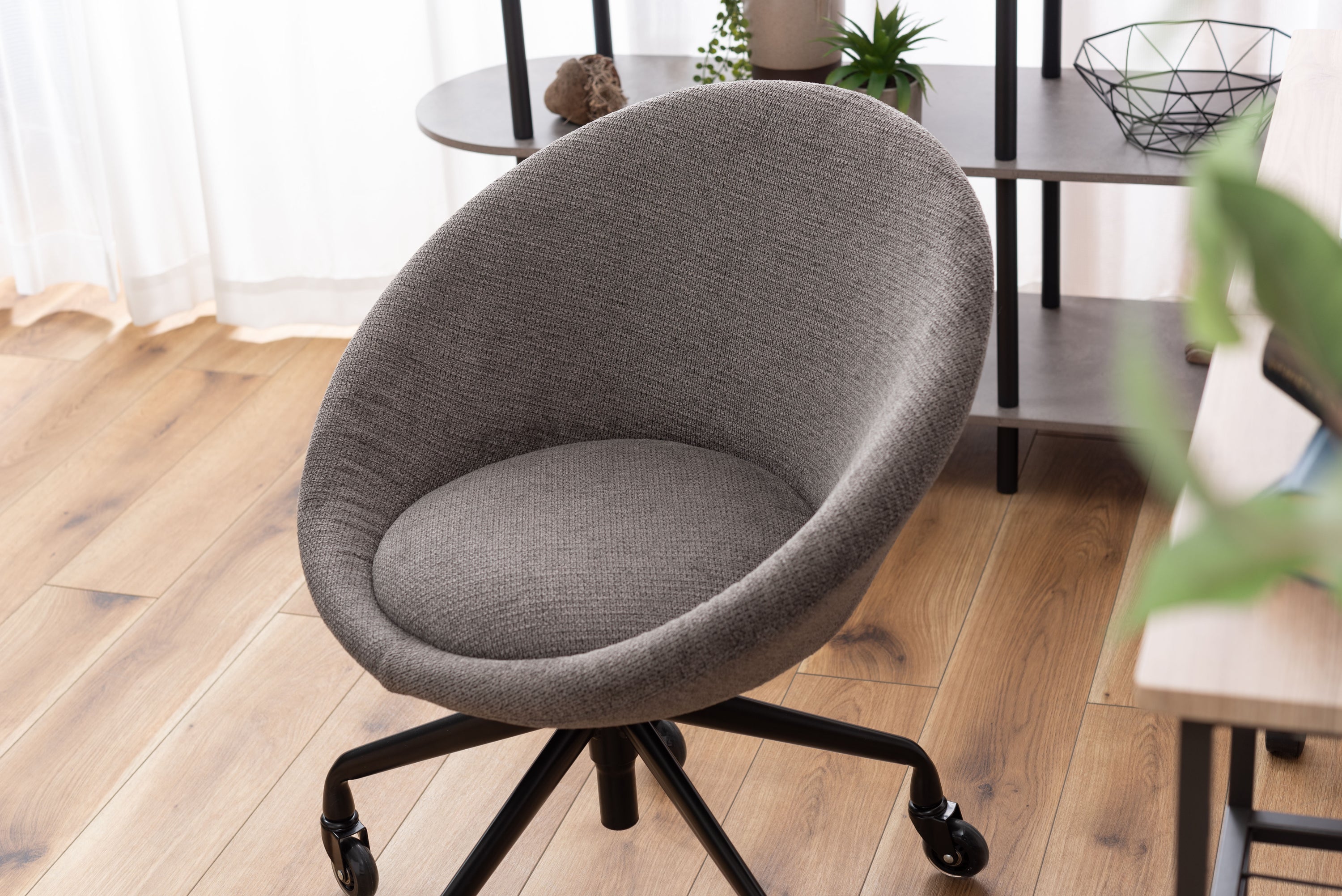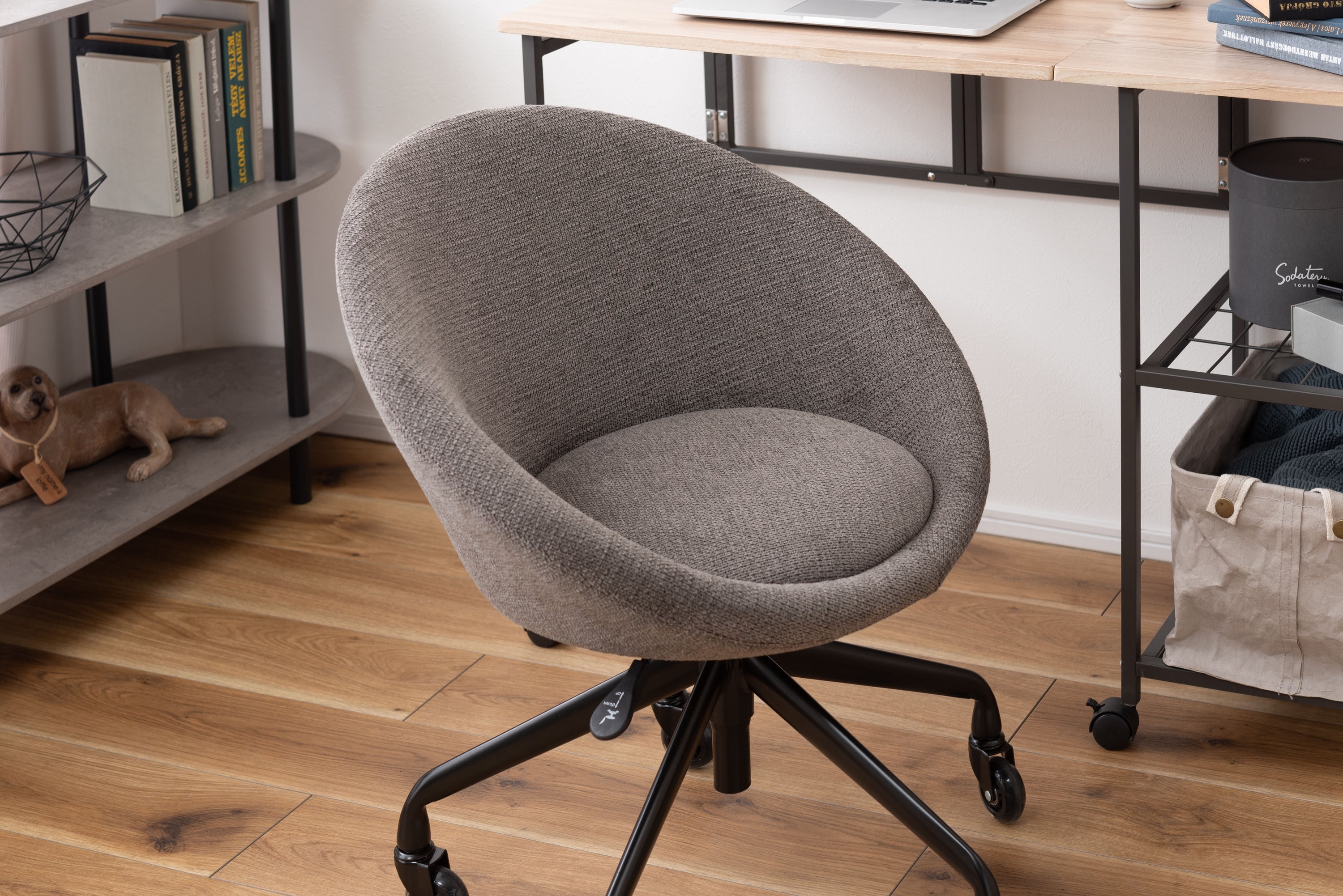 ころんとした丸いフォルムと、シンプルなカラーリングのコントラストが目を引くデスクチェア。特徴的なフォルムが身体をやさしく包み込み、快適な座り心地を実現。昇降・回転機能&キャスター付きで使い勝手にもこだわったアイテム。座面下にある昇降レバーで44~50cmまで座面の昇降が可能。立ち座りの際に動きがスムーズで楽に行なえる回転式。程よい硬さのクッション性がある座面で、長時間座っても疲れにくい仕様。滑らかに動くキャスター付きで移動も簡単。