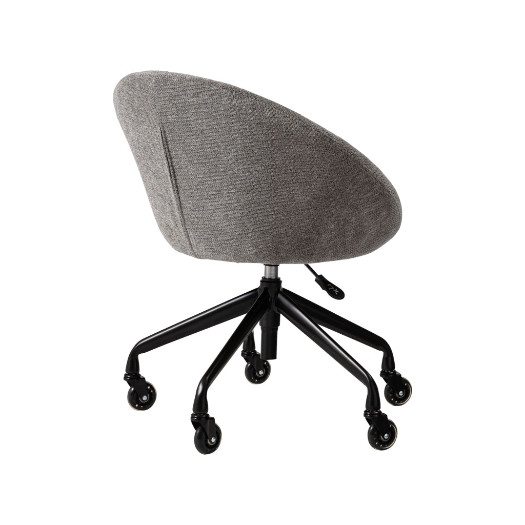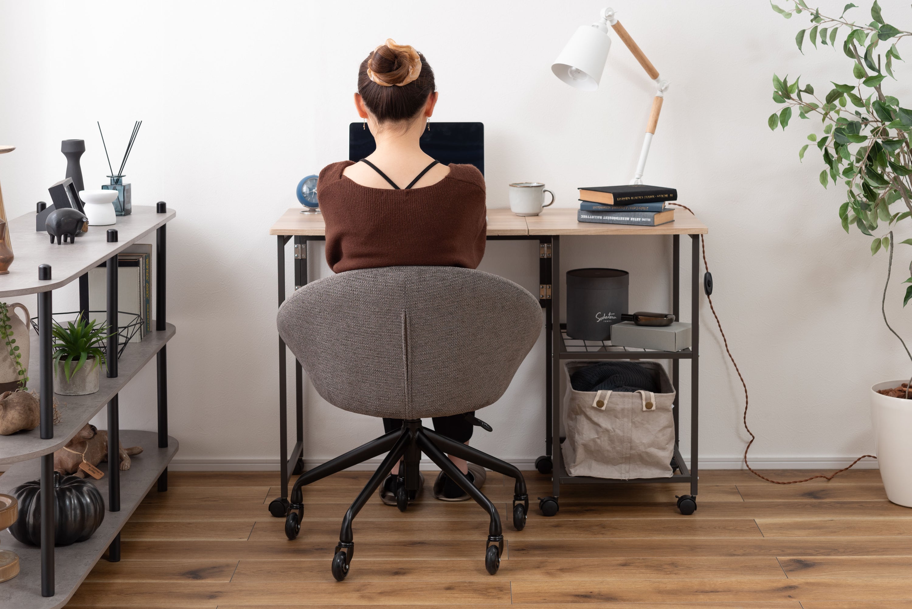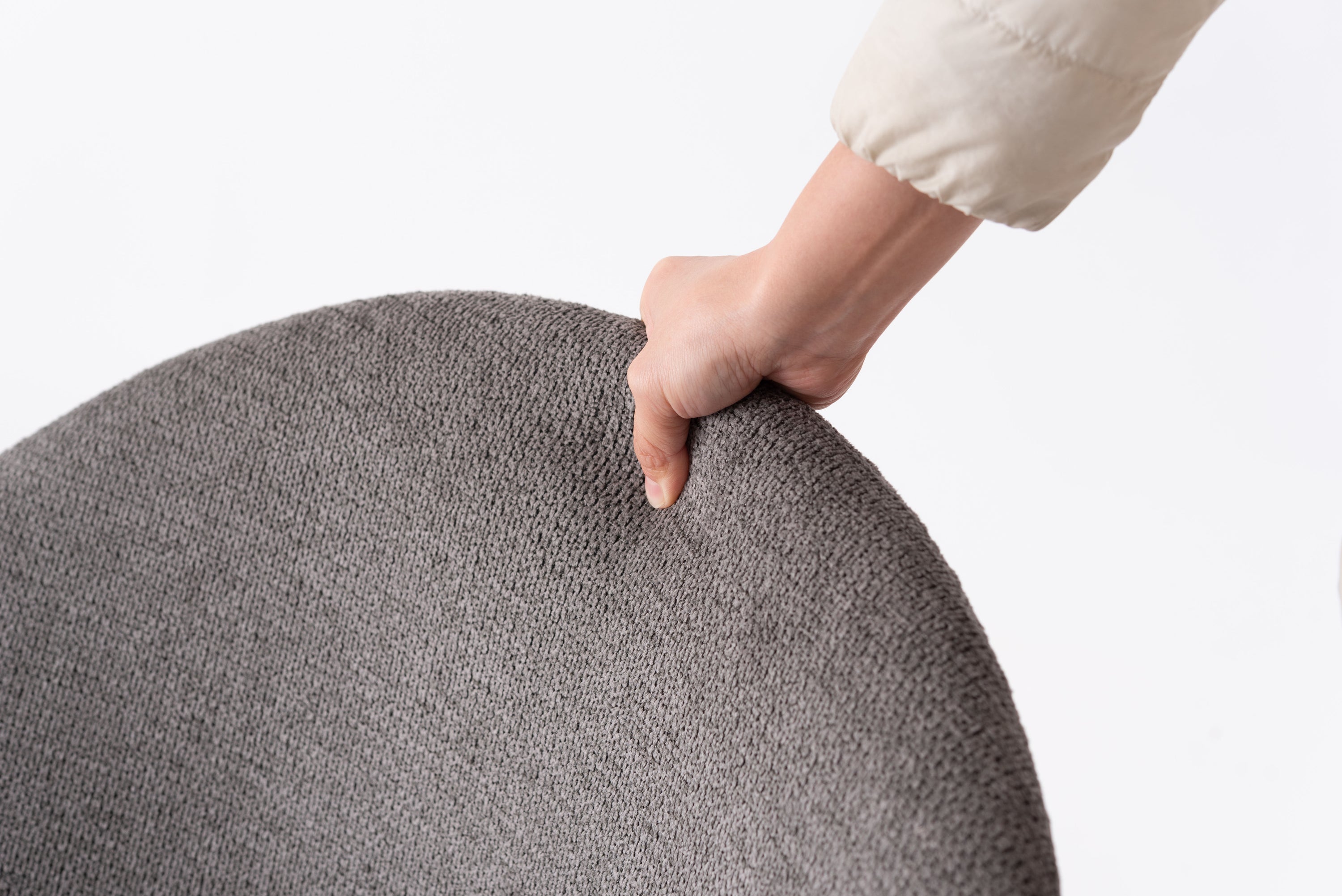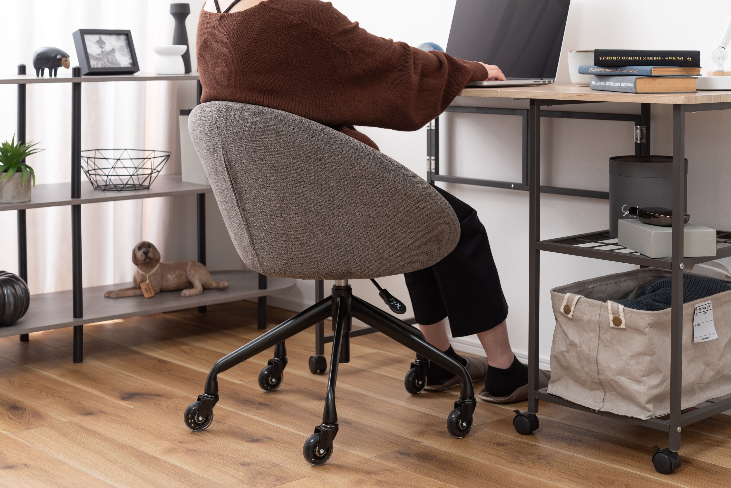 ころんとした丸いフォルムと、シンプルなカラーリングのコントラストが目を引くデスクチェア。特徴的なフォルムが身体をやさしく包み込み、快適な座り心地を実現。昇降・回転機能&キャスター付きで使い勝手にもこだわったアイテム。座面下にある昇降レバーで44~50cmまで座面の昇降が可能。立ち座りの際に動きがスムーズで楽に行なえる回転式。程よい硬さのクッション性がある座面で、長時間座っても疲れにくい仕様。滑らかに動くキャスター付きで移動も簡単。