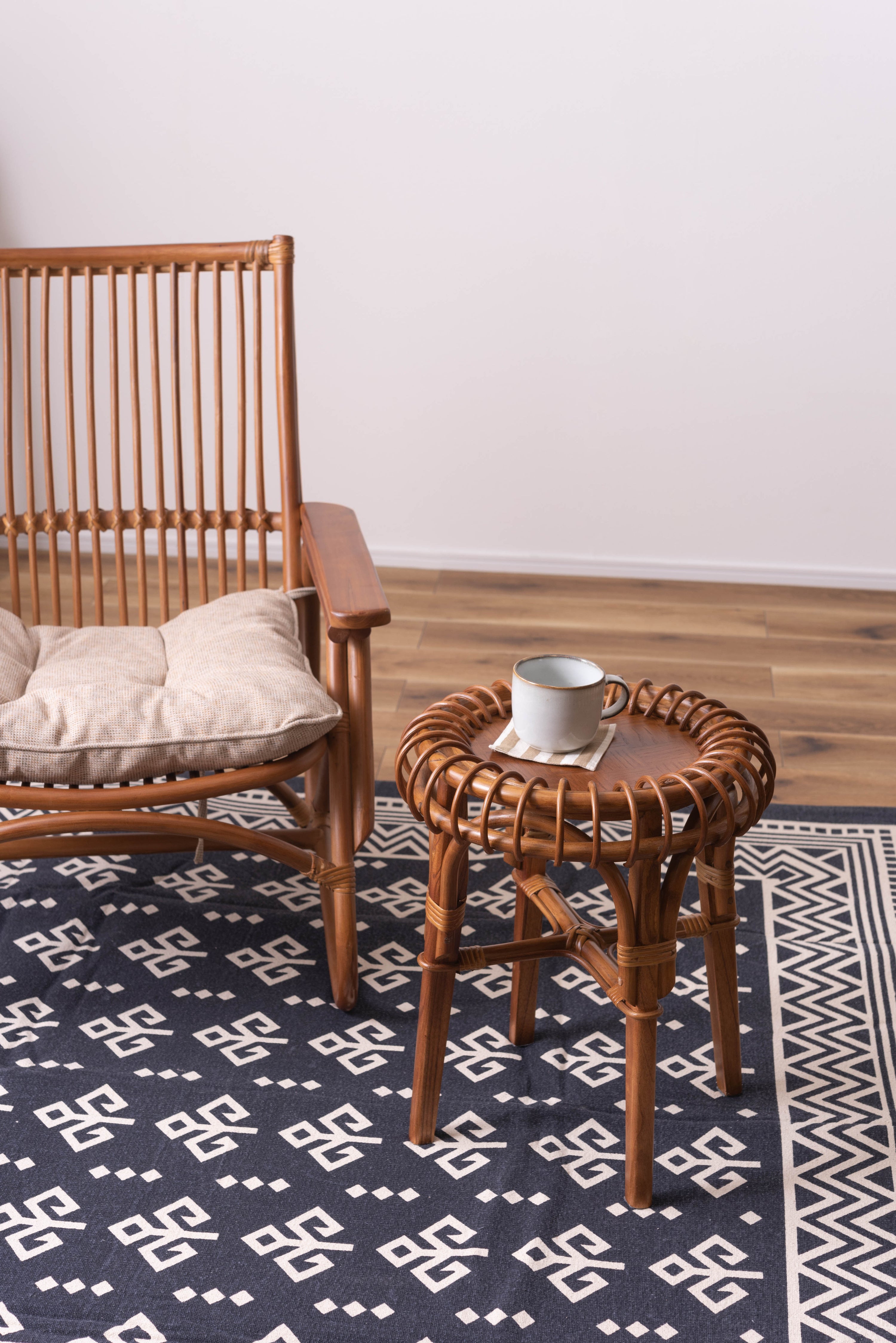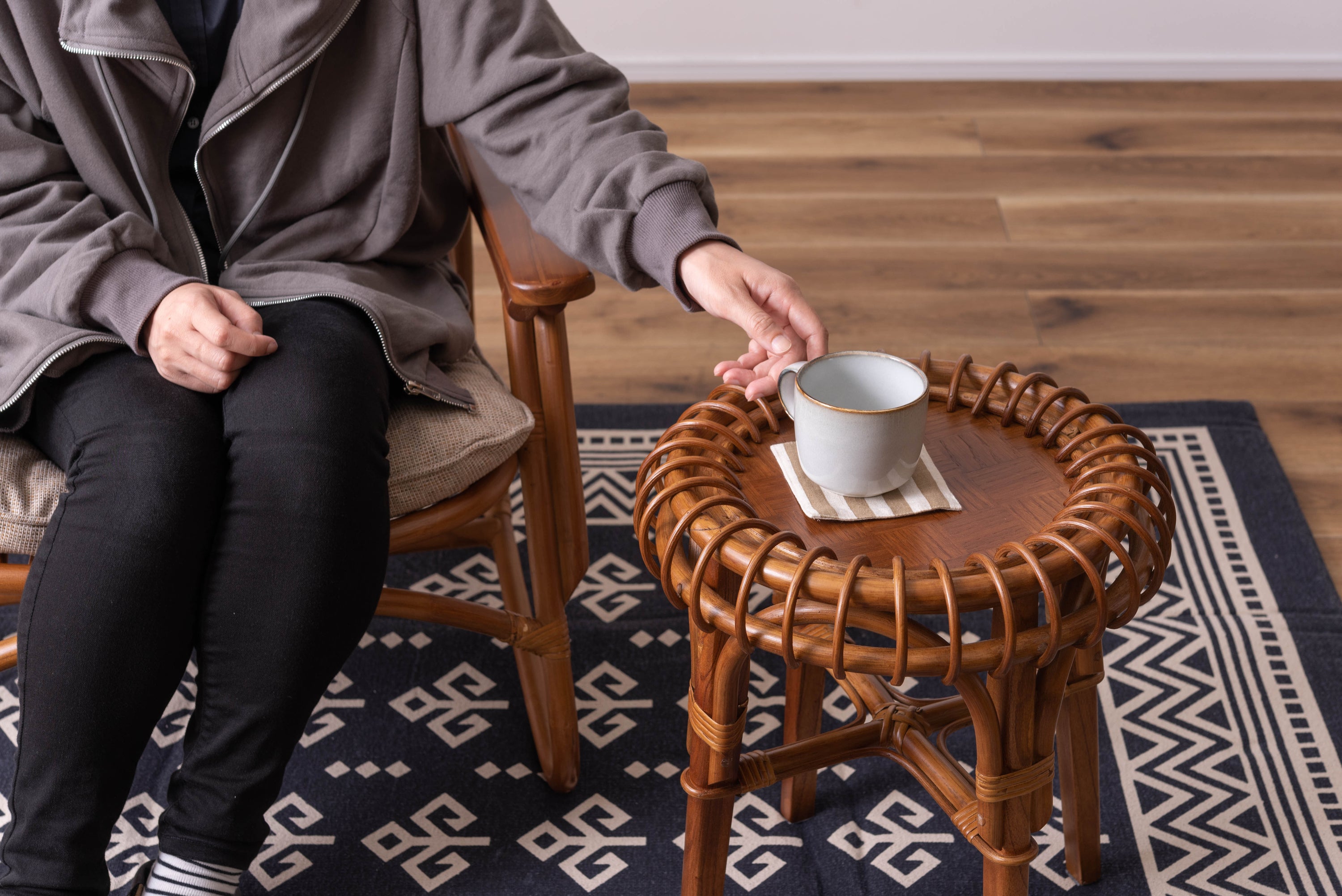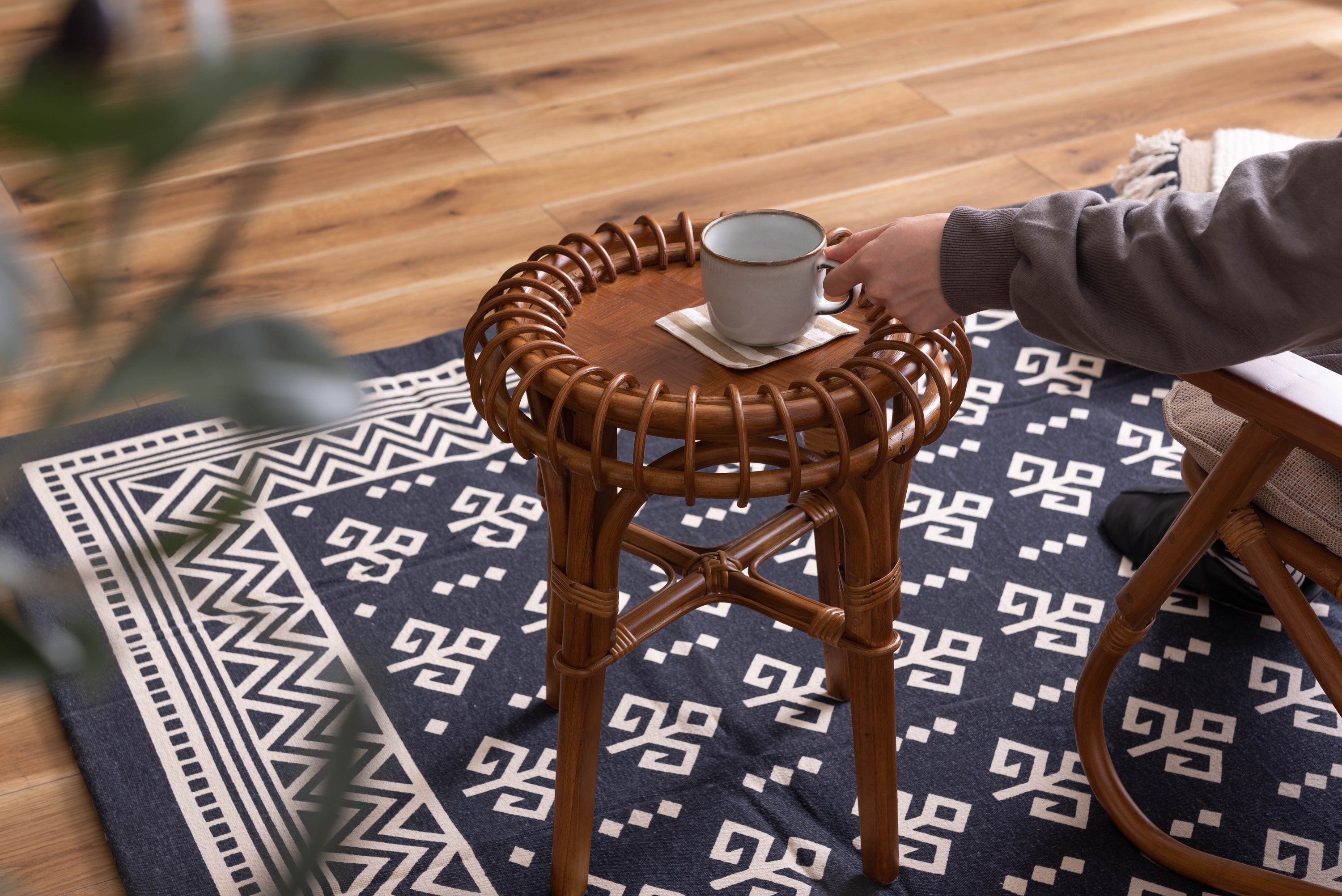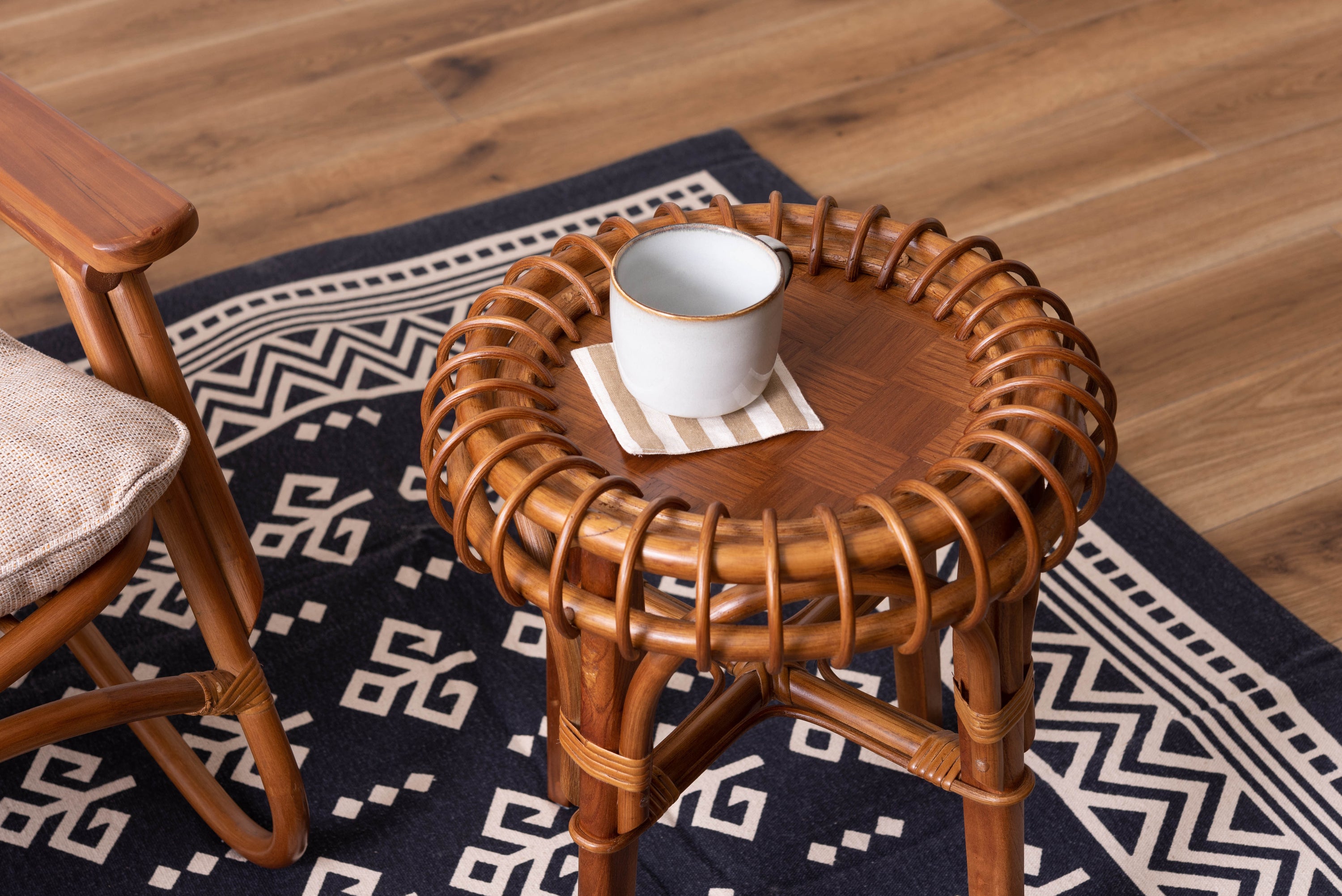 ROOMESSENCEのラタンサイドテーブルブラウンです。安定感のあるつくりを備え、ダイニングや作業台として活躍します。ブランドの美意識を感じる佇まいで、日常づかいから来客時まで幅広く対応。品番:NRS-505。暮らしに上質なアクセントを添える一品です。