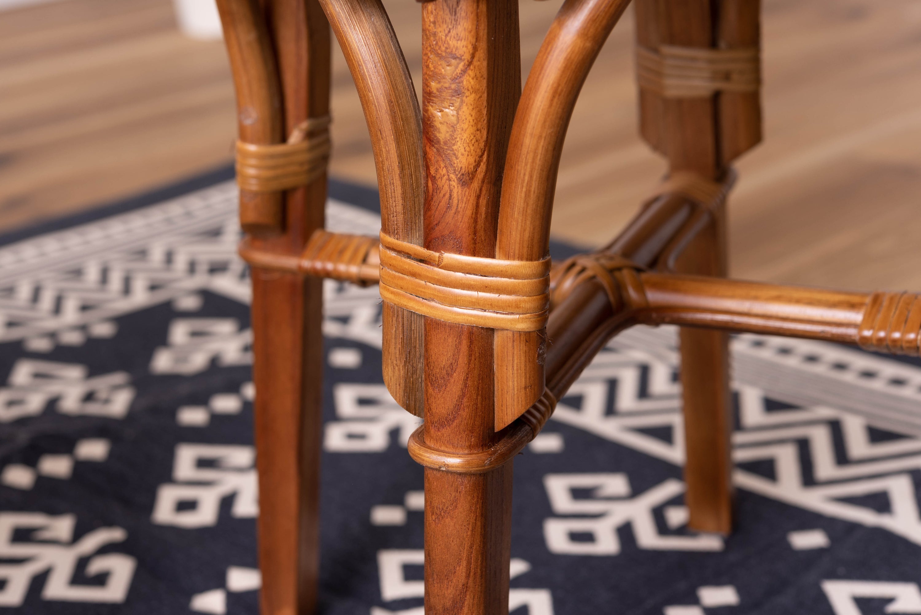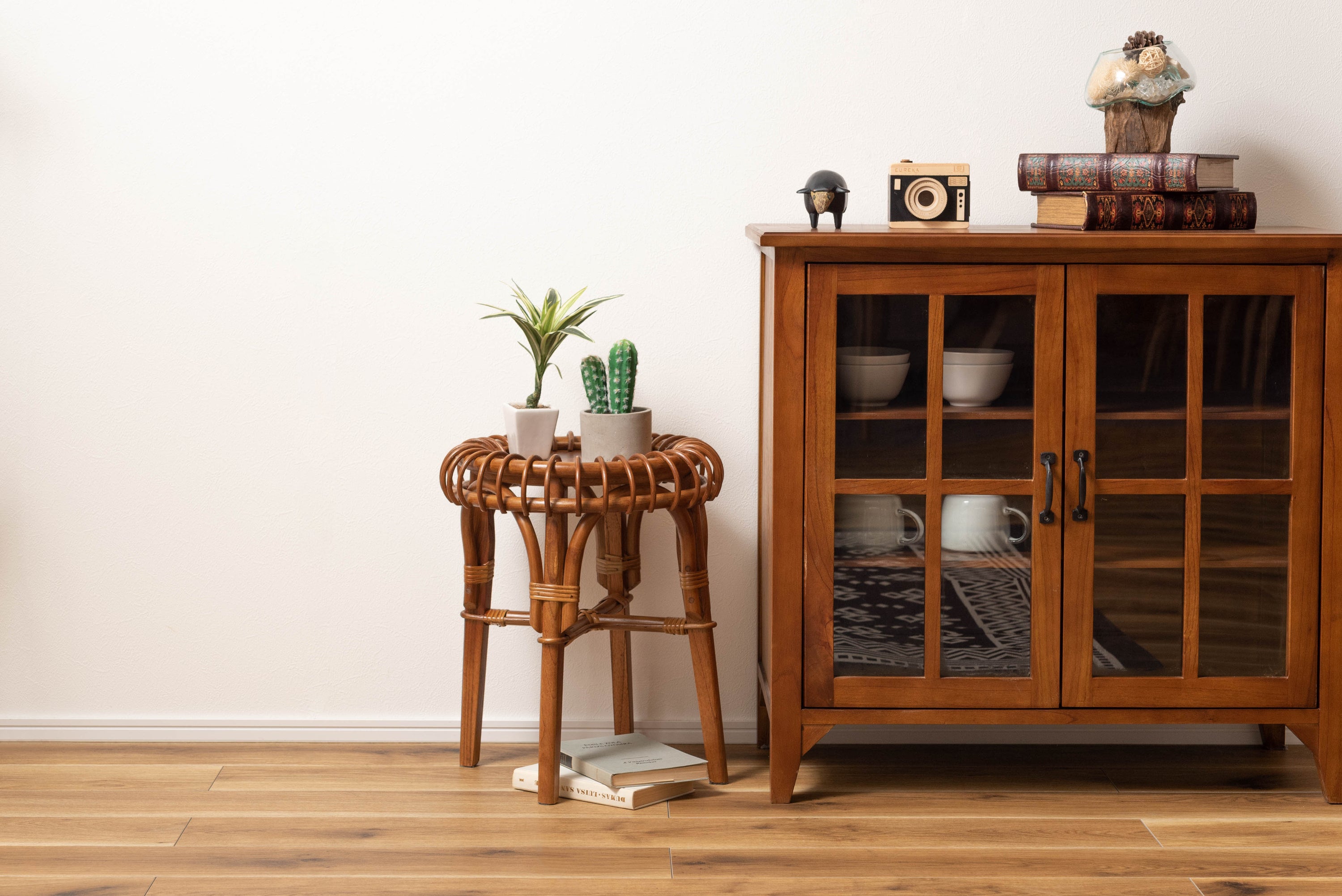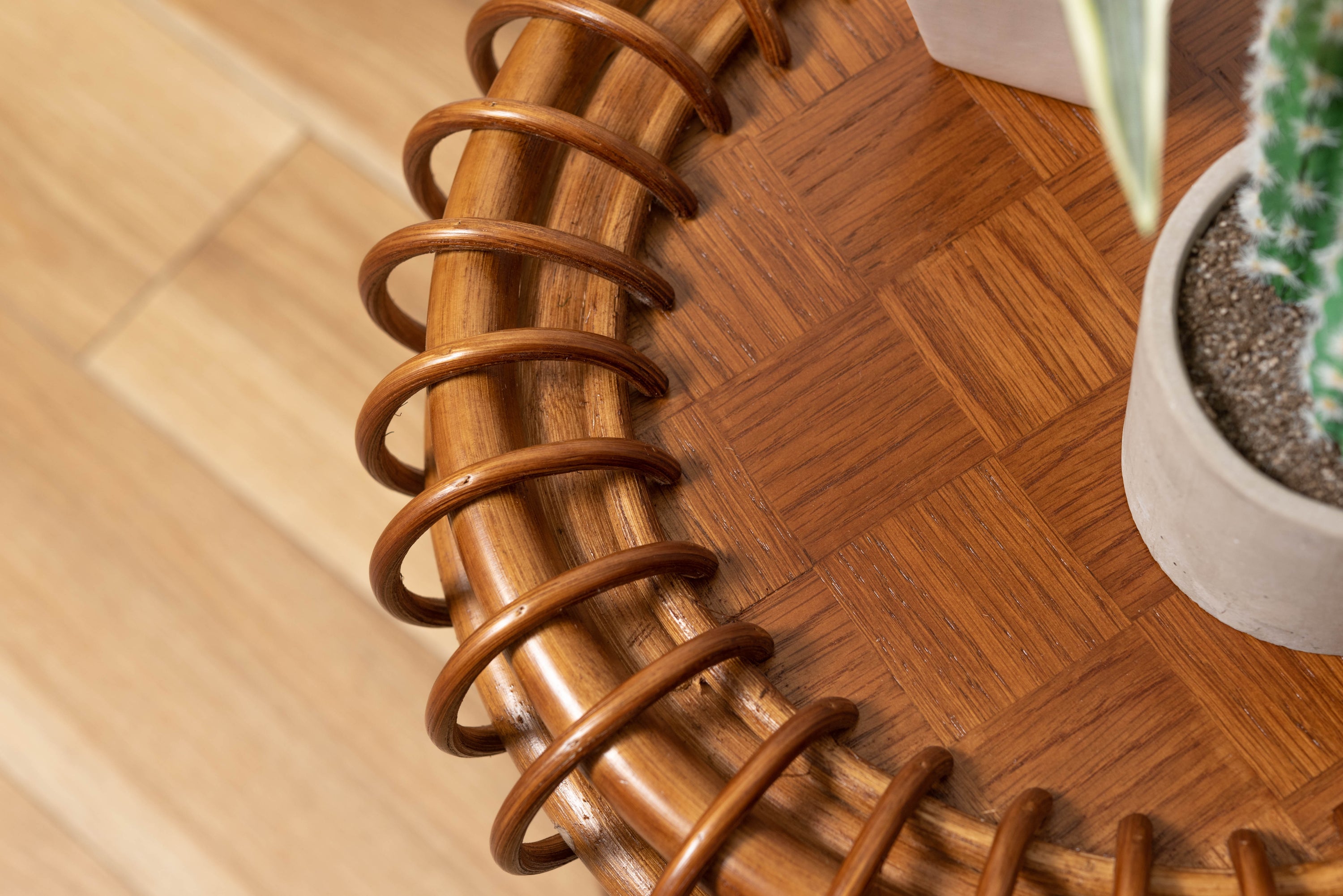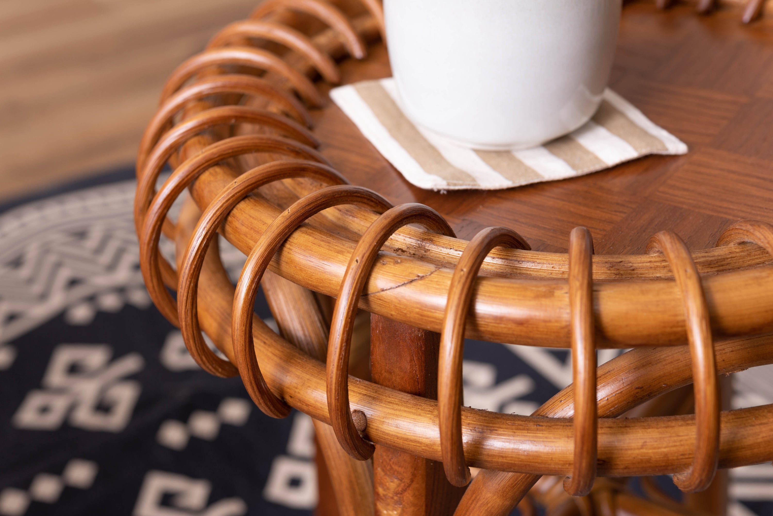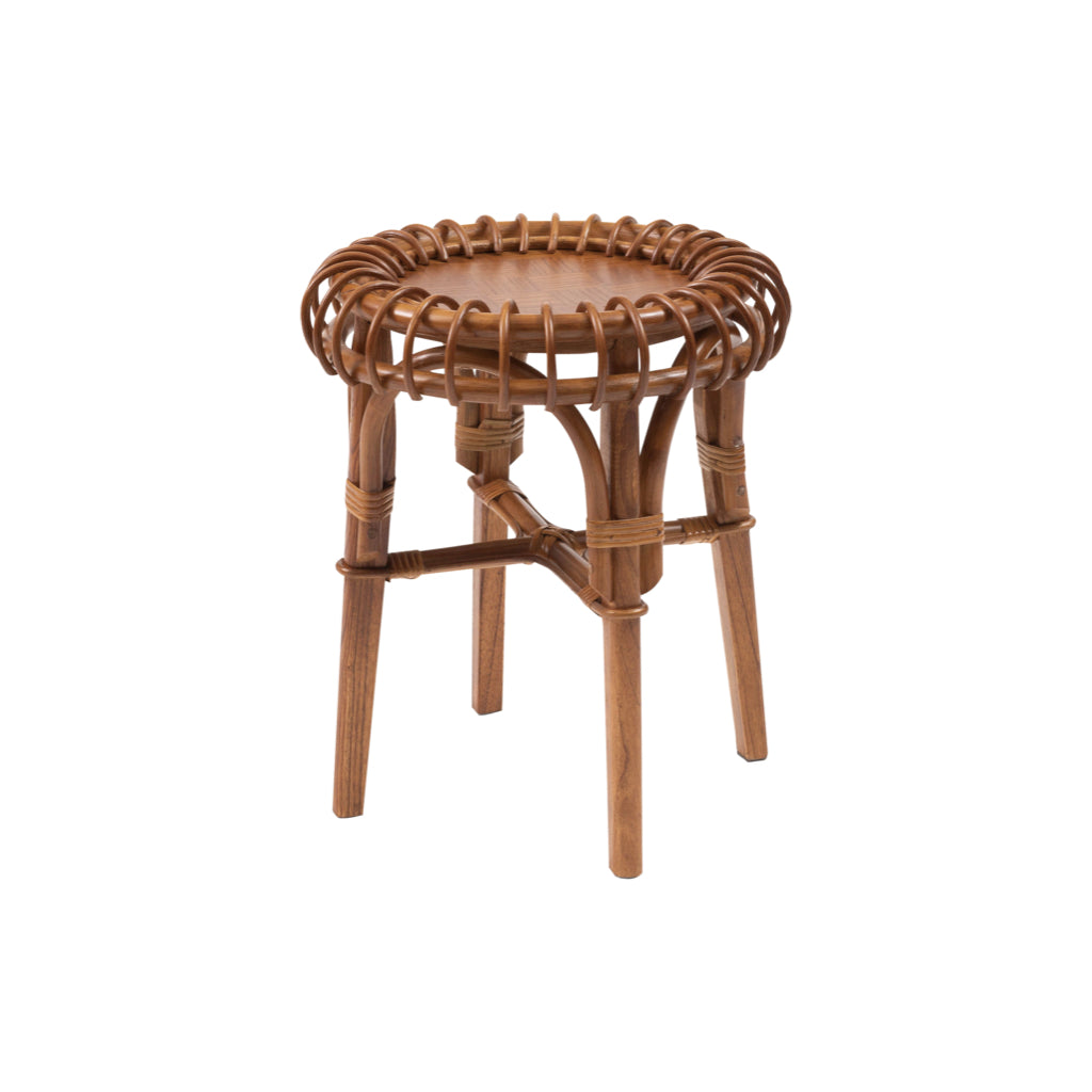 ROOMESSENCEのラタンサイドテーブルブラウンです。安定感のあるつくりを備え、ダイニングや作業台として活躍します。ブランドの美意識を感じる佇まいで、日常づかいから来客時まで幅広く対応。品番:NRS-505。暮らしに上質なアクセントを添える一品です。