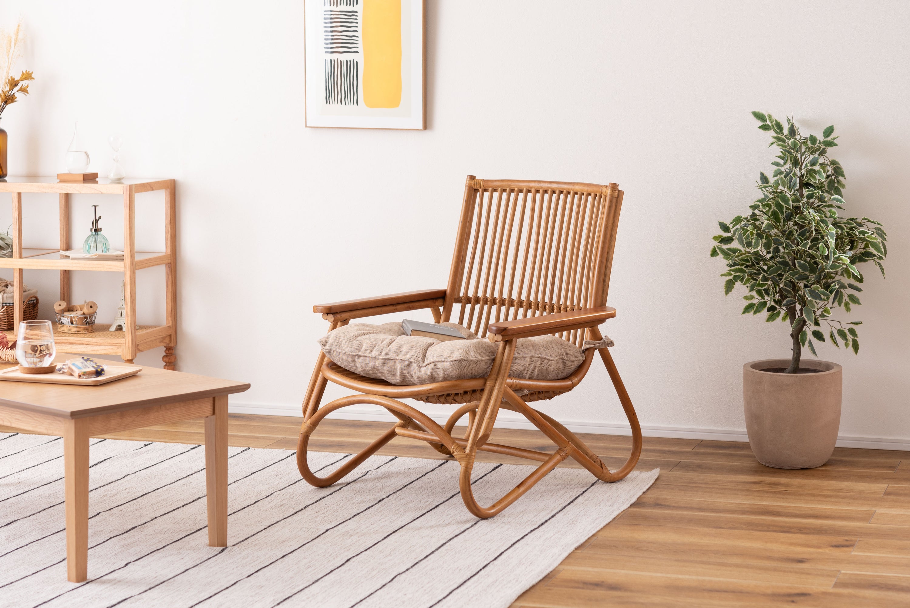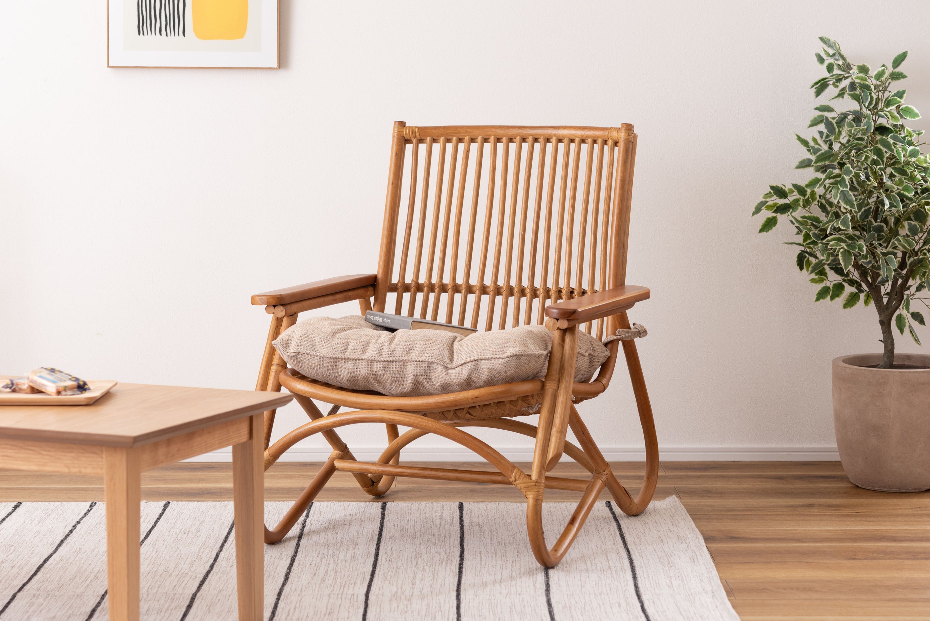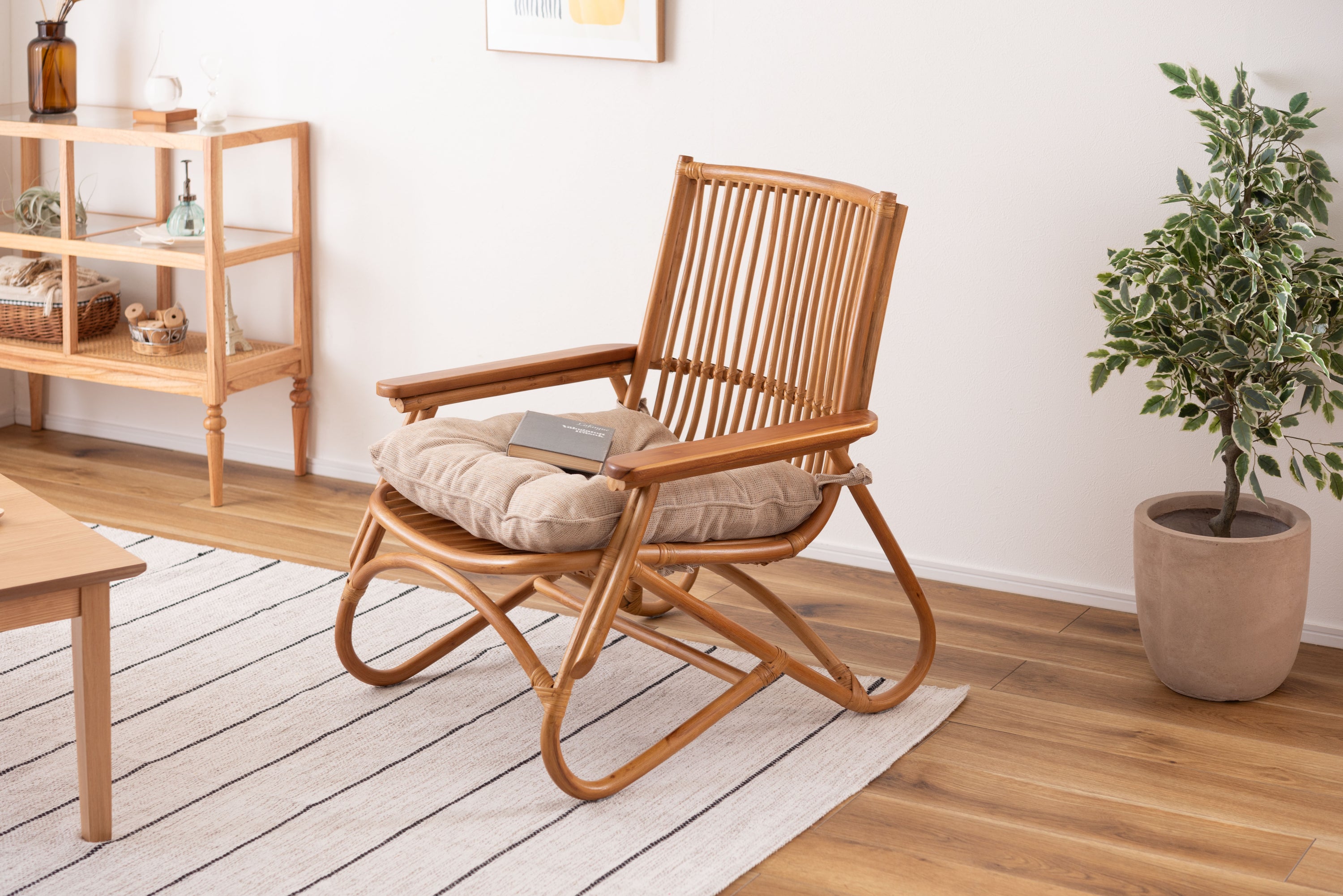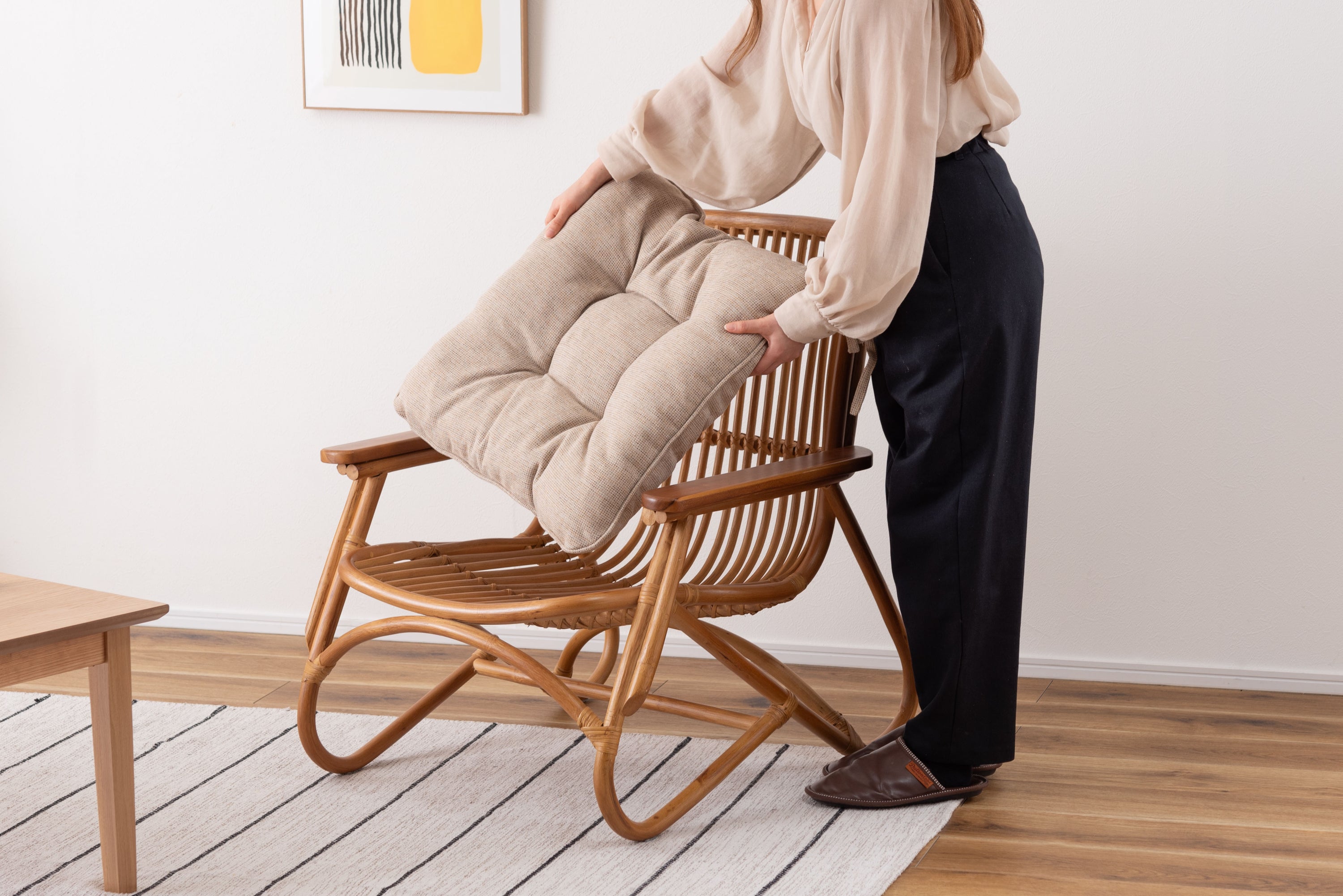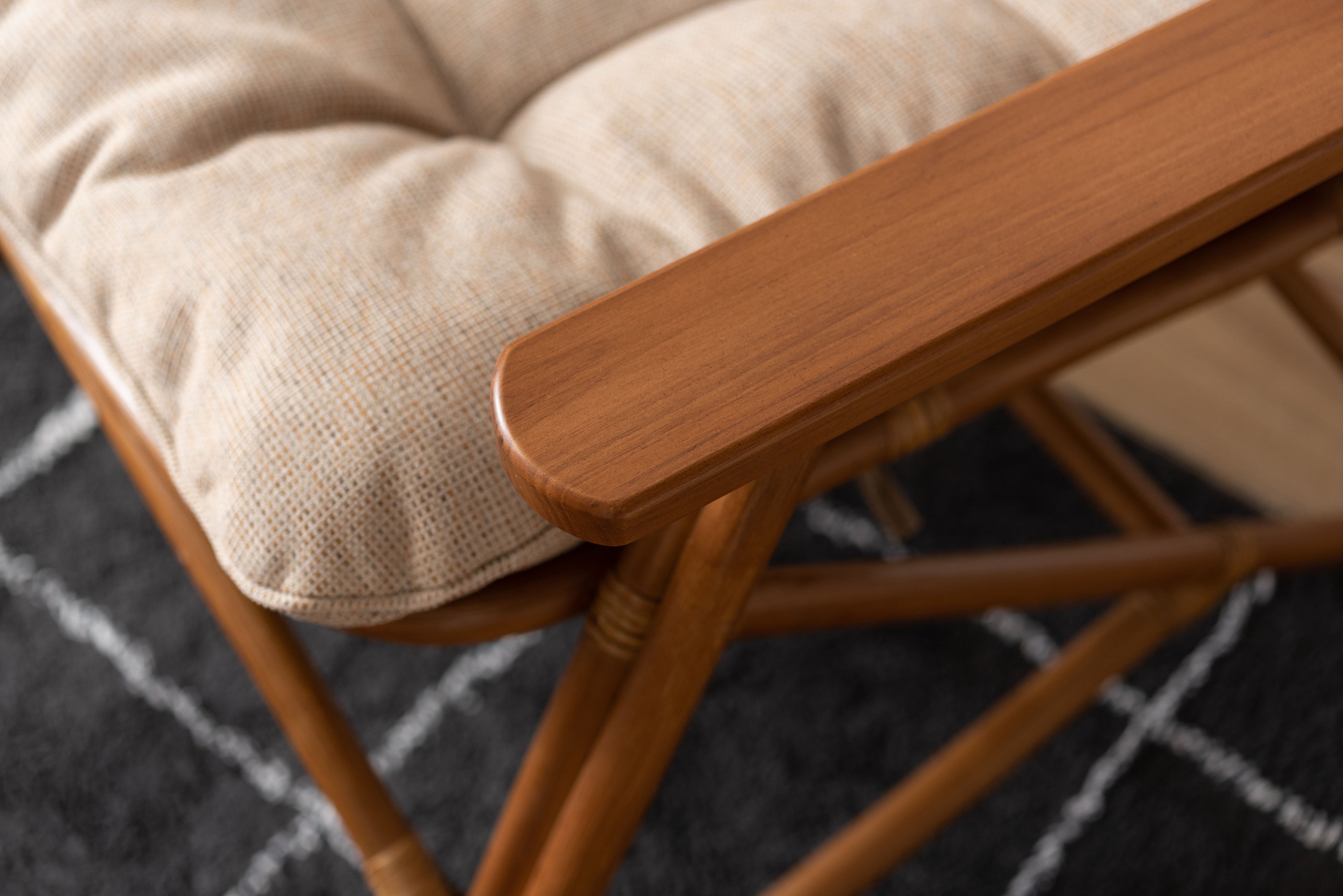 脚のカーブが美しい、天然木×ラタンのパーソナルチェア。ゆったりと座りやすい形状と、印象的なデザインが特徴です。肘掛けには天然木(チーク)を使用。天然木のぬくもりがしっかりと手に馴染みます。ラタン(籐)ならではの、しなやかで柔らかい曲線も魅力の一つです。背もたれには緩いカーブを掛けているので、ゆったりとくつろぐことができます。ほどよいクッション性のある座面クッションは取り外しが可能です。