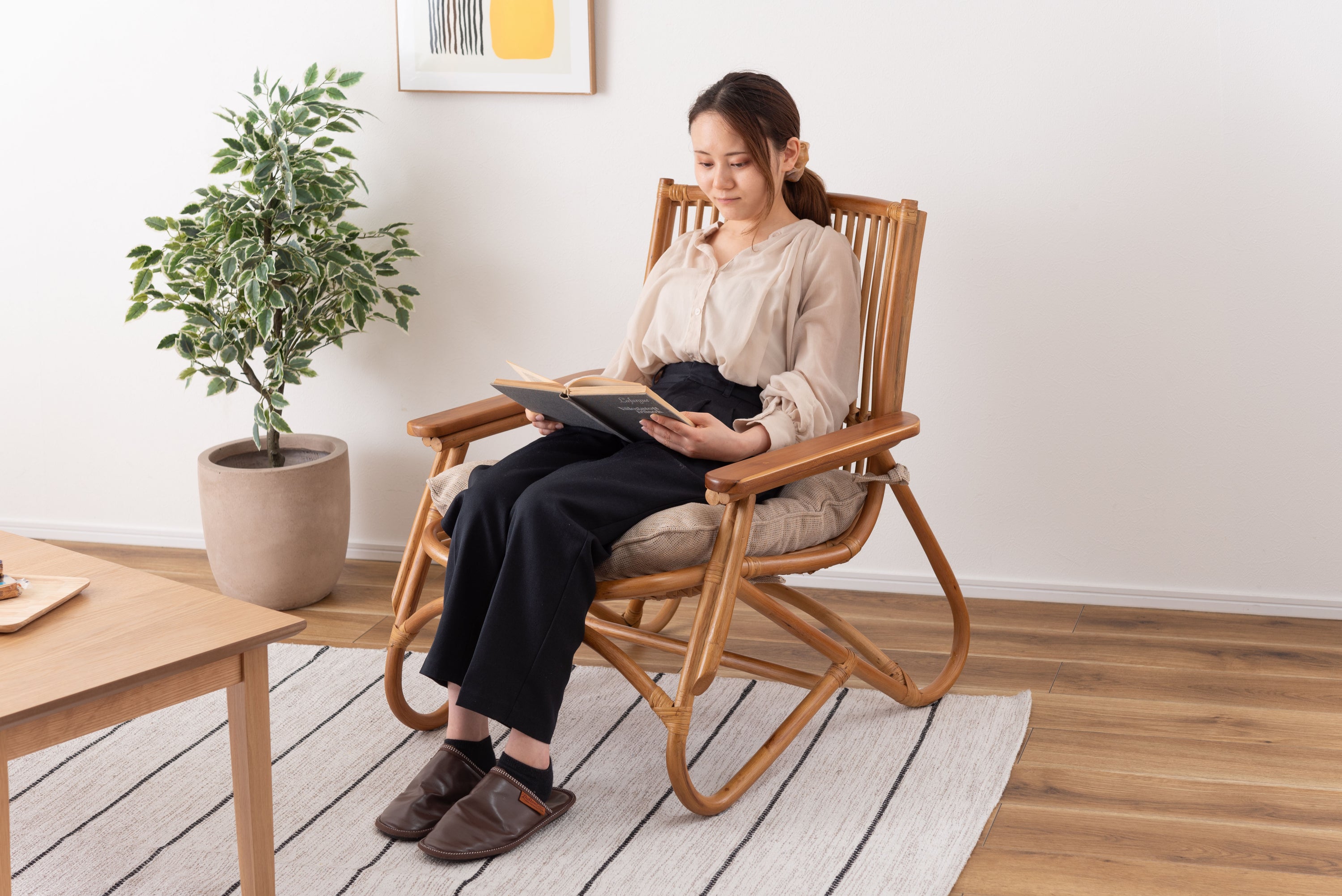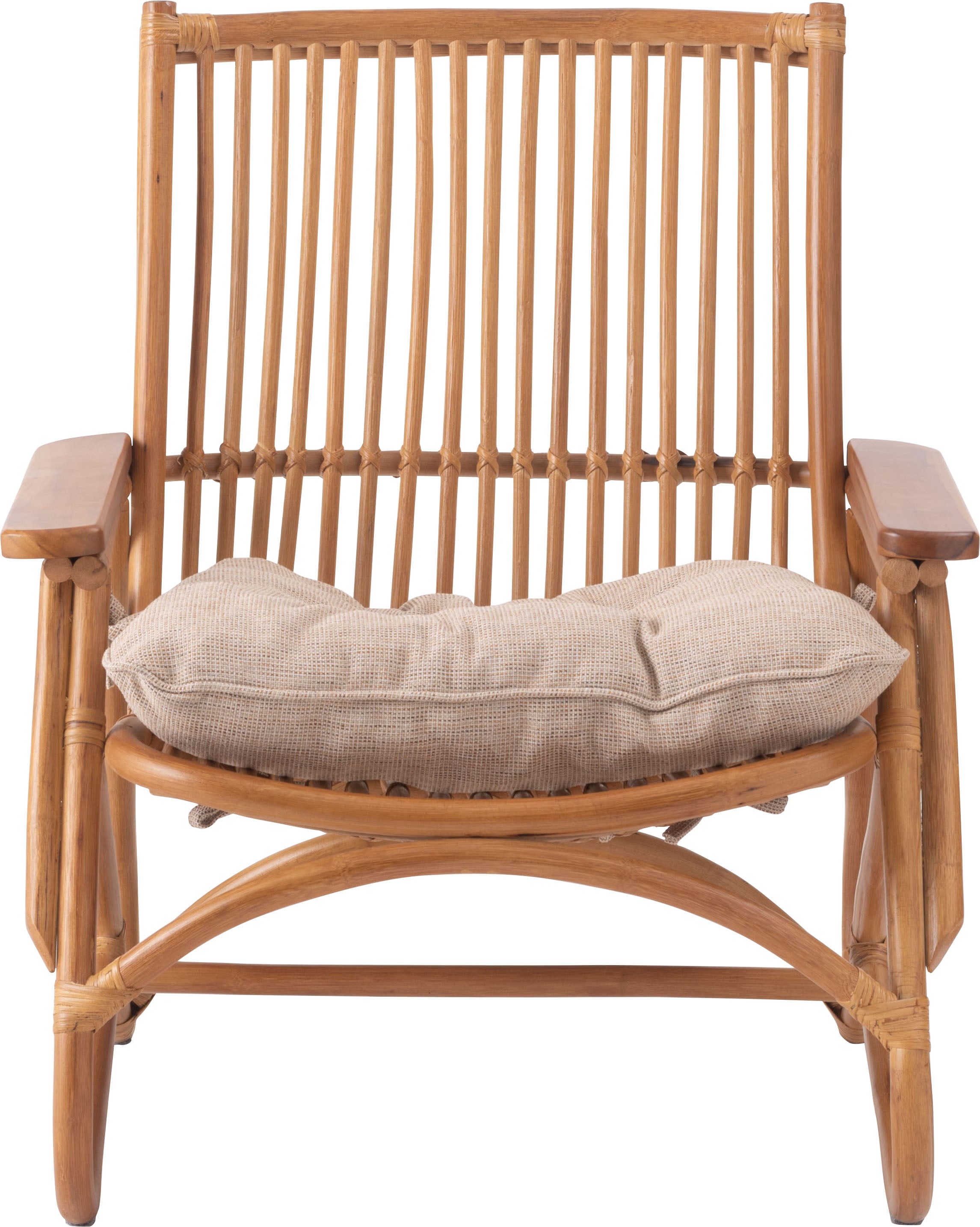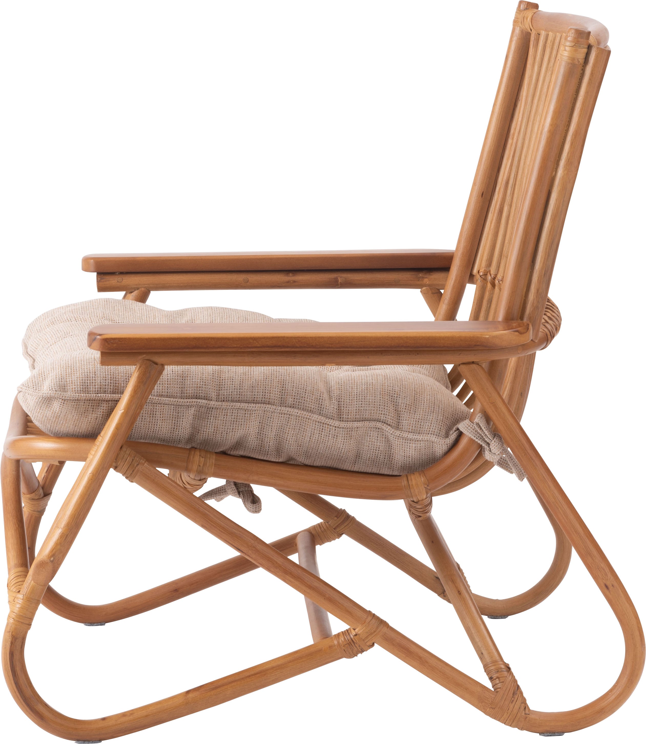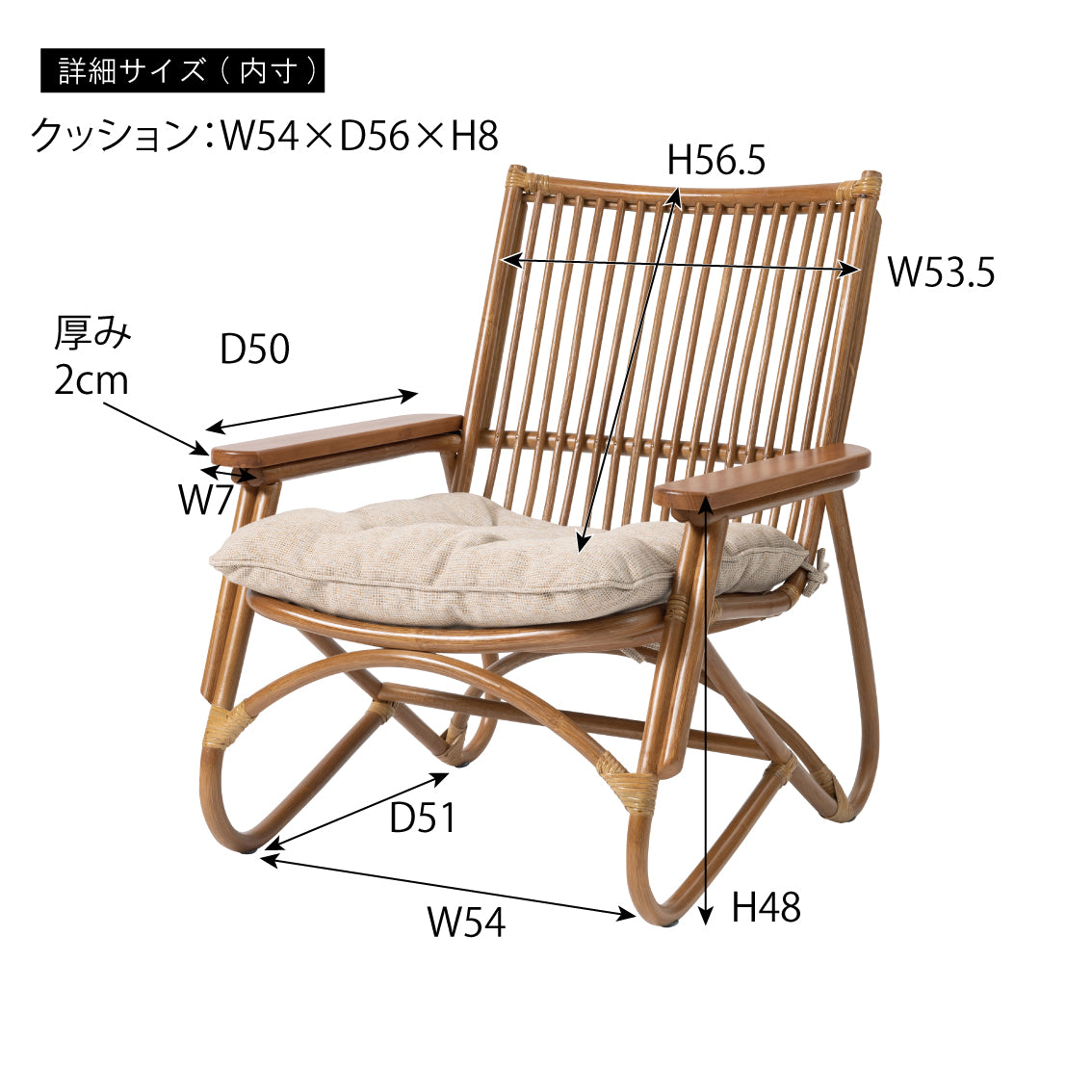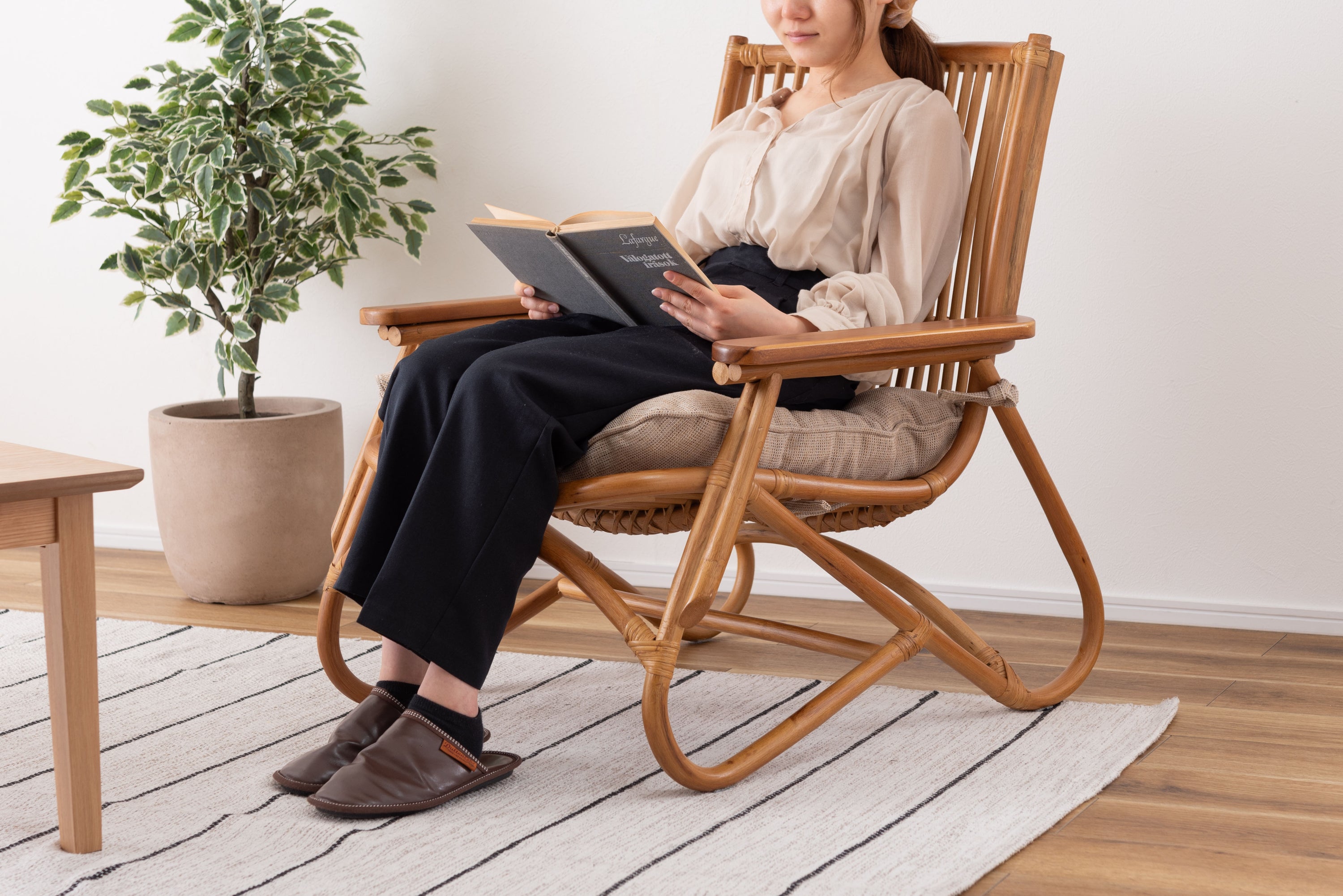 脚のカーブが美しい、天然木×ラタンのパーソナルチェア。ゆったりと座りやすい形状と、印象的なデザインが特徴です。肘掛けには天然木(チーク)を使用。天然木のぬくもりがしっかりと手に馴染みます。ラタン(籐)ならではの、しなやかで柔らかい曲線も魅力の一つです。背もたれには緩いカーブを掛けているので、ゆったりとくつろぐことができます。ほどよいクッション性のある座面クッションは取り外しが可能です。