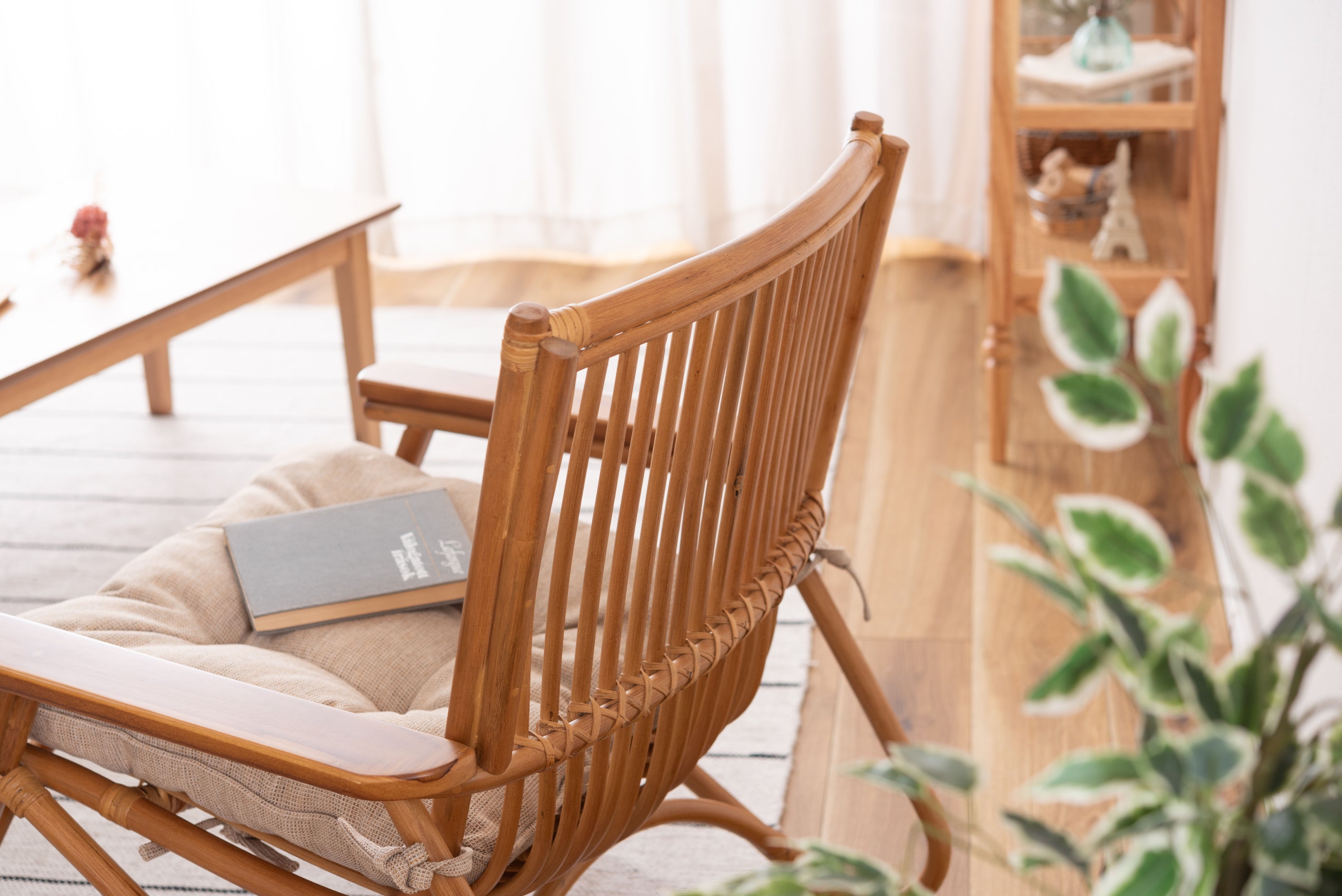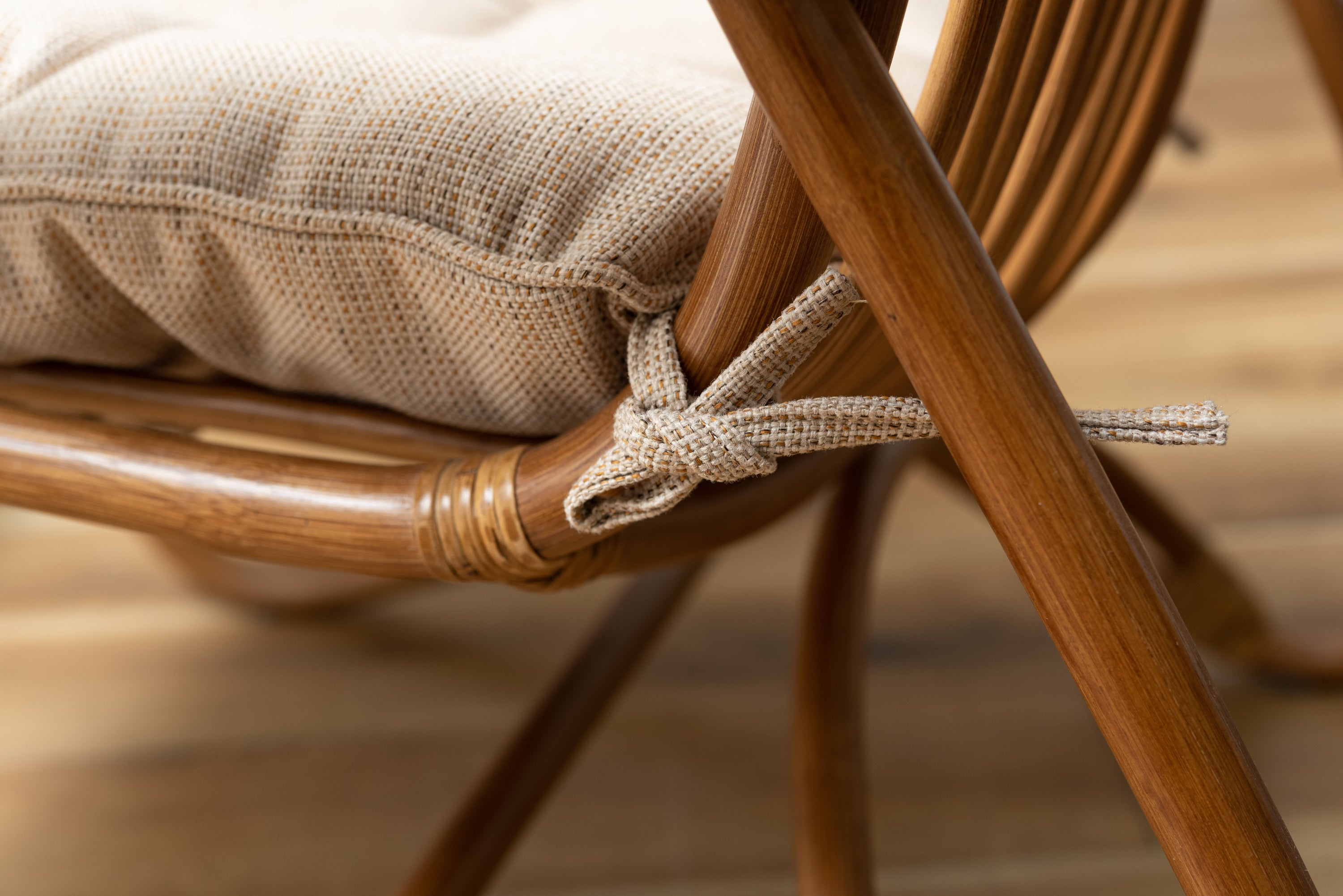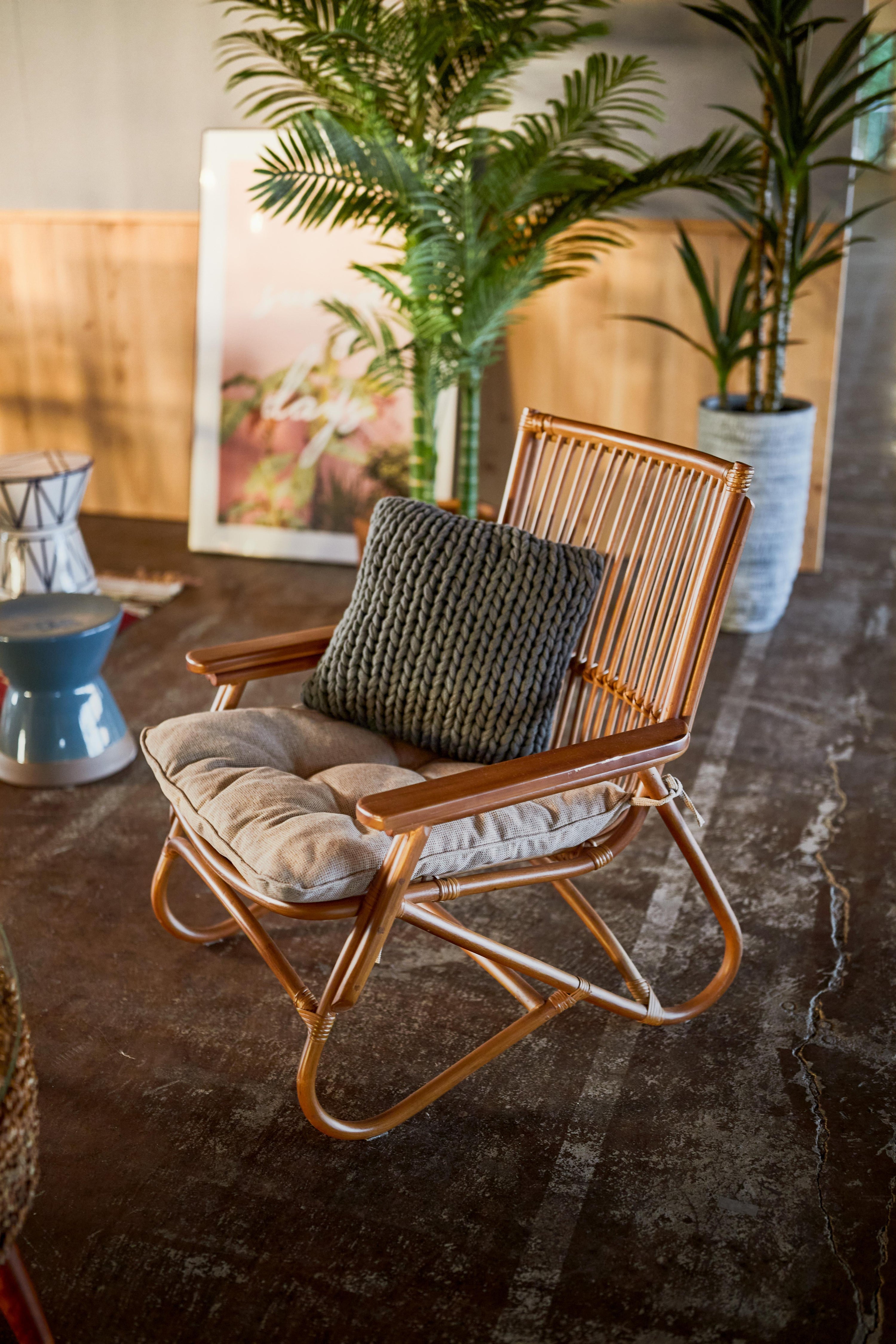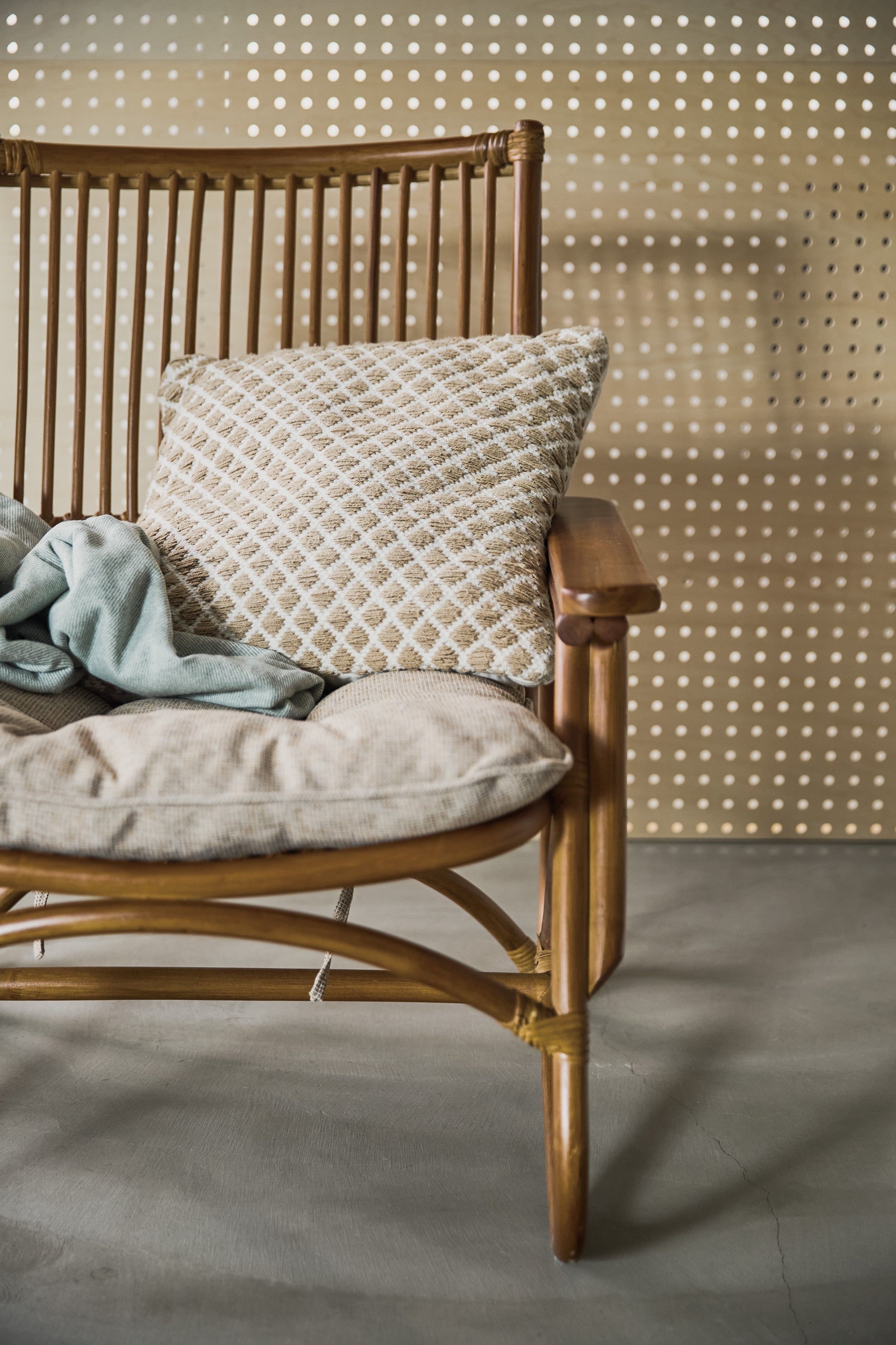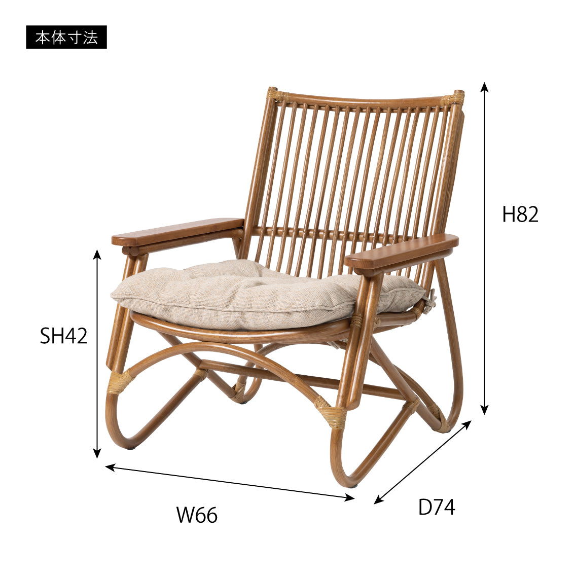 脚のカーブが美しい、天然木×ラタンのパーソナルチェア。ゆったりと座りやすい形状と、印象的なデザインが特徴です。肘掛けには天然木(チーク)を使用。天然木のぬくもりがしっかりと手に馴染みます。ラタン(籐)ならではの、しなやかで柔らかい曲線も魅力の一つです。背もたれには緩いカーブを掛けているので、ゆったりとくつろぐことができます。ほどよいクッション性のある座面クッションは取り外しが可能です。