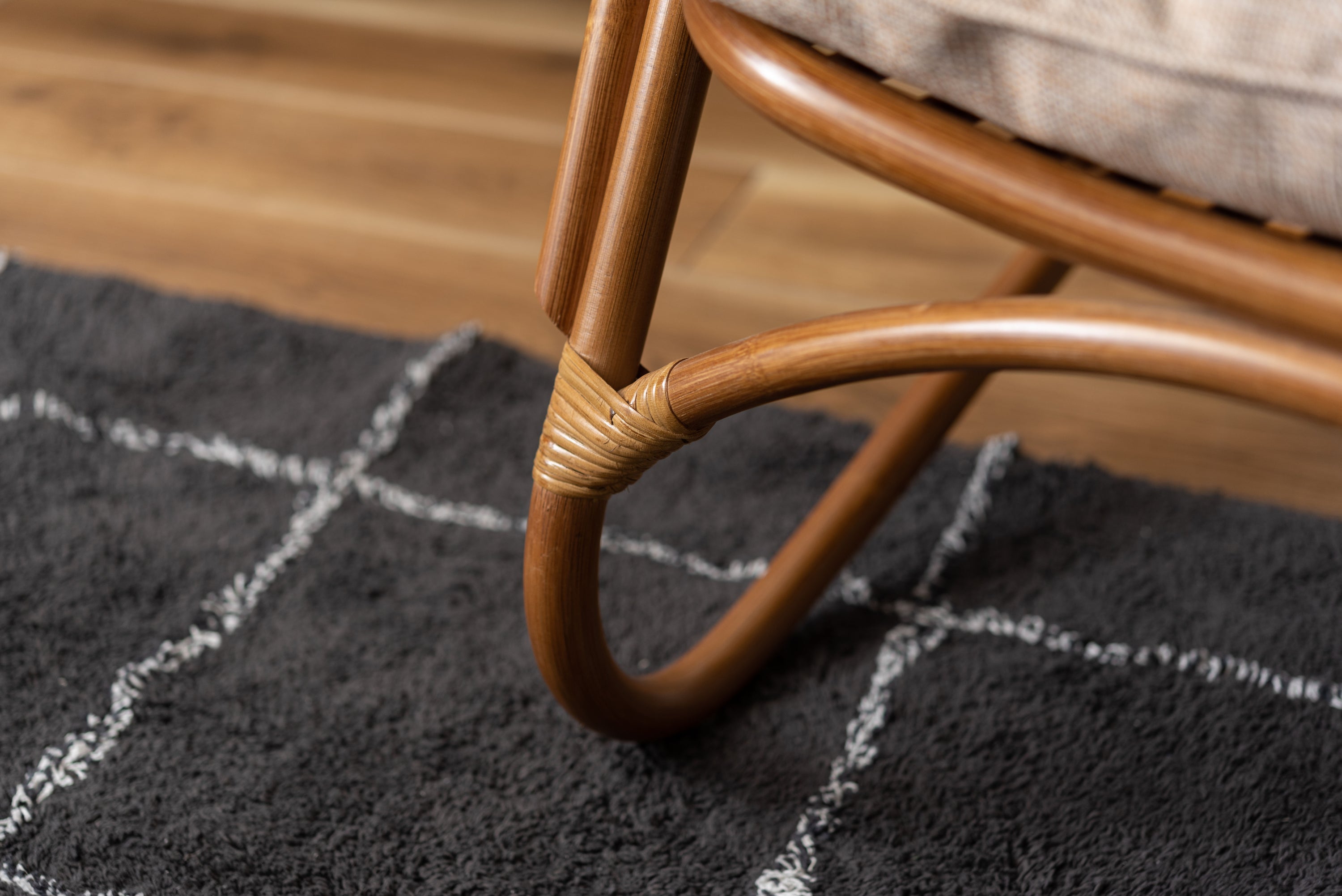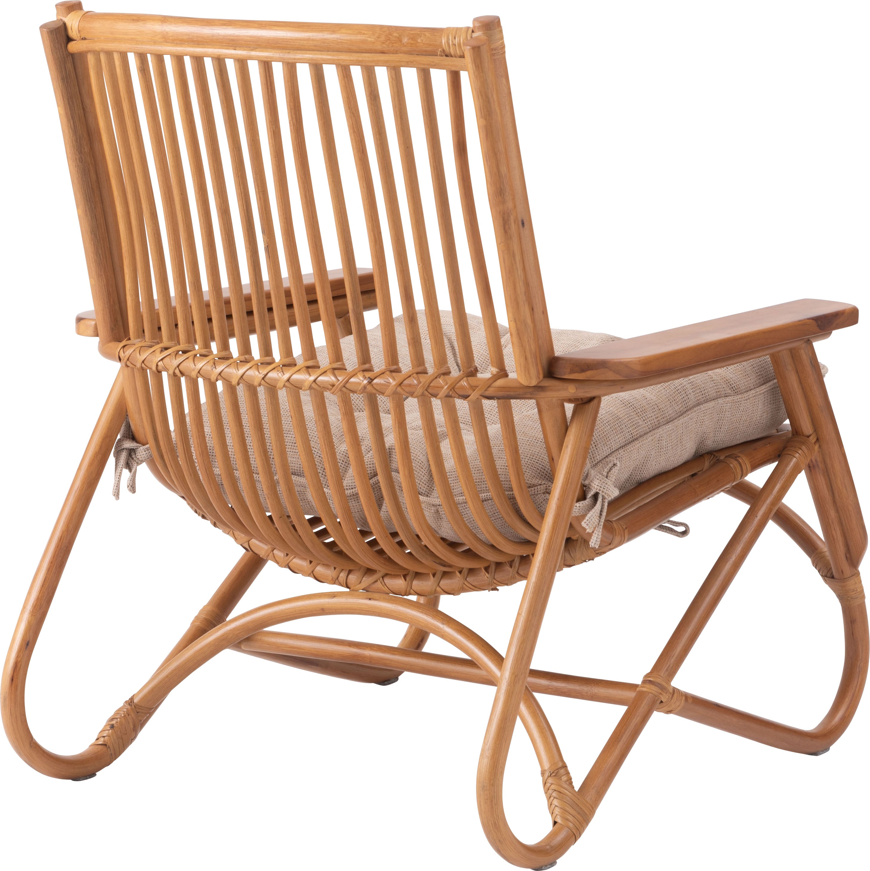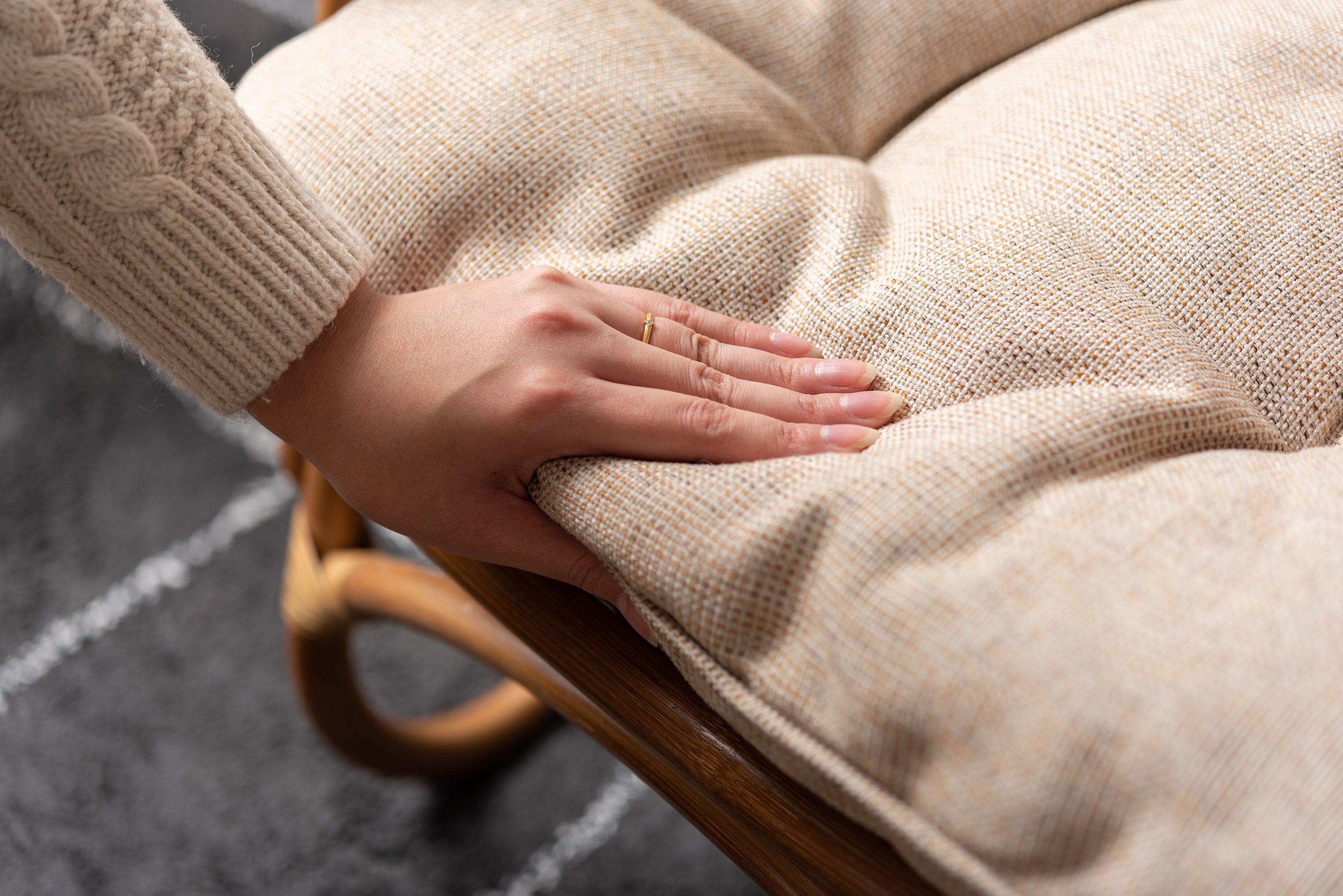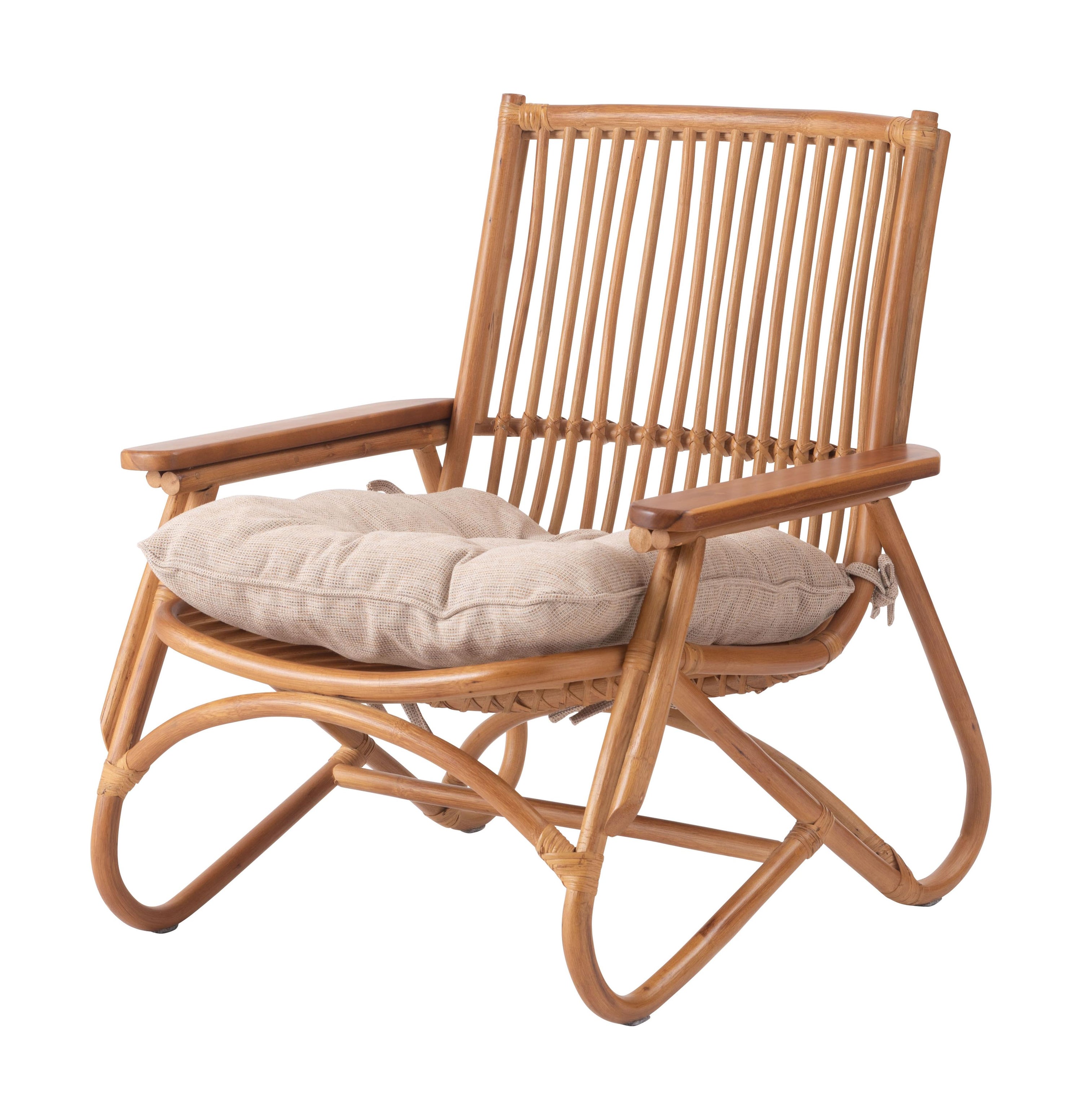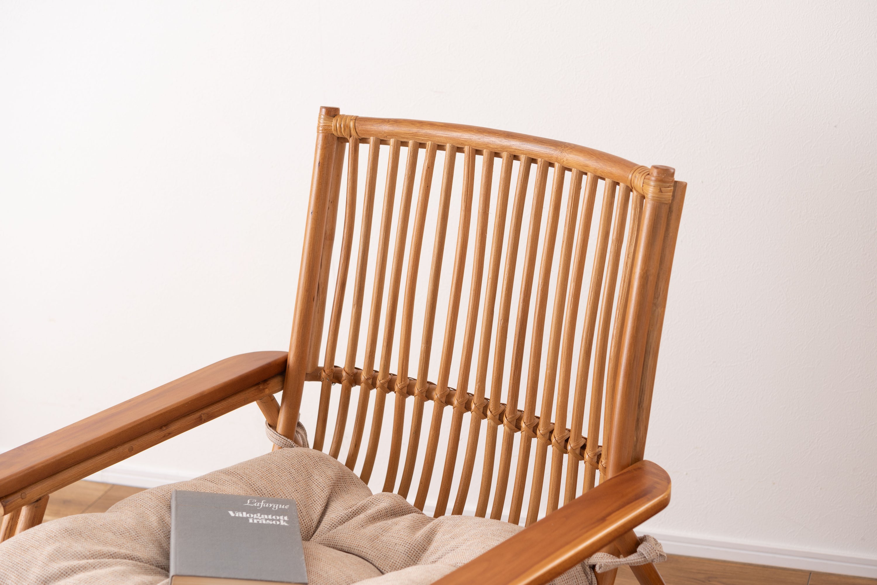 脚のカーブが美しい、天然木×ラタンのパーソナルチェア。ゆったりと座りやすい形状と、印象的なデザインが特徴です。肘掛けには天然木(チーク)を使用。天然木のぬくもりがしっかりと手に馴染みます。ラタン(籐)ならではの、しなやかで柔らかい曲線も魅力の一つです。背もたれには緩いカーブを掛けているので、ゆったりとくつろぐことができます。ほどよいクッション性のある座面クッションは取り外しが可能です。